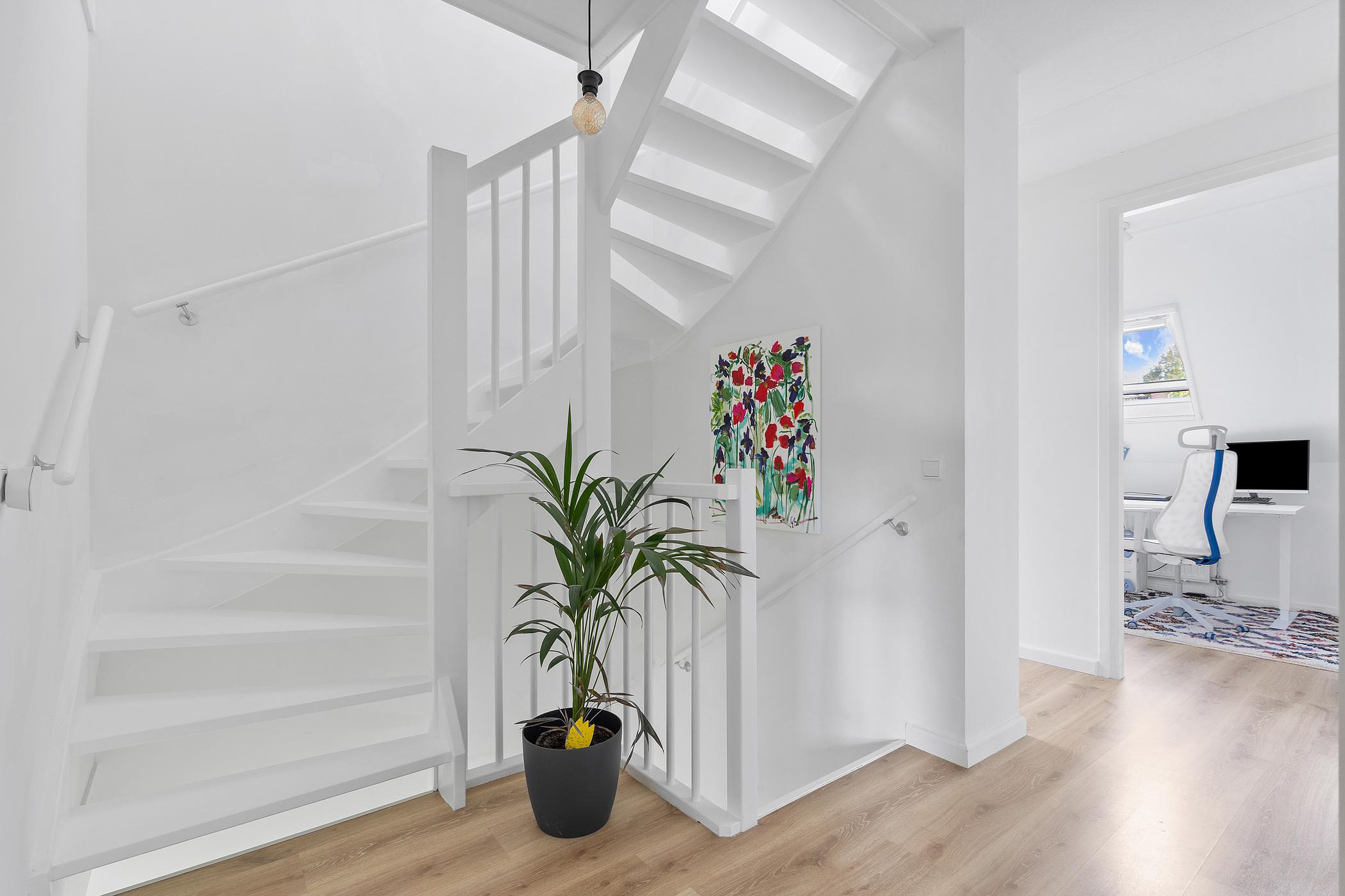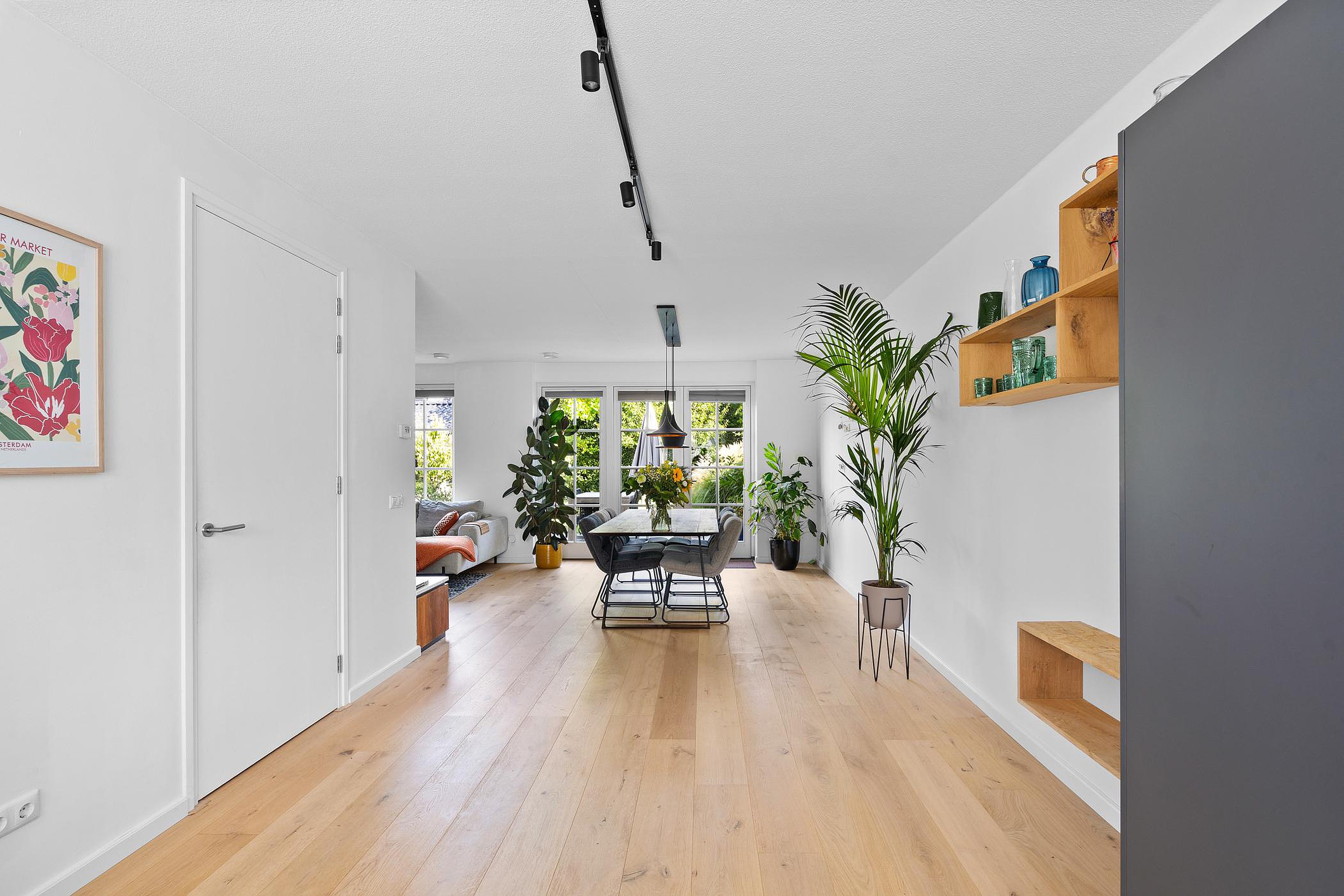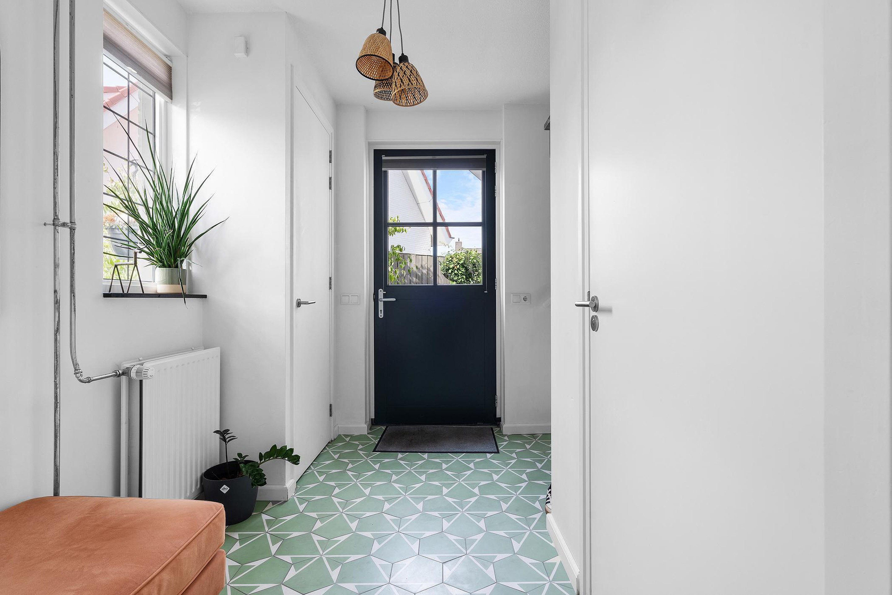 Royale hal met toegang tot de meterkast, het gastentoilet, de woonkamer en de trapopgang naar de verdiepingen.