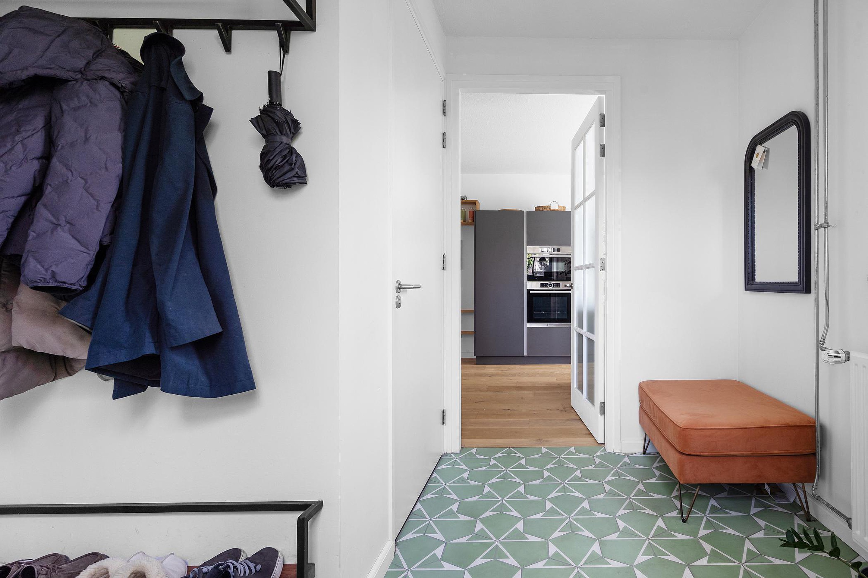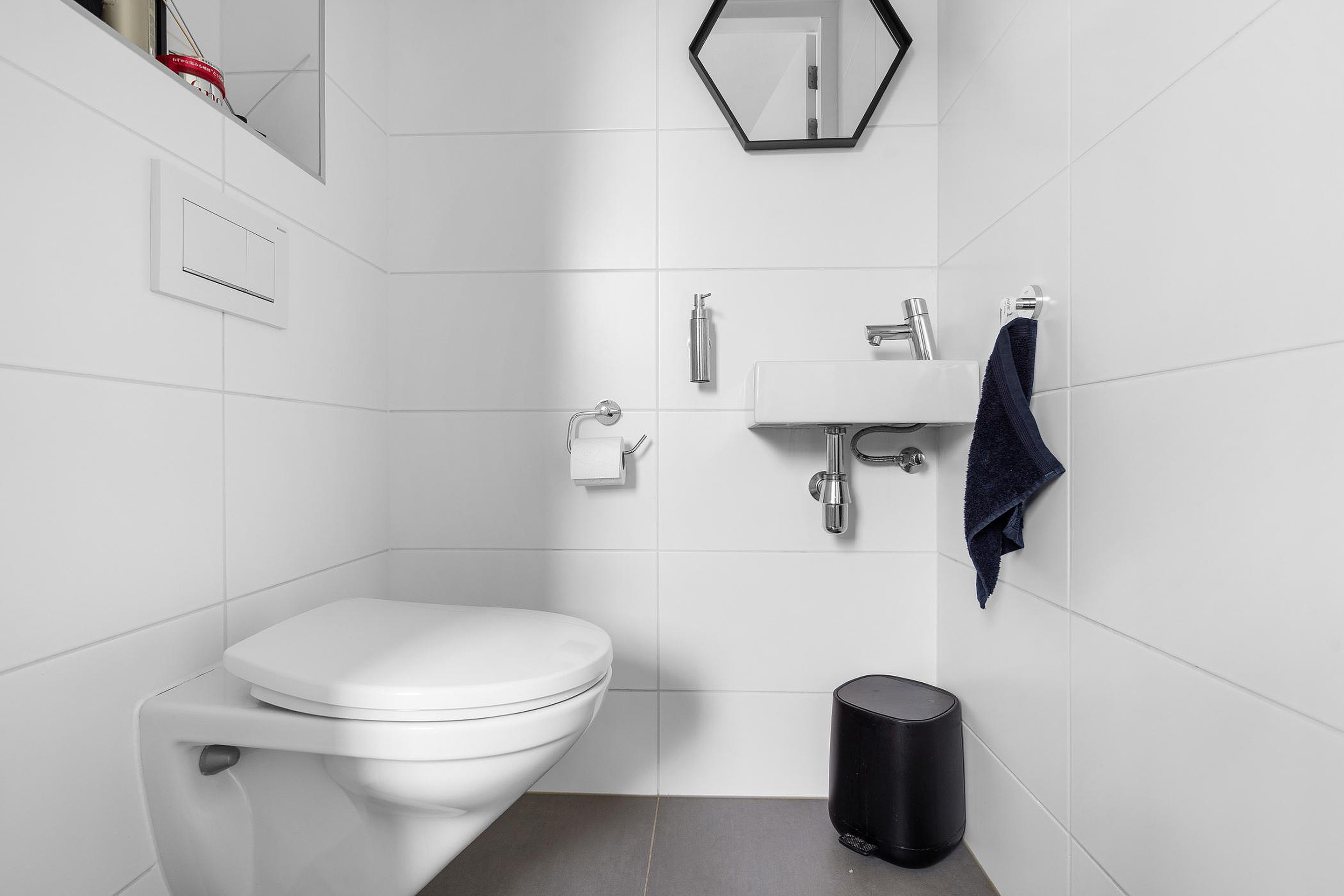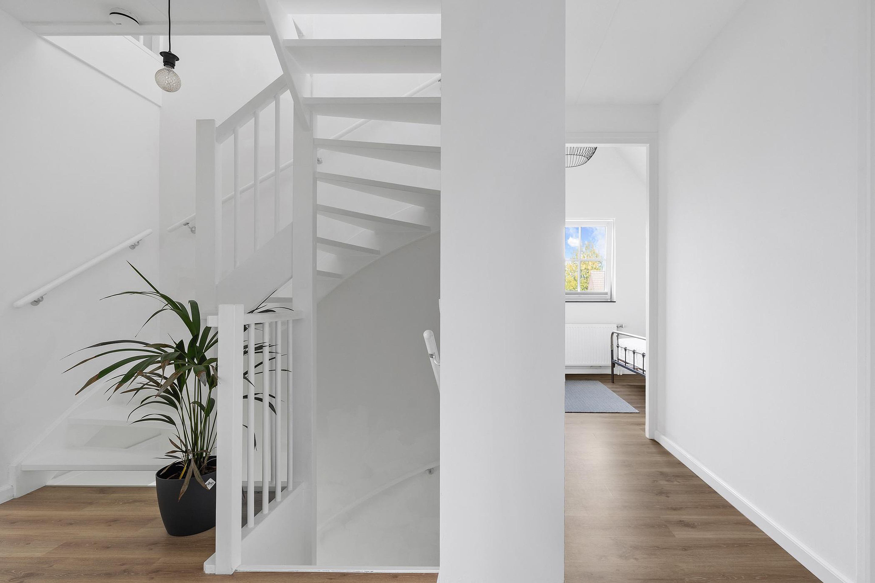 Royale hal met toegang tot de meterkast, het gastentoilet, de woonkamer en de trapopgang naar de verdiepingen.