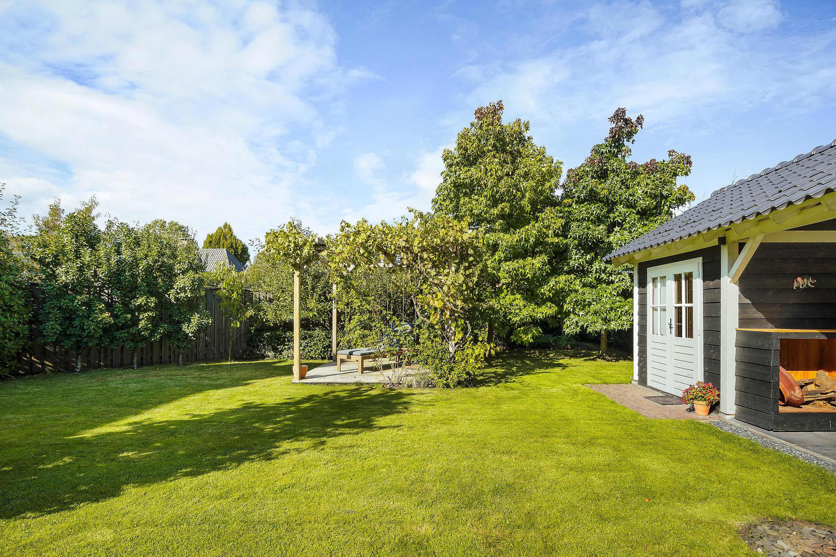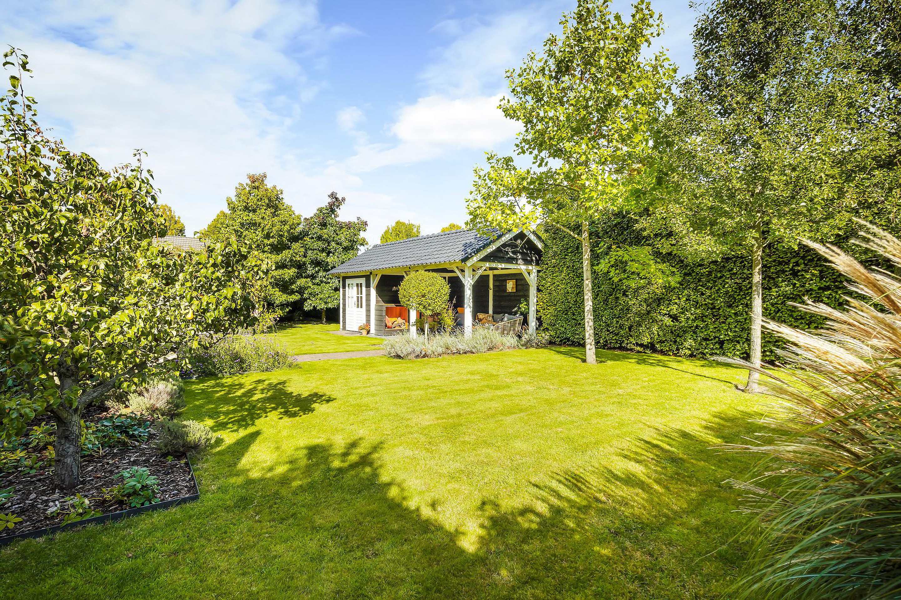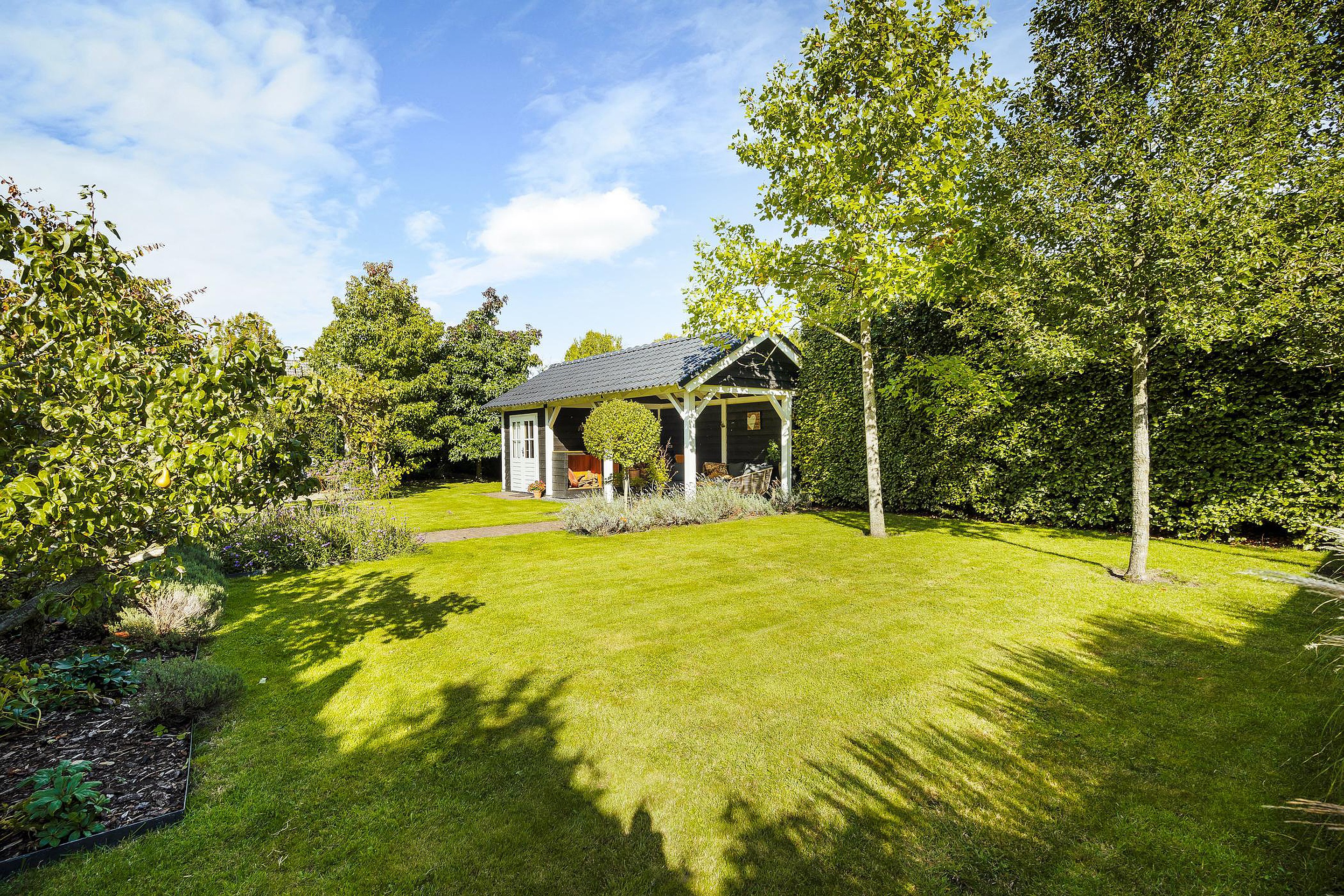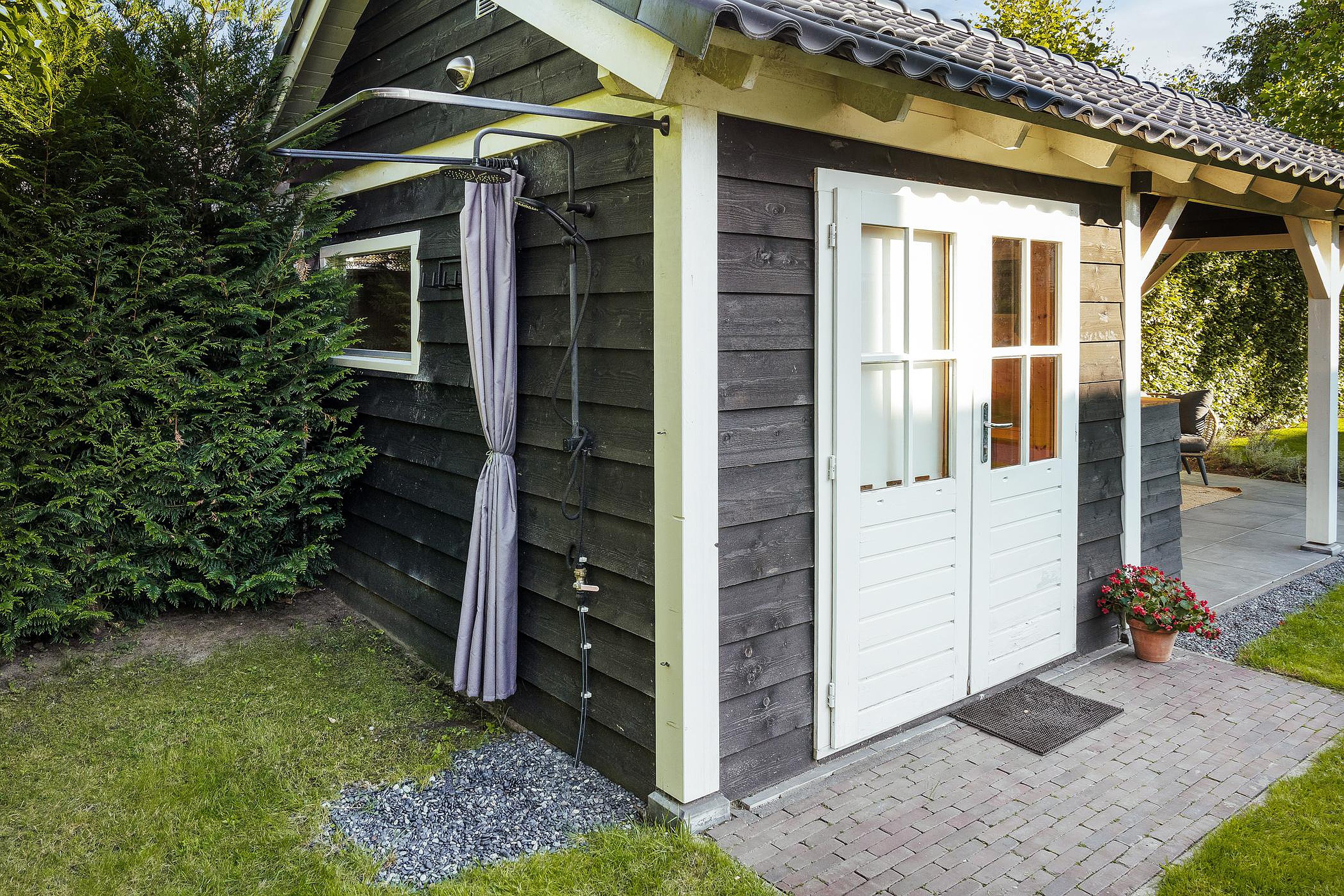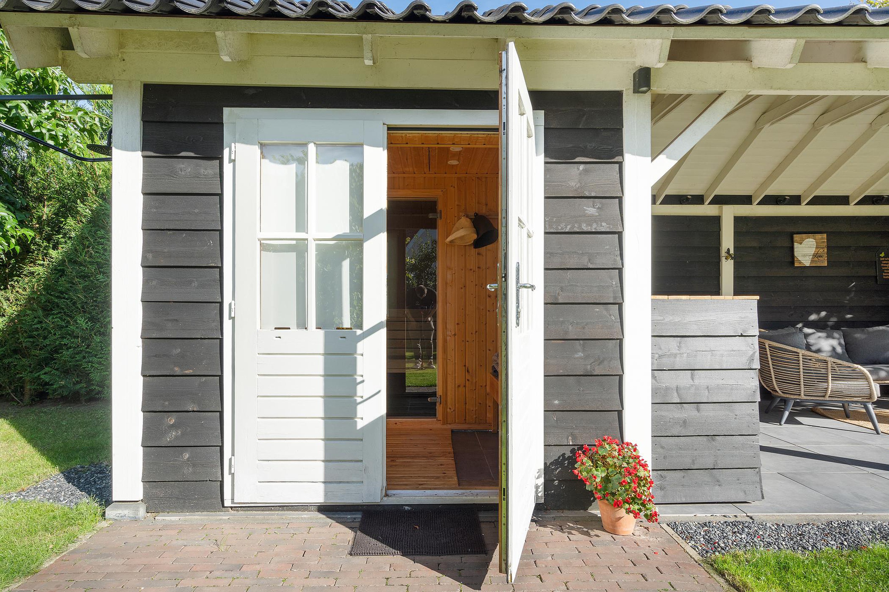 De enorme achtertuin beschikt over een aantal terrassen waarvan er één overdekt is. Dit overdekte terras grenst direct aan een professionele sauna met buitendouche.