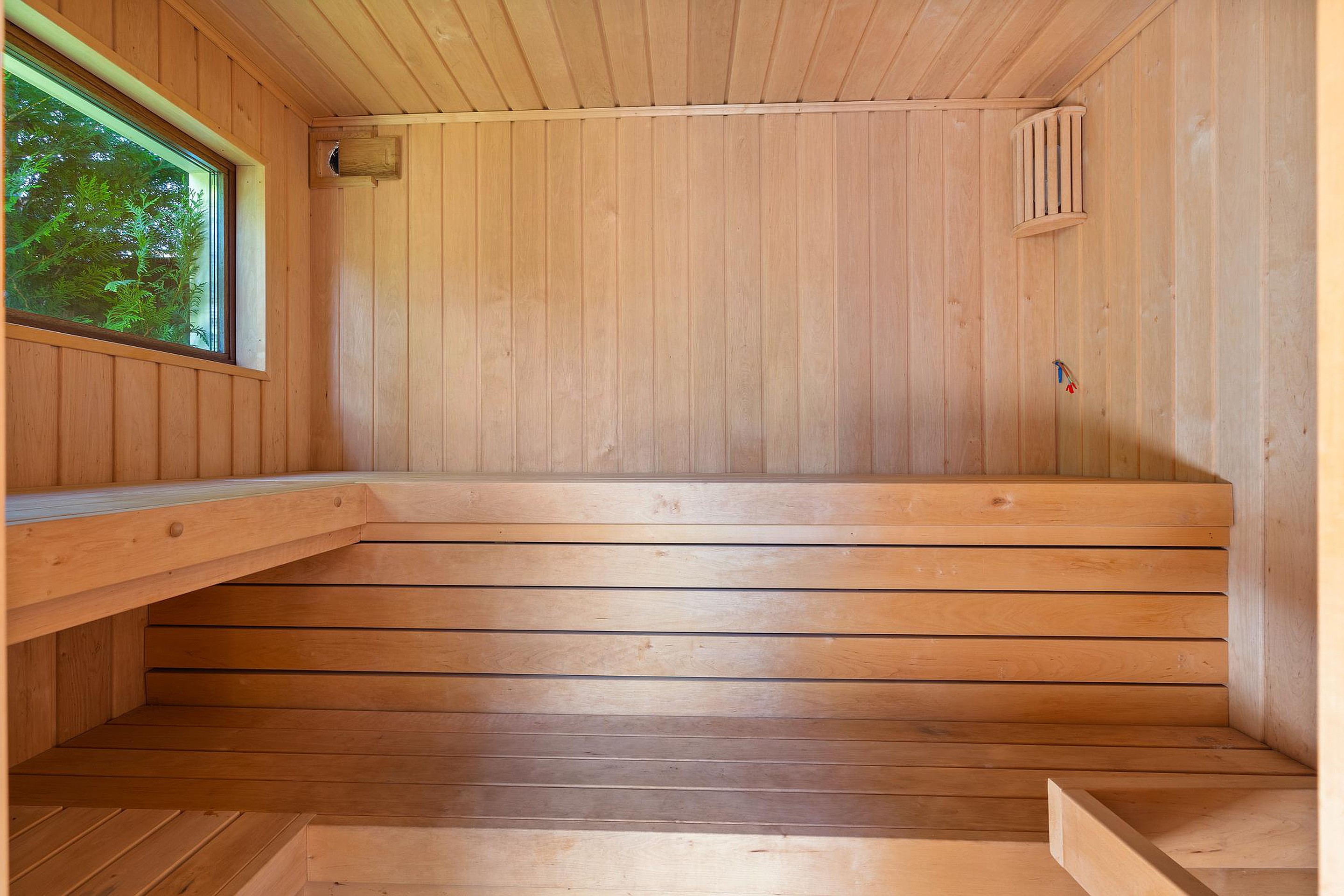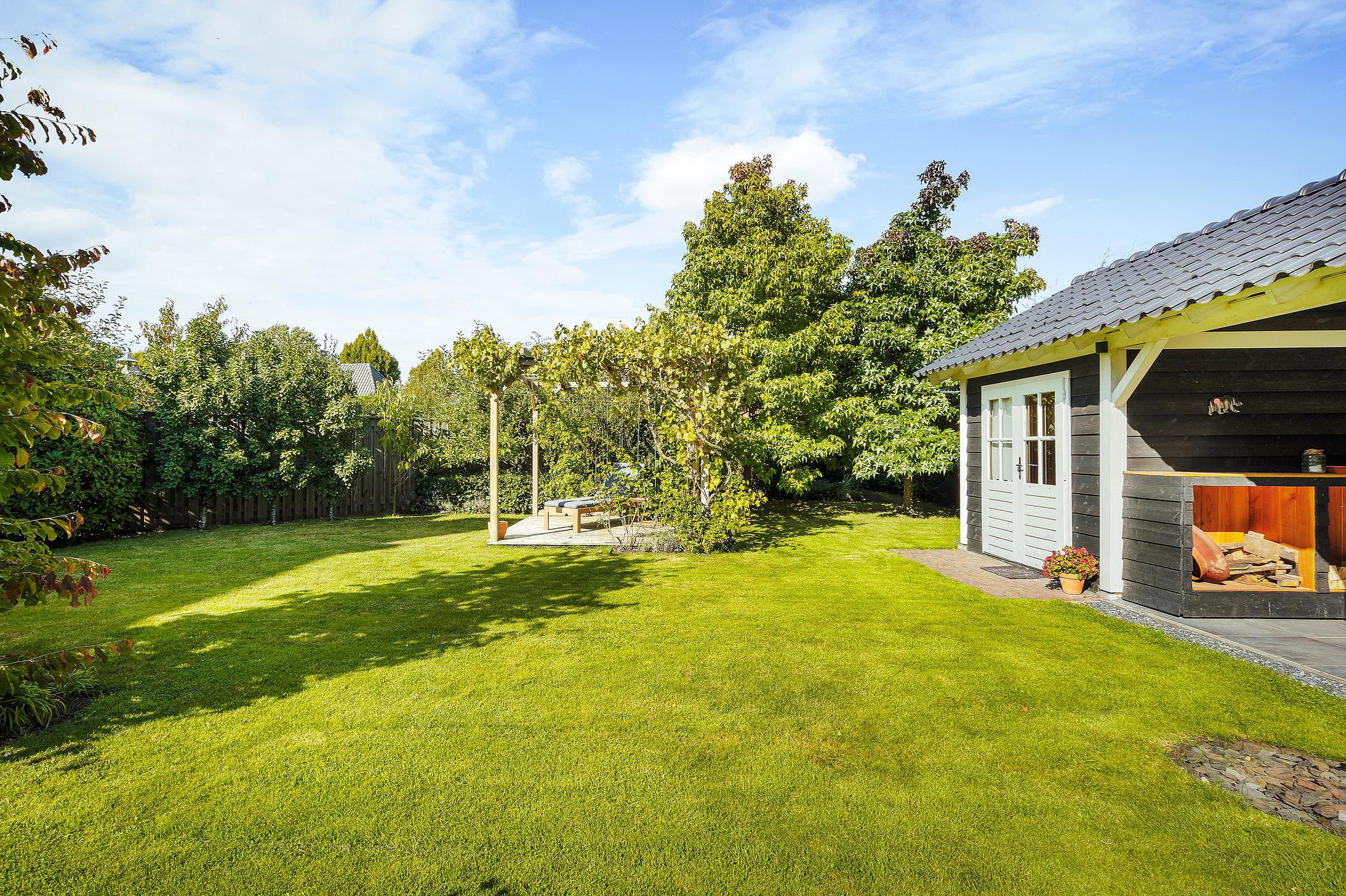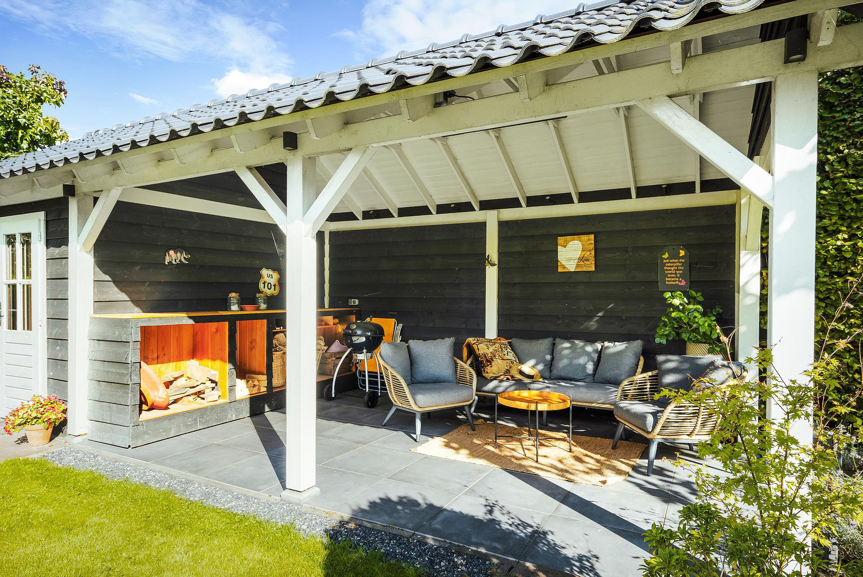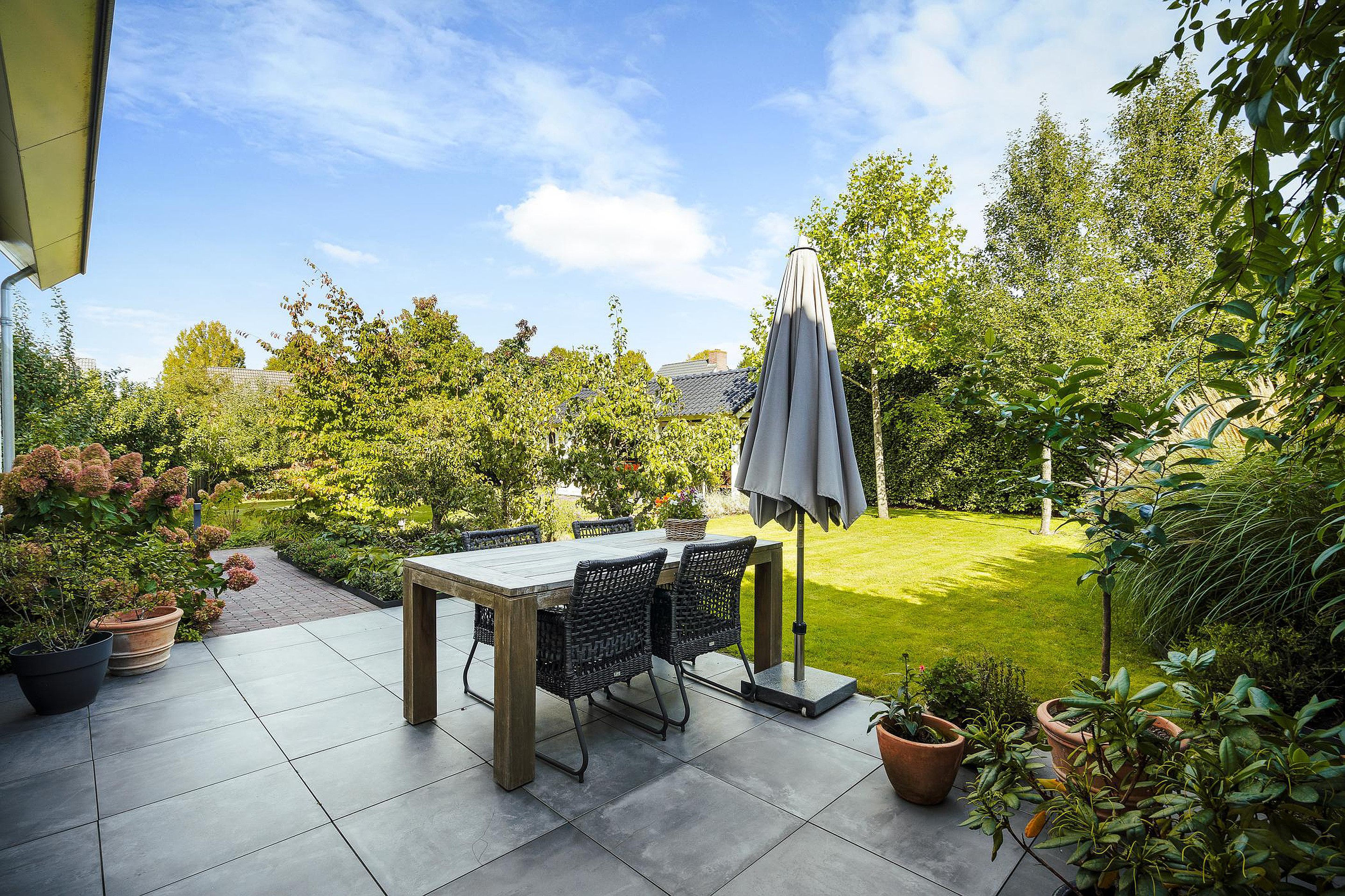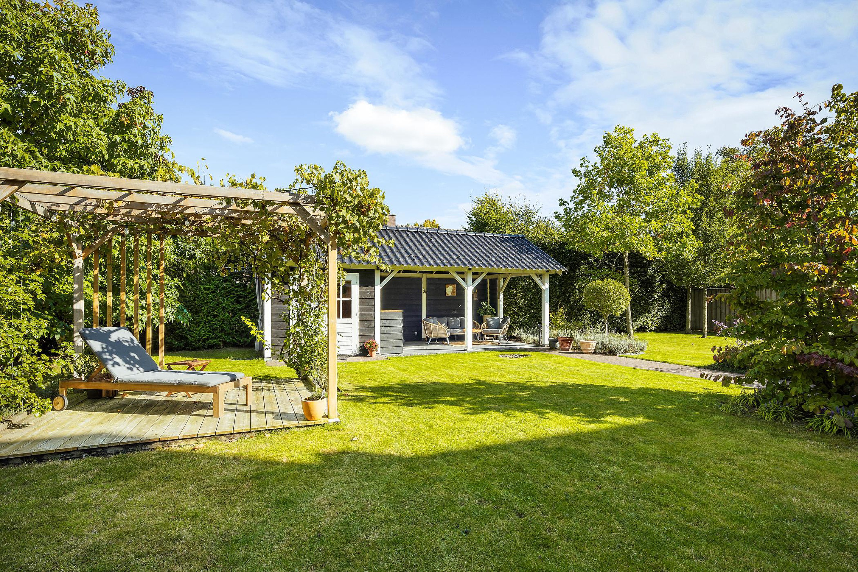 De enorme achtertuin beschikt over een aantal terrassen waarvan er één overdekt is. Dit overdekte terras grenst direct aan een professionele sauna met buitendouche.