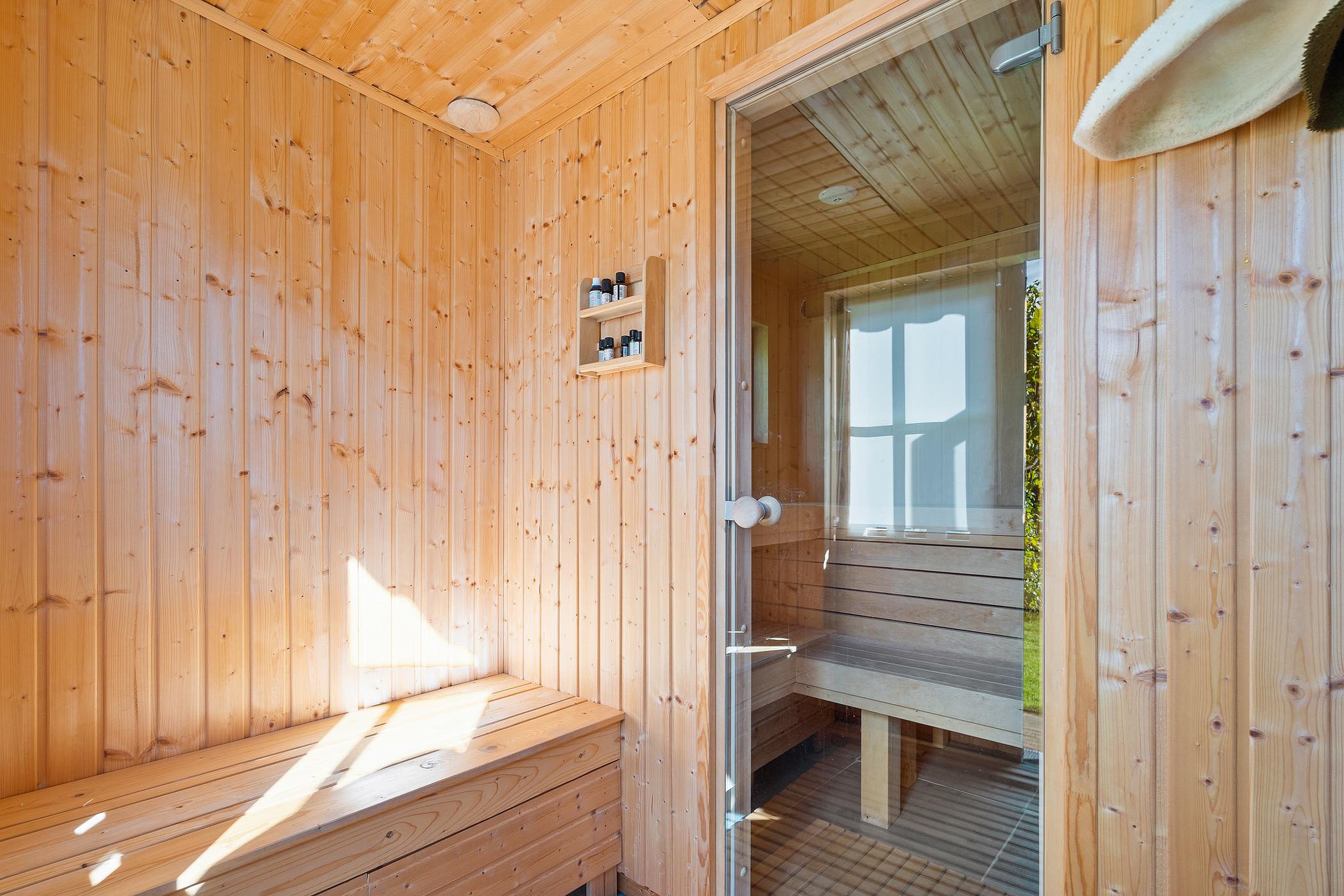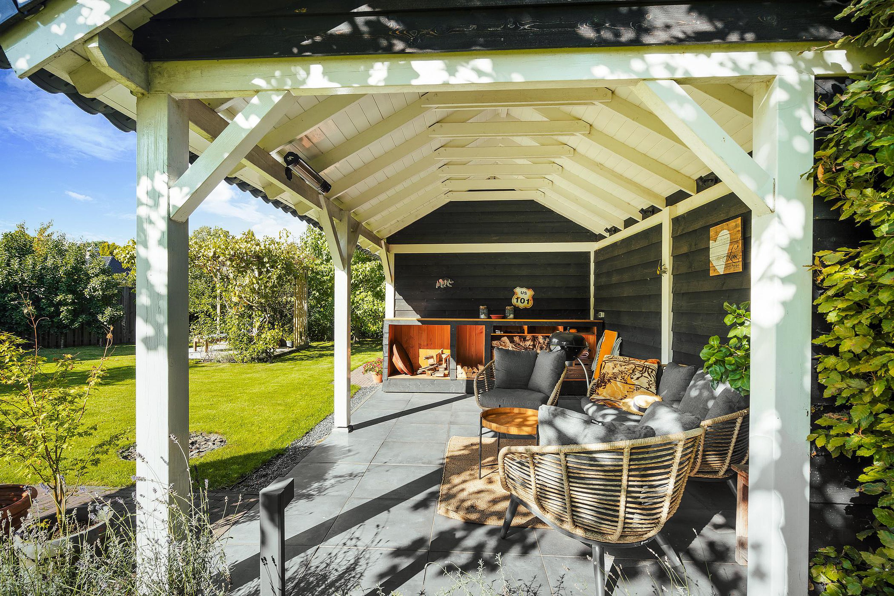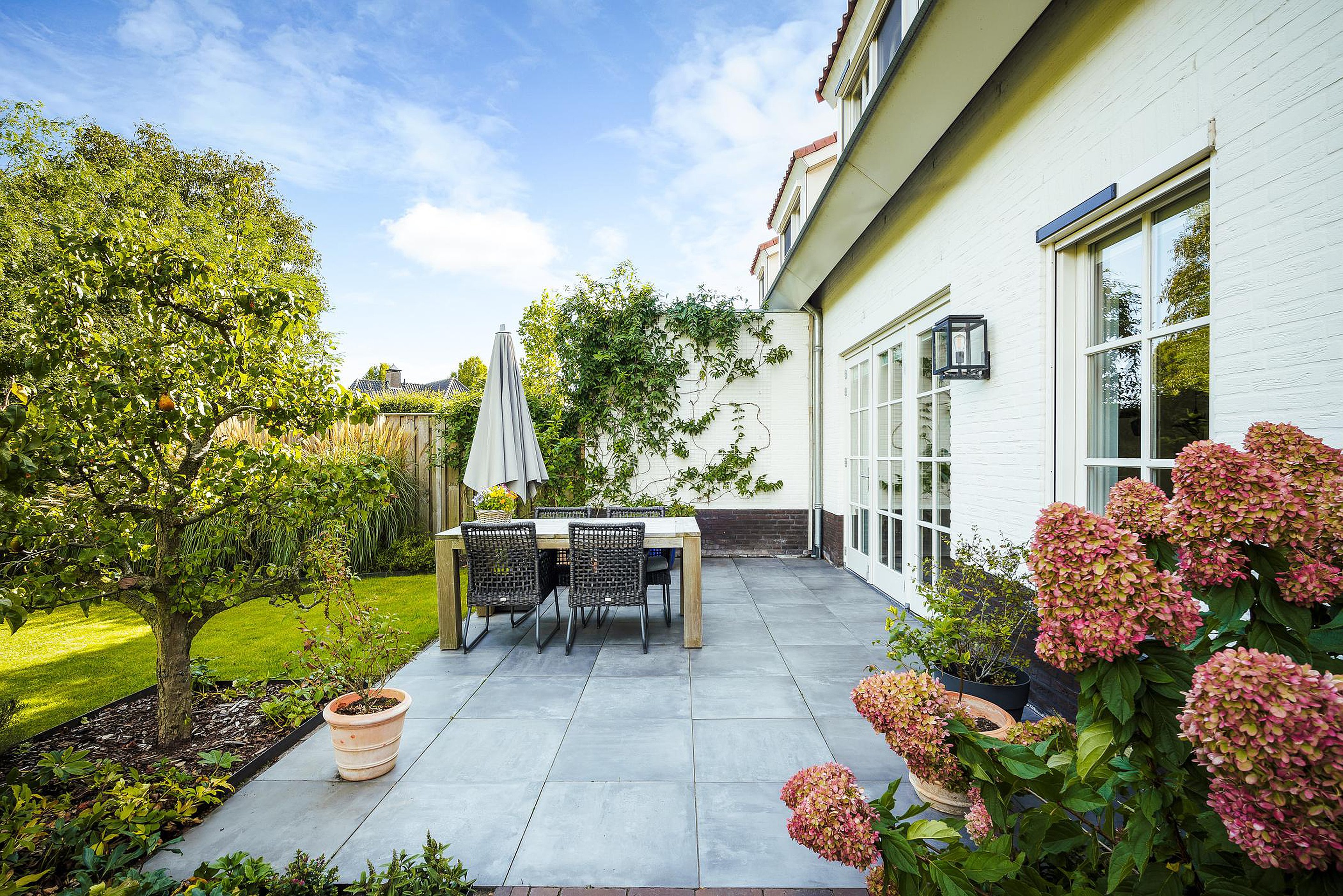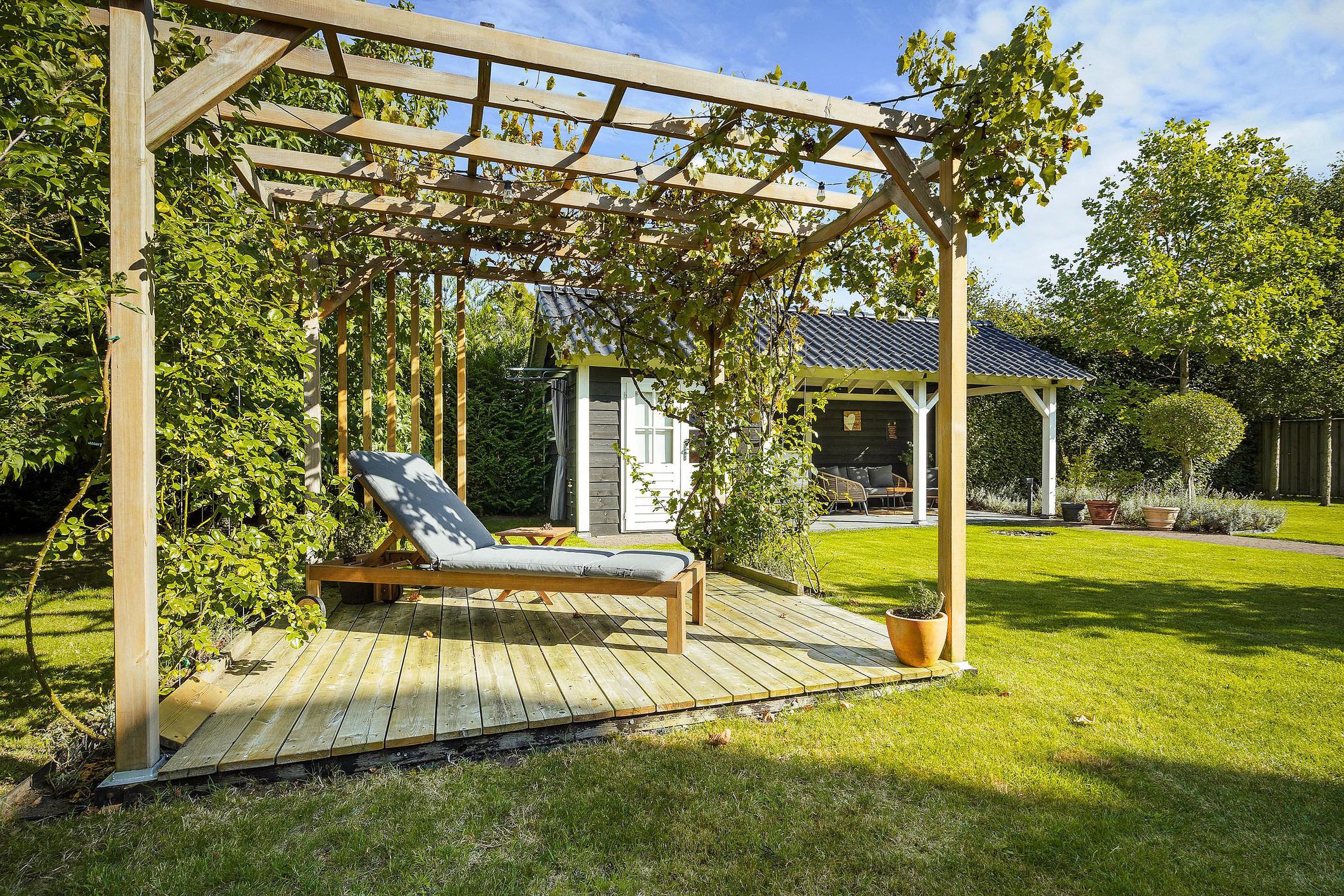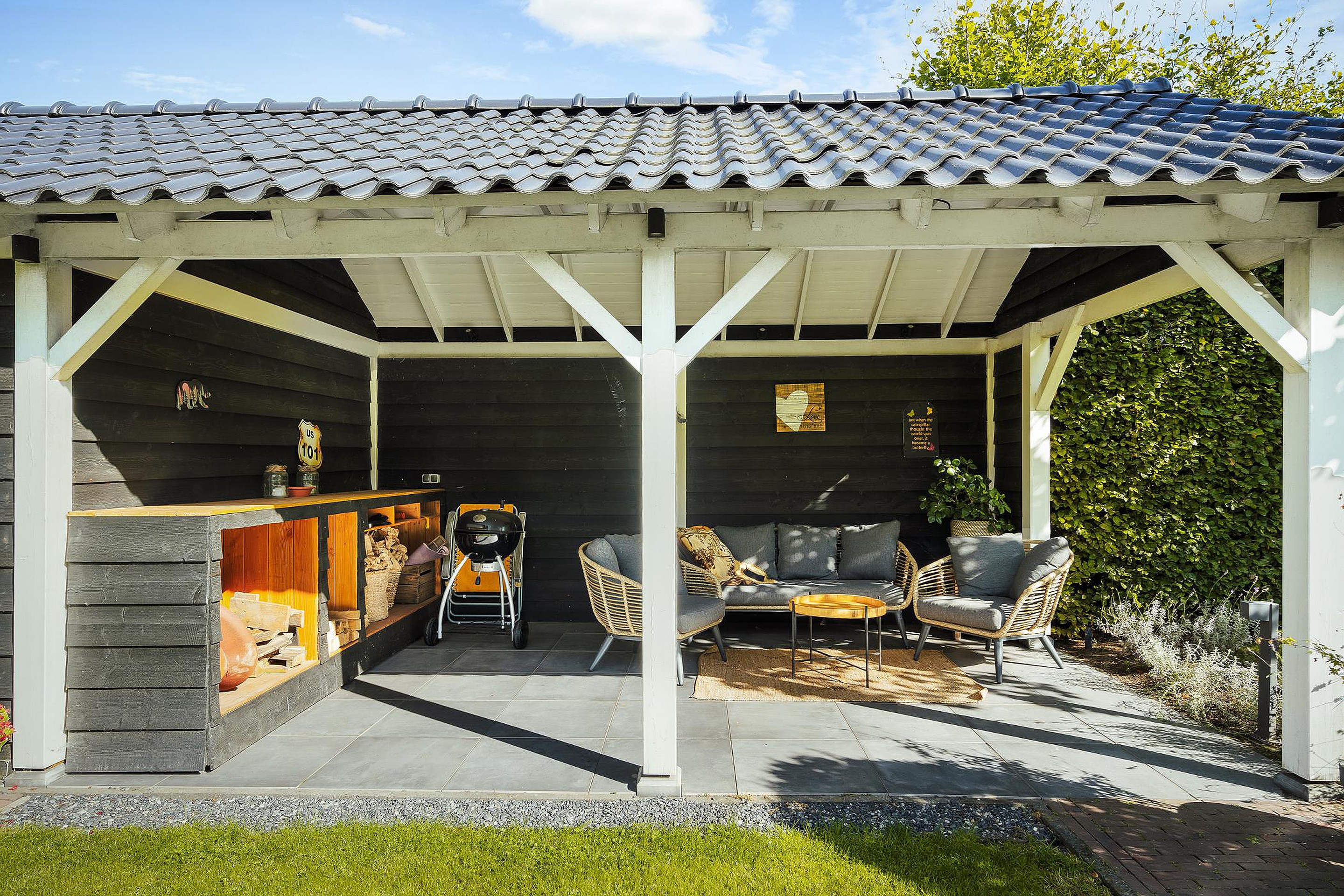 De enorme achtertuin beschikt over een aantal terrassen waarvan er één overdekt is. Dit overdekte terras grenst direct aan een professionele sauna met buitendouche.