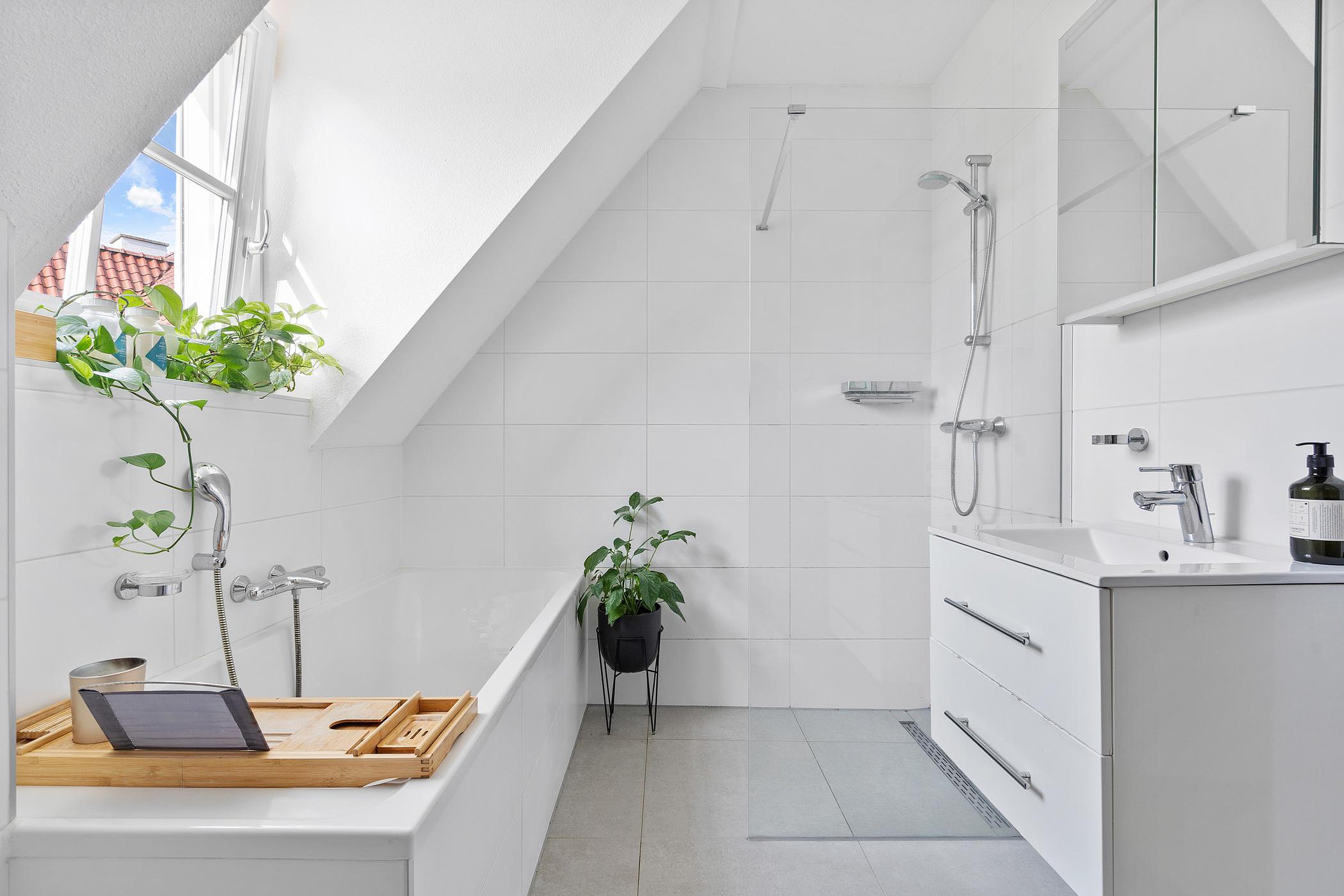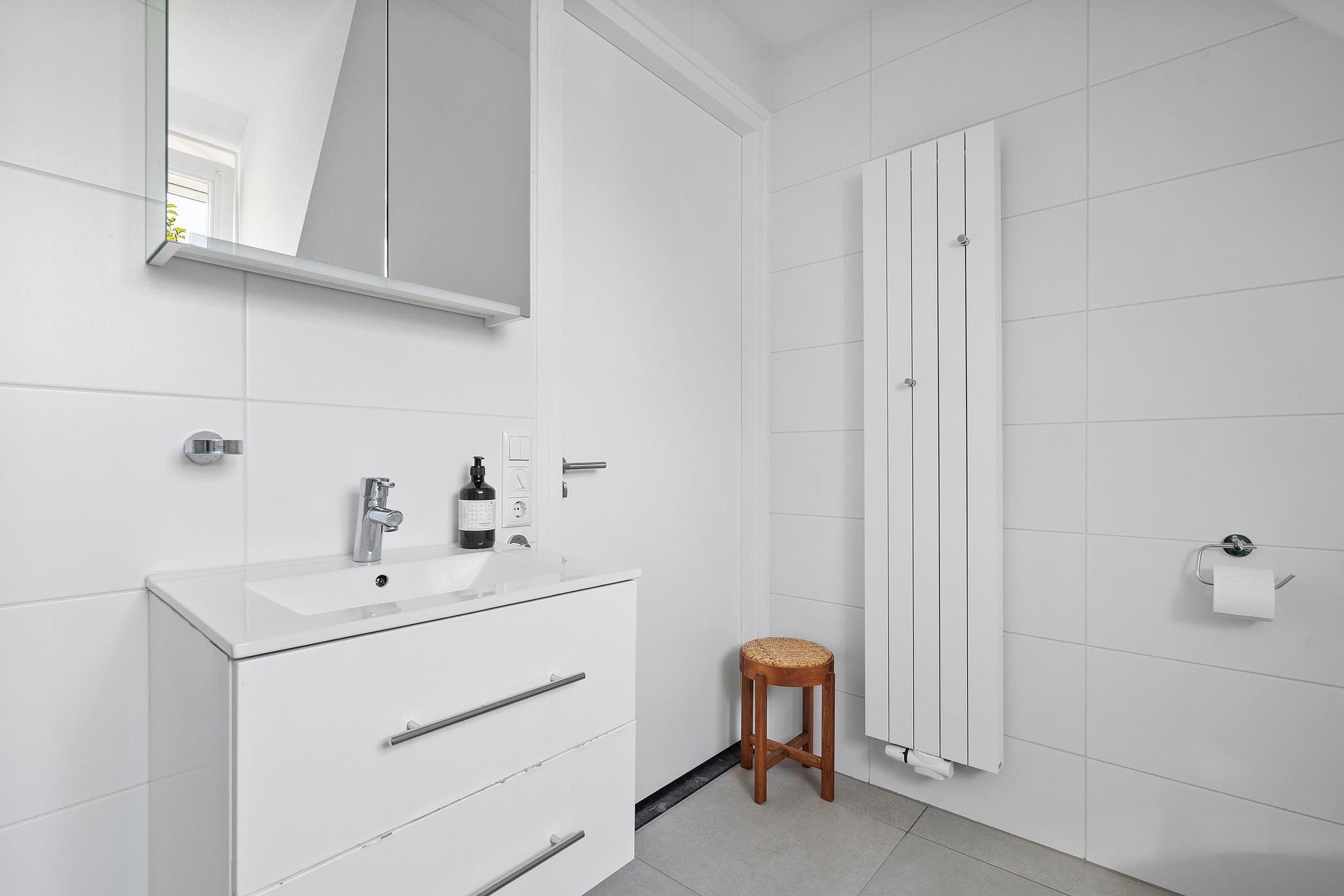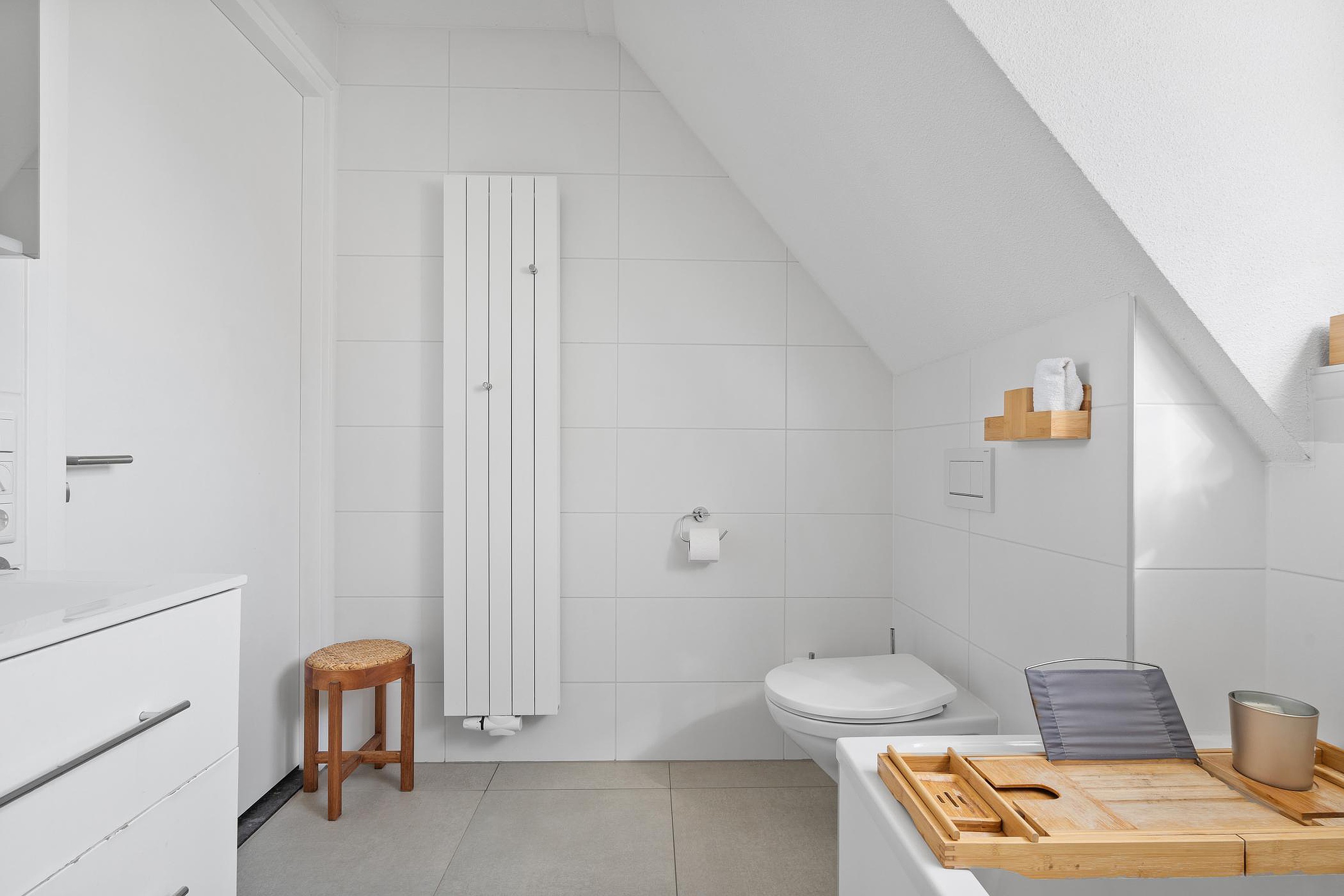 De geheel betegelde badkamer beschikt over een wandcloset, een royaal ligbad, een inloopdouche en een wandmeubel met geïntegreerde wastafel.