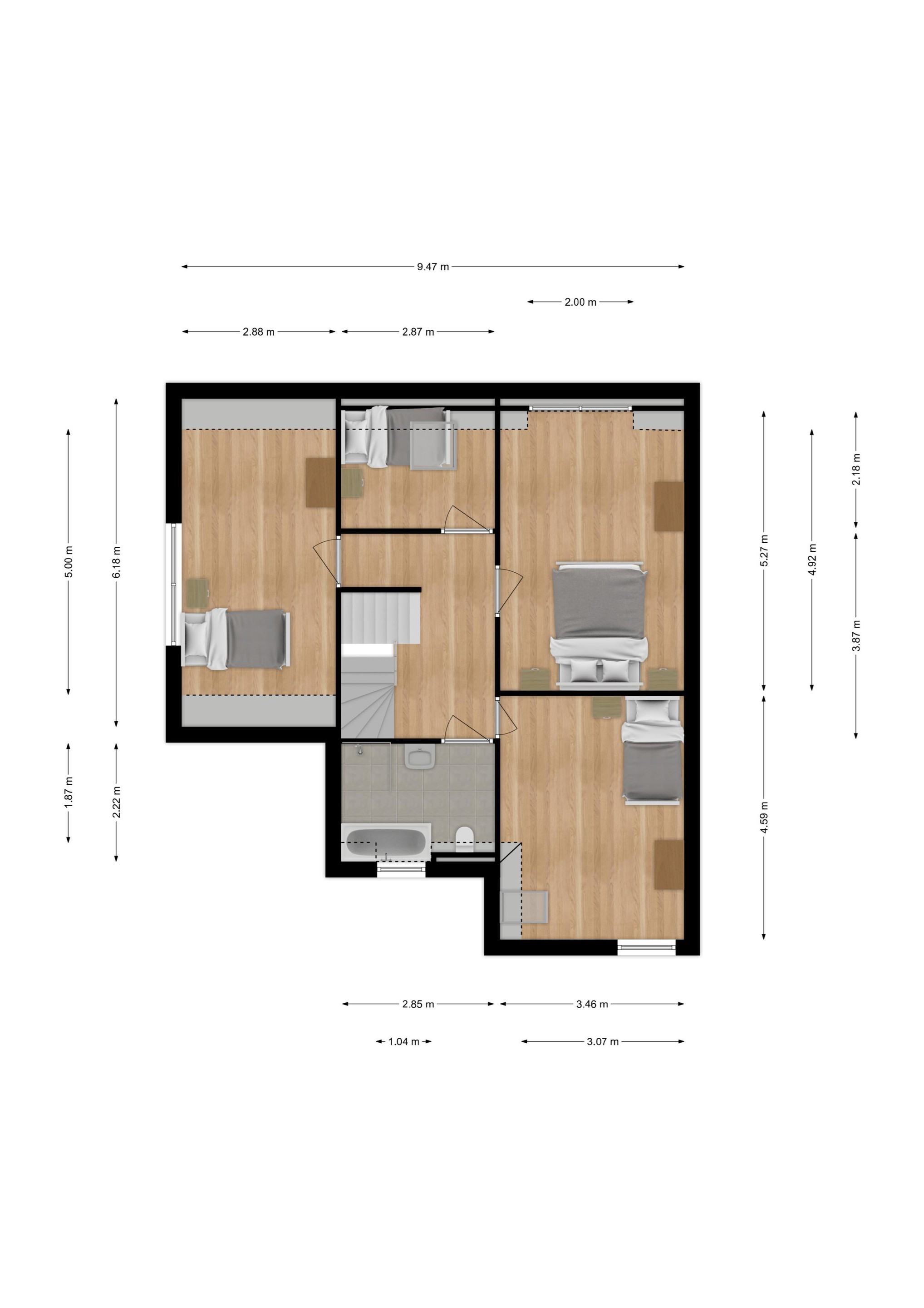 Eerste verdieping De overloop verbindt 4 goed bemeten slaapkamers, de complete badkamer en biedt tevens toegang tot de vaste trap naar de 2e verdieping.