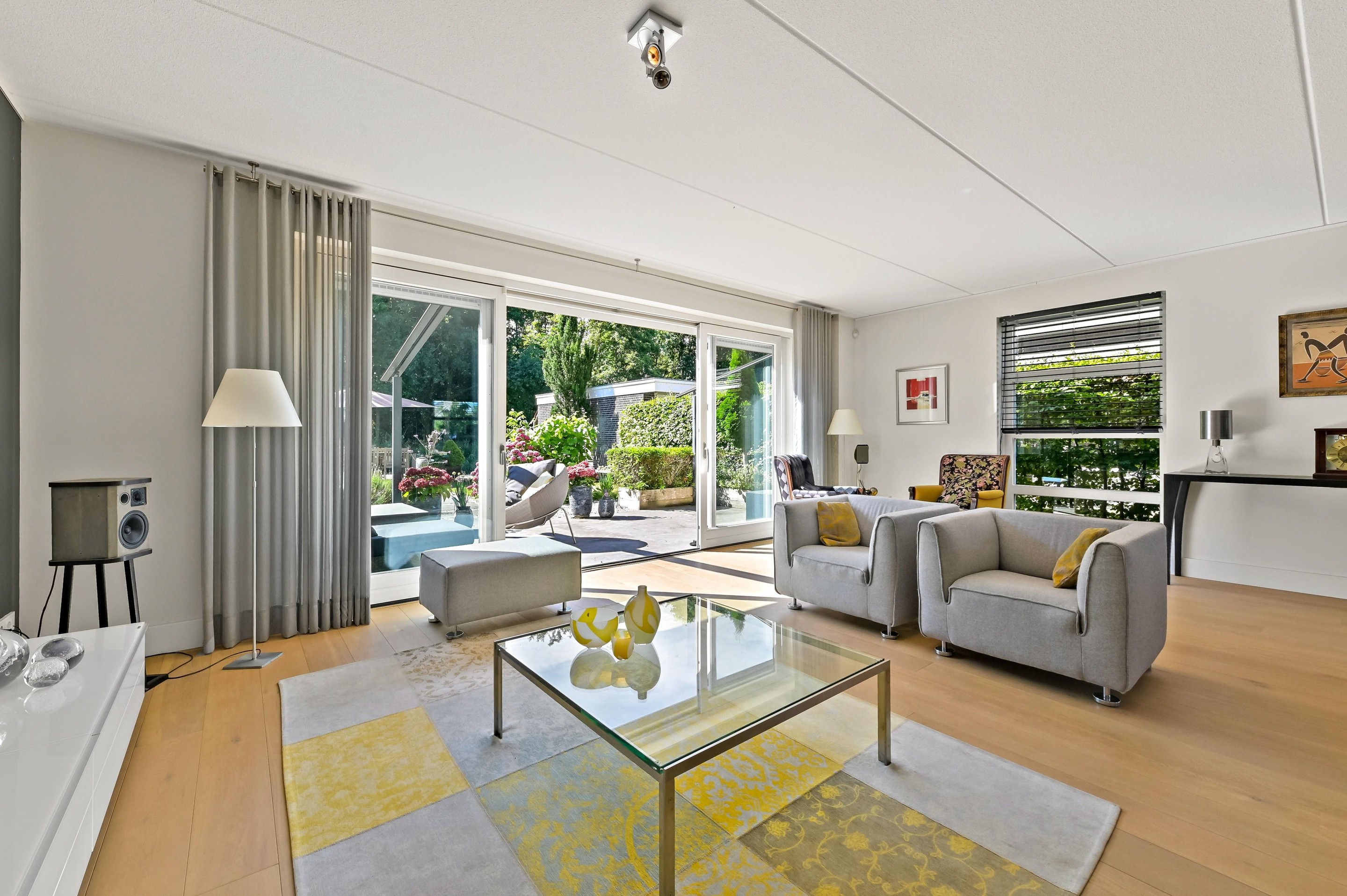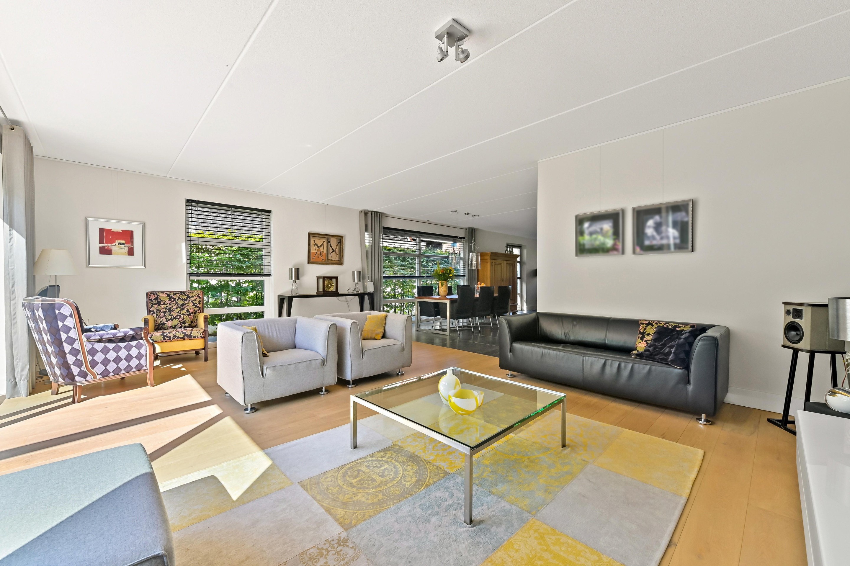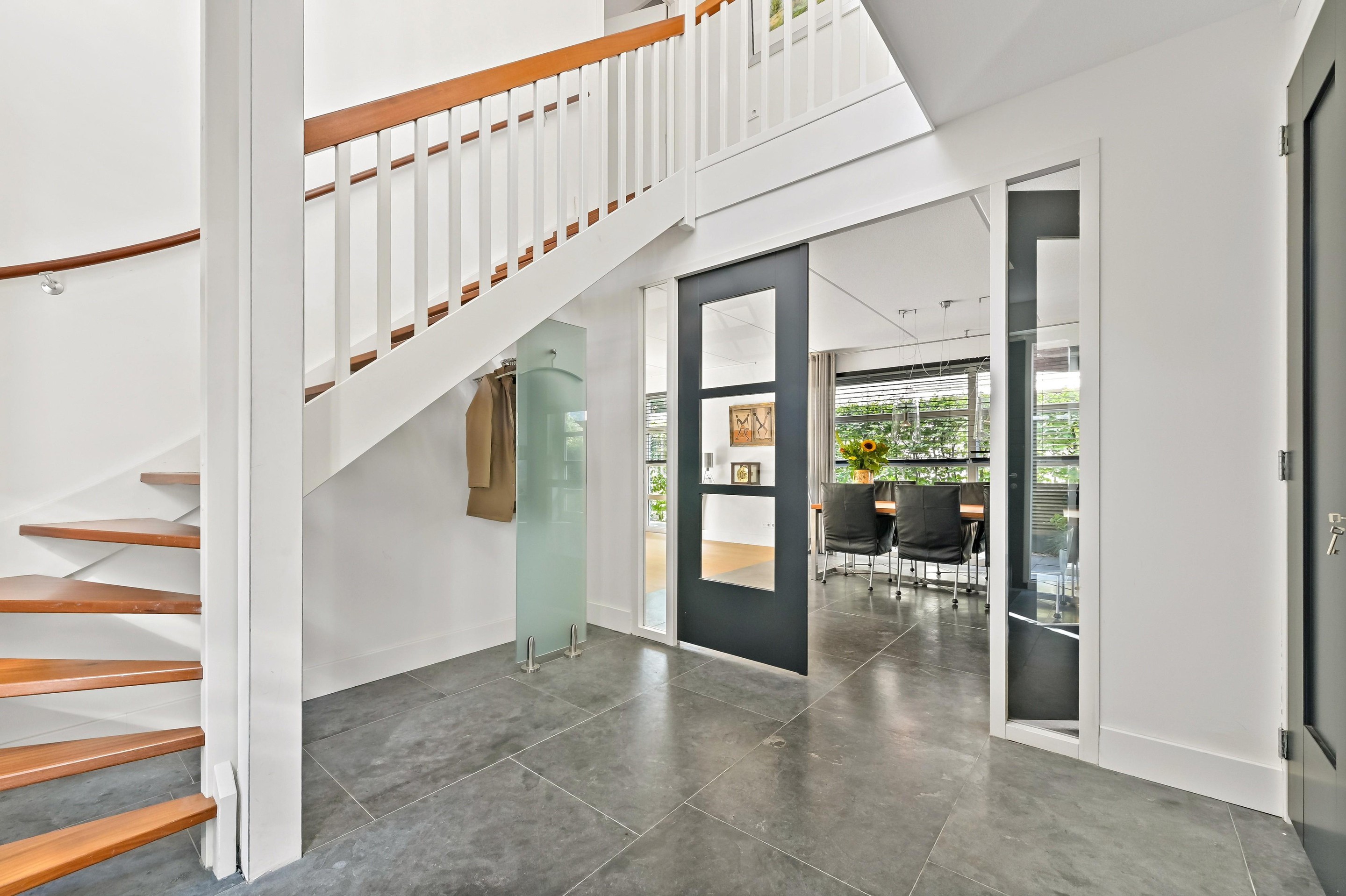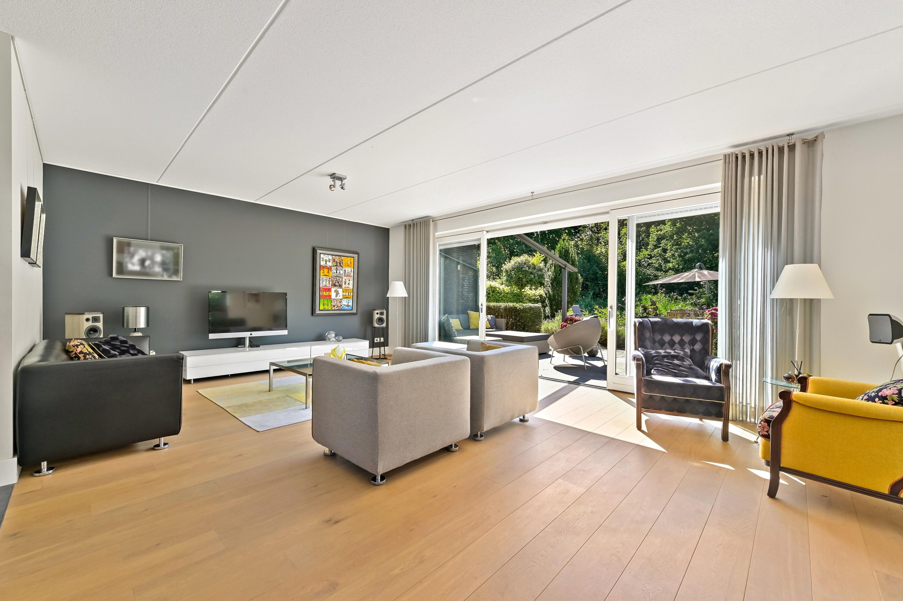 Via de verzorgd aangelegde voortuin met meerdere parkeerplaatsen en laadpaal op eigen terrein bereikt u de garage en hoofdentree van de woning aan de zijkant. Bij binnenkomst ervaart u direct een luxe sfeer door de aanwezigheid van een ruim opgezette hal met statige trap, indrukwekkende vide en grote raampartijen. In de hal vindt u de meterkast, garderobe en de moderne toiletruimte naast de voordeur welke is voorzien van een wandcloset en fonteintje. De dubbele deuren brengen u vanuit de hal naar de zeer royale living met open woonkeuken aan de voorzijde. De luxe, moderne keuken met kastenwand en kook-/spoeleiland van het merk Arclinea is uitgerust met een RVS werkblad met geïntegreerde spoelbak en vijfpits gaskookplaat en hoogwaardige inbouwapparatuur, waaronder een ingebouwde RVS afzuigkap, oven, koel-vrieskast, combi-stoom-oven, koffieautomaat, twee warmhoudlades en vaatwasser. Achter de keuken bevindt zich een praktische bijkeuken welke tevens te bereiken is via een deur in de zijgevel. In deze bijkeuken vindt u naast de diverse opbergmogelijkheden een spoelbak, extra koelkast en vriezer. De zeer royale L-vormige woonkamer is aan de achterzijde en zijkant van de woning gesitueerd. De woonkamer biedt voldoende plek voor een zeer ruime zithoek en grote eettafel, welke momenteel tussen de woonkamer en de keuken te vinden is. Dankzij de grote raampartijen in de zijgevel komt er van drie zijden licht de woning binnen. De royale schuifpui in de achtergevel biedt toegang tot de schitterende, op het zuiden georiënteerde achtertuin. De achtertuin is onder architectuur aangelegd en voorzien van onder andere een onderheid terras, elektrisch bedienbaar zonnescherm, drainagesysteem, buitenkraan en tuinverlichting. In de achtertuin zijn meerdere terrassen te vinden waardoor u gedurende de dag altijd wel een plekje in de zon (en schaduw) kunt vinden. De achtertuin grenst via een watergang aan het Maaslandse Bos, waardoor u heel veel privacy in de tuin zult ervaren. Vanuit de achtertuin is tevens de garage te bereiken. In de garage vindt u onder andere elektra, verlichting, op maat gemaakte kasten en dubbele deuren naar de oprit aan de voorzijde. Ook is er in de garage een 220 grondkabel aanwezig, welke naar de achtertuin is doorgetrokken. De garage is een ideale plek voor het opbergen van uw spullen of bijvoorbeeld het stallen van de fietsen van het gehele gezin.
