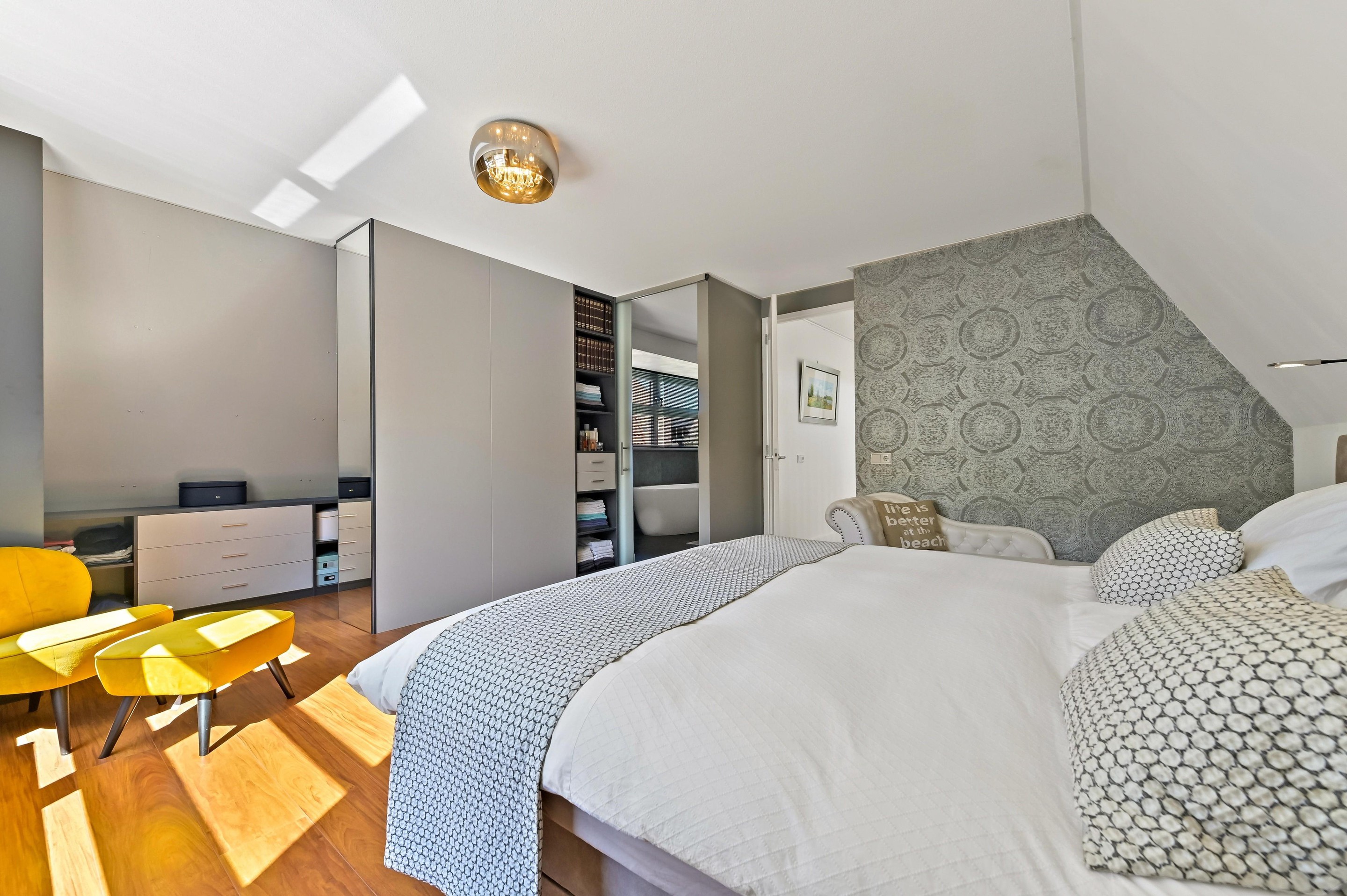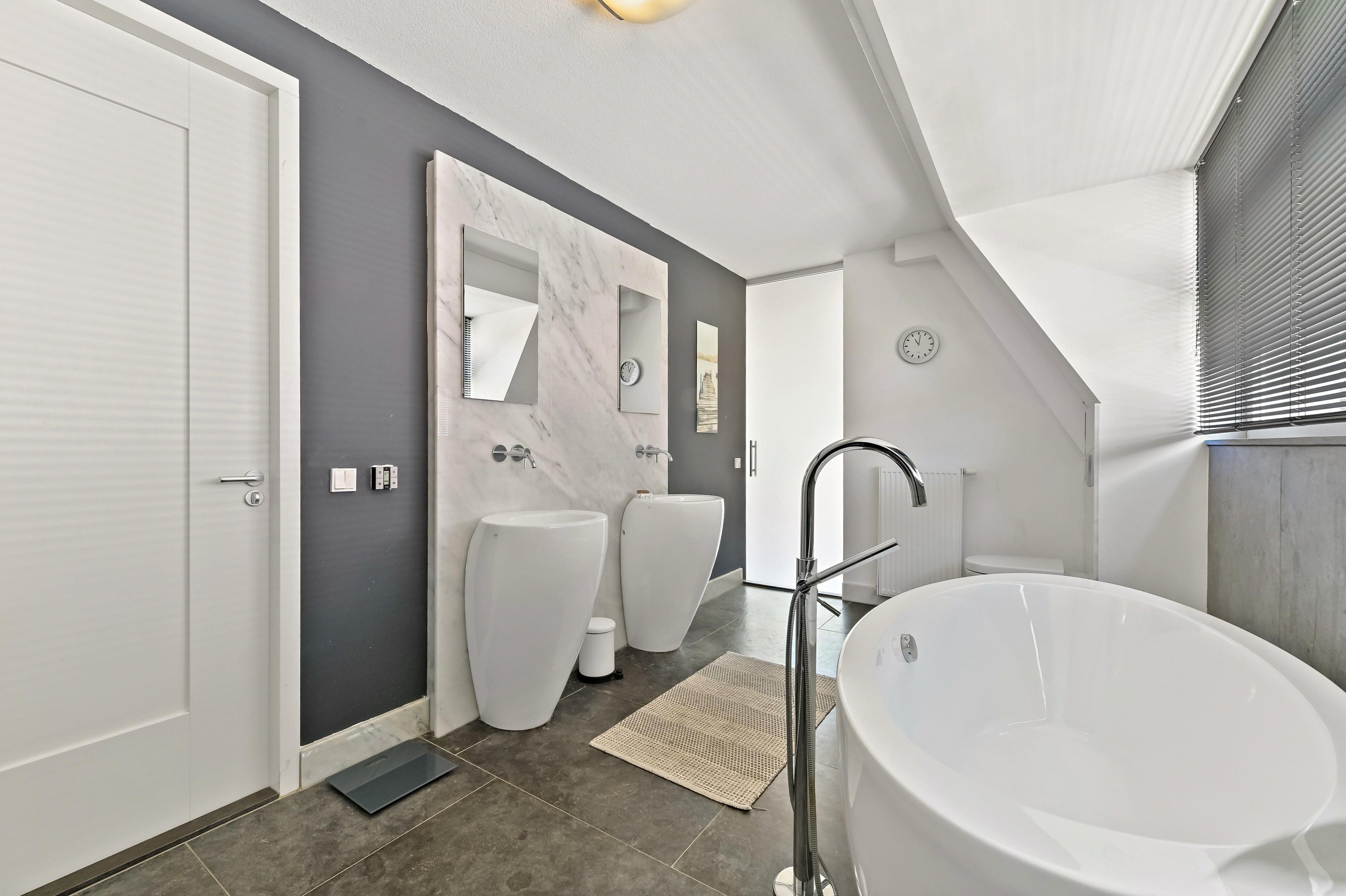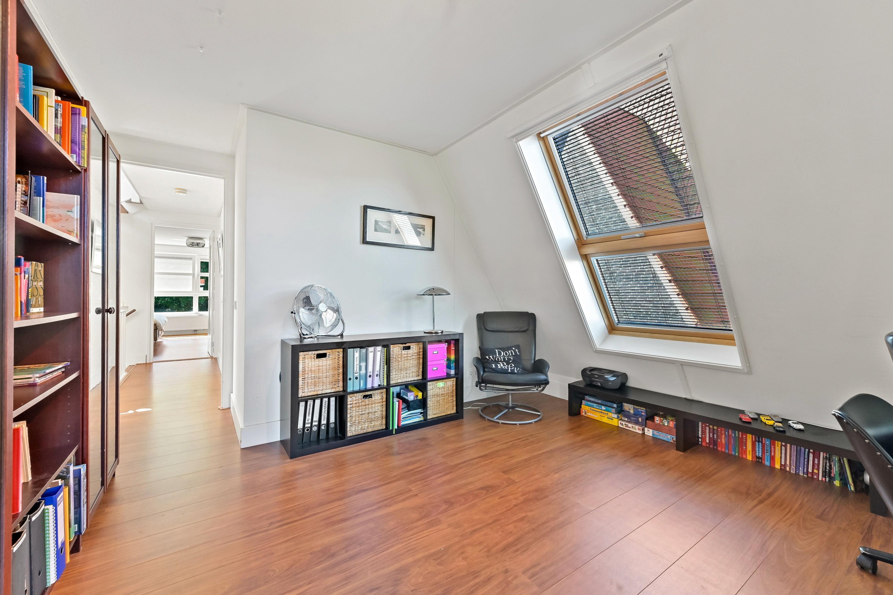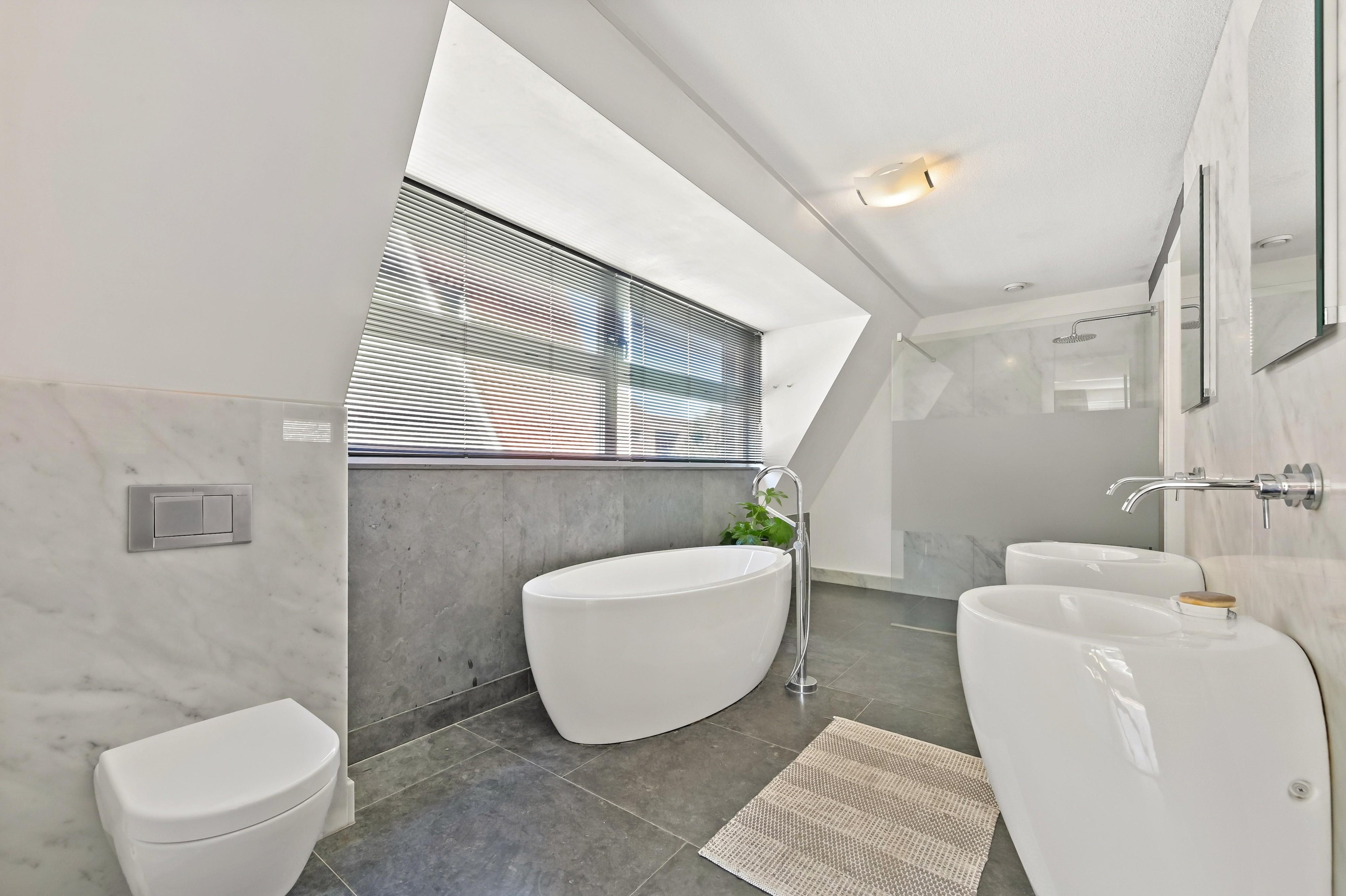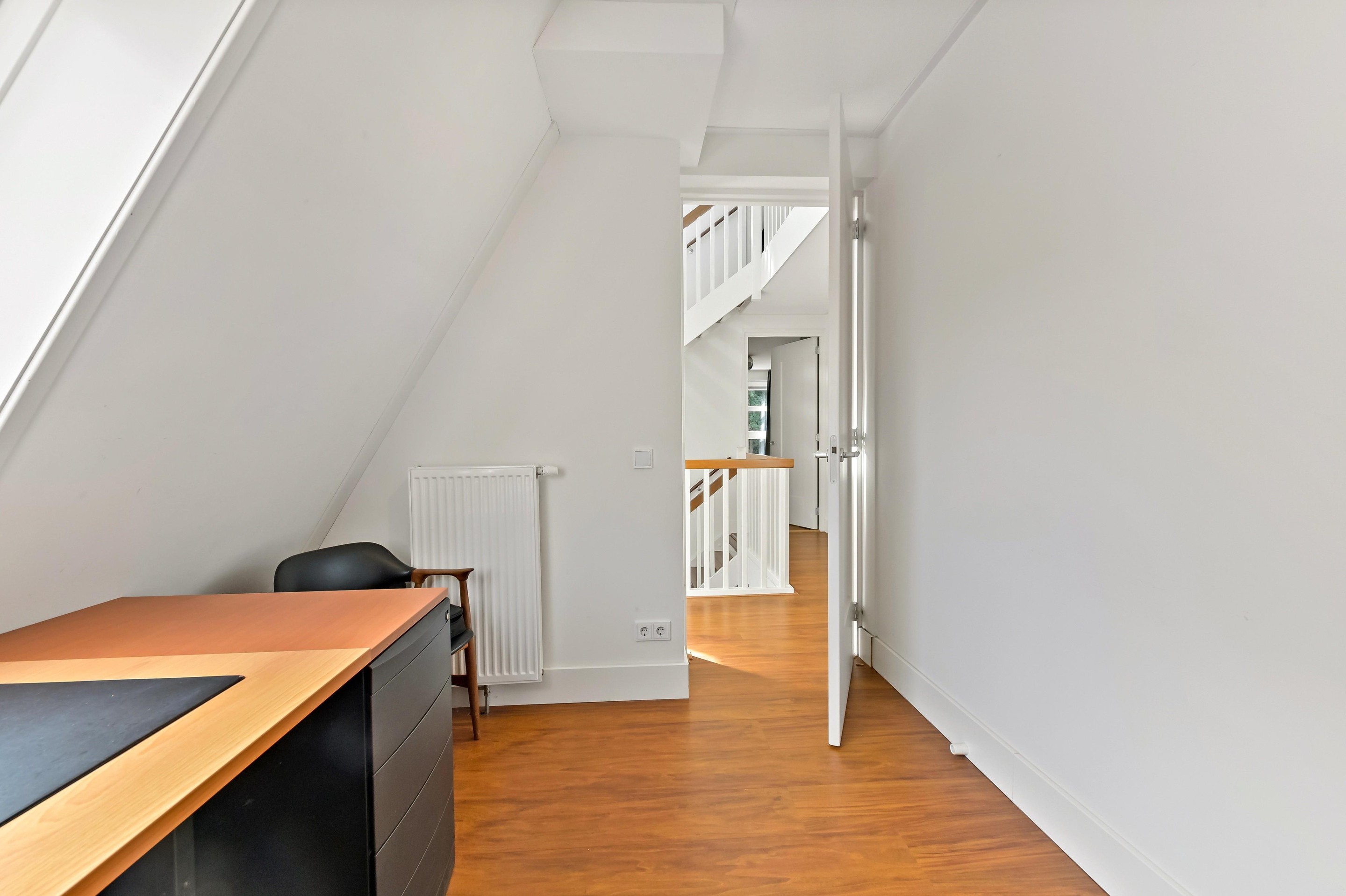 Eerste verdieping De lichte overloop met trapopgang naar de tweede verdieping biedt toegang tot alle vertrekken op deze etage. De master bedroom bevindt zich aan de achterzijde van de woning. In deze slaapkamer is een lagere raampartij aanwezig waardoor u vanuit het bed fantastisch uitzicht heeft op het groen. In de master bedroom is een walk-in closet aanwezig evenals een deur naar de aangrenzende badkamer. De luxe, moderne badkamer is voorzien van een royale inloopdouche, vrijstaand ligbad, twee wastafels met ingebouwde spiegelkasten, radiator en tweede toilet. De badkamer is tevens vanaf de overloop te bereiken. Aan de voorzijde zijn twee slaapkamers gesitueerd. De grootste slaapkamer is voorzien van een inloopkast en heeft dankzij het dubbele dakraam veel lichtinval. De tweede slaapkamer is op dit moment in gebruik als kantoorruimte.