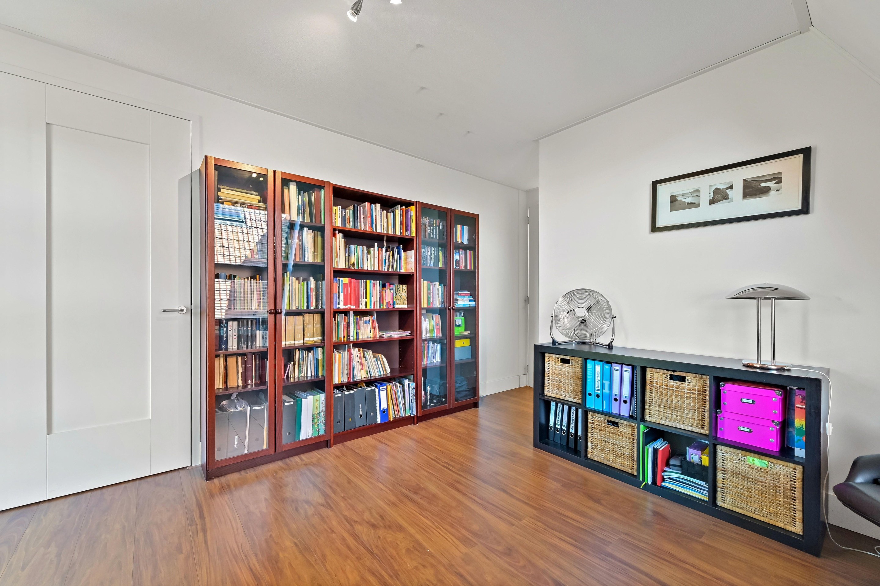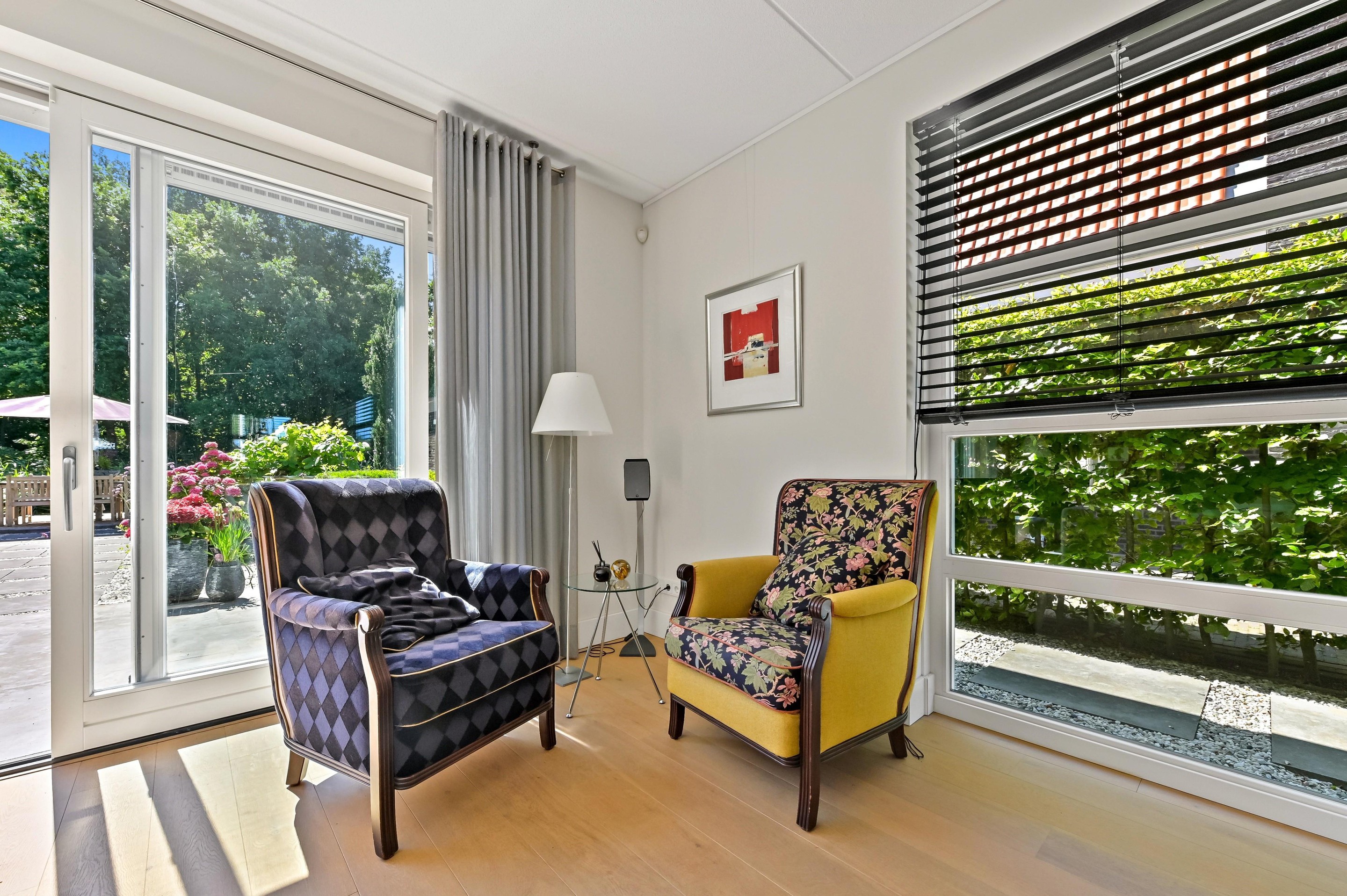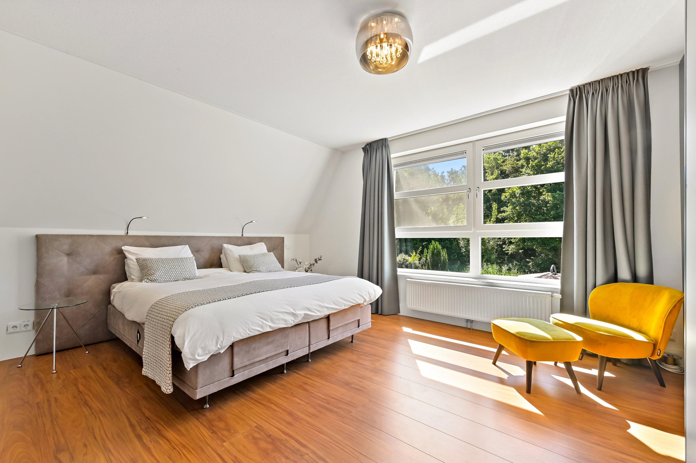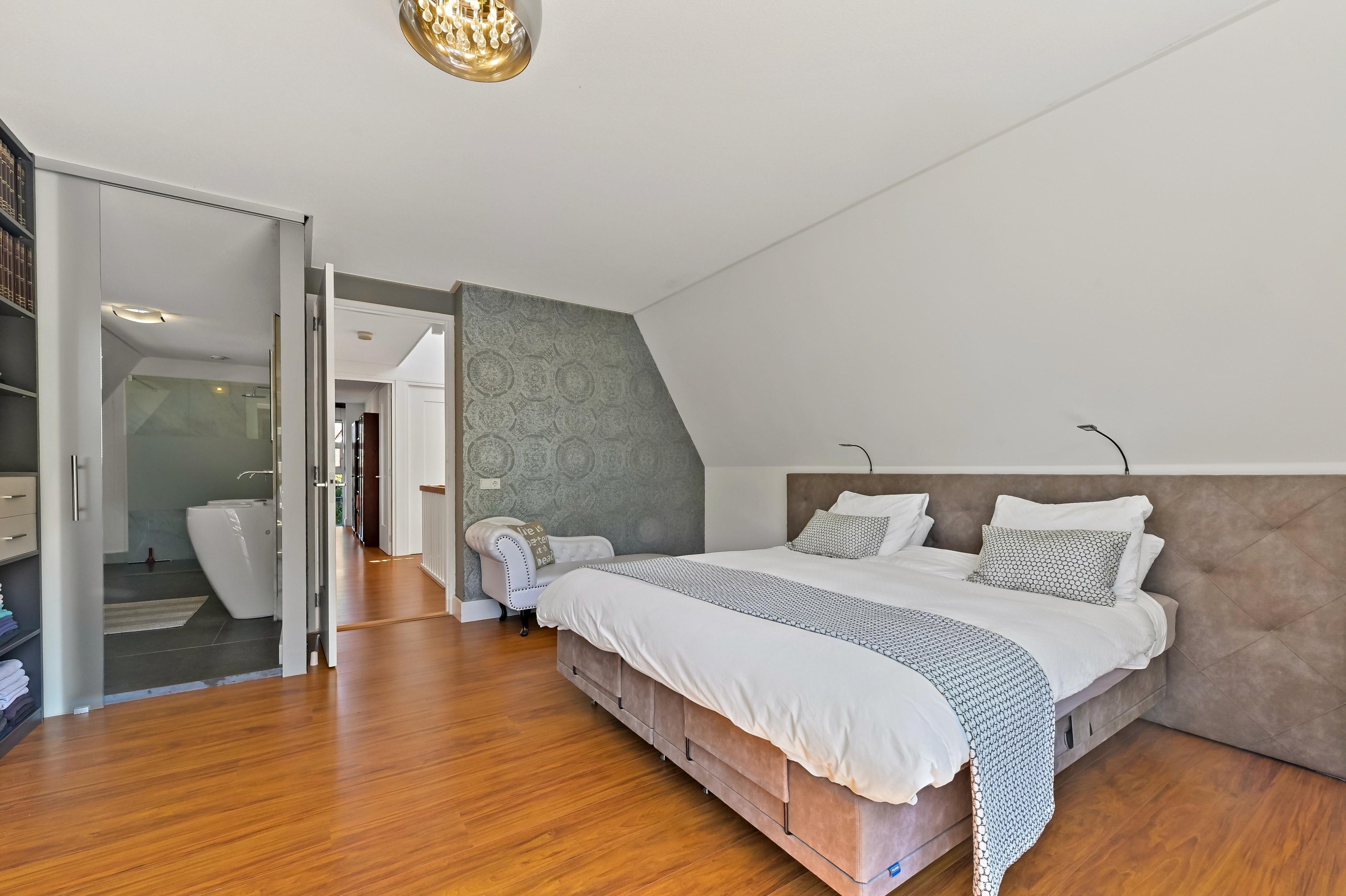 Eerste verdieping De lichte overloop met trapopgang naar de tweede verdieping biedt toegang tot alle vertrekken op deze etage. De master bedroom bevindt zich aan de achterzijde van de woning. In deze slaapkamer is een lagere raampartij aanwezig waardoor u vanuit het bed fantastisch uitzicht heeft op het groen. In de master bedroom is een walk-in closet aanwezig evenals een deur naar de aangrenzende badkamer. De luxe, moderne badkamer is voorzien van een royale inloopdouche, vrijstaand ligbad, twee wastafels met ingebouwde spiegelkasten, radiator en tweede toilet. De badkamer is tevens vanaf de overloop te bereiken. Aan de voorzijde zijn twee slaapkamers gesitueerd. De grootste slaapkamer is voorzien van een inloopkast en heeft dankzij het dubbele dakraam veel lichtinval. De tweede slaapkamer is op dit moment in gebruik als kantoorruimte.