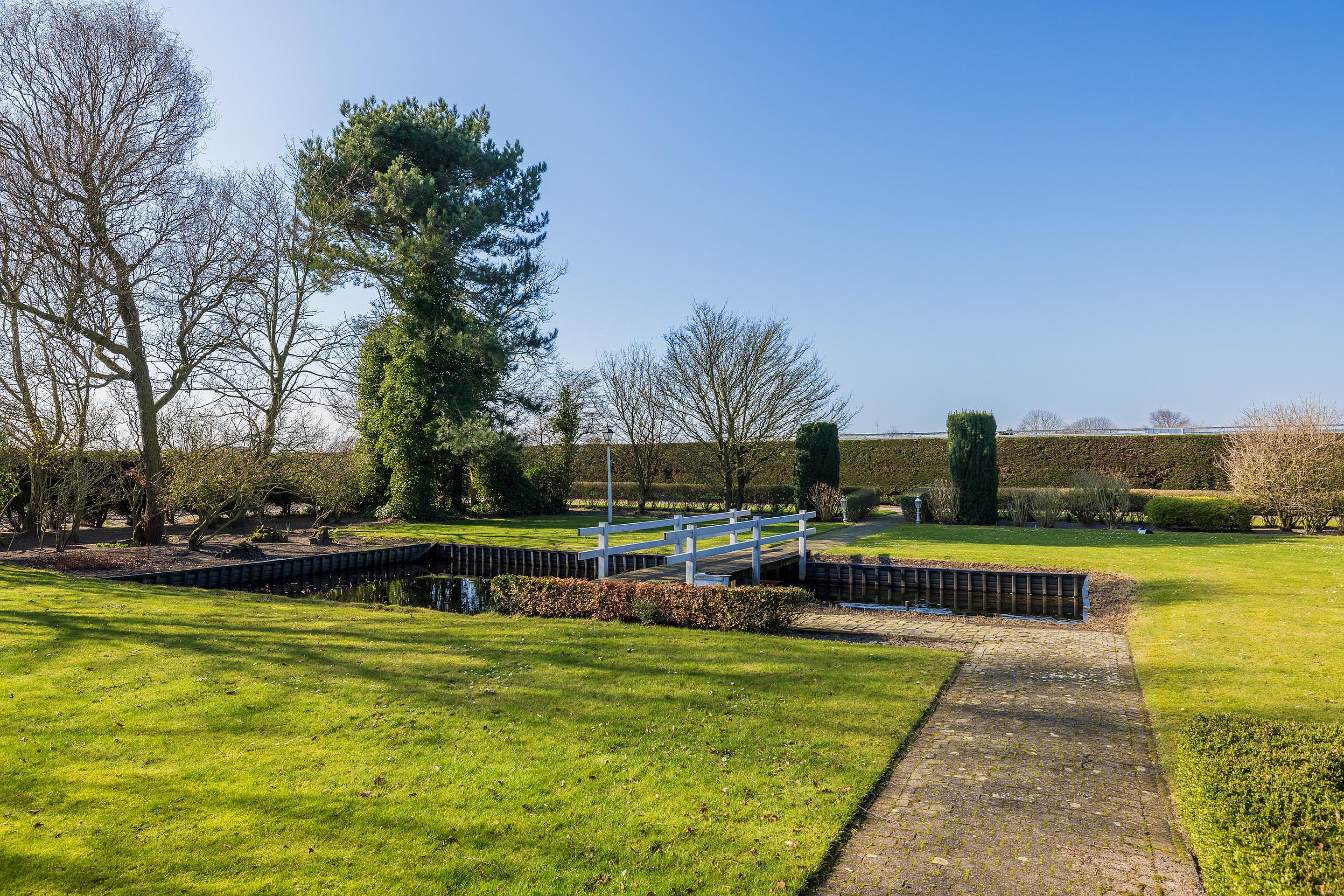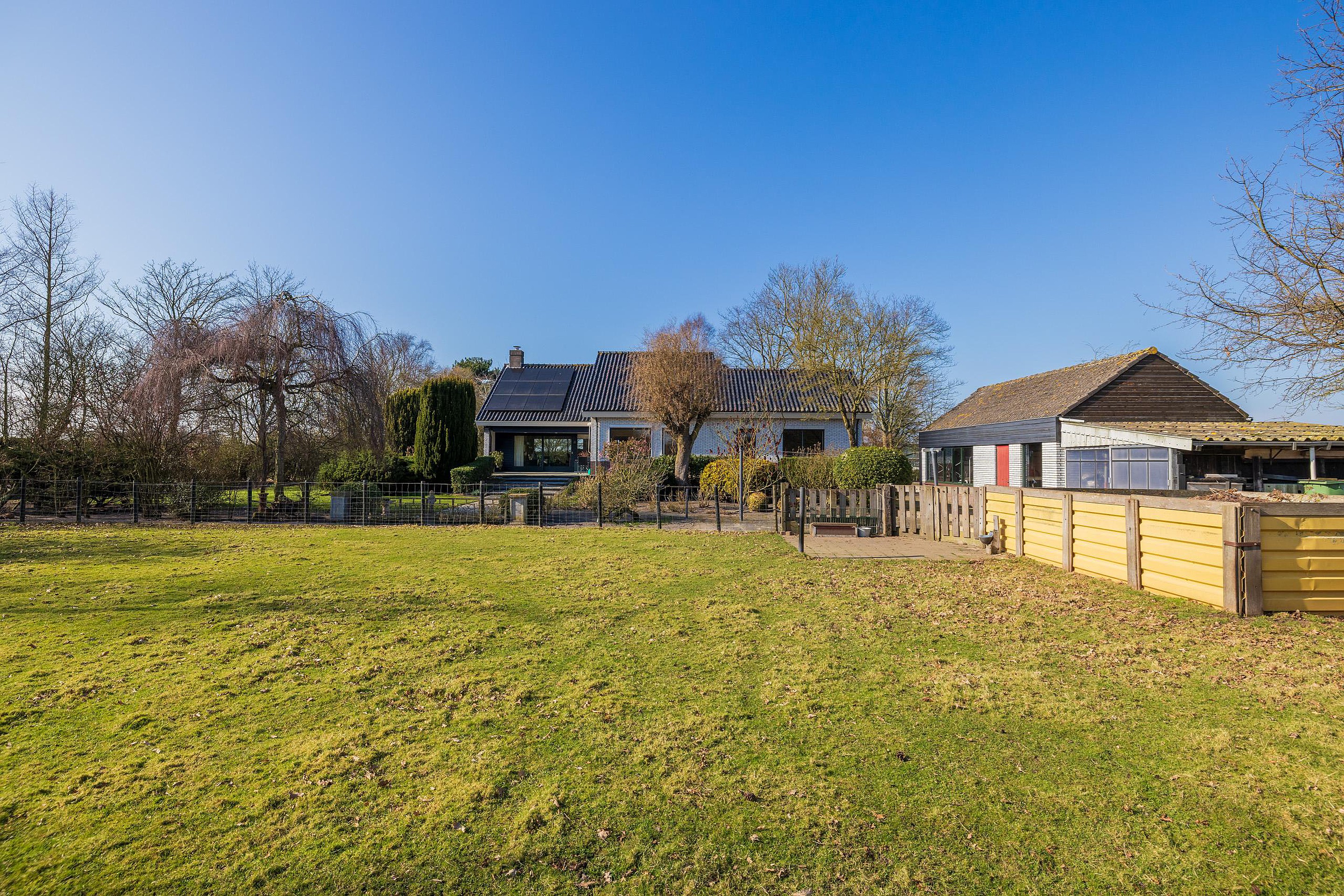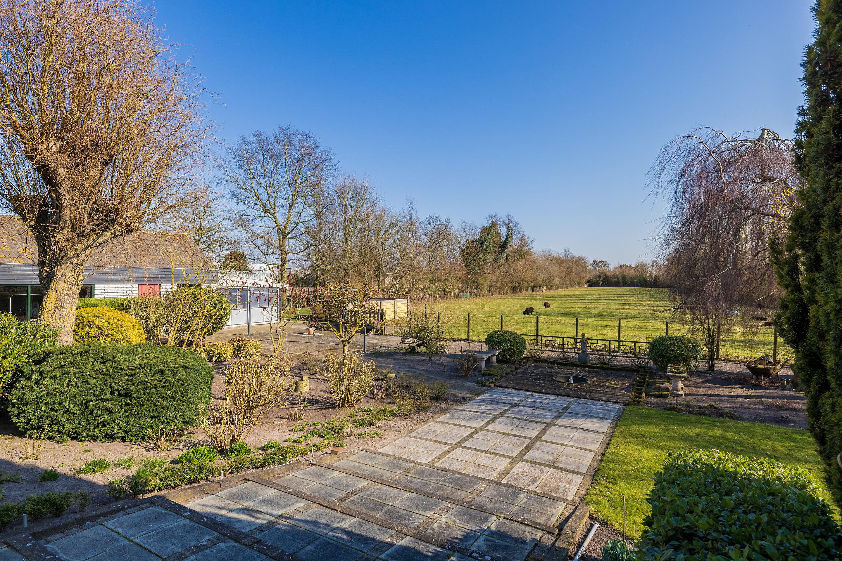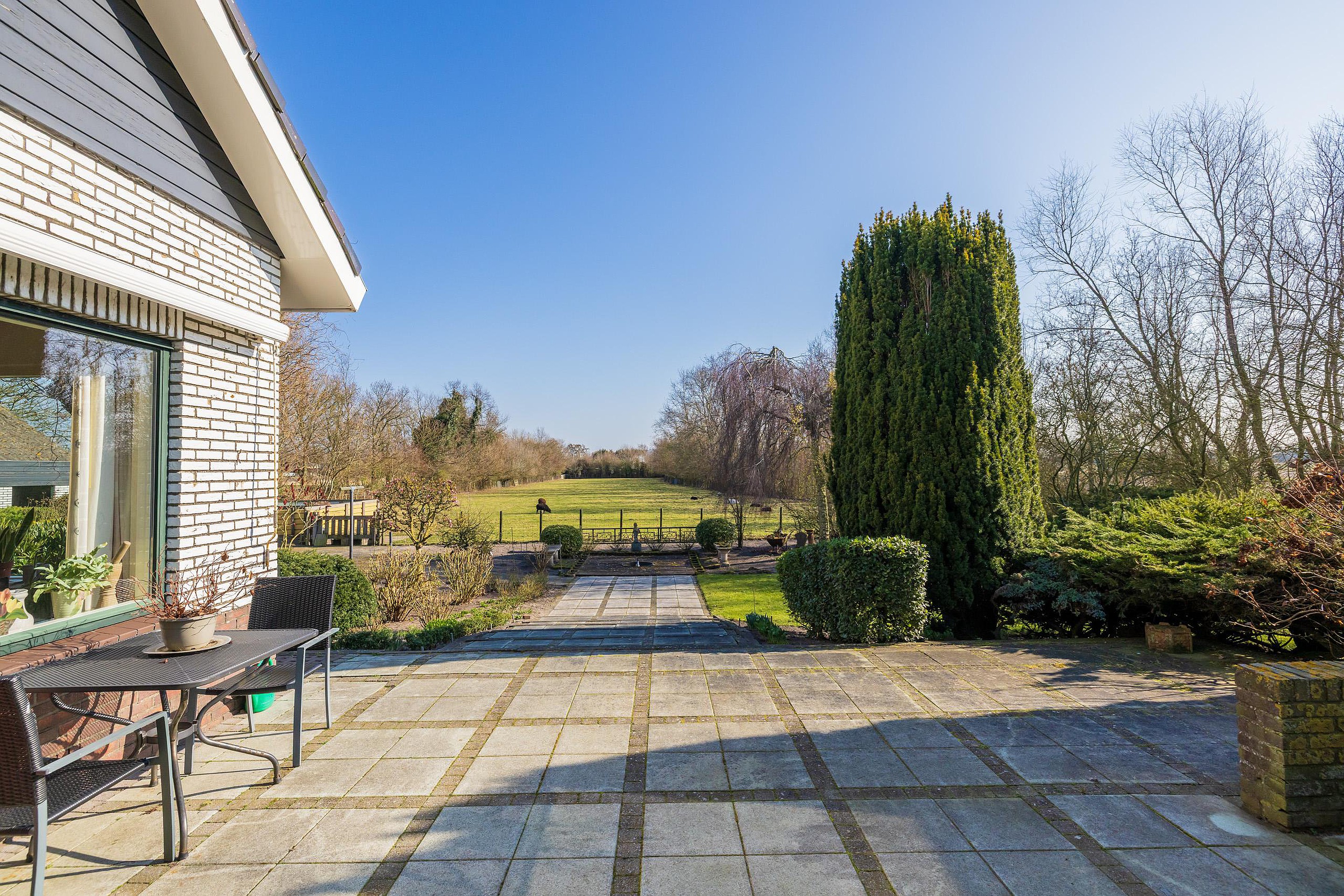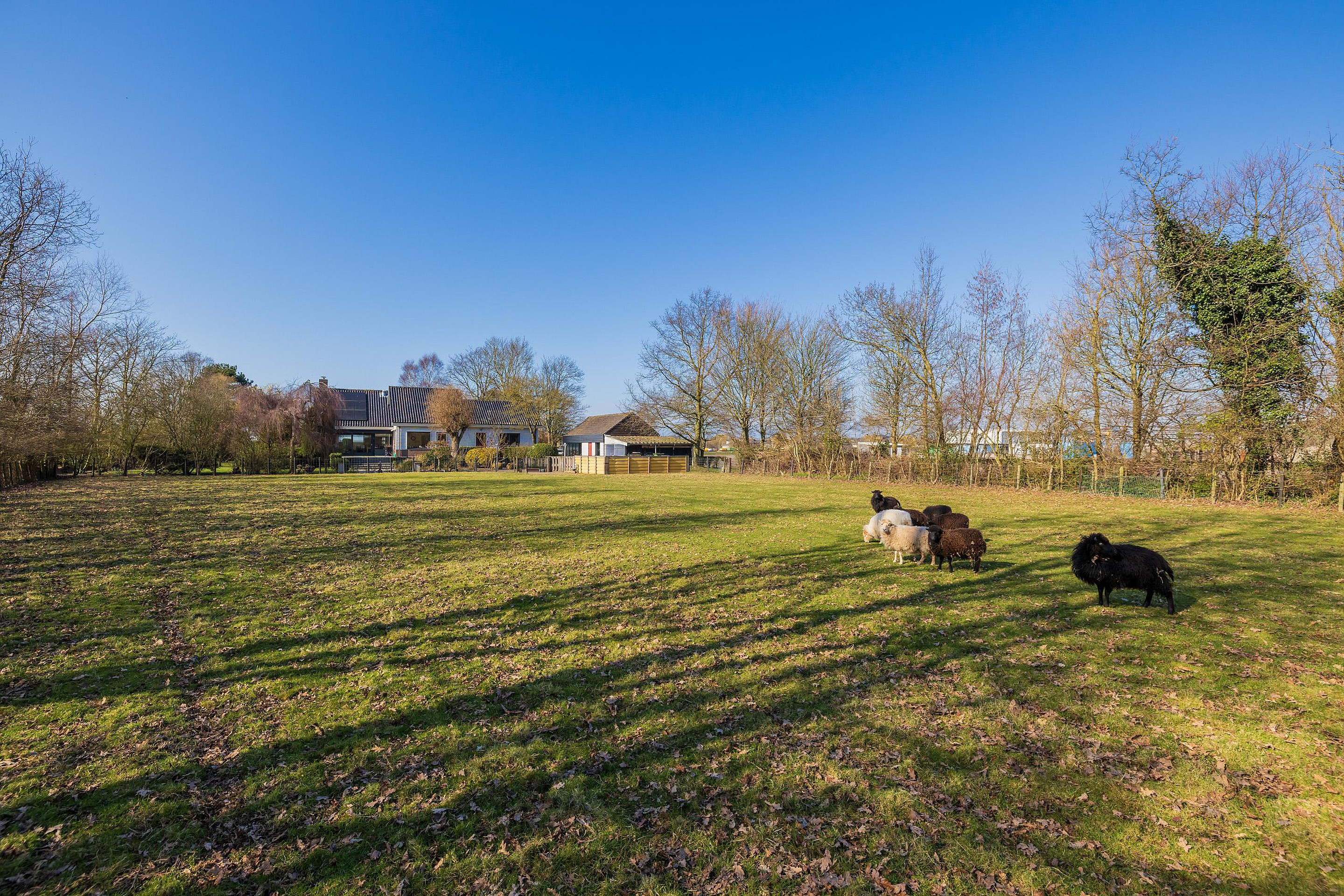 De meer dan riante voortuin is met zorg aangelegd en voorzien van een sproeisysteem, een vijver, een bruggetje en een prachtige fontein. Aan de achterzijde is er een groot zonnenterras aangelegend met vrij uizicht over de schapenweide.