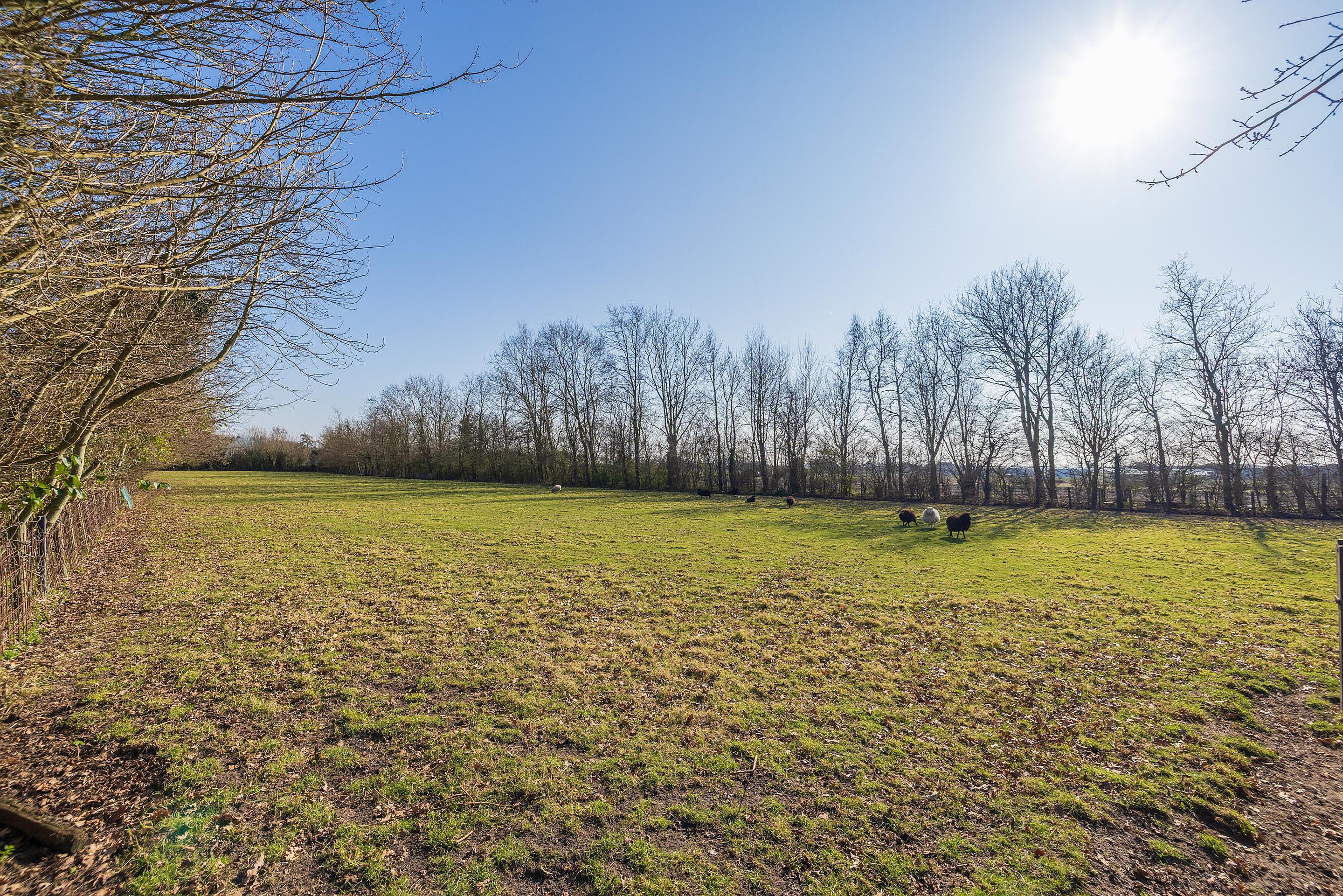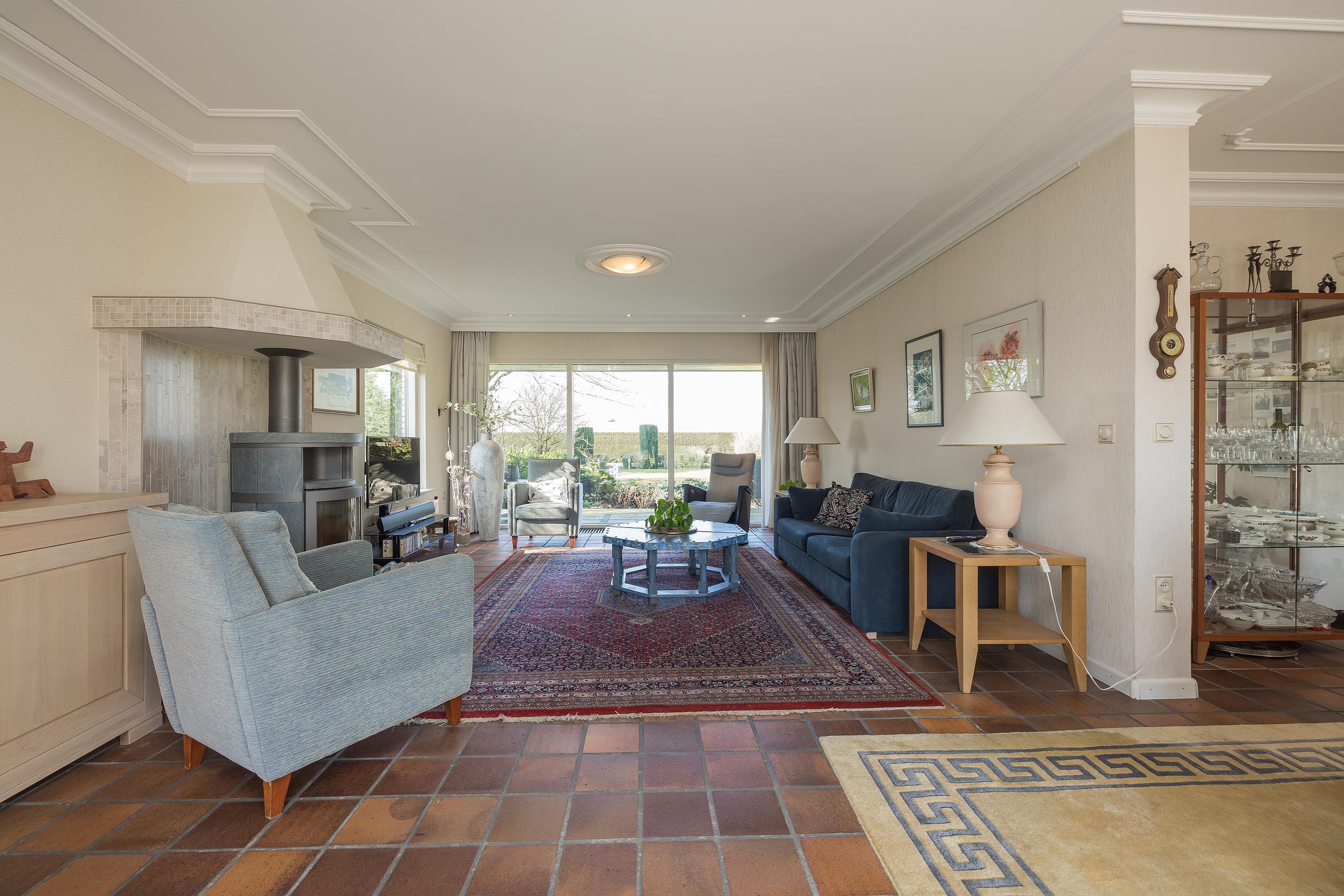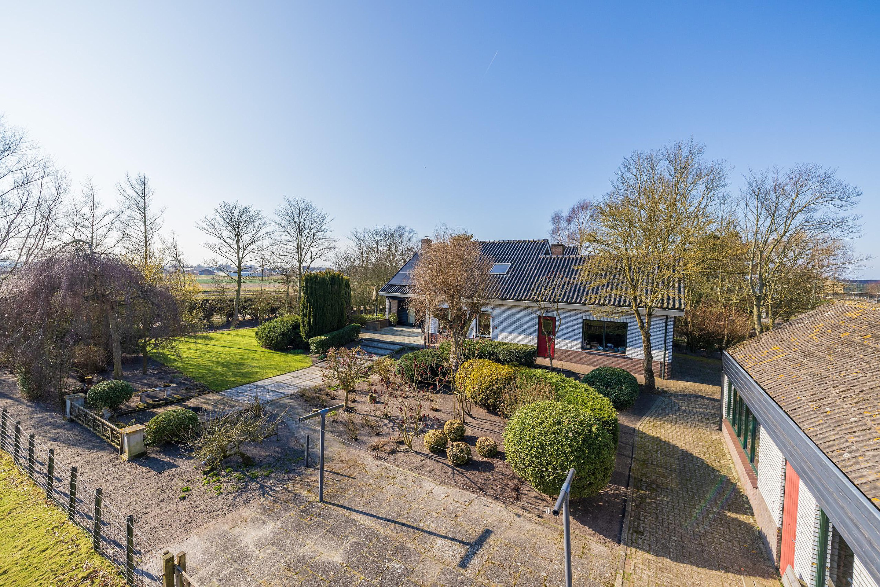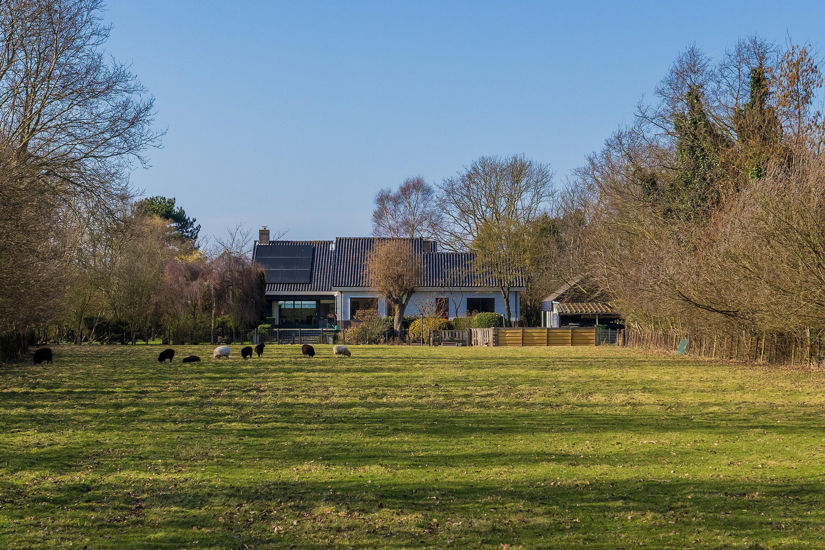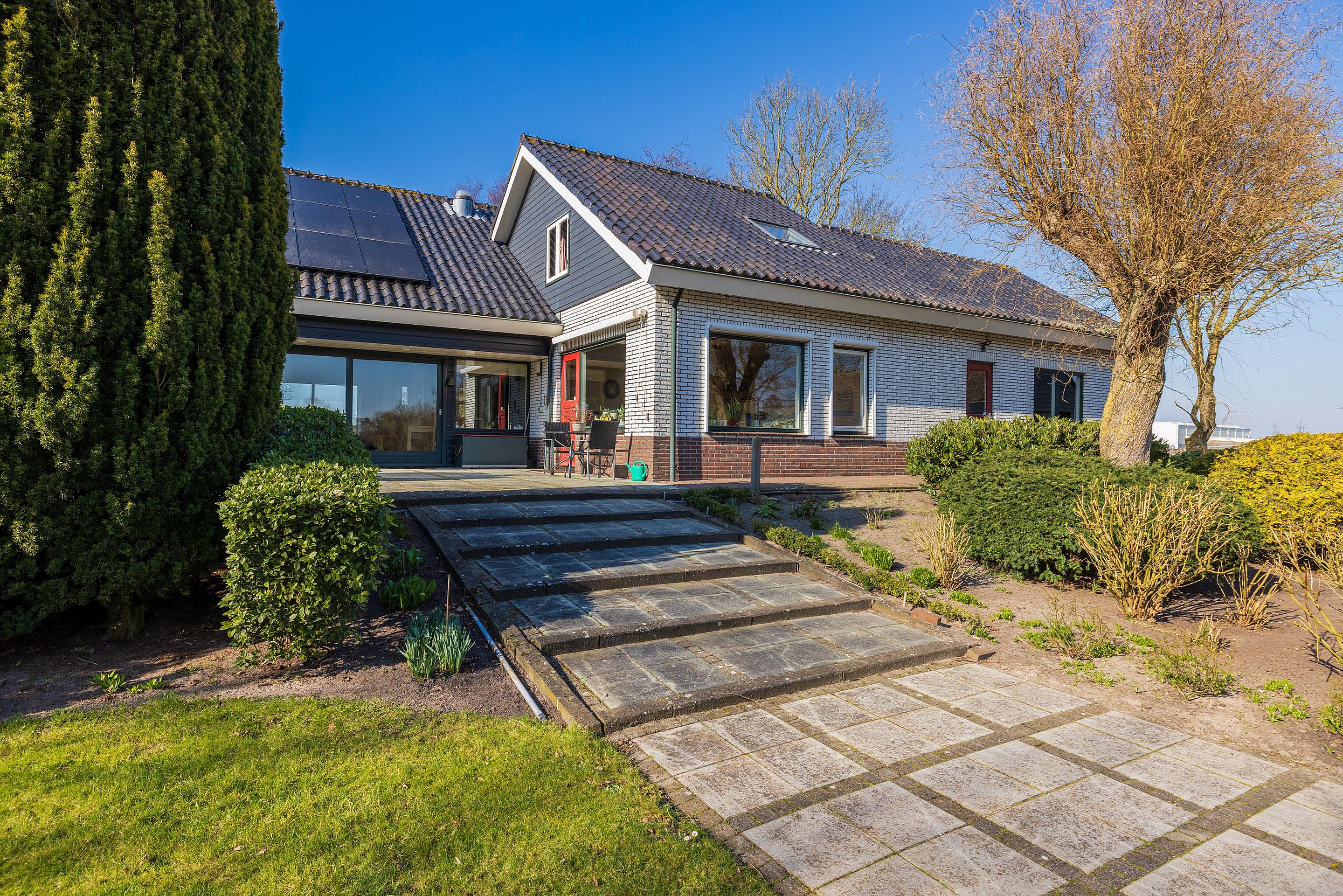 De meer dan riante voortuin is met zorg aangelegd en voorzien van een sproeisysteem, een vijver, een bruggetje en een prachtige fontein. Aan de achterzijde is er een groot zonnenterras aangelegend met vrij uizicht over de schapenweide.