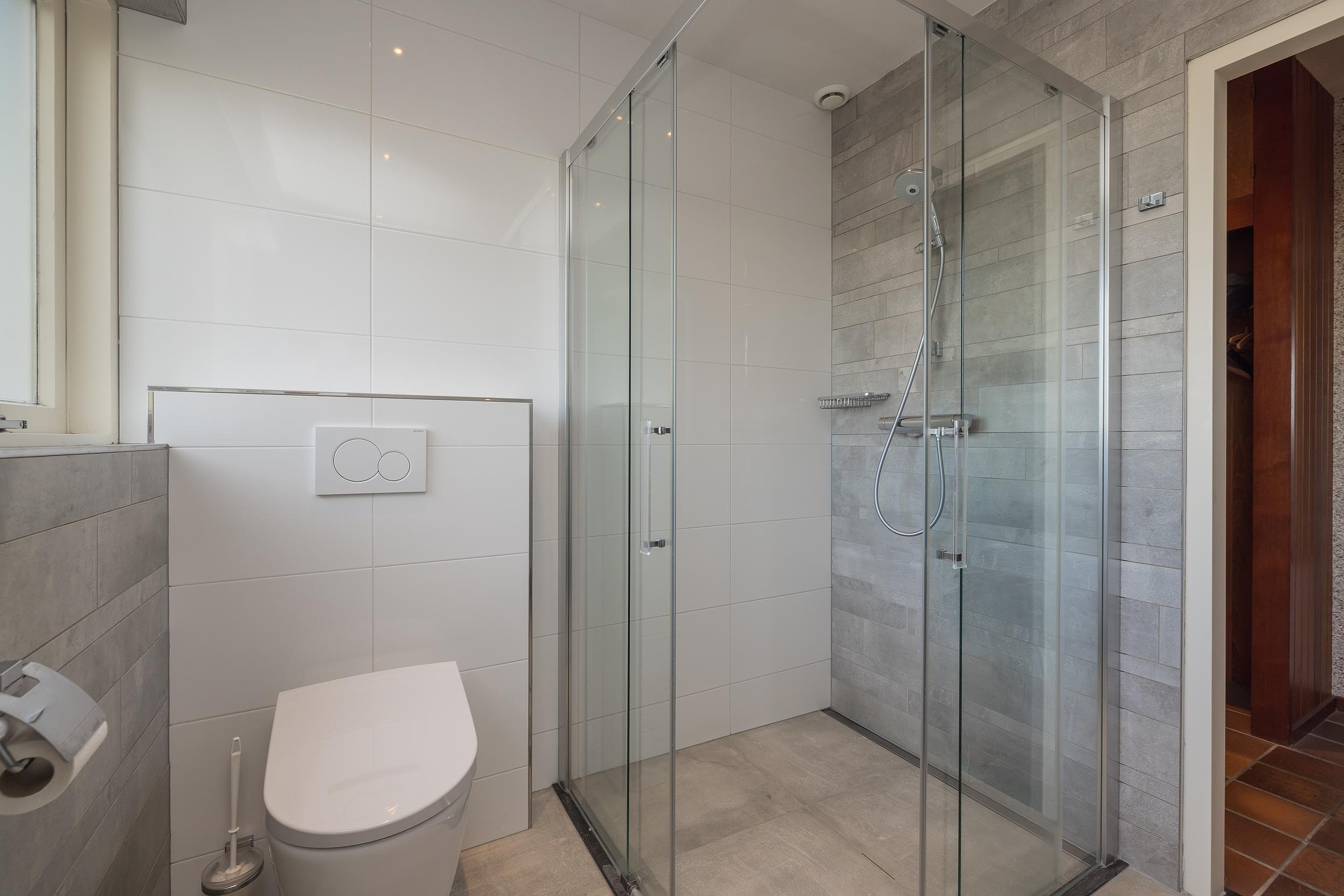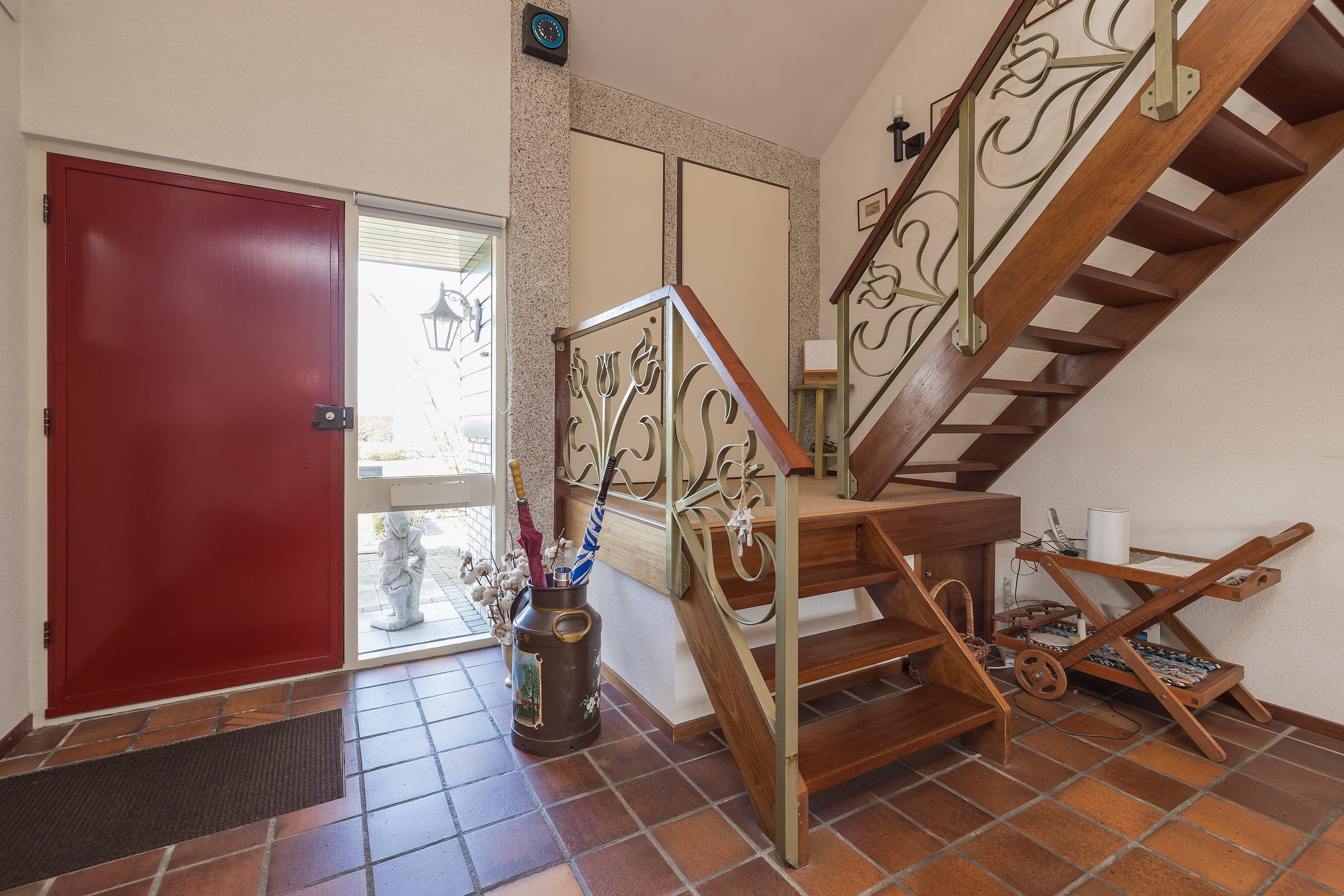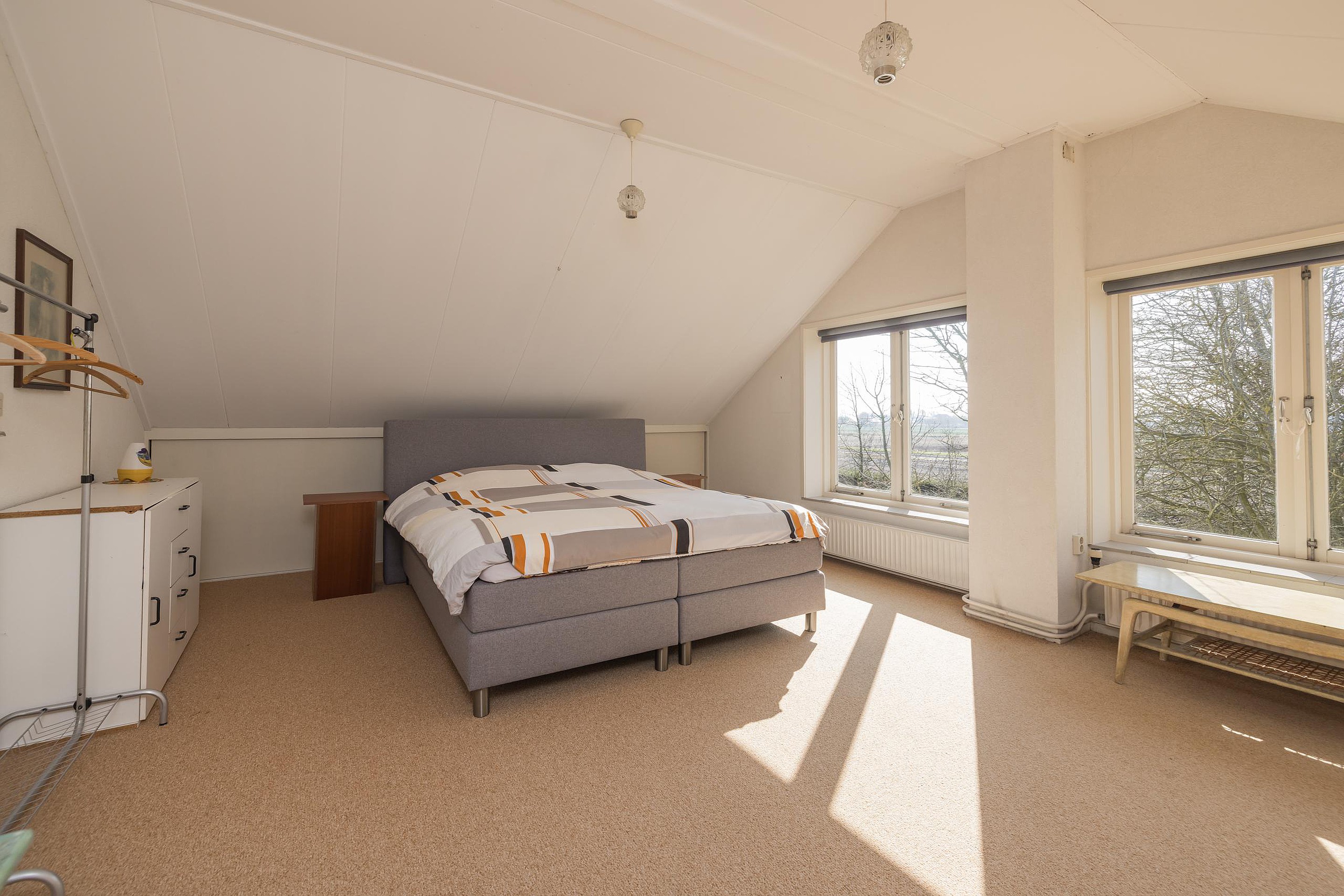 Entree, een ruime hal met de garderobe, de meterkast en de toiletruimte met een wandcloset en een fonteintje. Via de hal is de aan de voorzijde gelegen slaapkamer bereikbaar, deze kamer is voorzien van dubbele beglazing en horren. De moderne en in een grijze kleur betegelde badkamer heeft een douchecabine, een wandcloset, een wastafelmeubel, een spiegelkast en vloerverwarming. Via de hal komt u in de meer dan riante woonkamer met een plavuizenvloer, een houtkachel en een convectorput aan de voor- en aan de achterzijde. De schuifpui biedt toegang tot het zonneterras en biedt een fantastisch weids uitzicht over de grasweide. Via de woonkamer is de riante woonkeuken te bereiken met diverse inbouwapparatuur zoals een inductiekookplaat met afzuigkap, een dubbele spoelbak, een vaatwasser, een koelkast, een combimagnetron en een stenen aanrechtblad. Via de keuken is de bijkeuken te bereiken met de opstelling van de wasapparatuur, deze ruimte heeft ook nog een ingebouwde kast, via de bijkeuken is de garage inpandig bereikbaar.