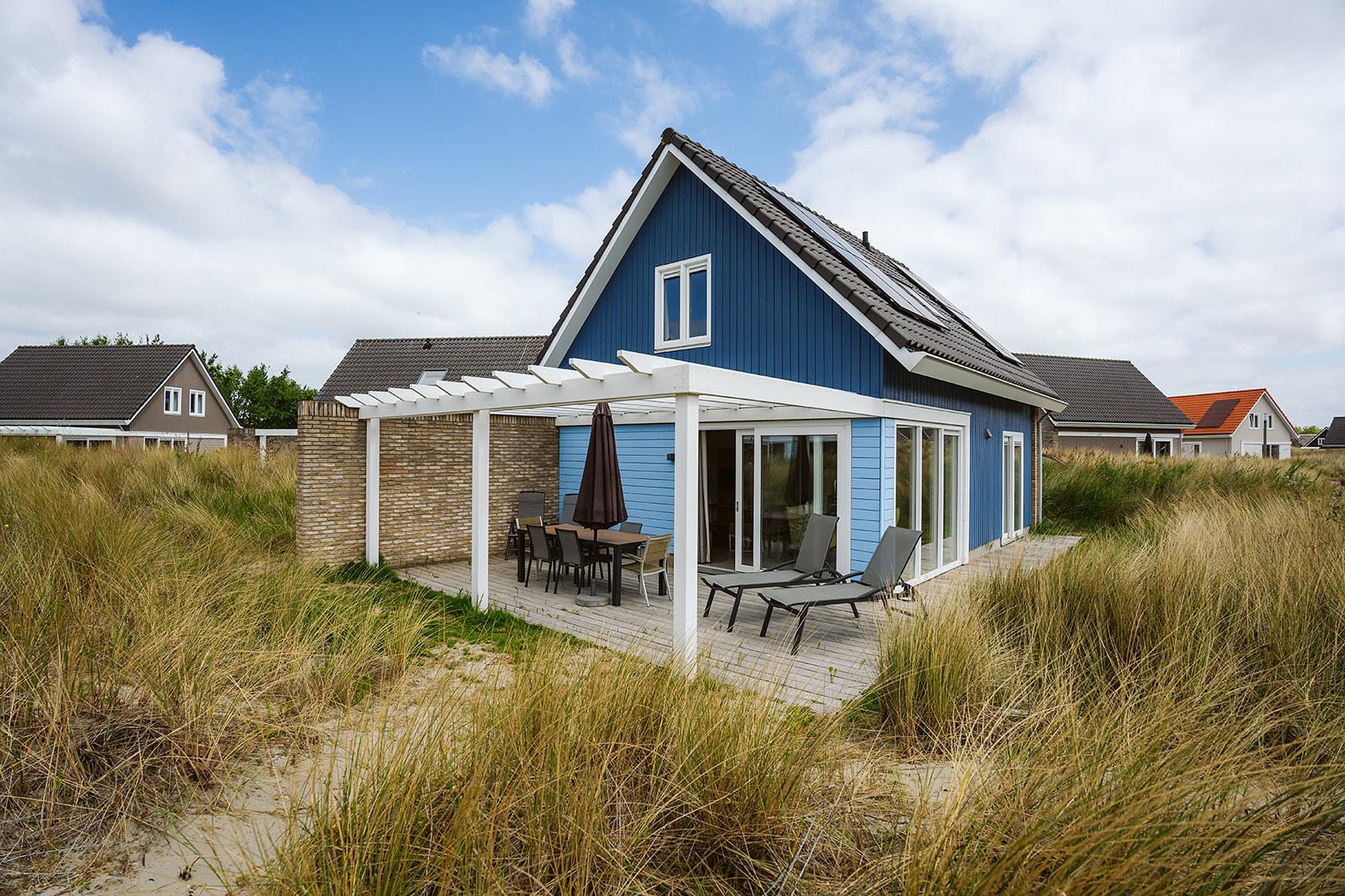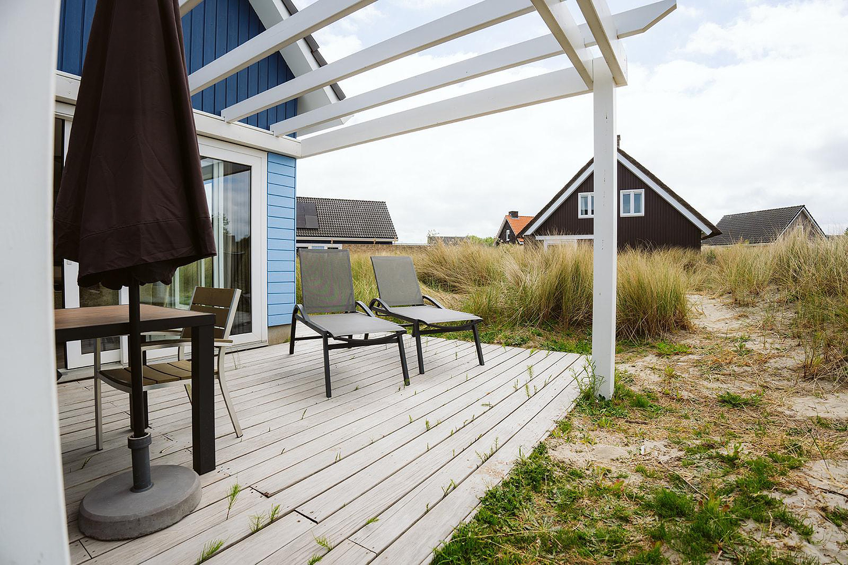 Tuin Via de openslaande deuren in de woonkamer bereikt u het zonnige terras, perfect voor lange zomeravonden omringd door rust en natuur. De duinen rondom de woning zijn begroeid met helmgras. Door de begroeiing ervaart u op het zonnige vlonderterras, een enorm gevoel van privacy. Dit gevoel wordt nog eens extra versterkt door de tuinmuur en de pergola, welke uw verblijf optimaliseren.