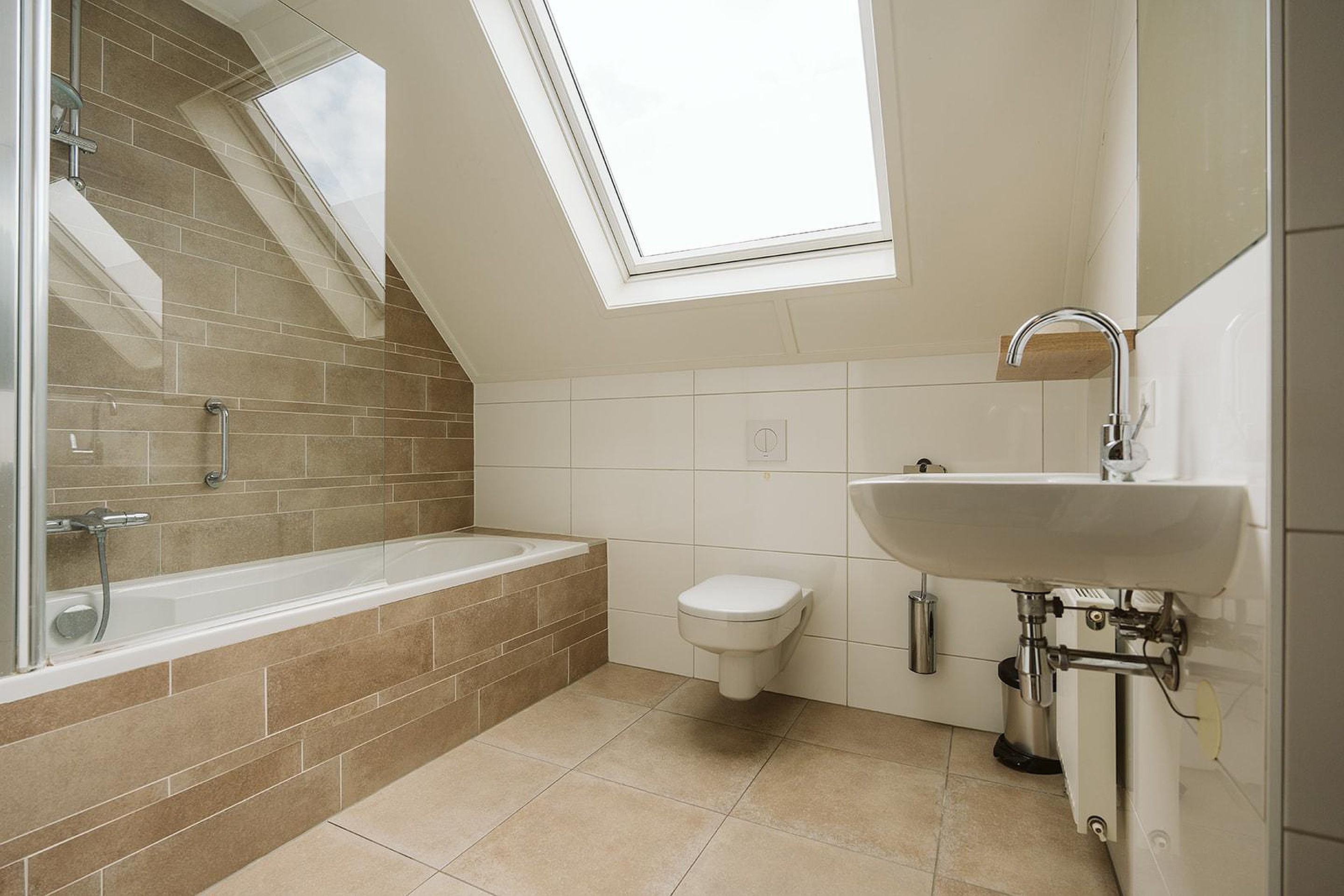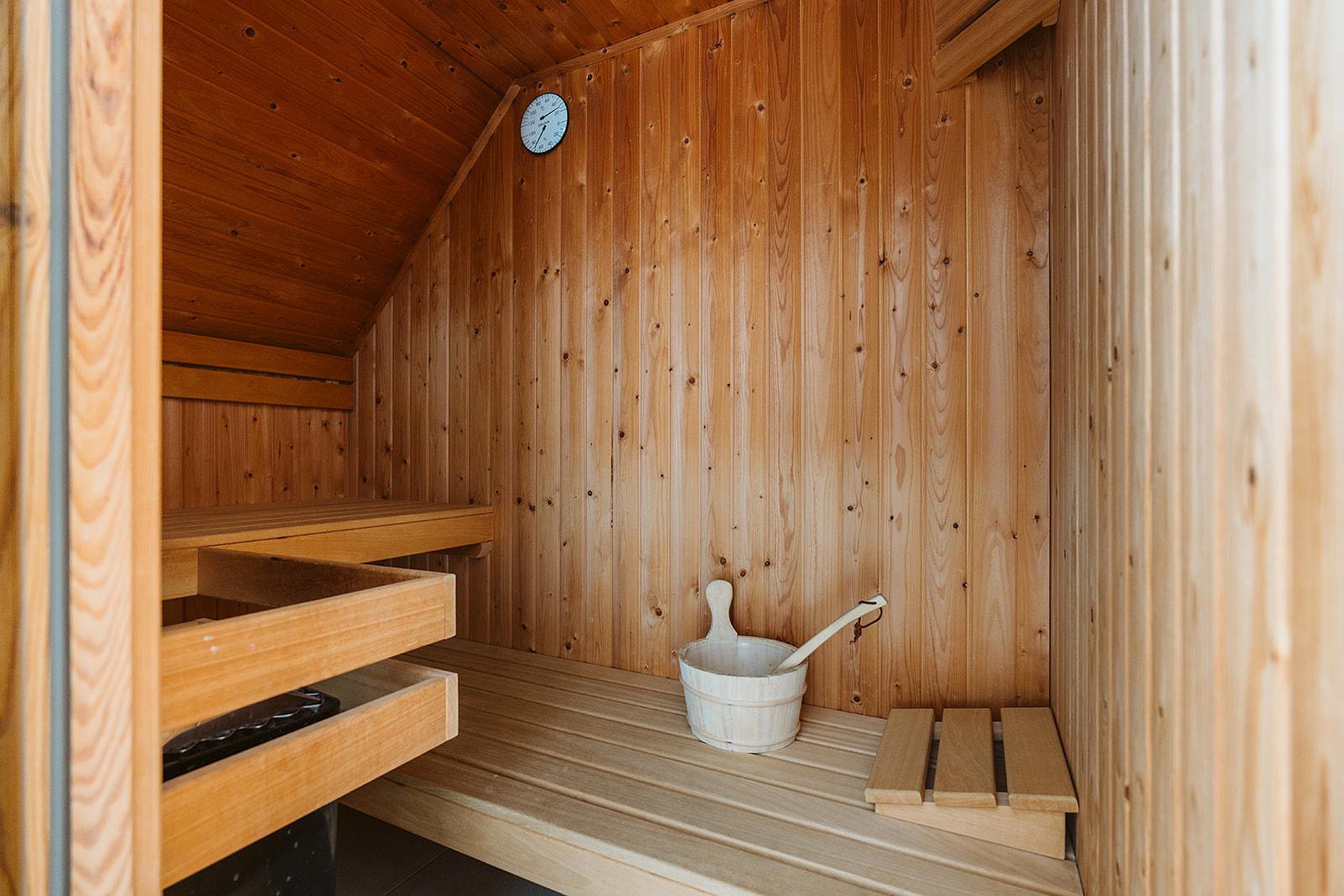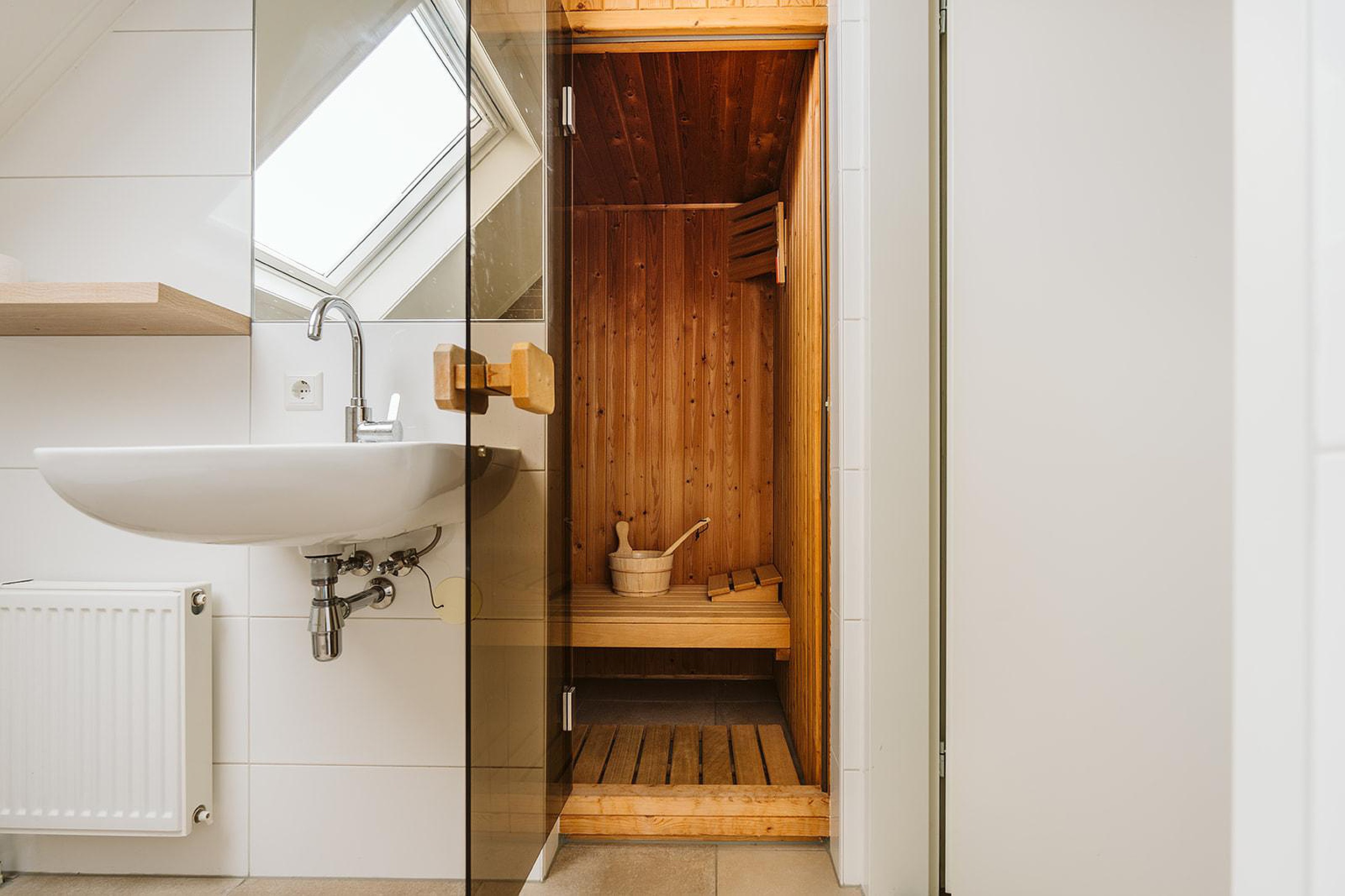 Eerste verdieping Op de eerste verdieping bevinden zich twee ruime slaapkamers, elk ingericht met comfortabele boxspringbedden en voldoende kastruimte. De moderne badkamer op deze verdieping is voorzien van een ligbad, tweede toilet en een sauna, wat deze woning een extra luxe tintje geeft.