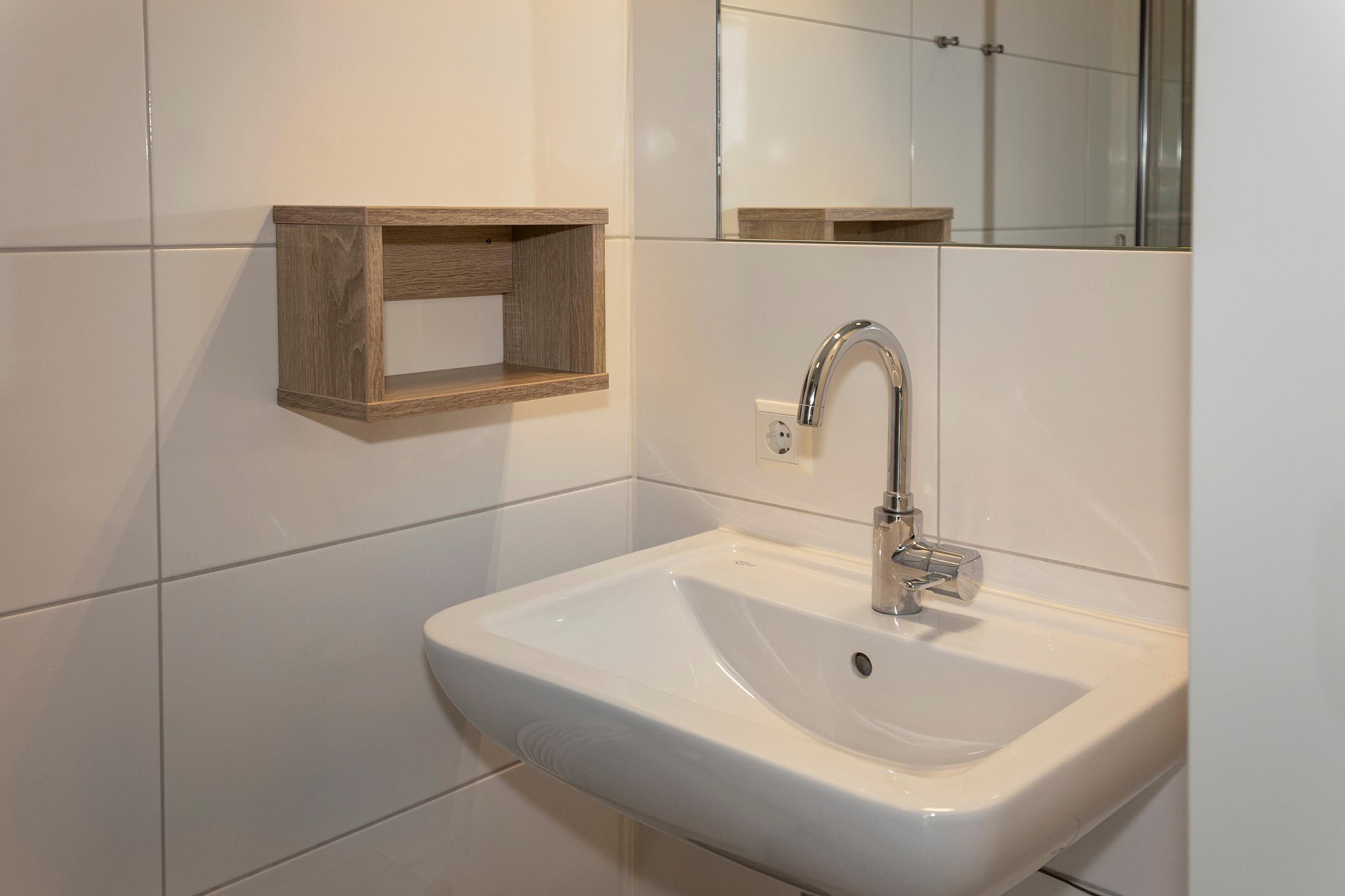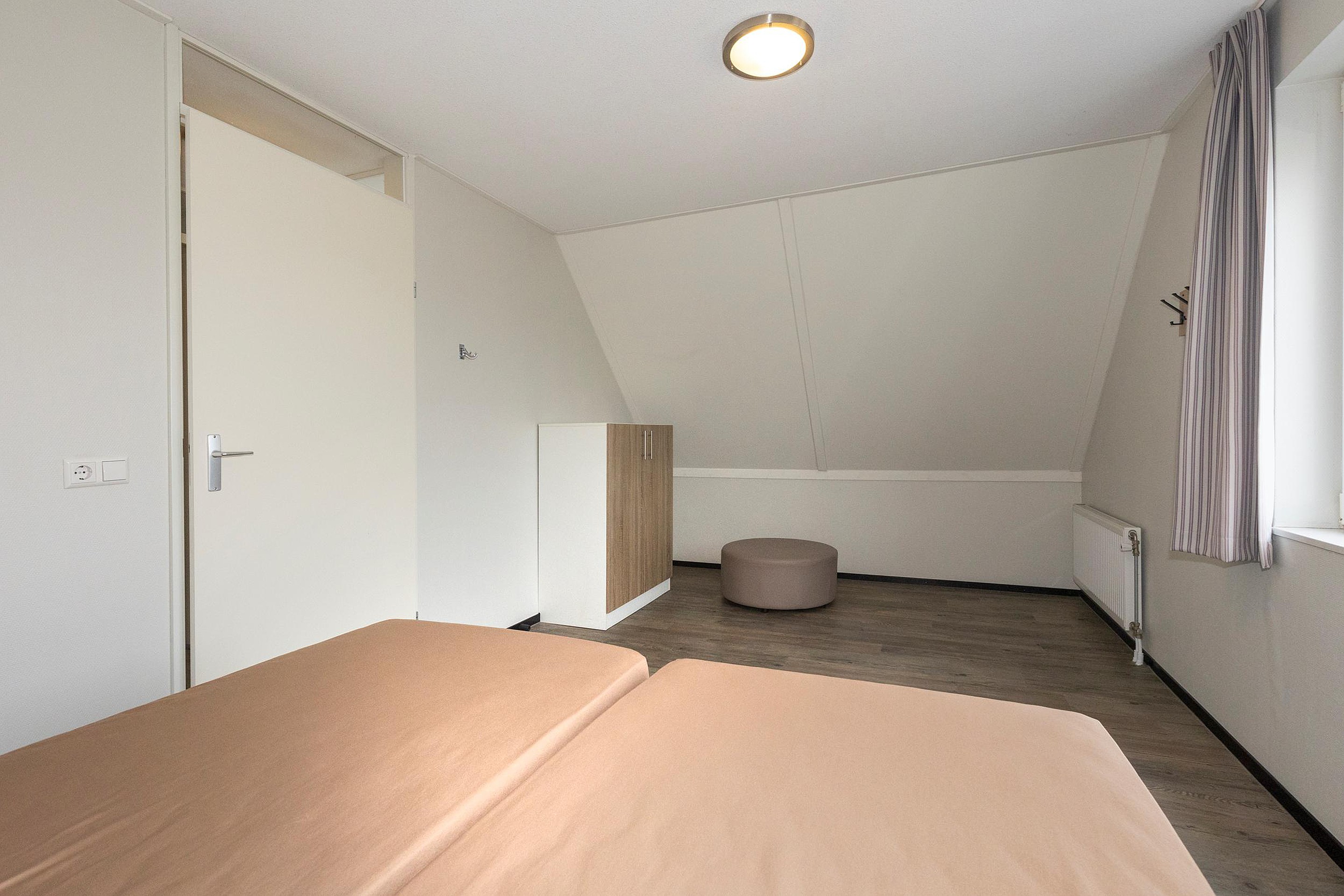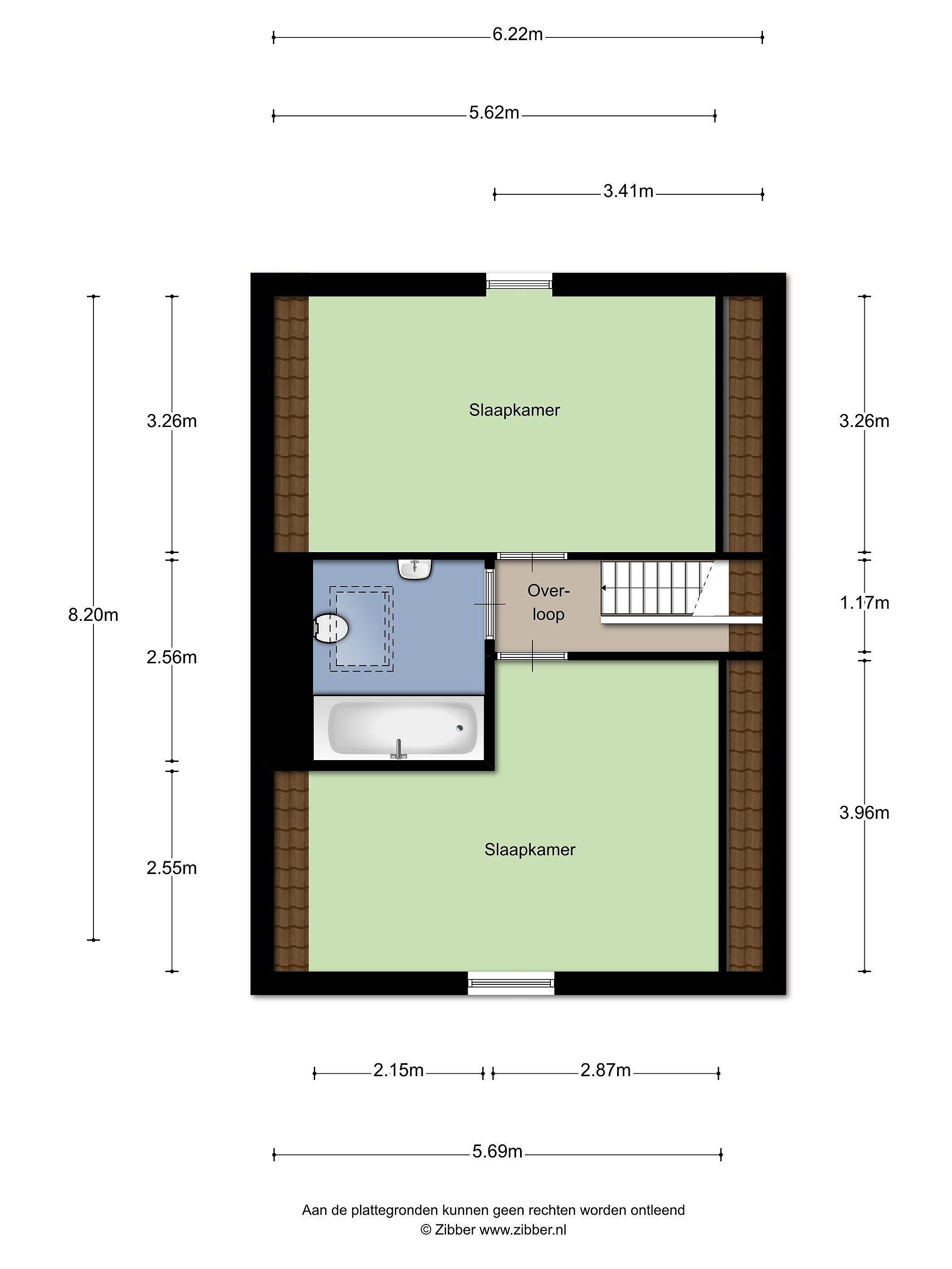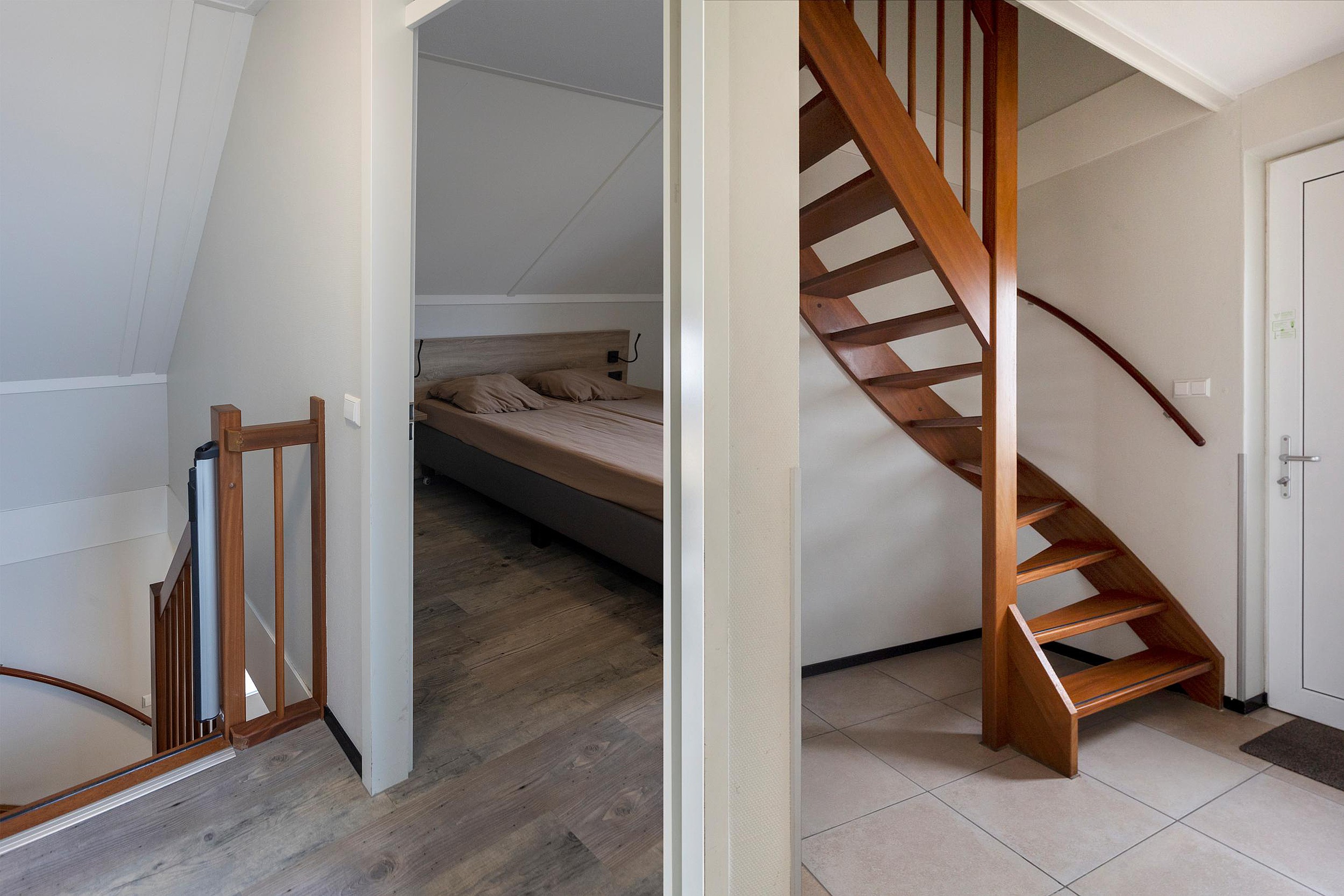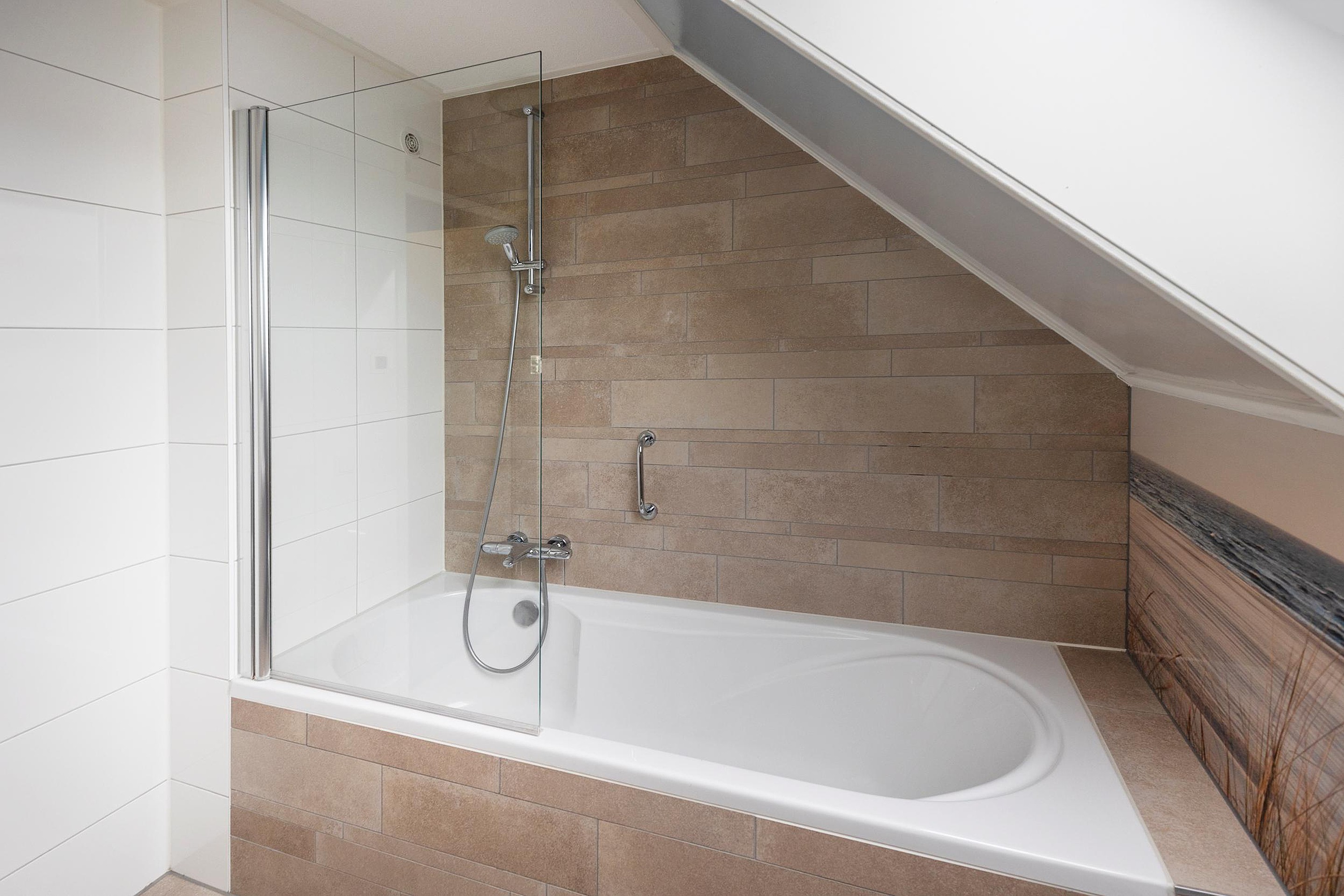 Eerste verdieping Op de verdieping is er vanaf de overloop toegang tot twee royale slaapkamers en de badkamer. De badkamer is volledig betegeld en voorzien van een tweede toilet, een ligbad met douche en een wastafel.