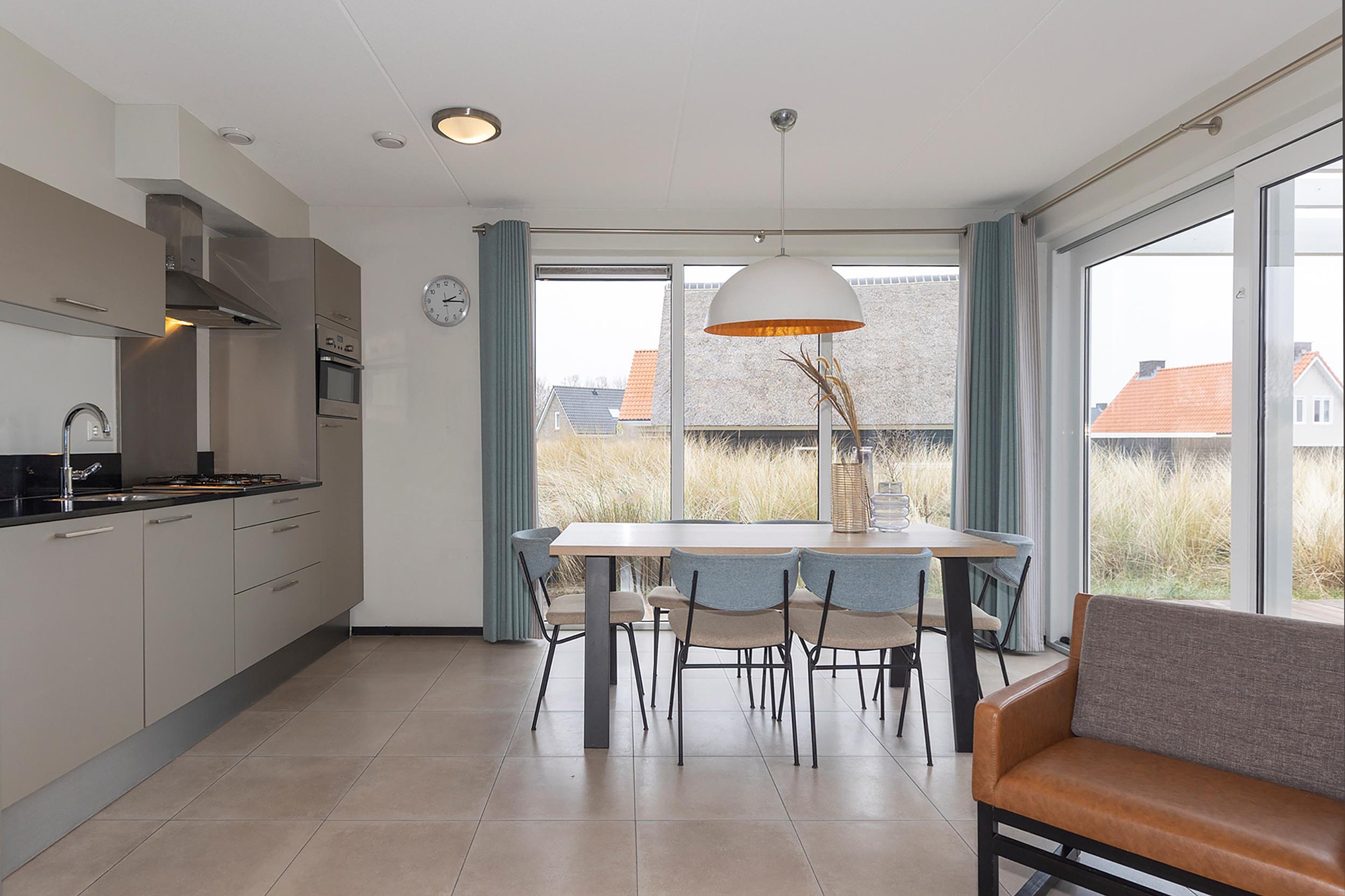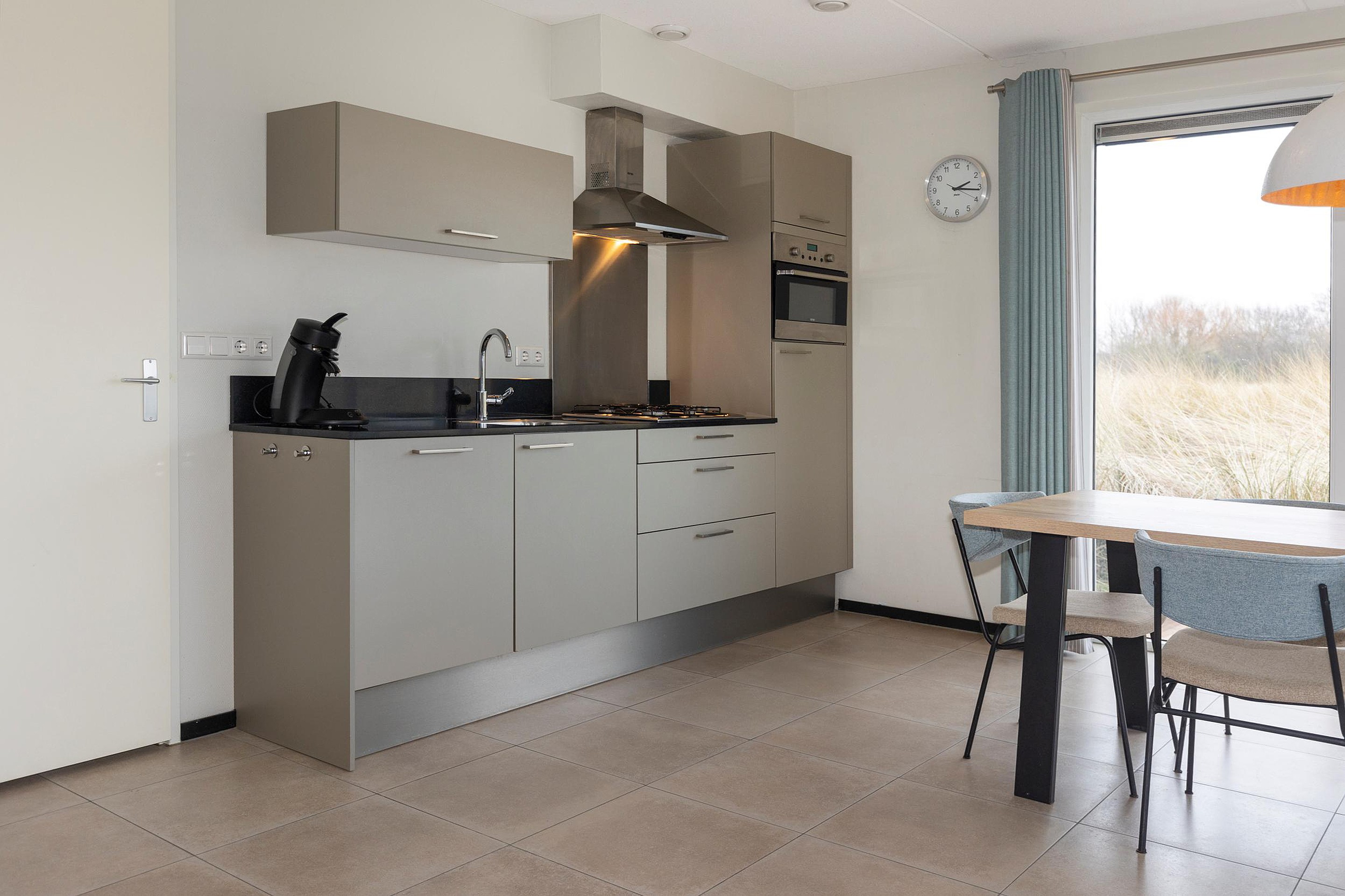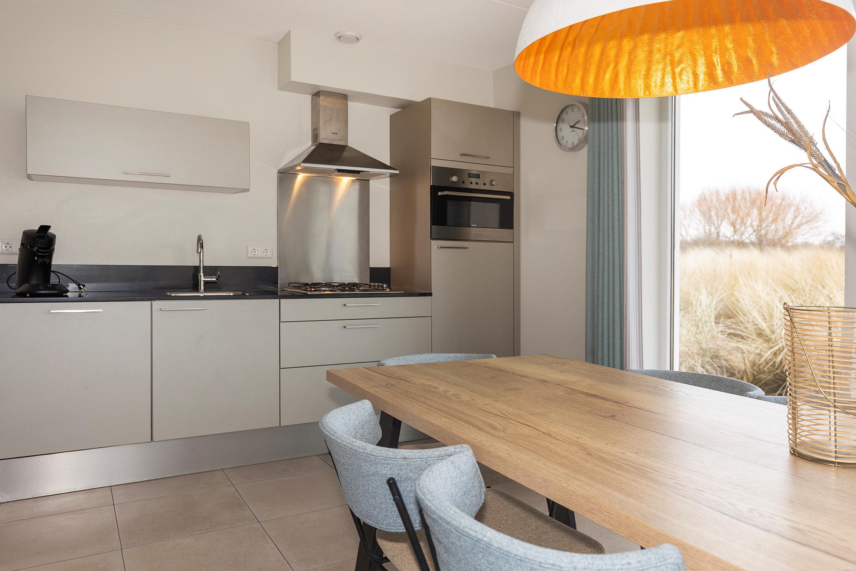 Begane grond Via de duinpaden, op korte afstand van de receptie en voorzieningen, komt u bij de woning aan, waar u parkeergelegenheid heeft voor twee auto’s. Vervolgens komt u via het schelpenpad omhoog bij de villa. Entree, hal met de trapopgang, het toilet, toegang tot de hoofdslaapkamer op de begane grond met en-suite badkamer, en uiteindelijk de living. De living geniet veel lichtinval en is voorzien van een gezellige zithoek en een luxe open keuken met de nodige inbouwapparatuur, waardoor u van alle gemakken wordt voorzien. Denk hierbij aan een vaatwasser, koelkast, combioven en een gaskookplaat met afzuigkap. Via de schuifpui heeft u direct toegang tot het zonneterras.