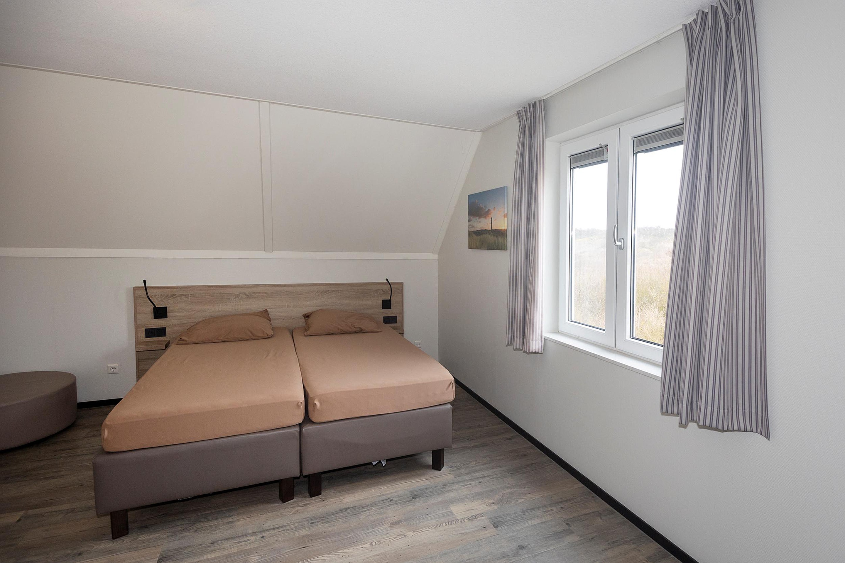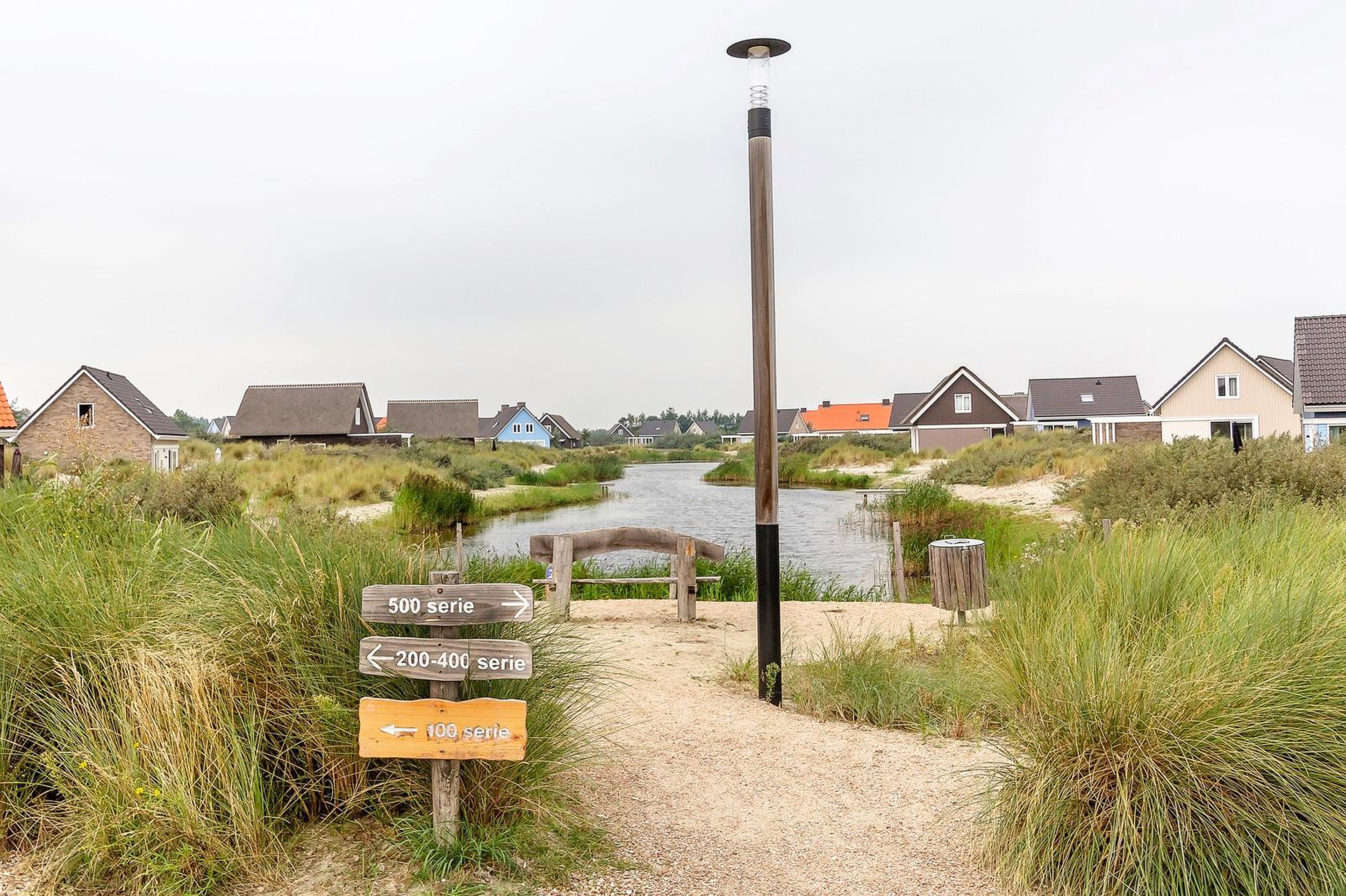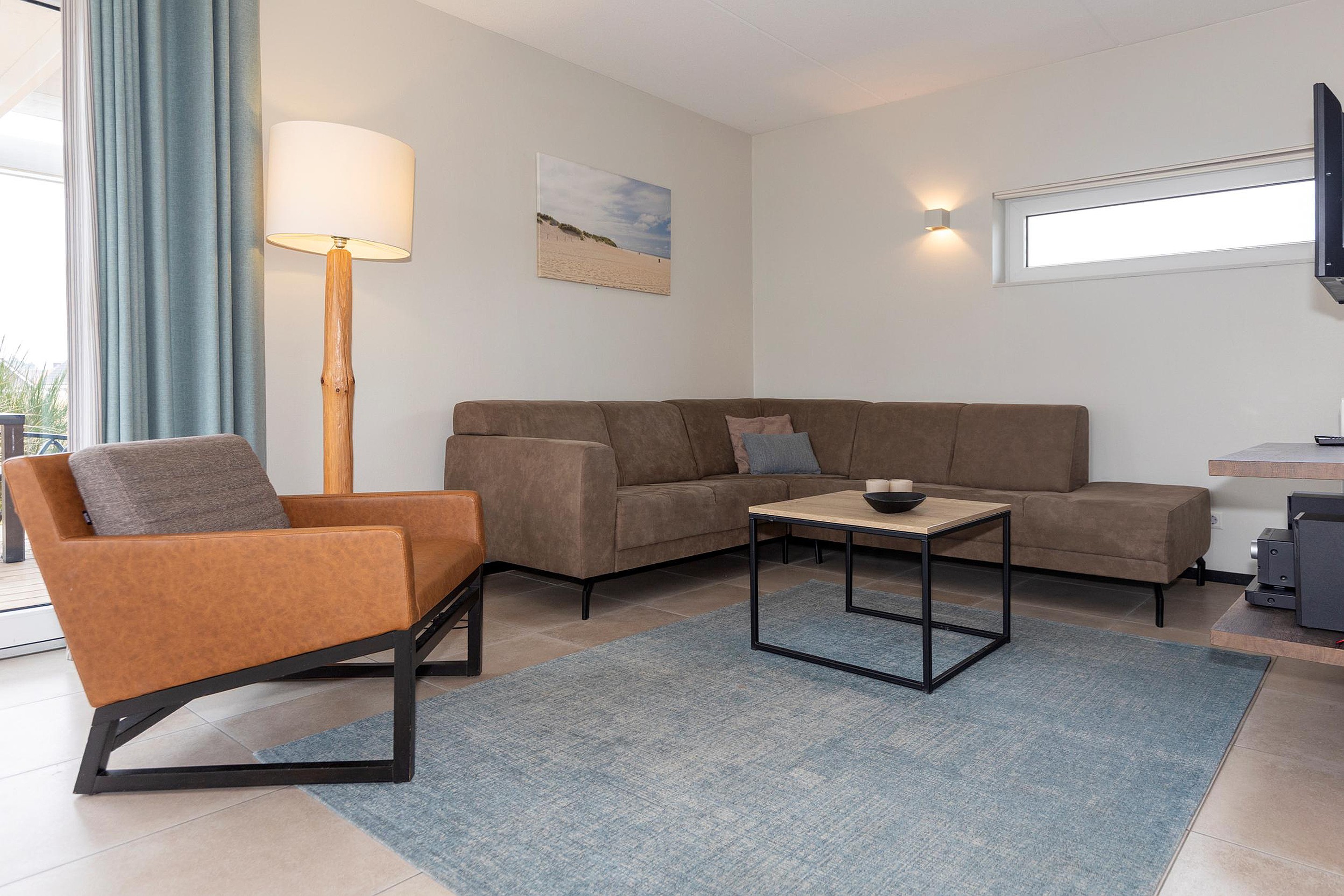 Begane grond Via de duinpaden, op korte afstand van de receptie en voorzieningen, komt u bij de woning aan, waar u parkeergelegenheid heeft voor twee auto’s. Vervolgens komt u via het schelpenpad omhoog bij de villa. Entree, hal met de trapopgang, het toilet, toegang tot de hoofdslaapkamer op de begane grond met en-suite badkamer, en uiteindelijk de living. De living geniet veel lichtinval en is voorzien van een gezellige zithoek en een luxe open keuken met de nodige inbouwapparatuur, waardoor u van alle gemakken wordt voorzien. Denk hierbij aan een vaatwasser, koelkast, combioven en een gaskookplaat met afzuigkap. Via de schuifpui heeft u direct toegang tot het zonneterras.
