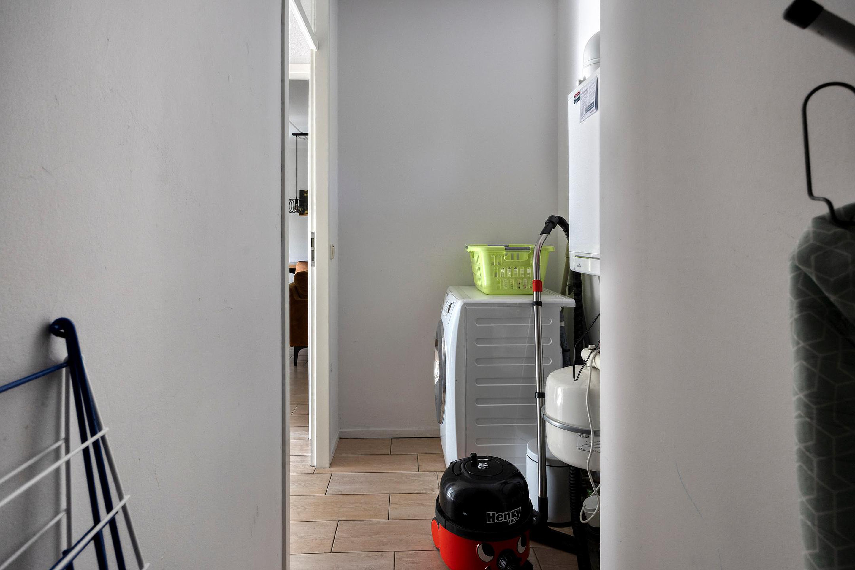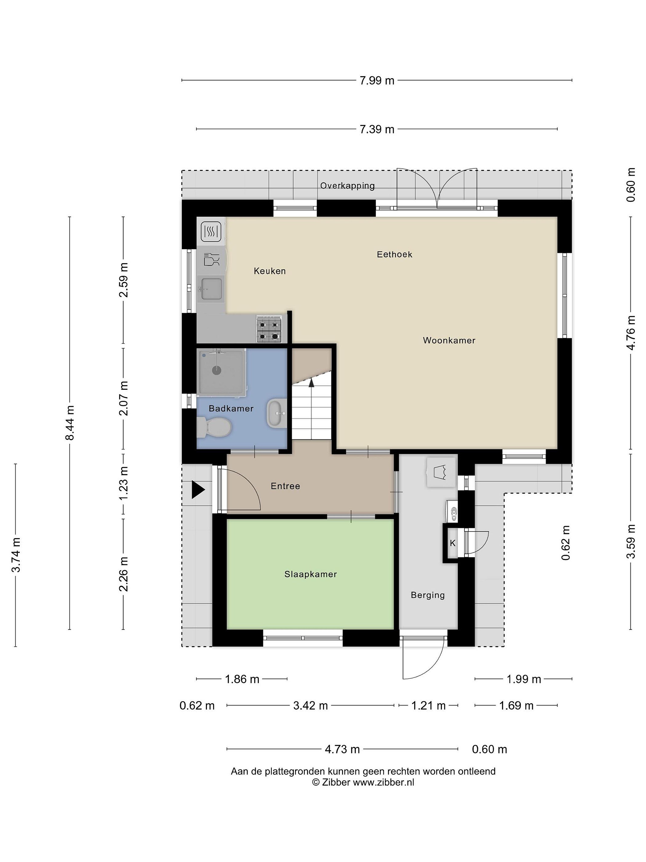 Begane grond Entree/hal met trapopgang en een bijkeuken/berging voorzien van een deur naar de tuin. De gezellige woonkamer beschikt over openslaande tuindeuren en een keukenblok met diverse inbouwapparatuur, o.a. een gaskookplaat, afzuigkap, vaatwasser, combimagnetron en een koelkast. Via de hal bereikt u ook de slaapkamer en een badkamer voorzien van een douchehoek, toilet en een wastafel met meubel. Aan de buitenzijde van de villa is de meterkast bereikbaar.