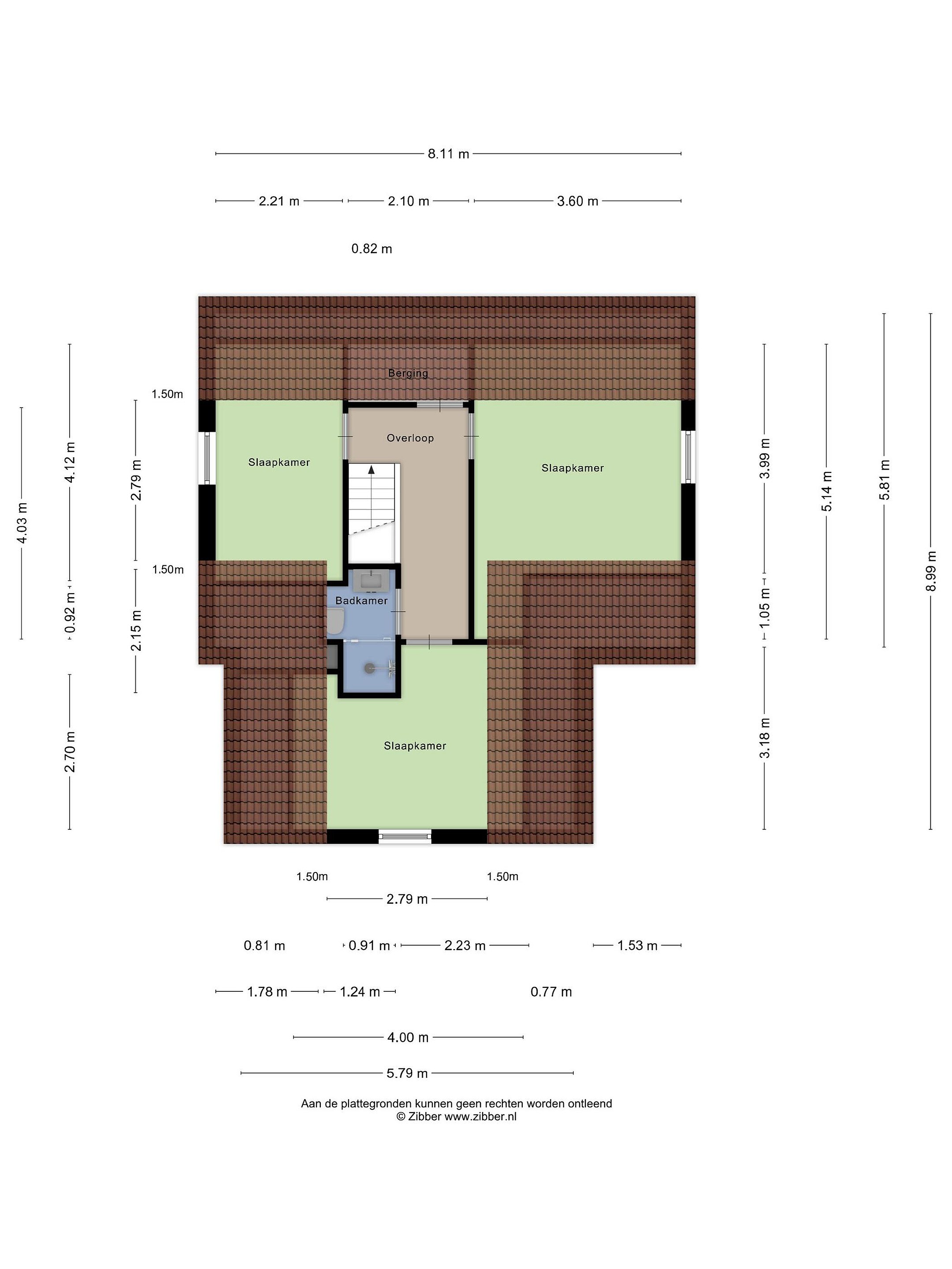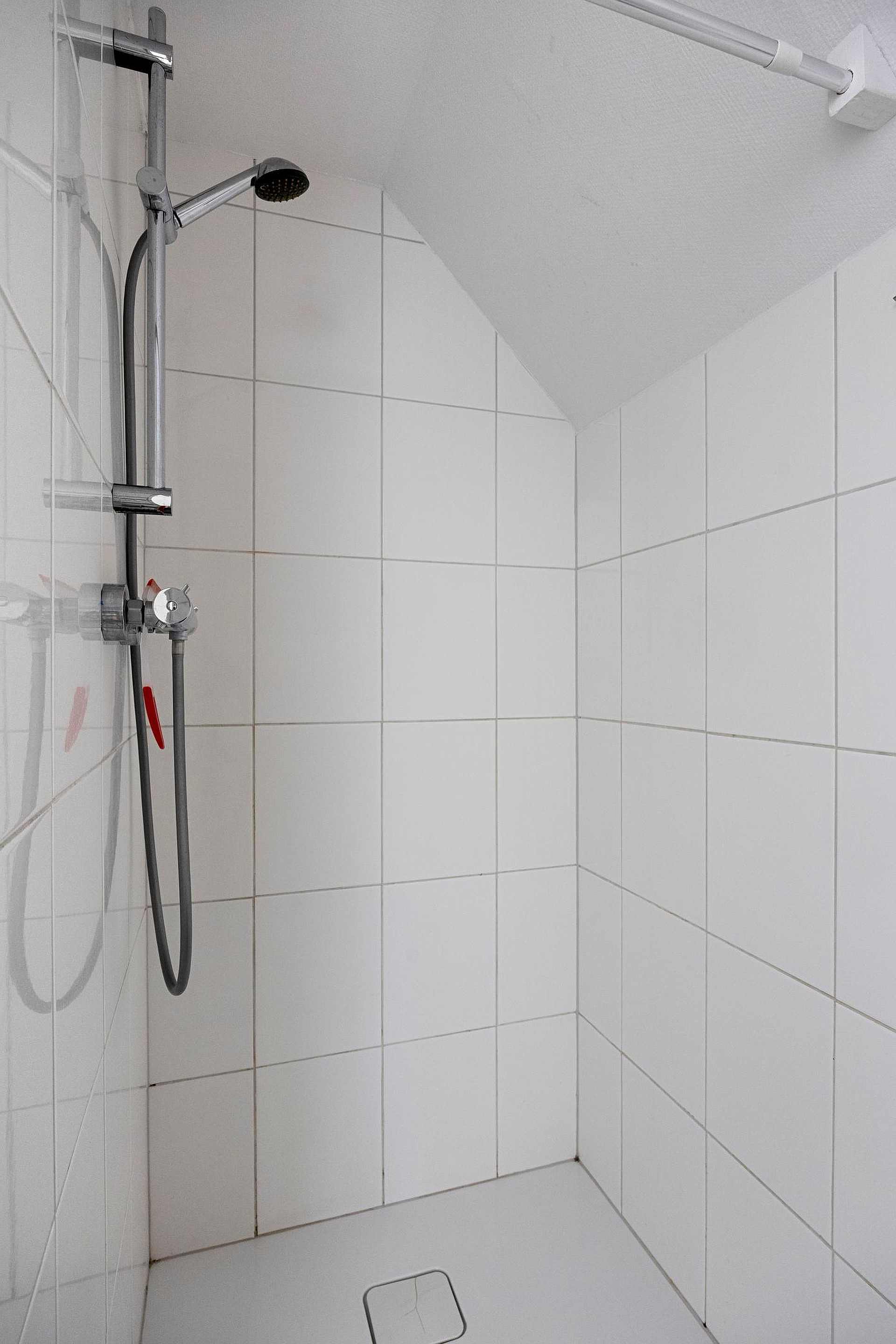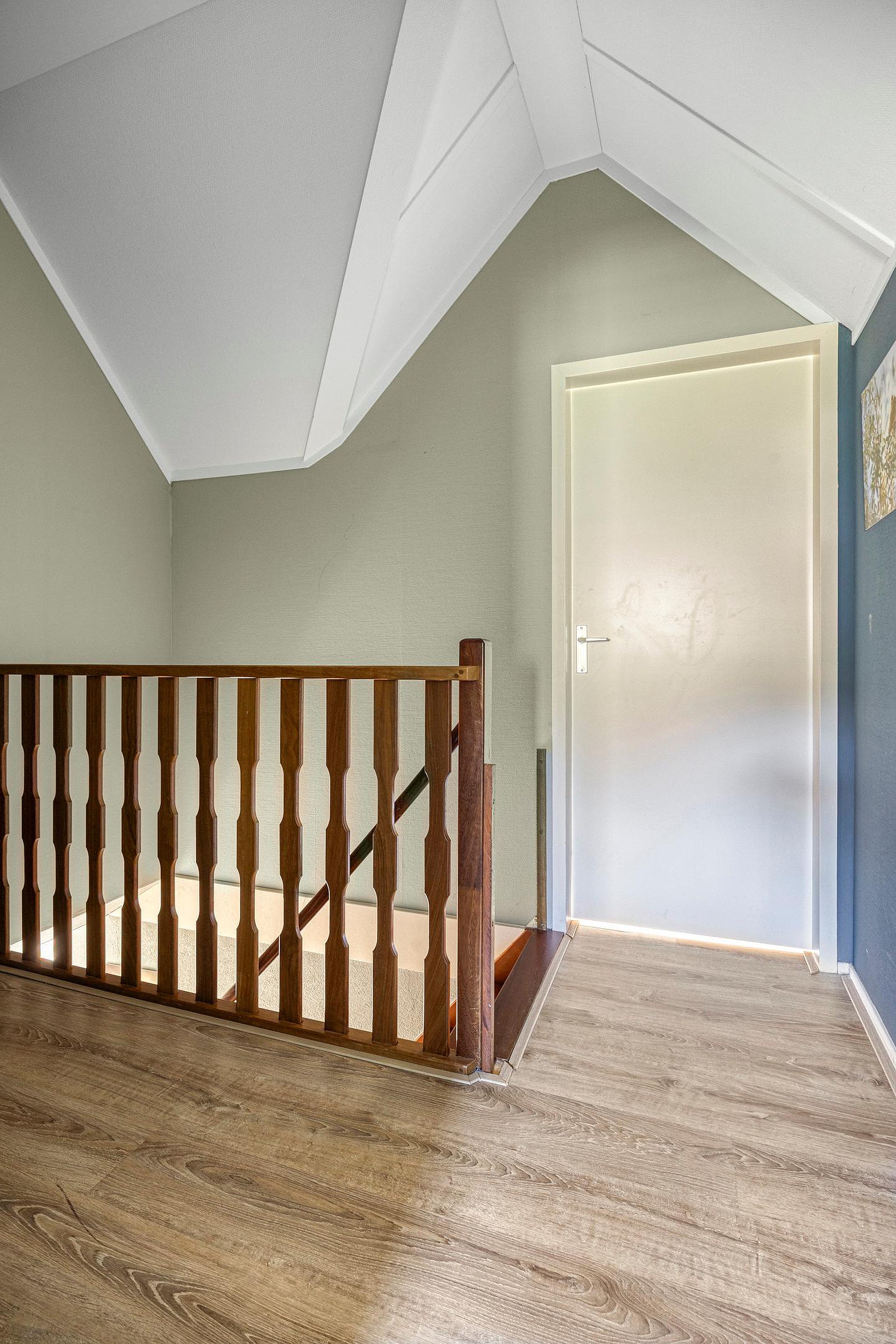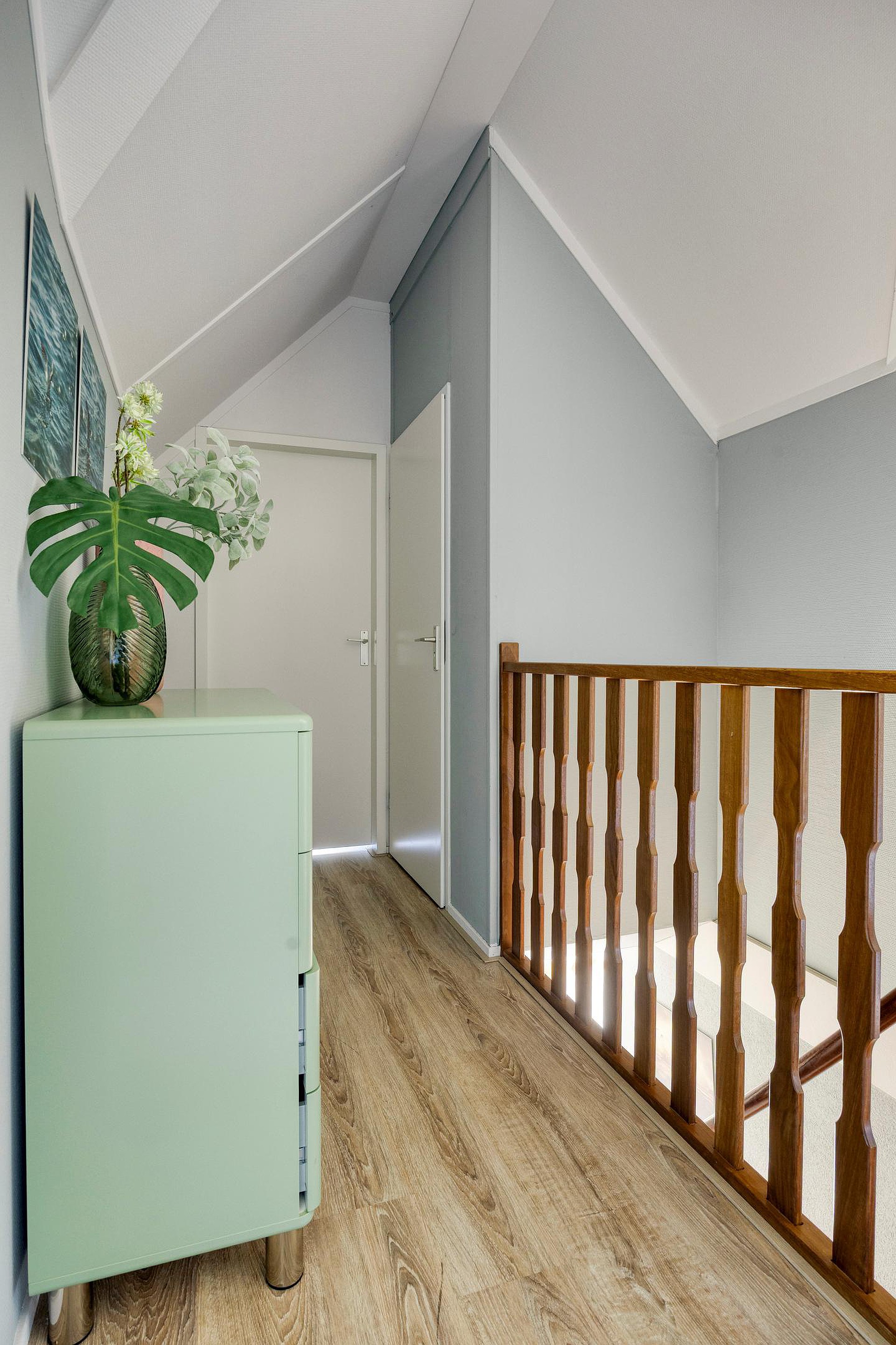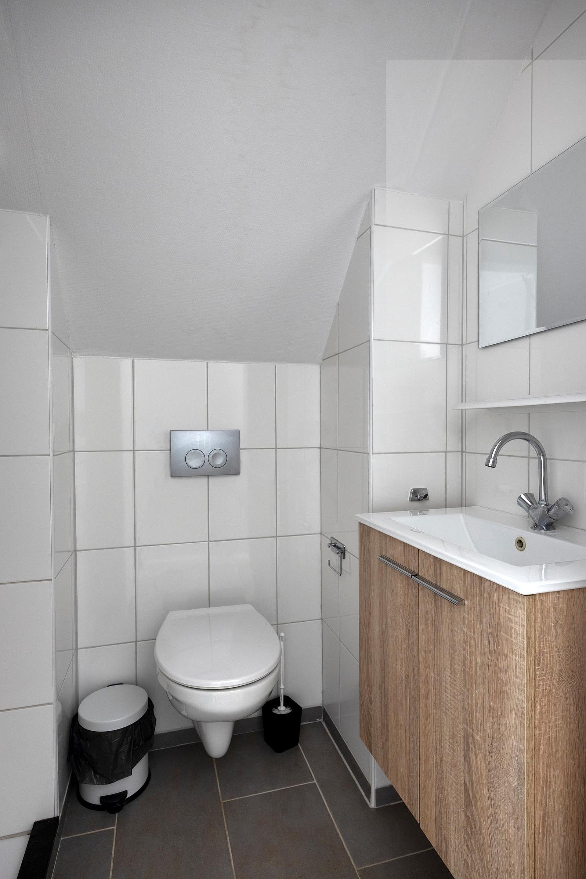 Eerste verdieping Overloop met bergruimte, 3 slaapkamers en de tweede badkamer voorzien van een douchehoek, toilet en een wastafel in meubel.