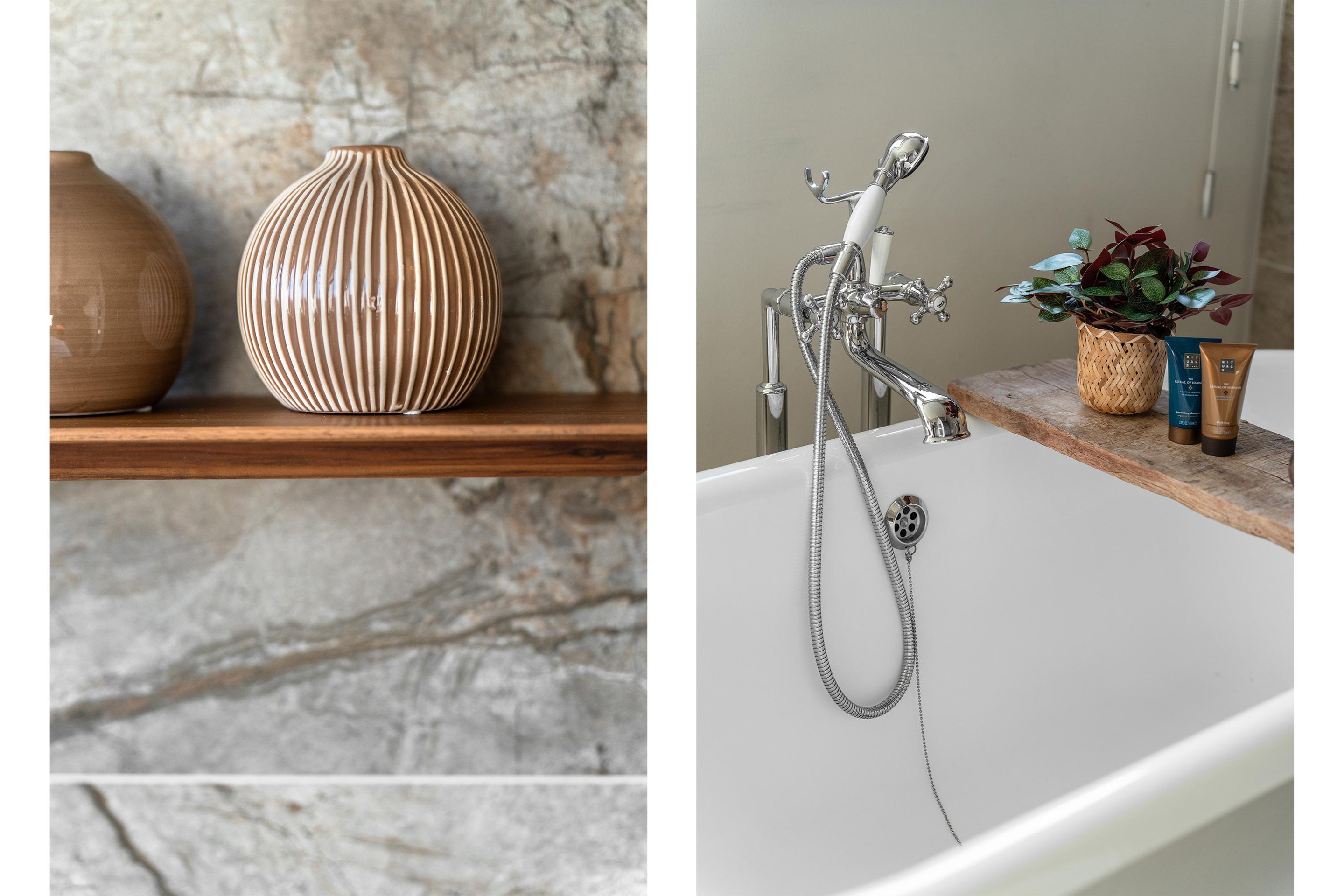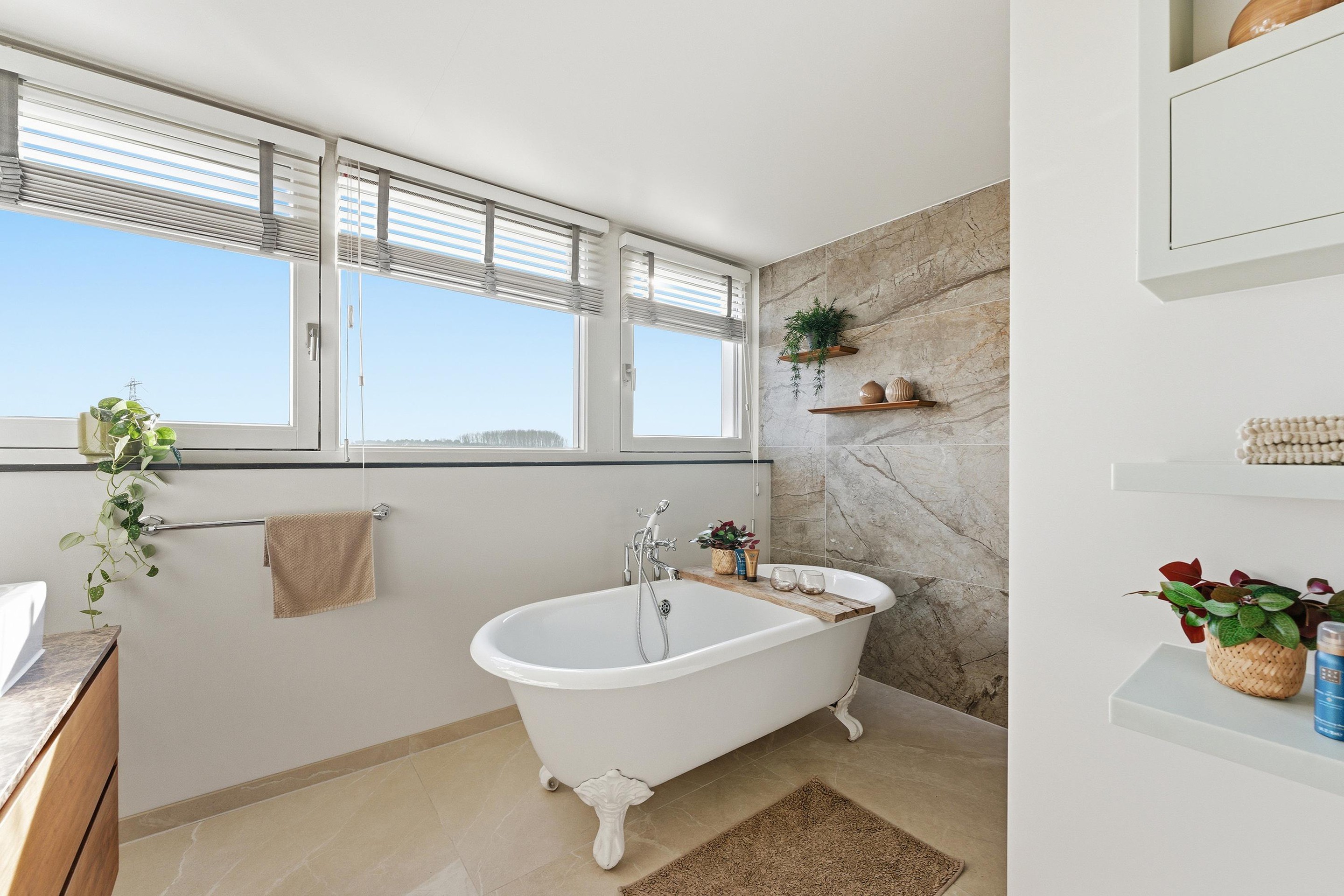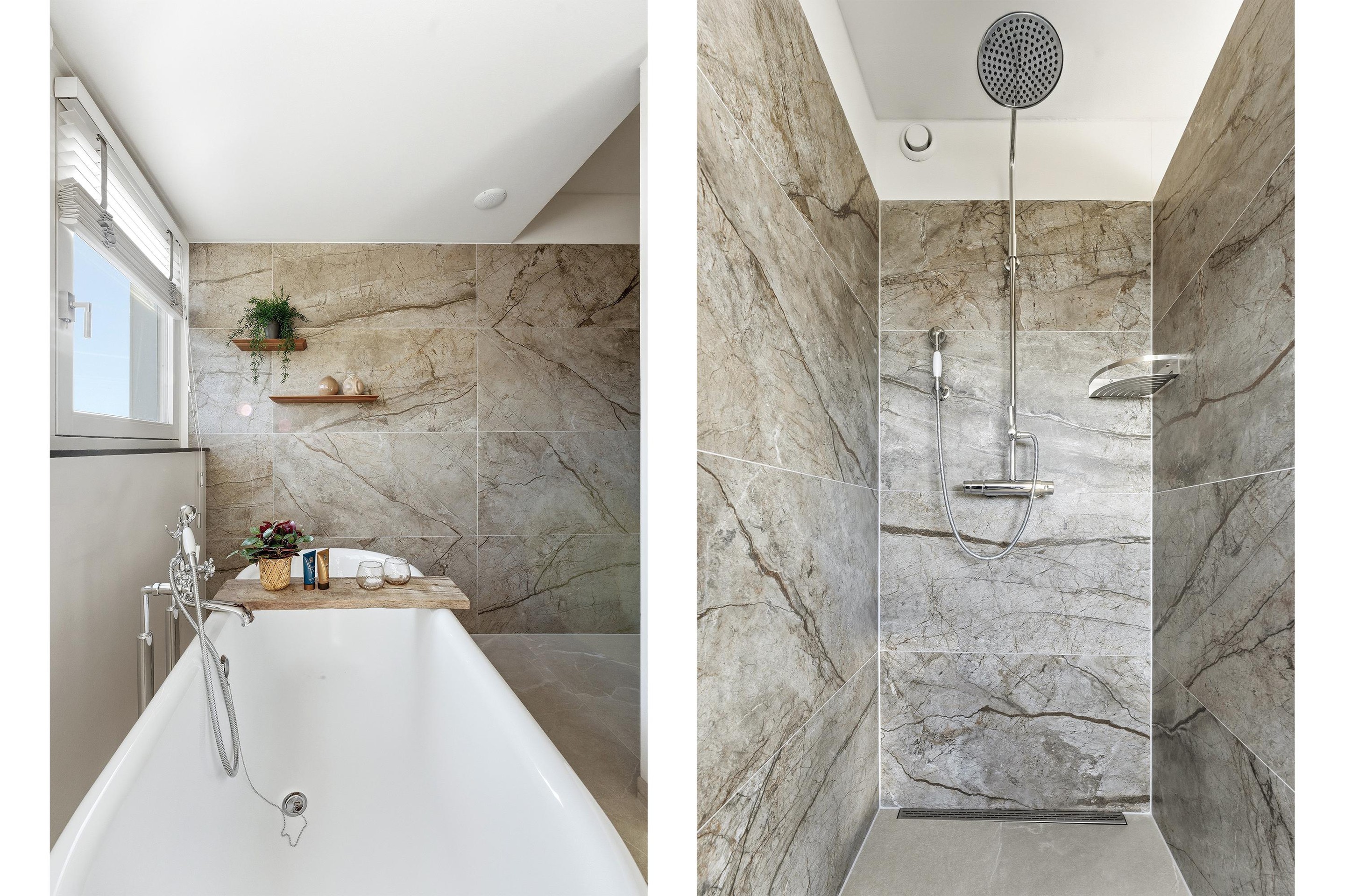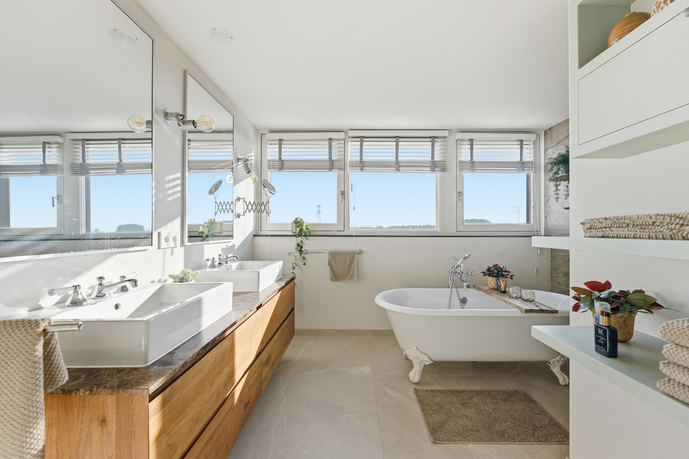 7. Charmante en luxe badkamer met dubbele wastafel, inloopdouche en vrijstaand bad
