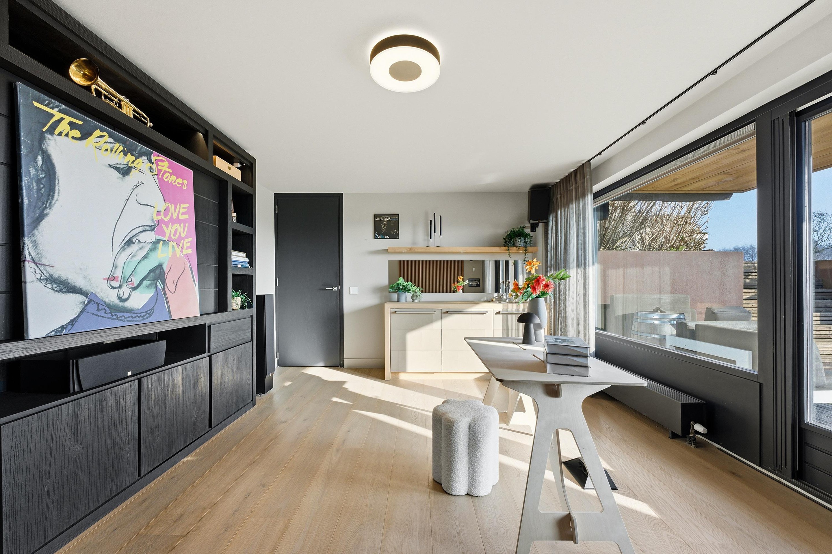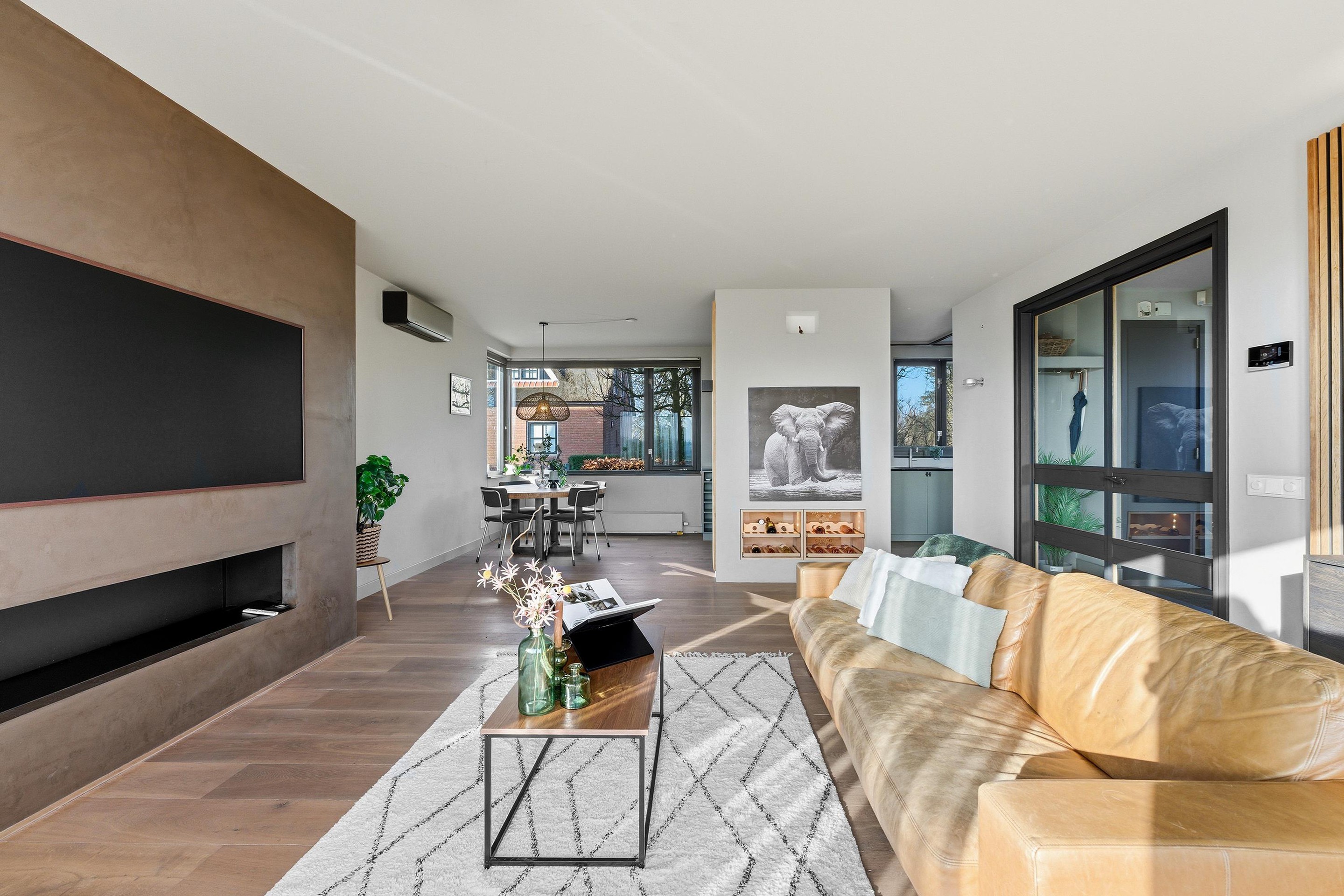 3. Prachtige woonkamer met cinewall, gashaard, wijnkasten en openslaande deuren naar het terras met geweldig uitzicht