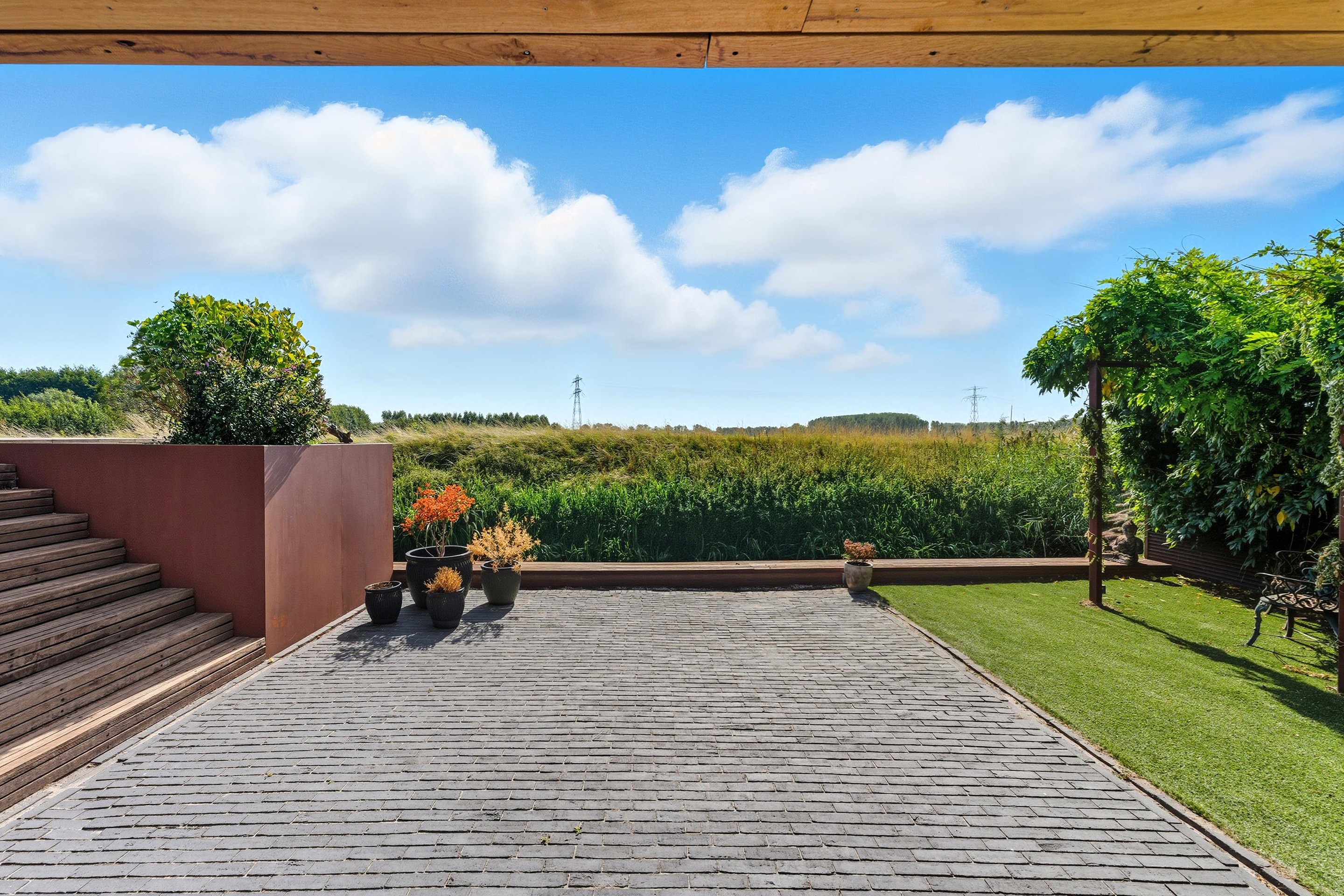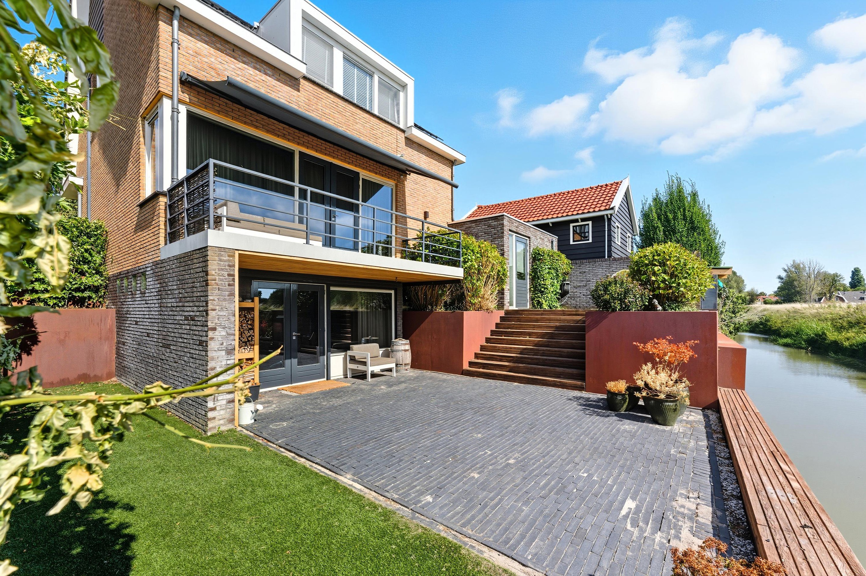 De tuin is hier écht een verlengstuk van de woning en misschien wel één van de grootste eyecatchers. Dankzij de speelse niveauverschillen, hoogwaardige materialen en strakke lijnen heeft de tuin een luxe, moderne uitstraling. Je geniet hier volop van rust, privacy én een fenomenaal vrij uitzicht over de polder en het water, een uitzicht dat elk seizoen blijft verrassen. Door de ligging op het zuiden is de tuin heerlijk zonnig.