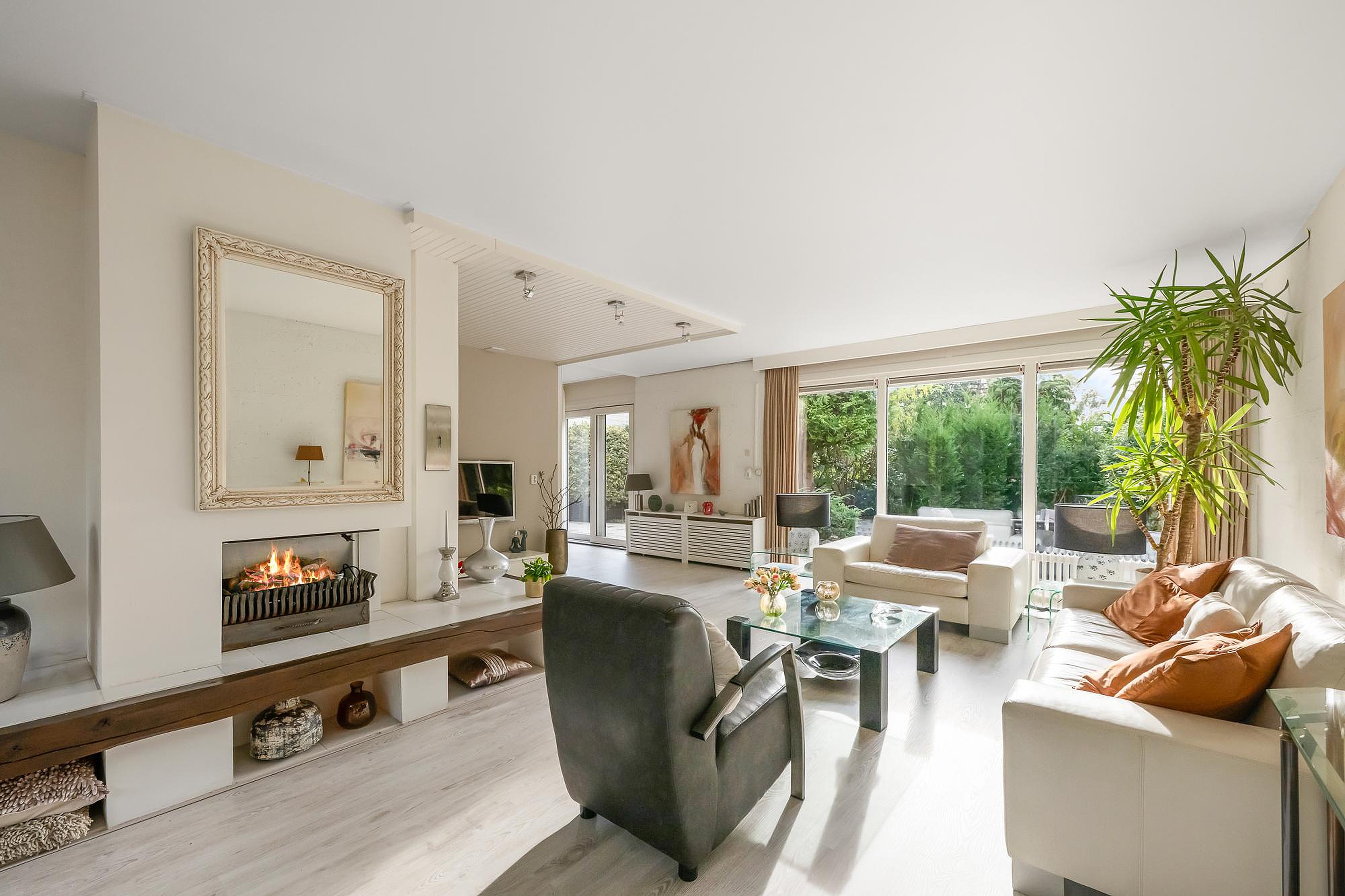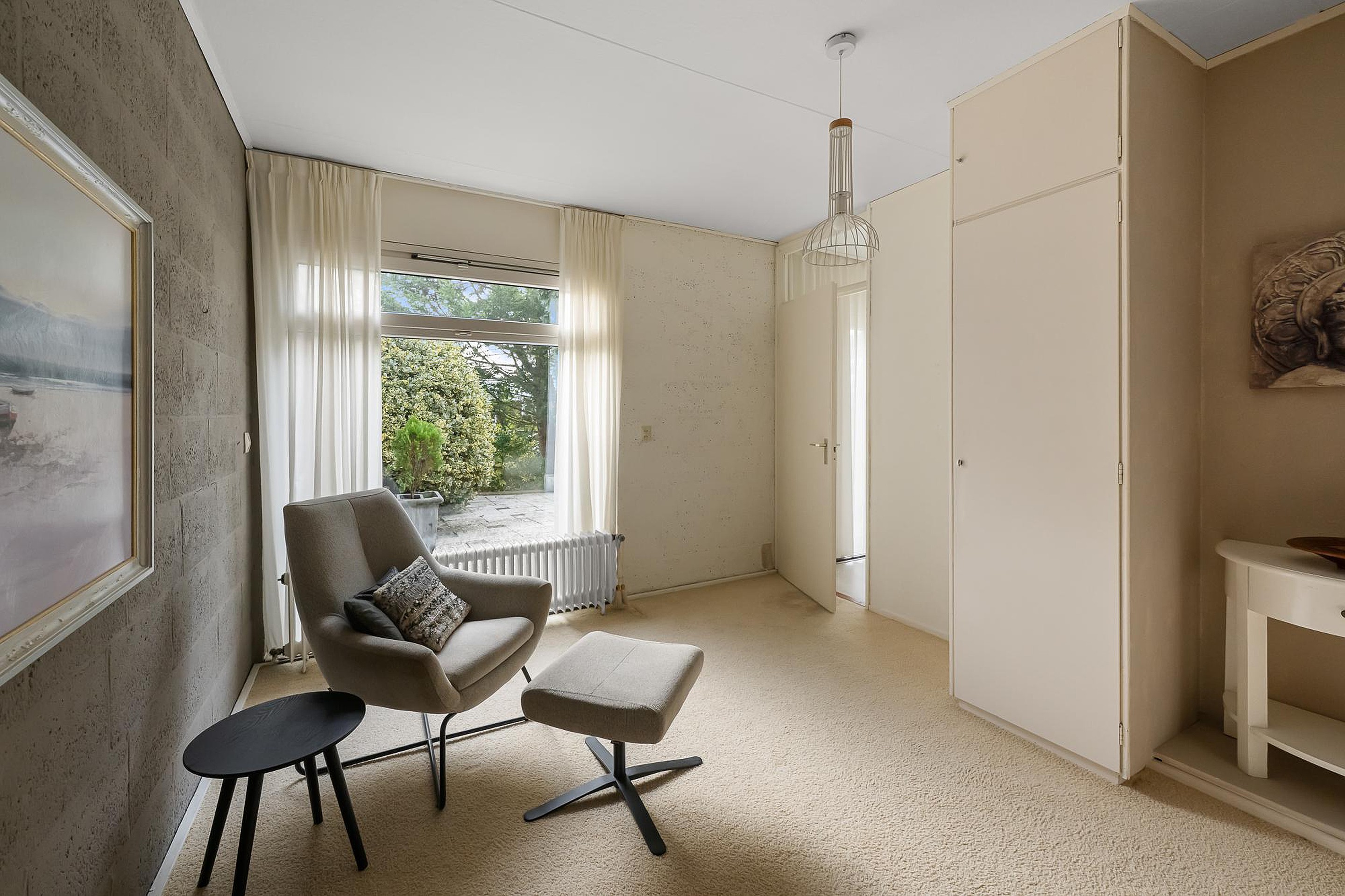 De open haard is momenteel dichtgemaakt, maar kan eenvoudig weer in gebruik worden genomen door een pijp op het dak aan te sluiten. Via de grote schuifpui is er direct toegang tot de tuin, waardoor je optimaal kunt genieten van het binnen-buitenleven. De schuifdeur bij de keuken is voorzien van een hor.