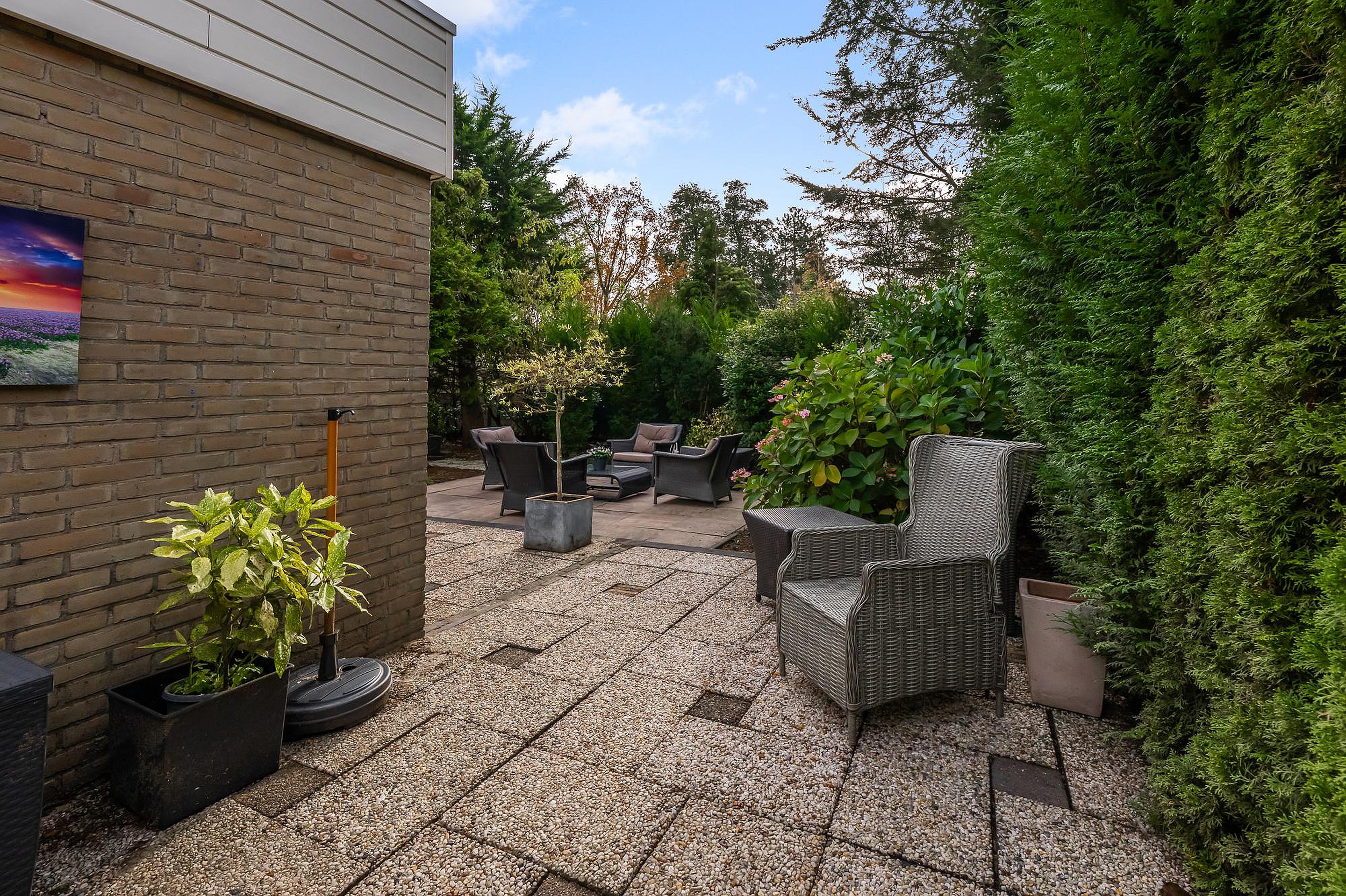 De tuin rondom is groen en vriendelijk aangelegd, deels voorzien van tegels, waardoor je meerdere fijne zitplekken hebt – zowel in de zon als in de schaduw. Deze levensloopbestendige woning is ideaal voor wie gelijkvloers wil wonen met het comfort van voldoende ruimte en privacy, in een prettige en groene woonomgeving.