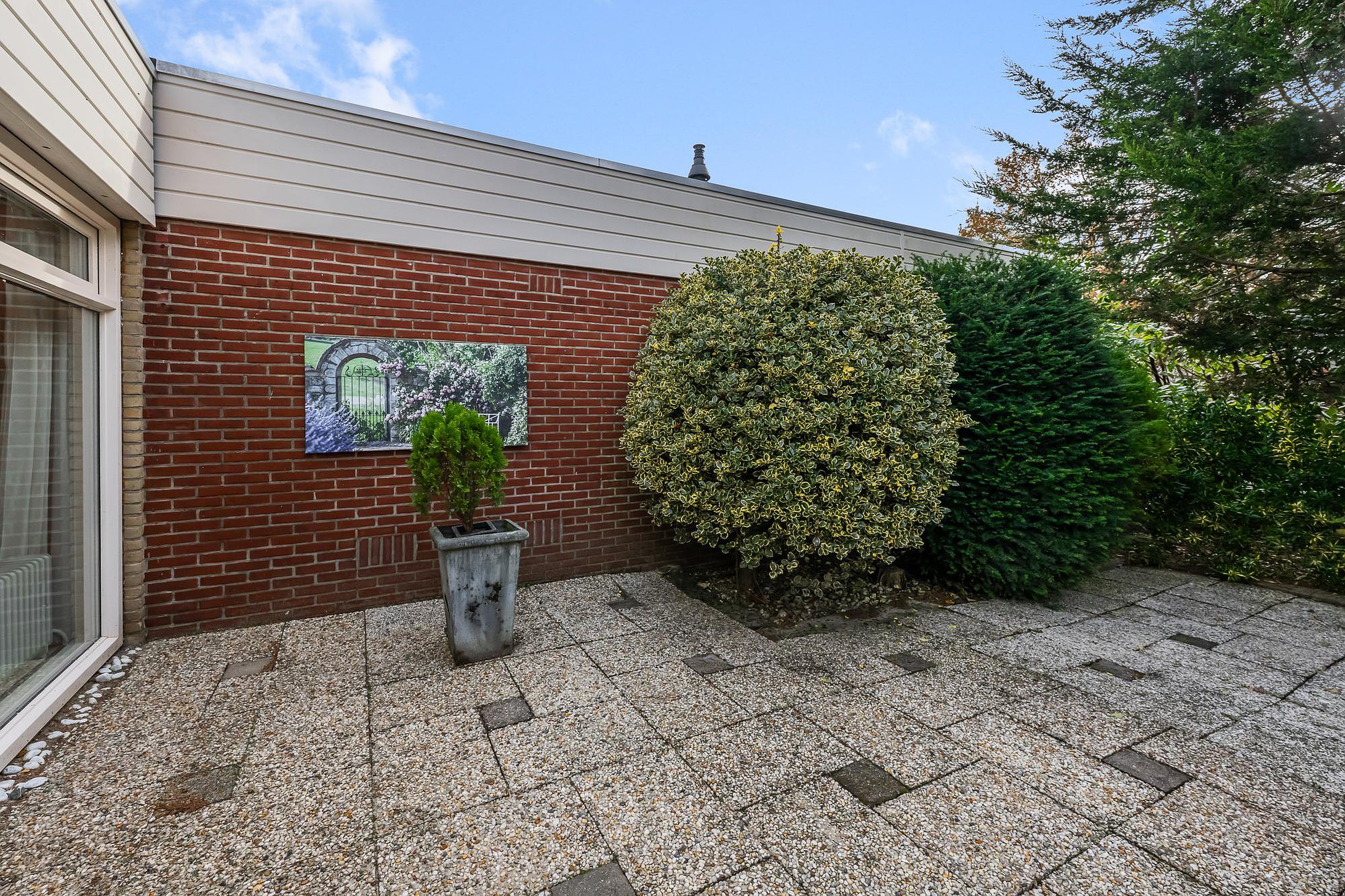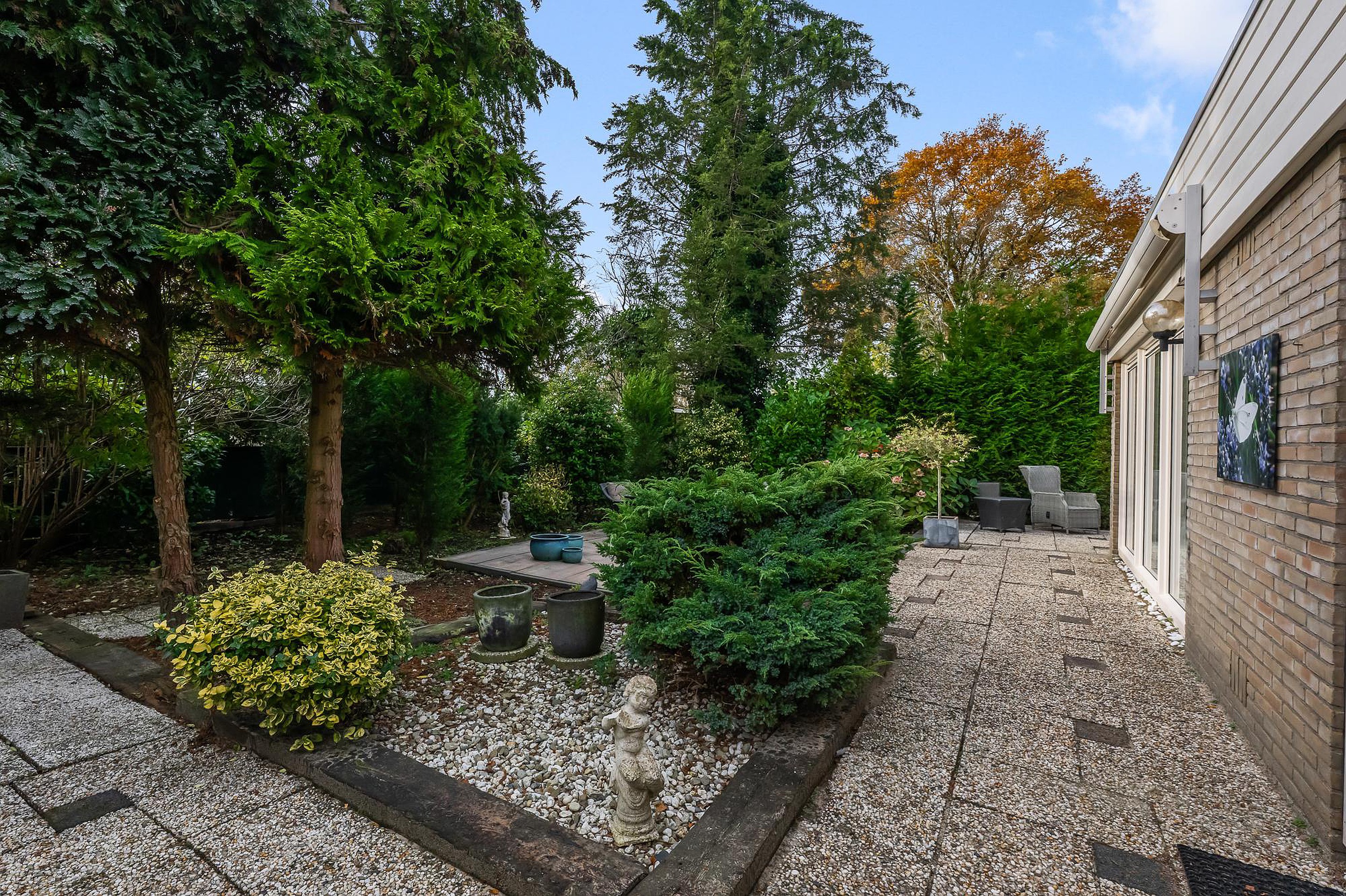 - Tuin met tegels en veel beplanting