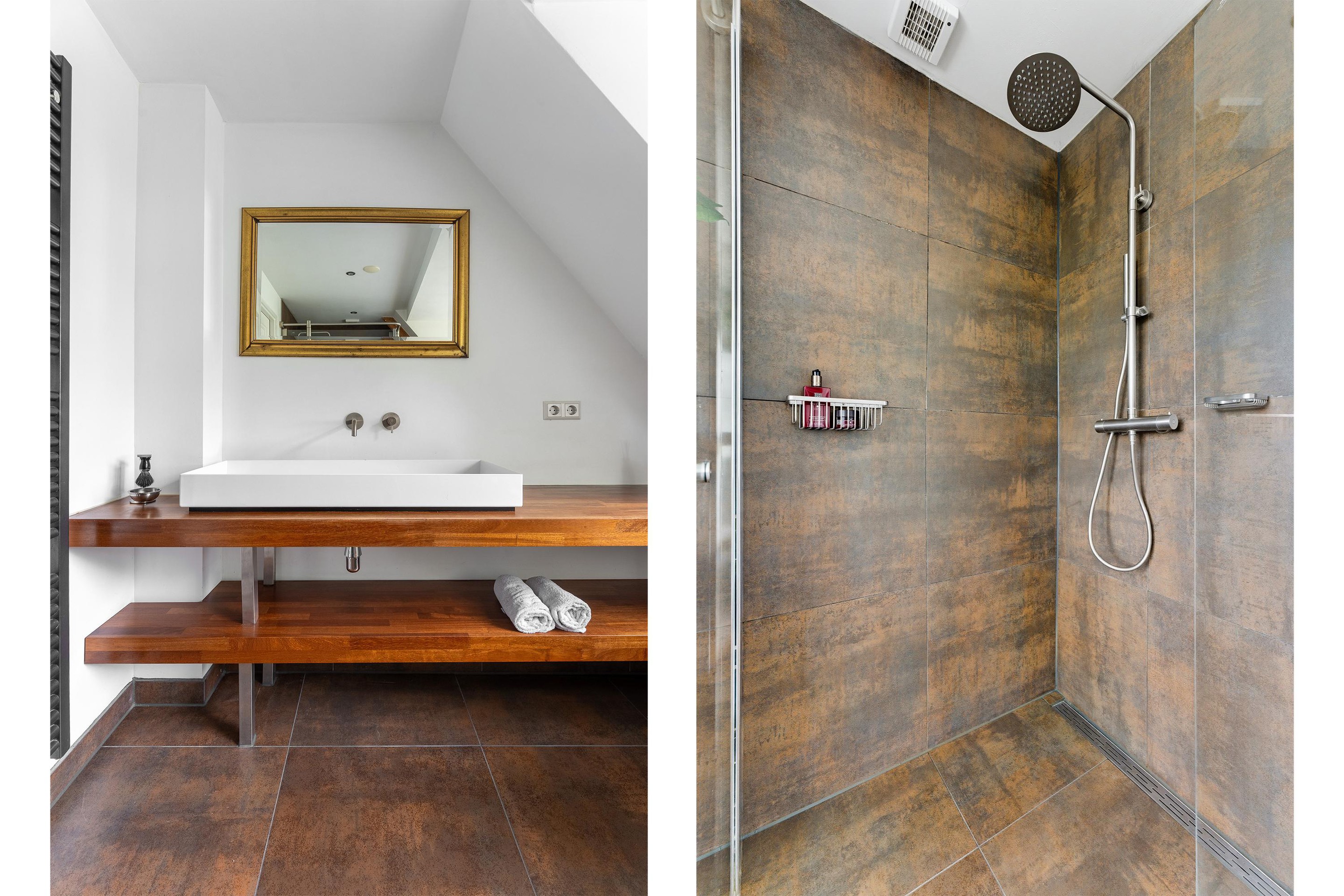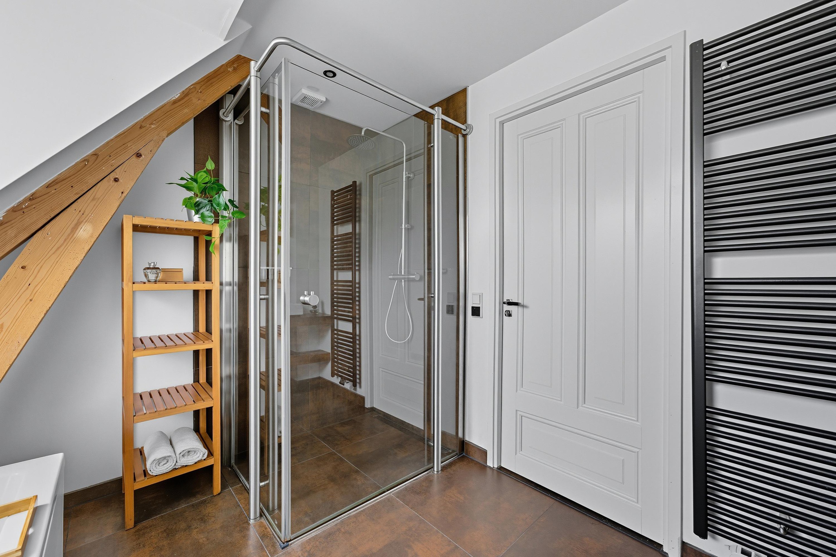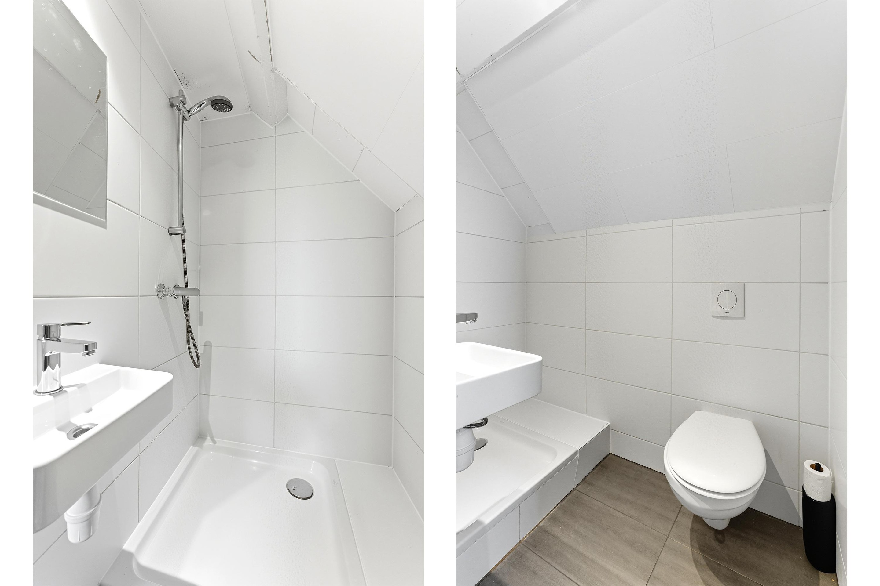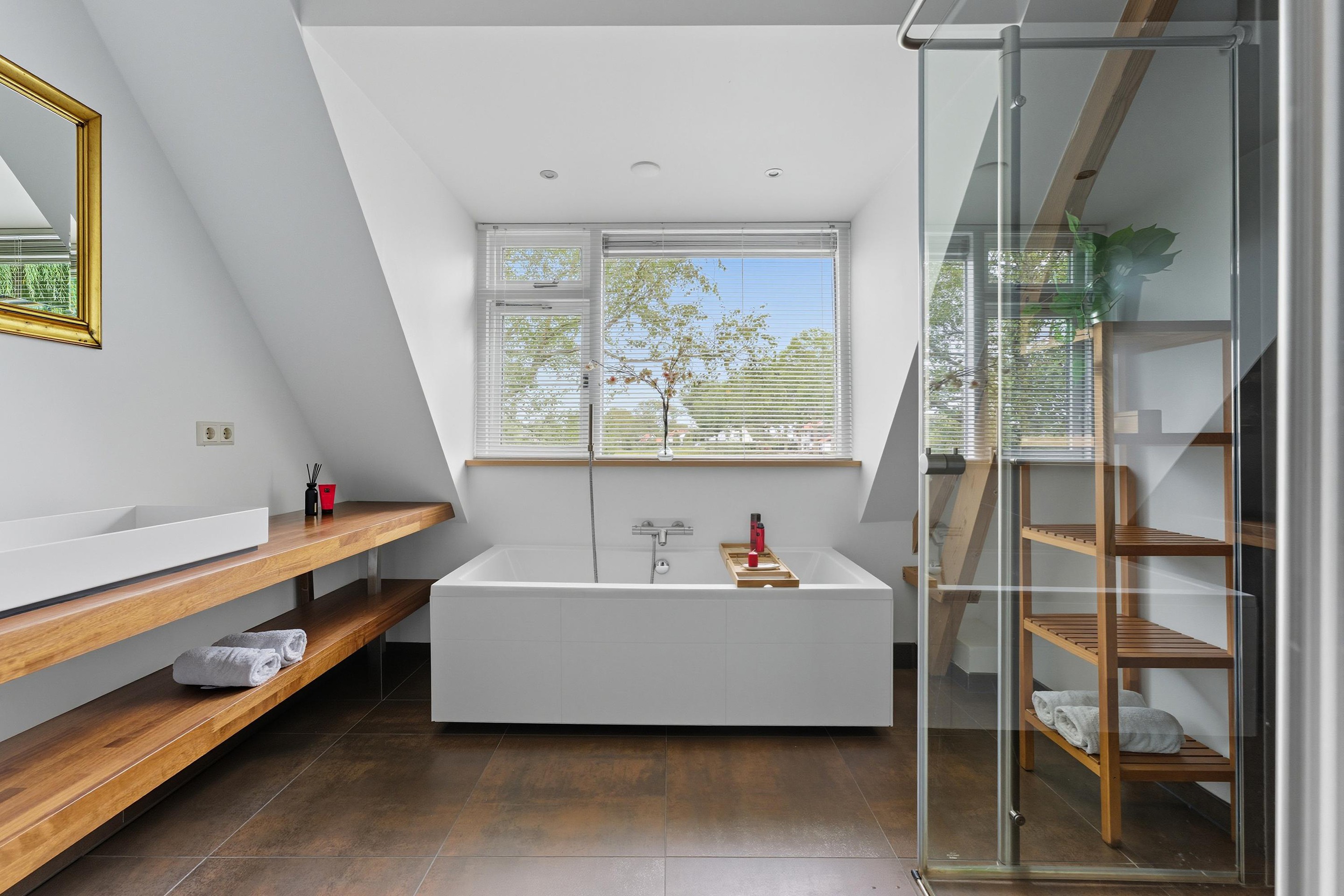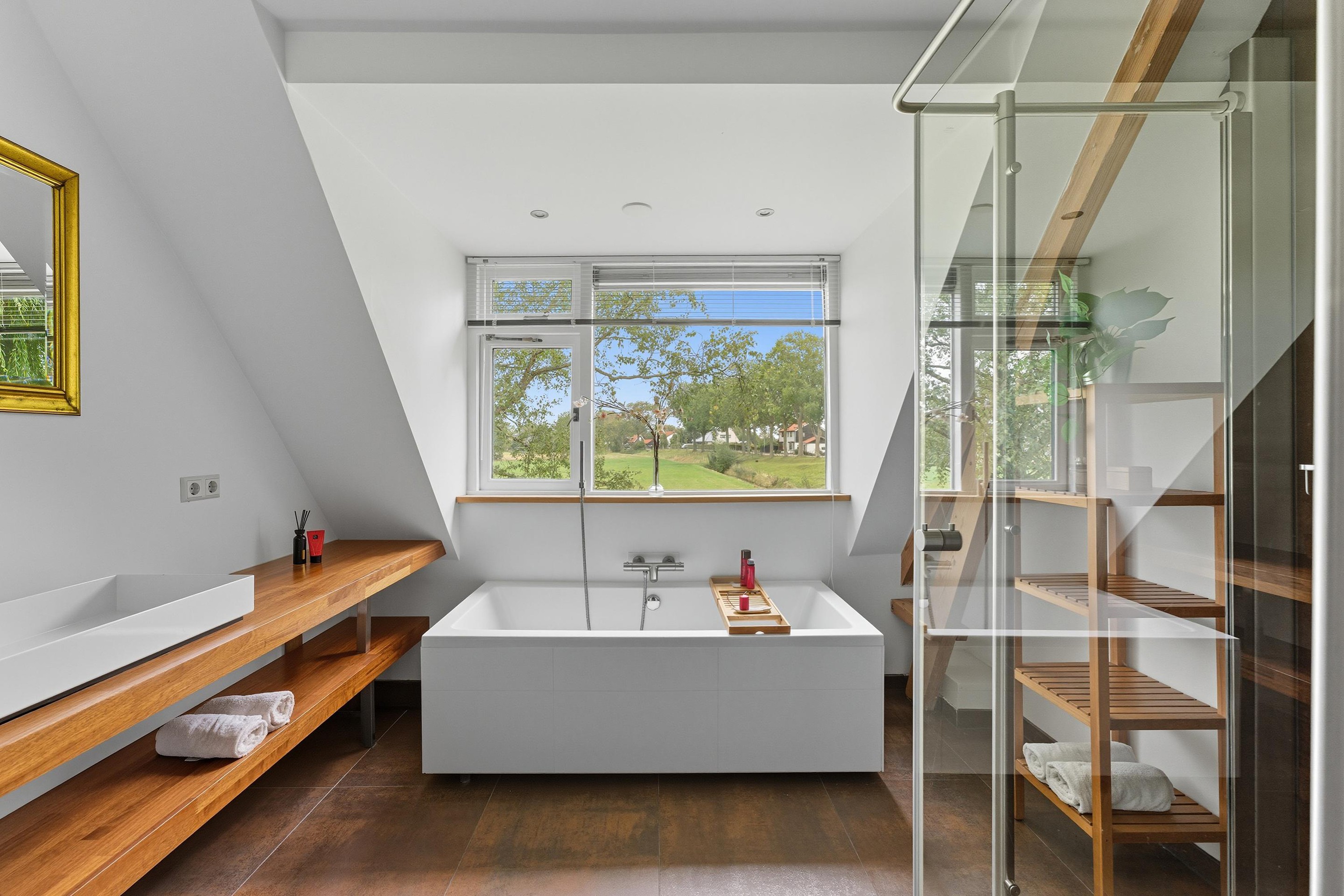 De badkamer heeft een prachtige luxe uitstraling met hoogwaardige materialen en is voorzien van een ligbad, douchecabine en wastafelmeubel. Ten slotte is er ook een separaat toilet op de 1e verdieping.