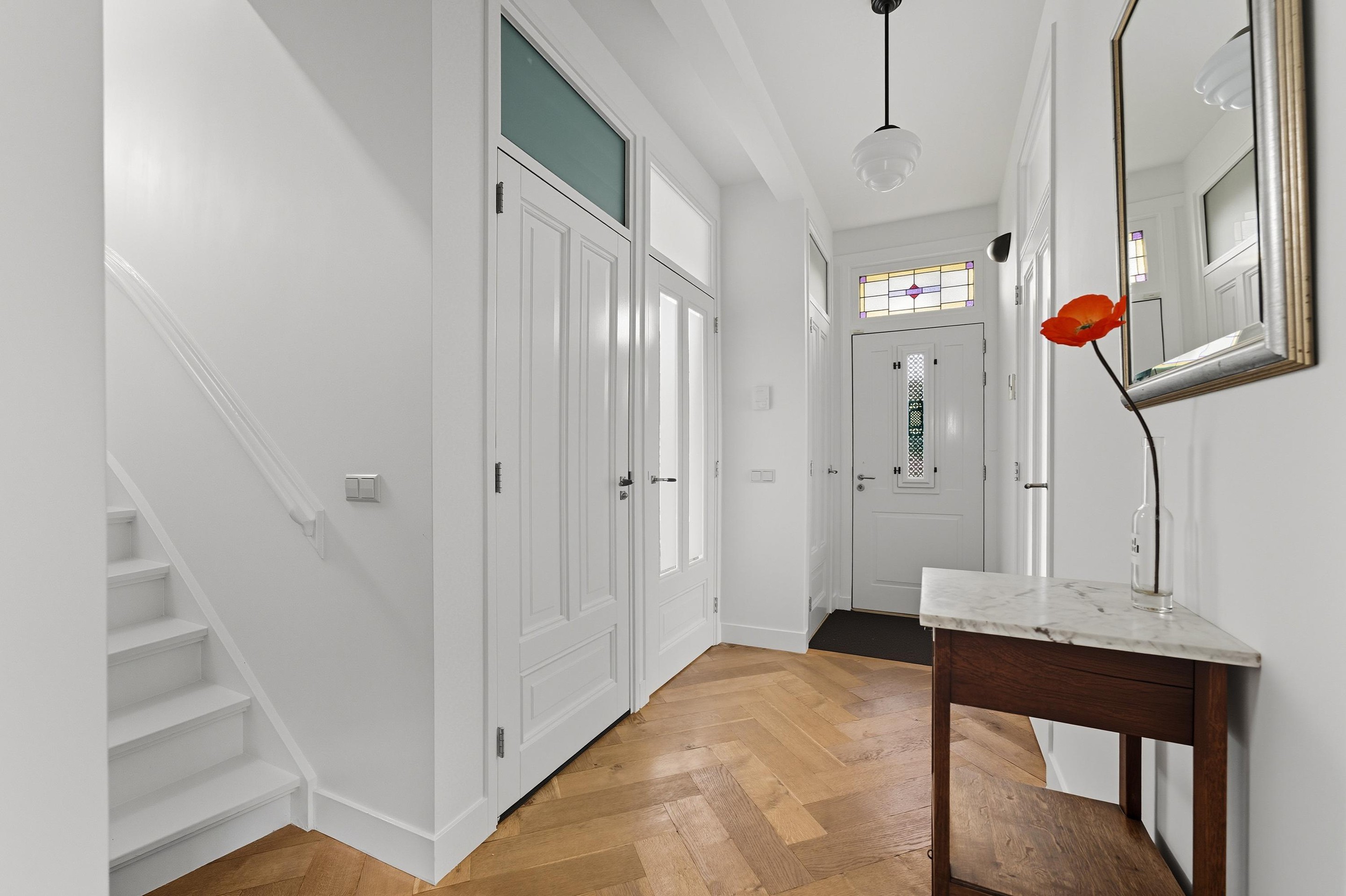 Je komt de woning binnen in de charmante en karakteristieke hal. Er is direct in de hal een aparte ruimte voor de wasmachine en garderobe. Er is ook een slaap-/werkkamer op de begane grond, ideaal als kantoor aan huis of als je de woning levensloopbestendig wil maken. Tevens is er in de hal een modern toilet, de charmante trap naar de 1e verdieping en toegang tot de kelder.
