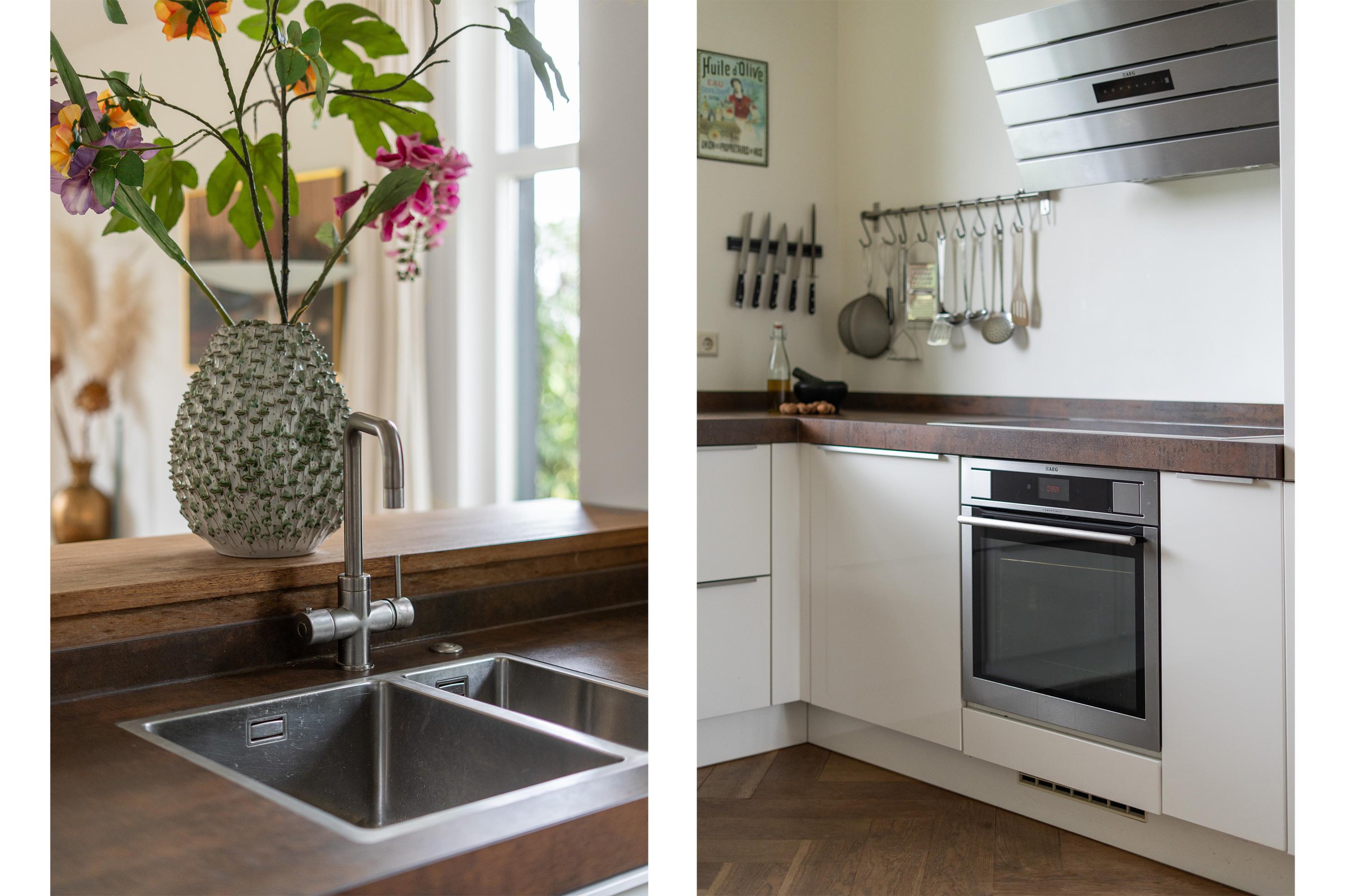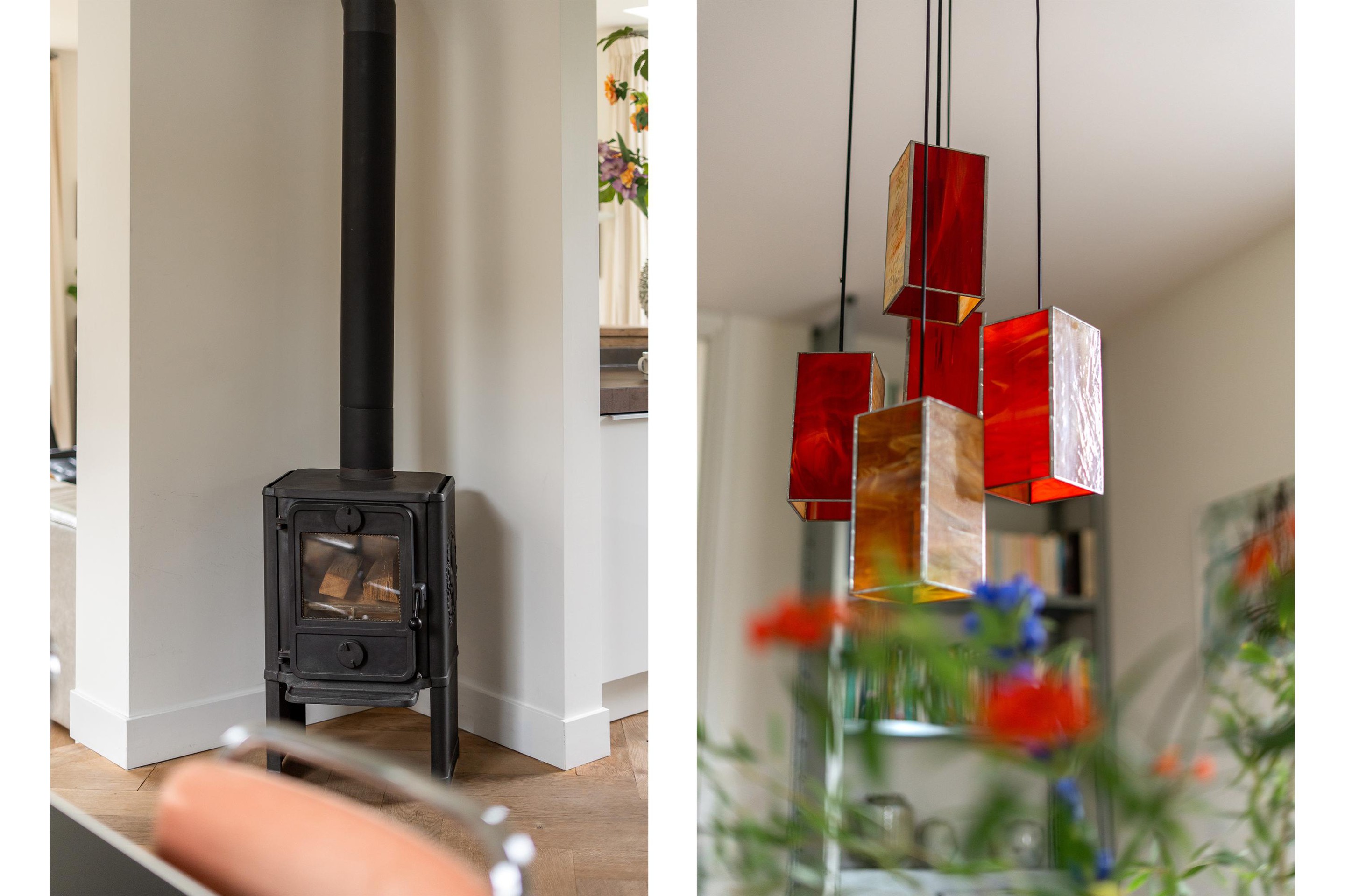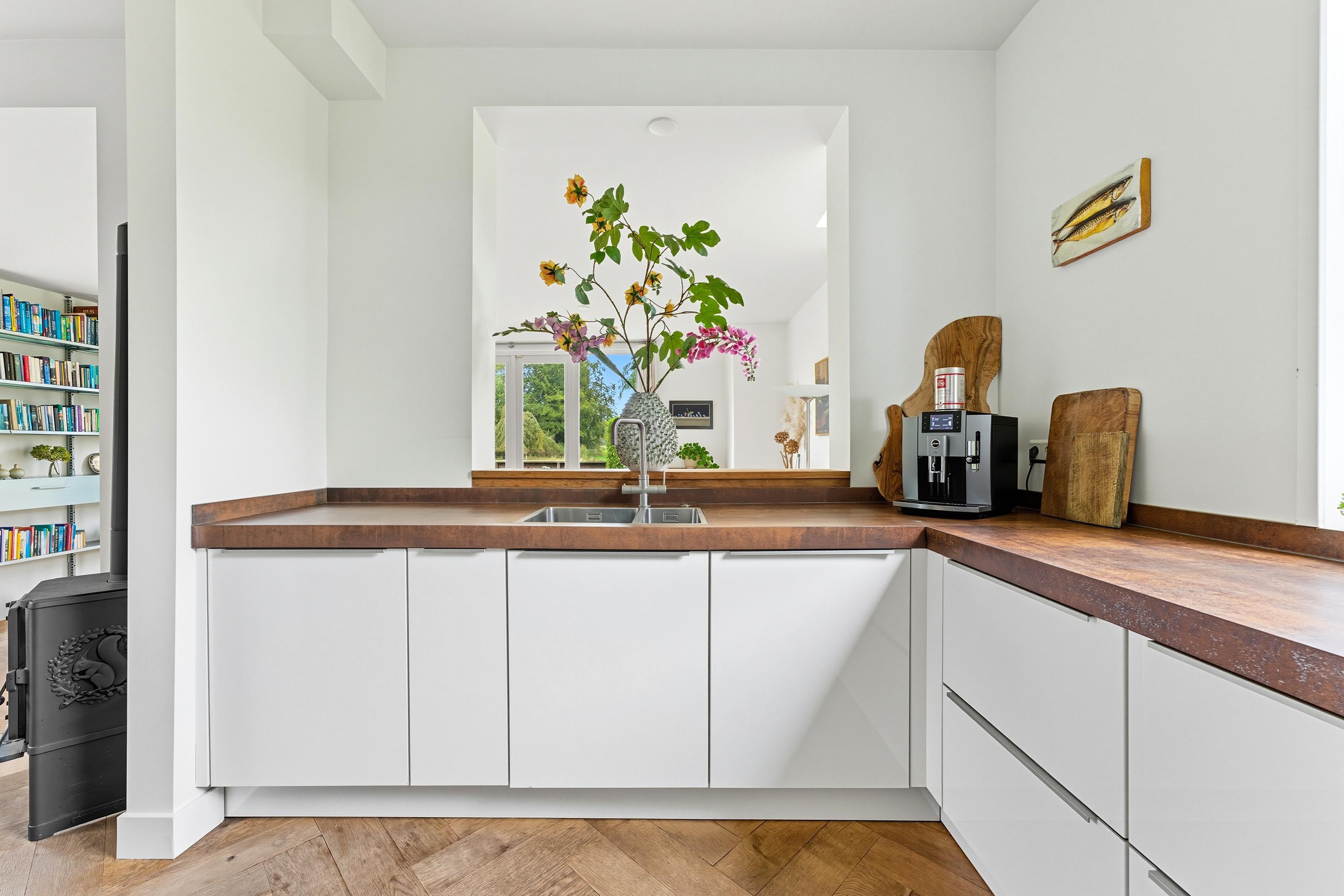 In de living word je direct verrast door ruimtelijkheid en de charmante afwerking. In de uitbouw is er een royale woonkamer gecreëerd, licht en sfeervol, met een fijne connectie naar de tuin. Er is een charmante open haard én houtkachel aanwezig. De woonkamer heeft een fijne connectie met het eetgedeelte en de leefkeuken. De keuken heeft een strakke en luxe afwerking en is volledig voorzien van inbouwapparatuur.