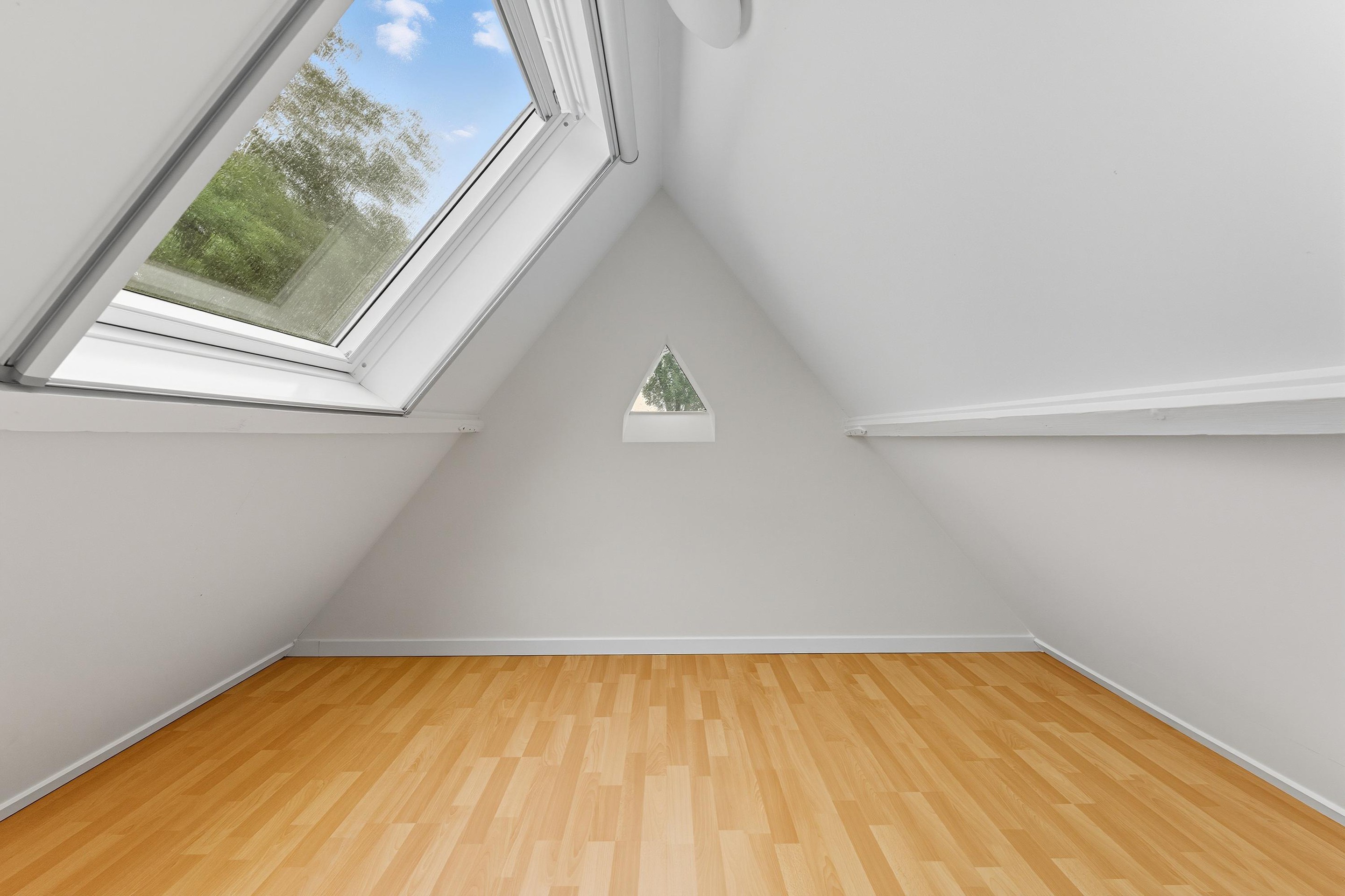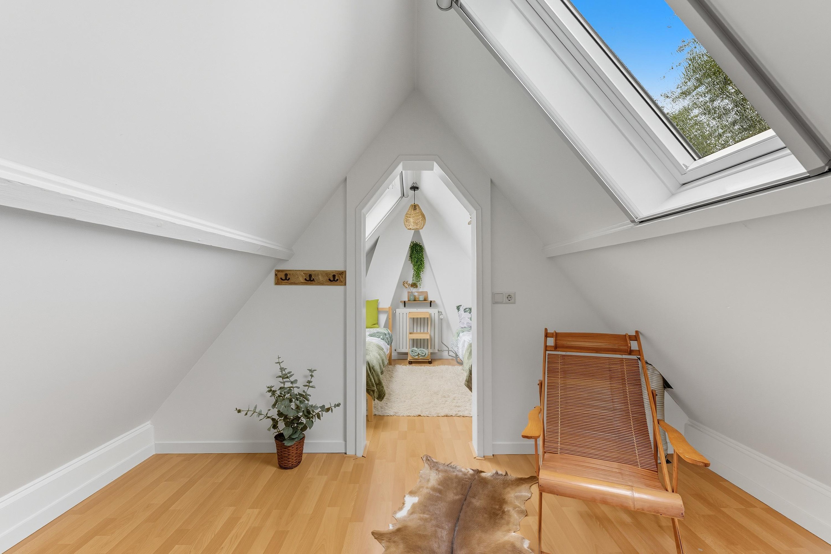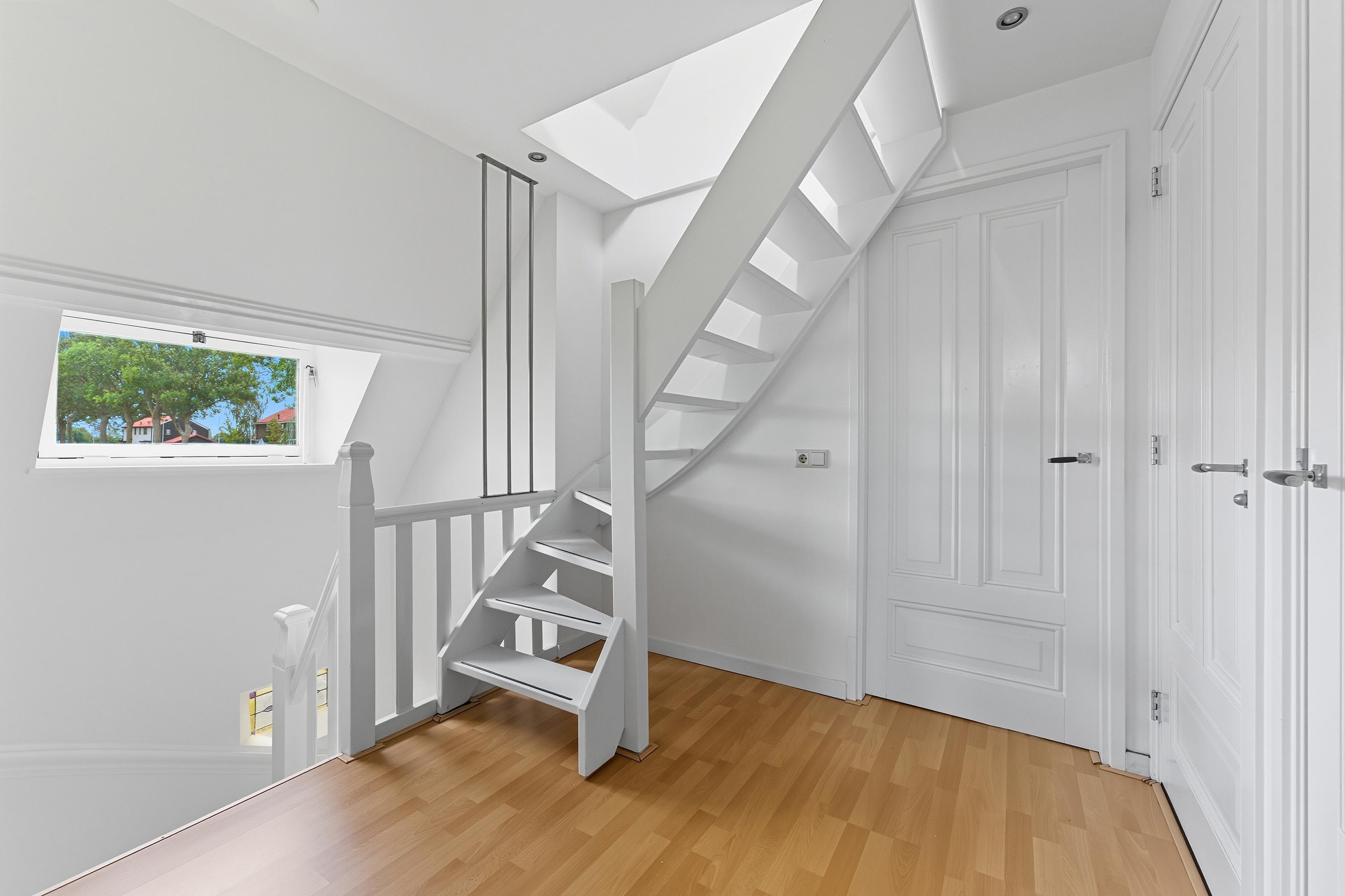 Je komt op deze verdieping op de overloop. Hier zijn nóg eens twee kamers te vinden, ideaal als logeer- of werkkamers.