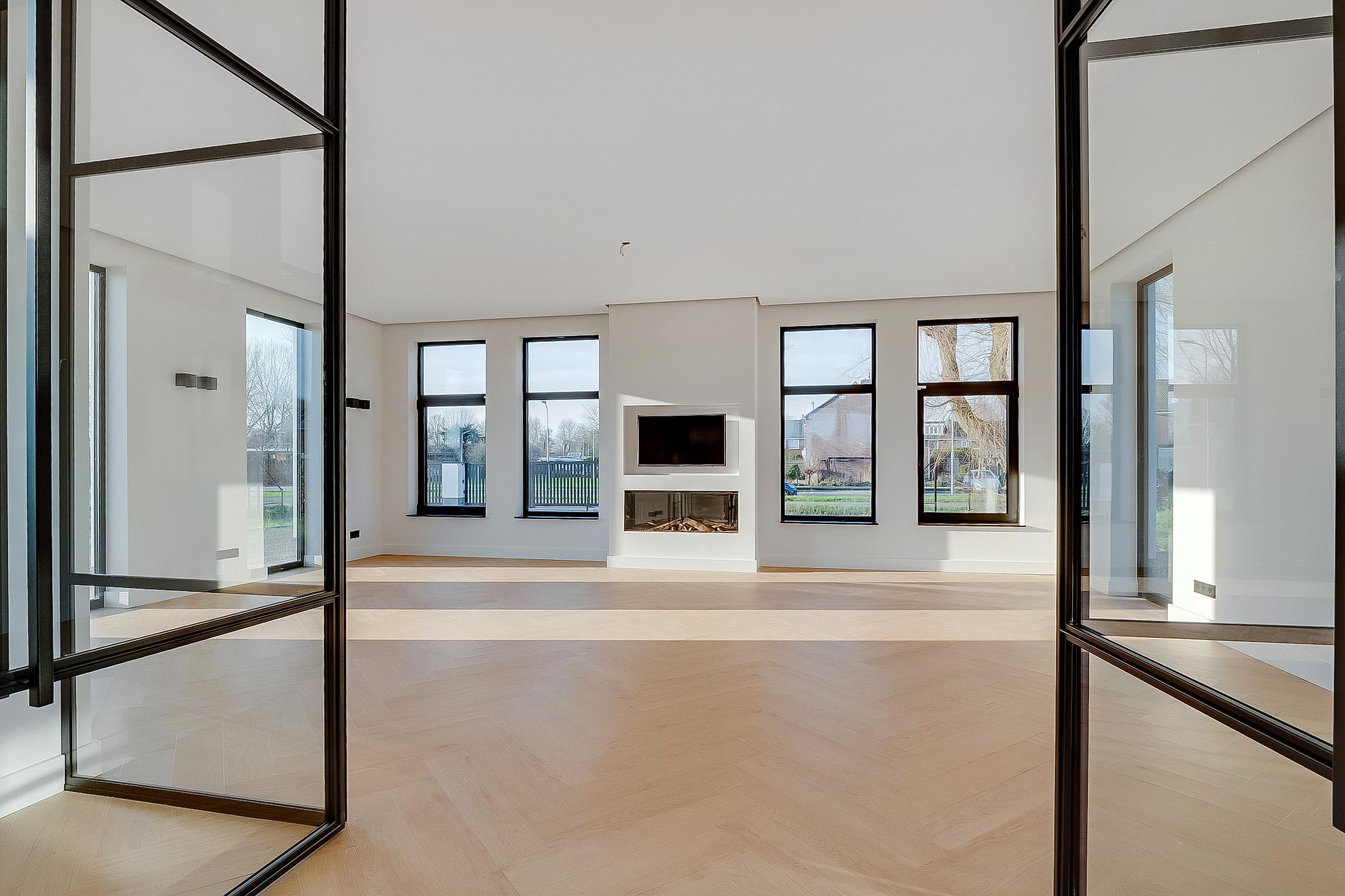 Aan de voorzijde de ruime lichte living met elektrische haard en rondom ramen. Vanuit de woonkamer heerlijk uitzicht op de tuin. Door het grote formaat woonkamer is inrichting op diverse manieren mogelijk.