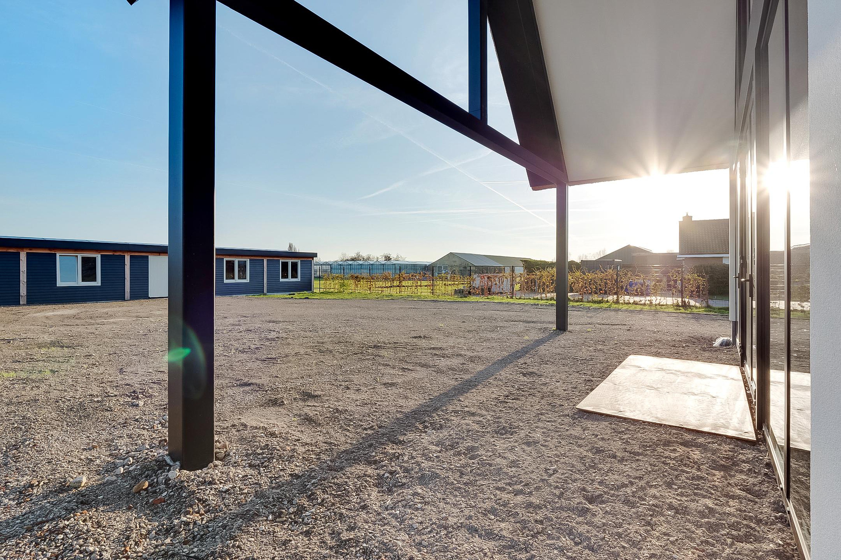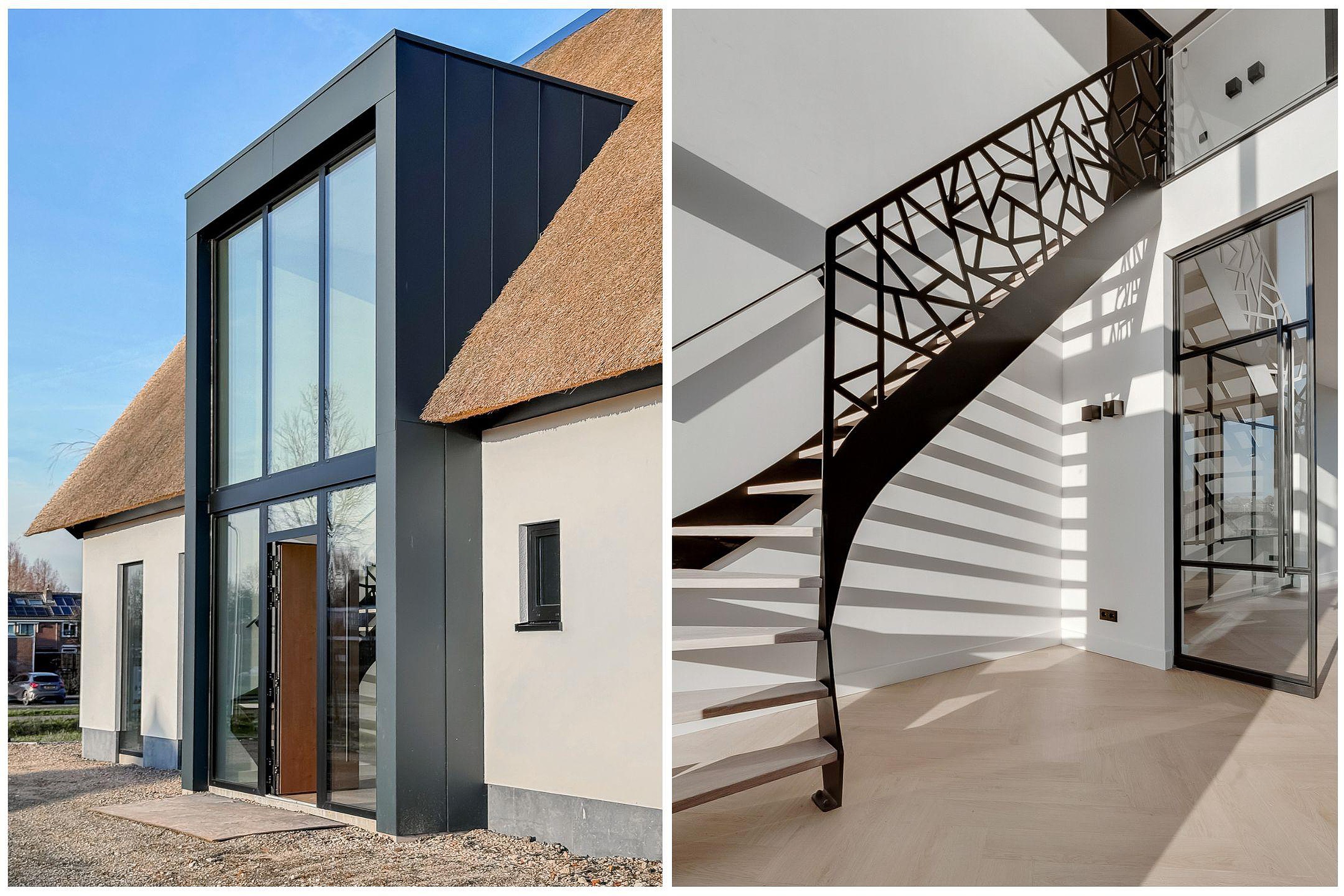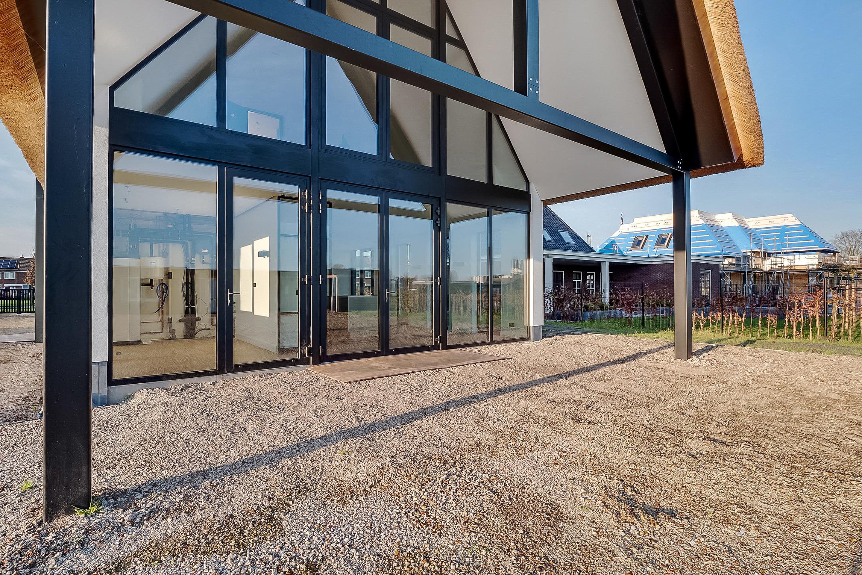De hoge glazen pui aan de achterzijde zorgt binnen voor veel daglicht en met het doorlopende rieten dak aan de buitenzijde is er heerlijk overdekt terras gecreëerd.