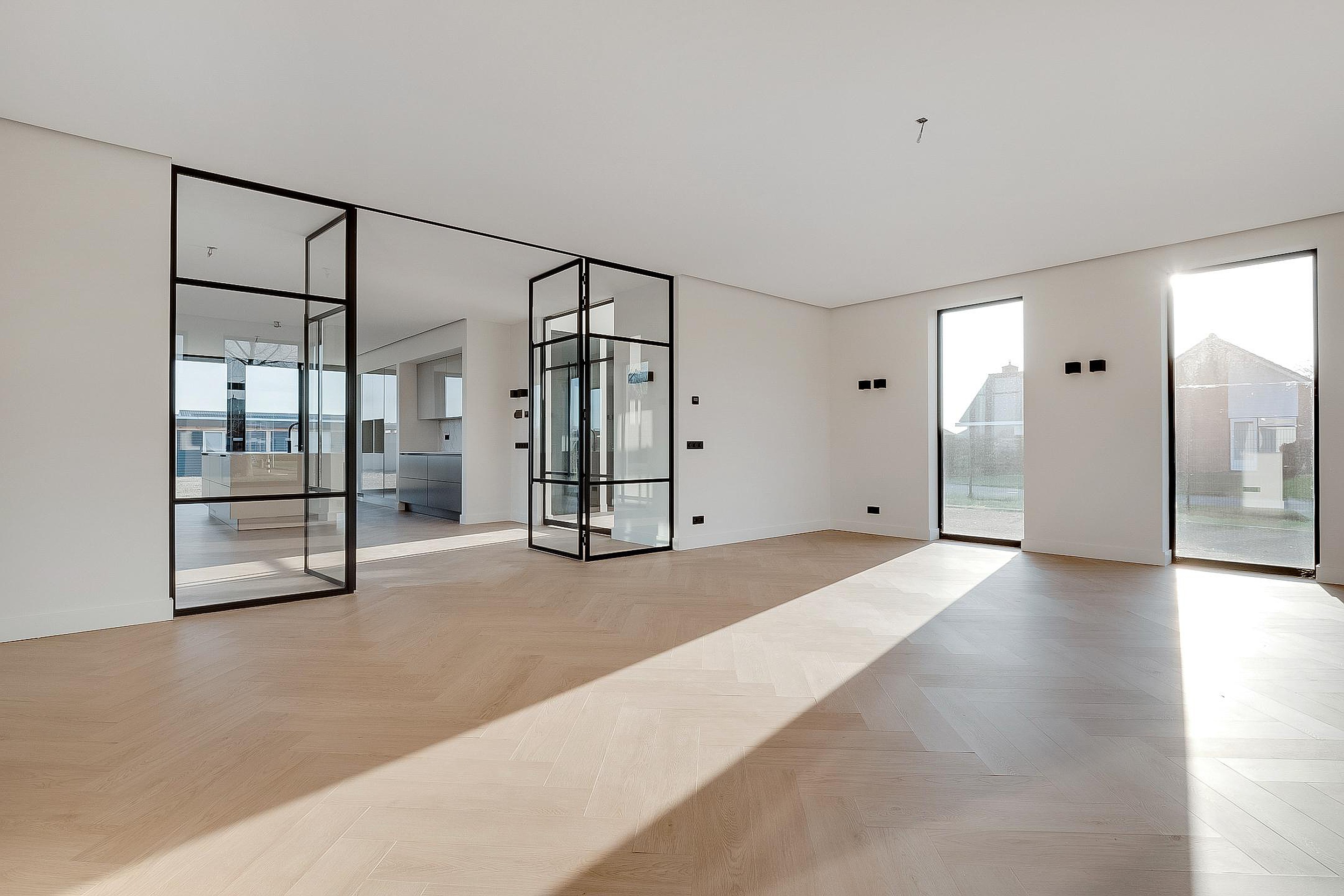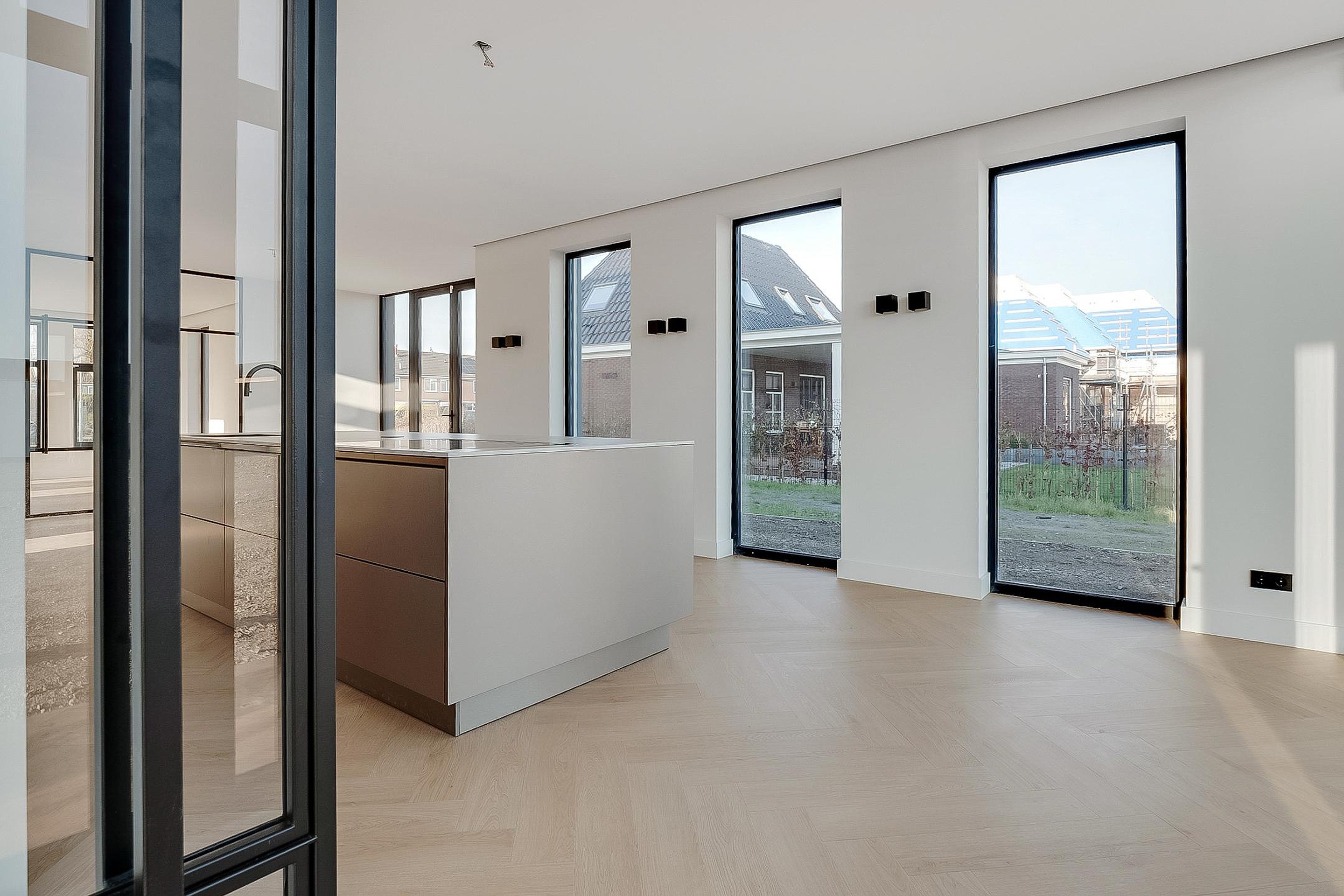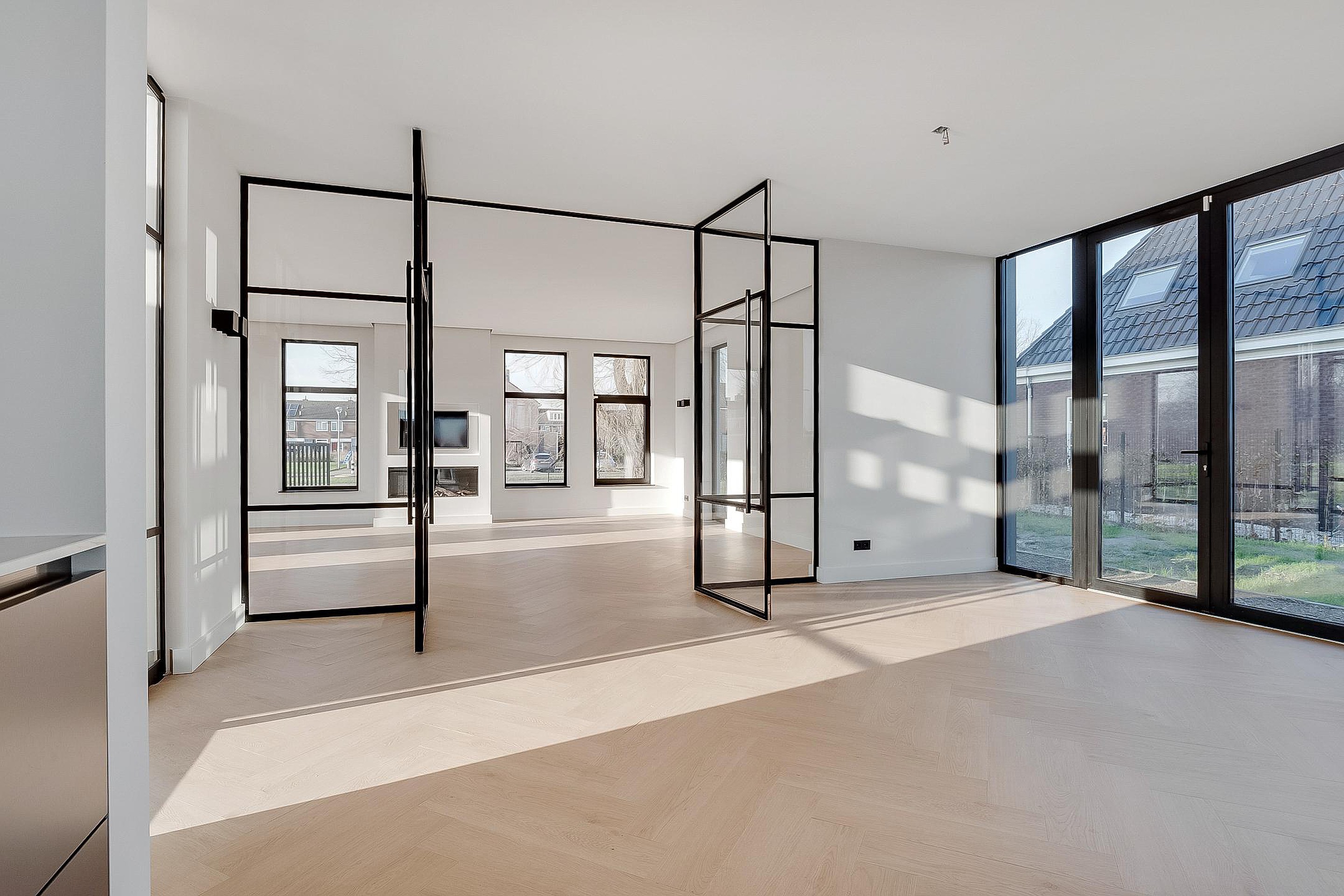 Door de royale opzet is er voldoende ruimte voor een grote eettafel. Aan twee kanten openslaande deuren naar buiten. De visgraat vloer en de hoge zwart stalen binnen kozijnen geven het geheel een moderne chique uitstraling.