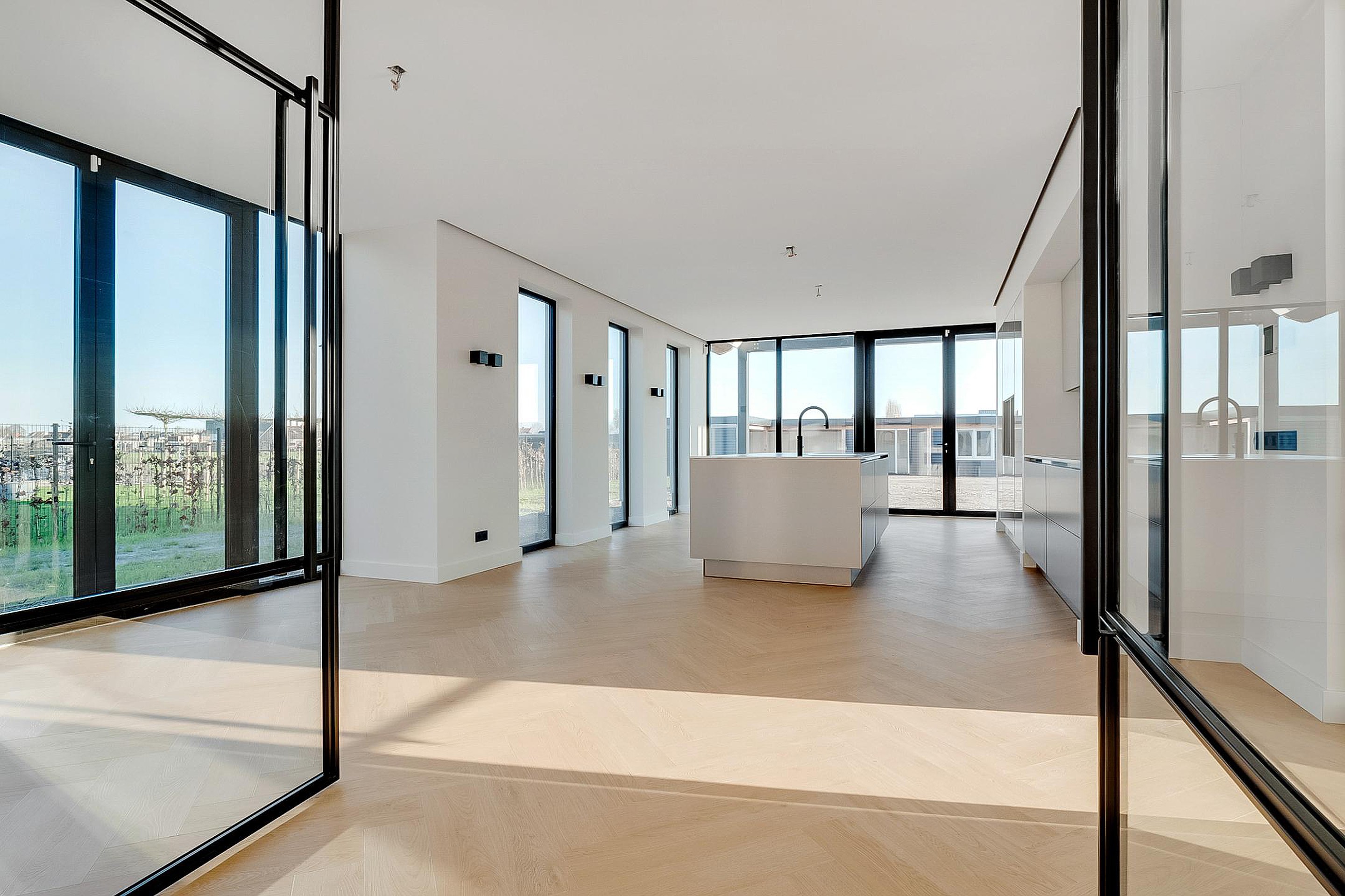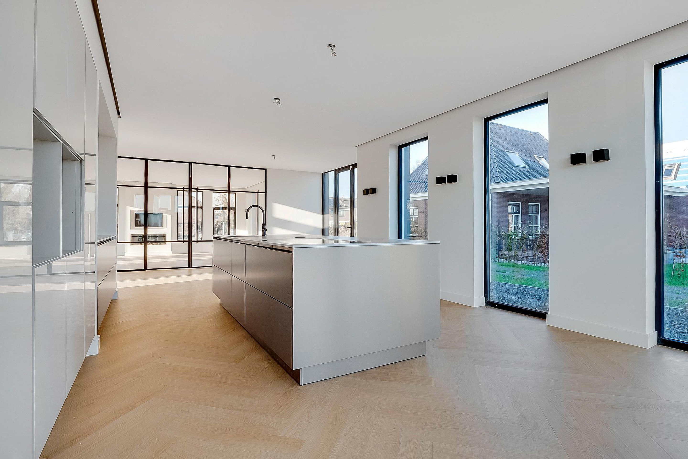 Aan de voorzijde een prachtige glazen afscheiding tussen woonkamer en keuken. Rechts achterin de doorloop naar de bijkeuken.