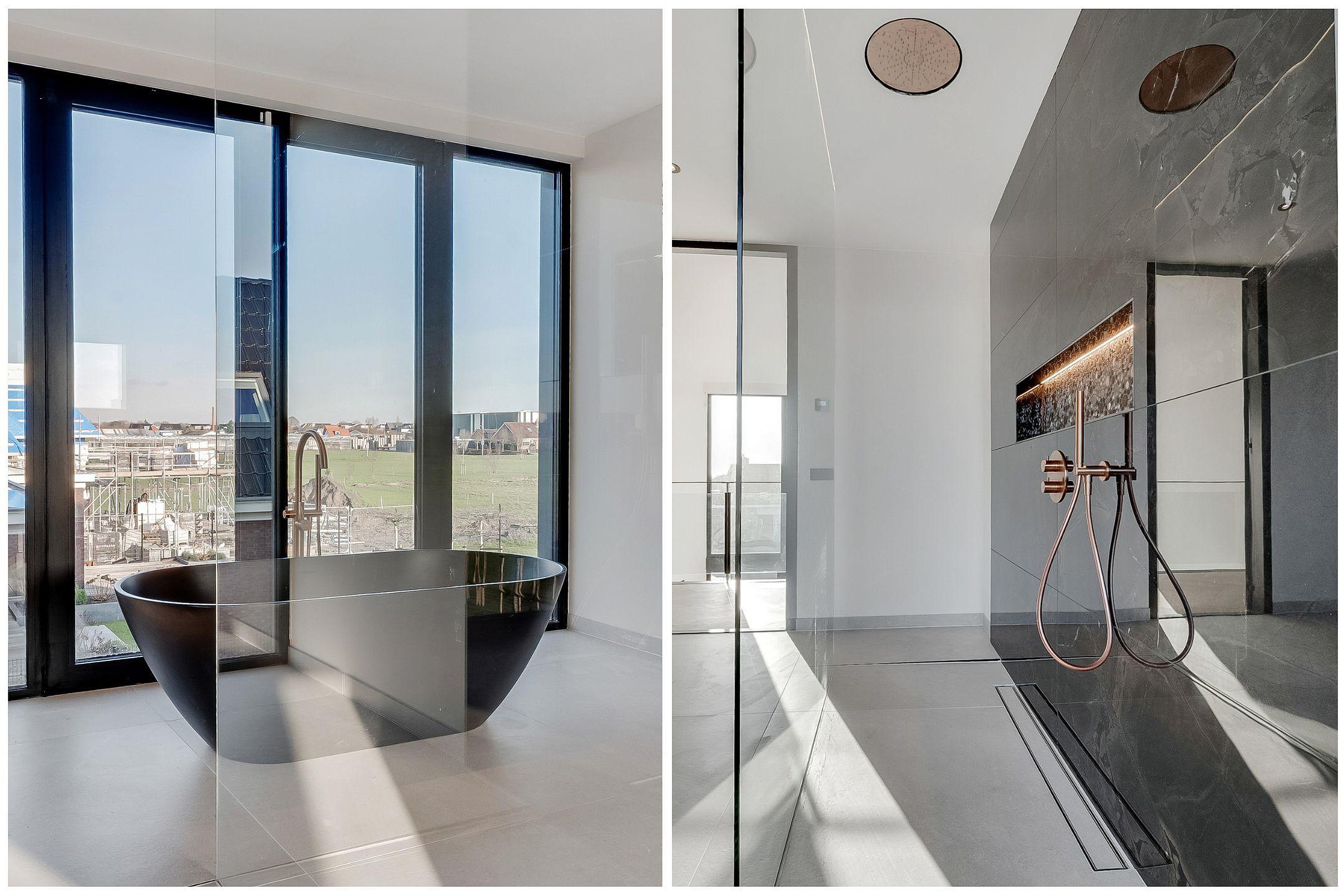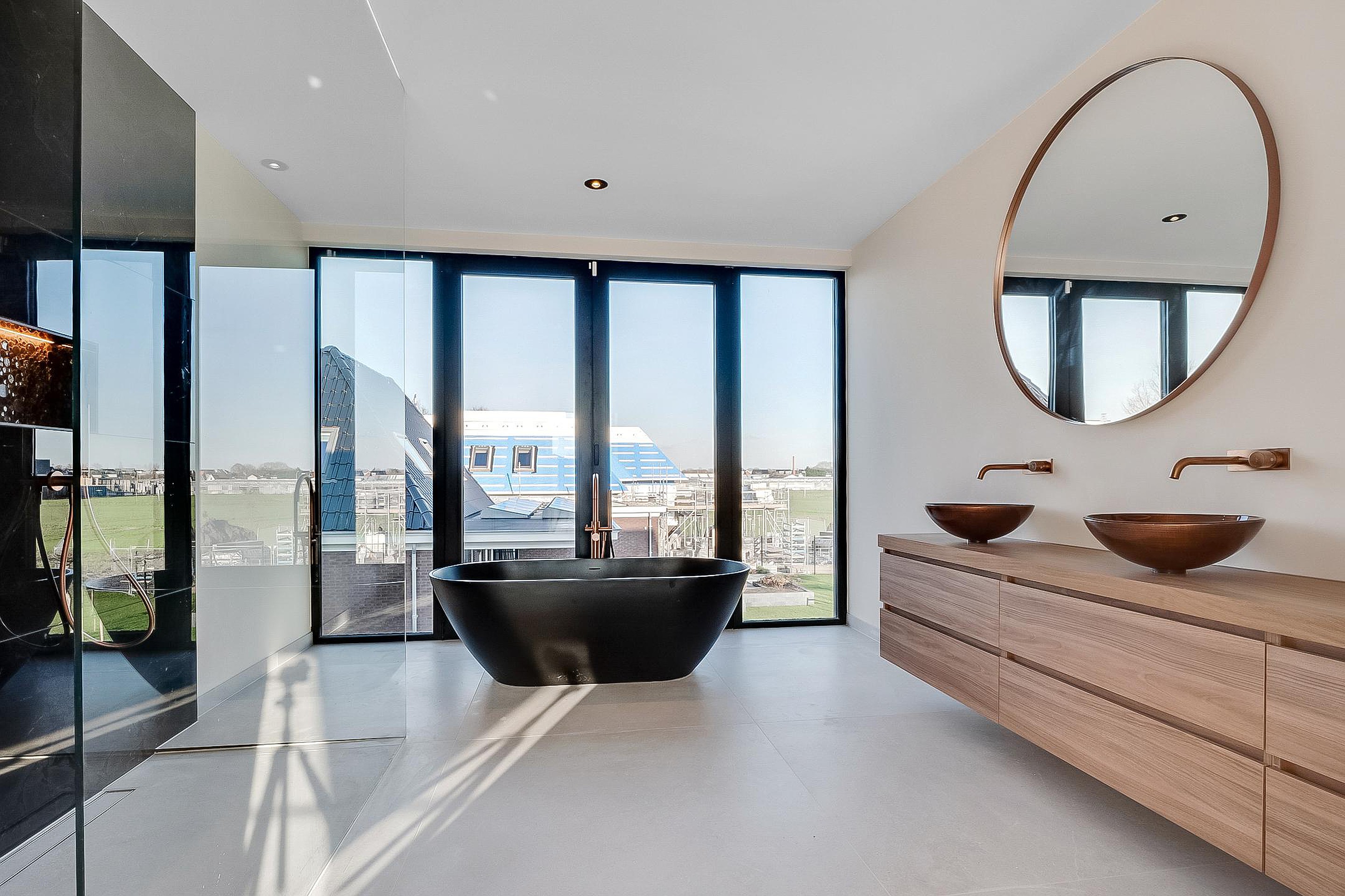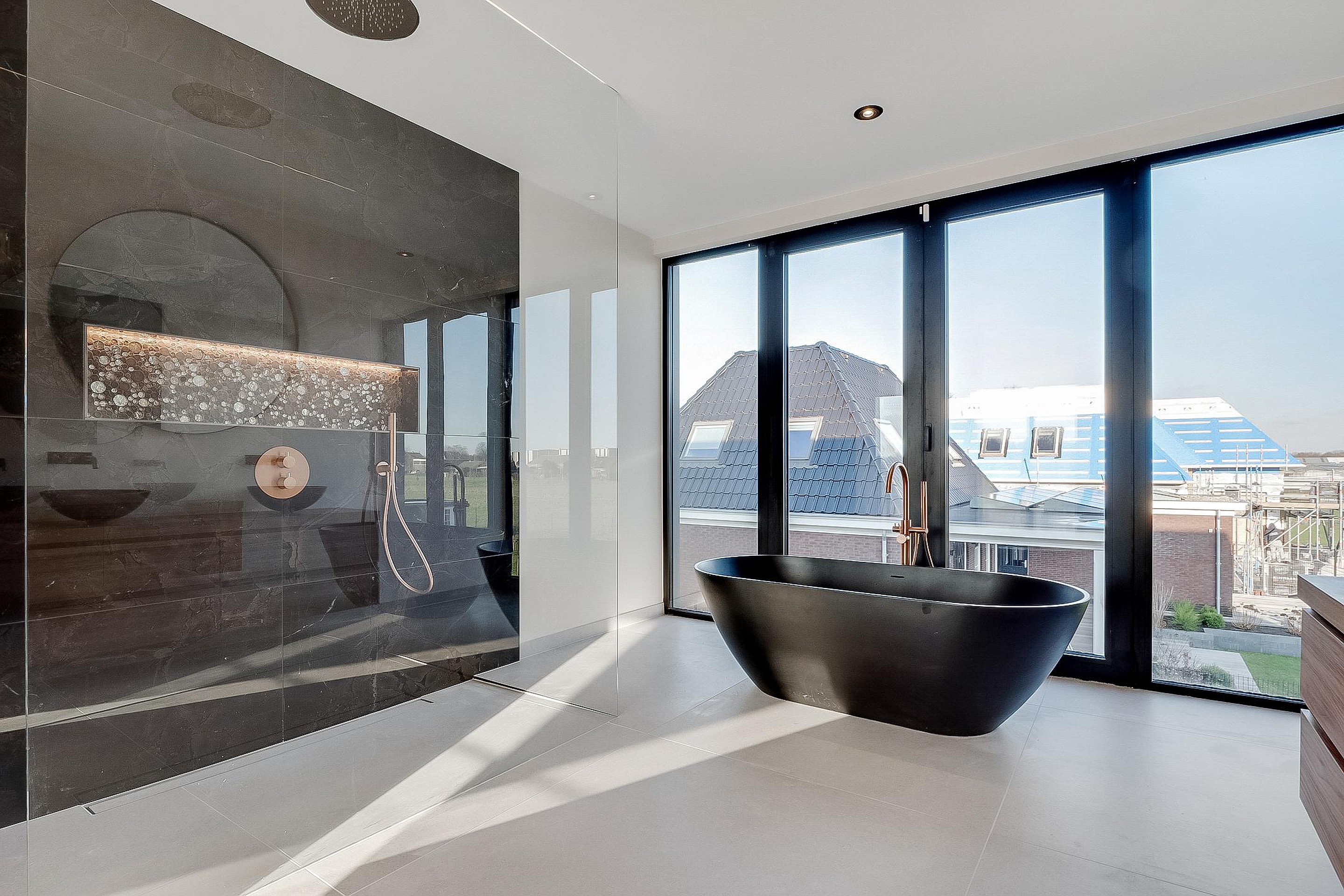 In het midden de nieuwe luxe badkamer met ruime inloopdouche, vrijstaand ligbad, wastafelmeubel met twee wastafels, spiegel en verlichting.