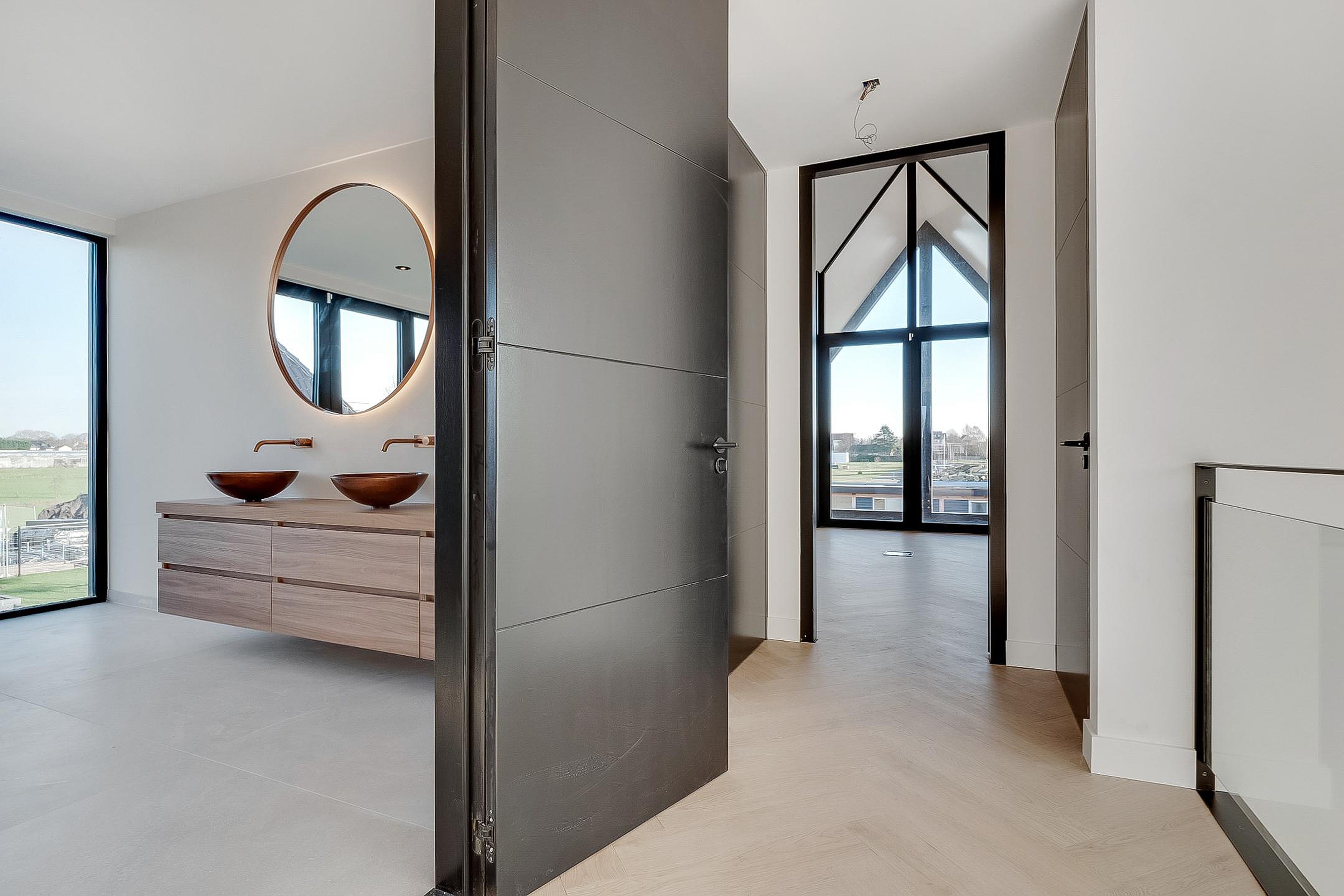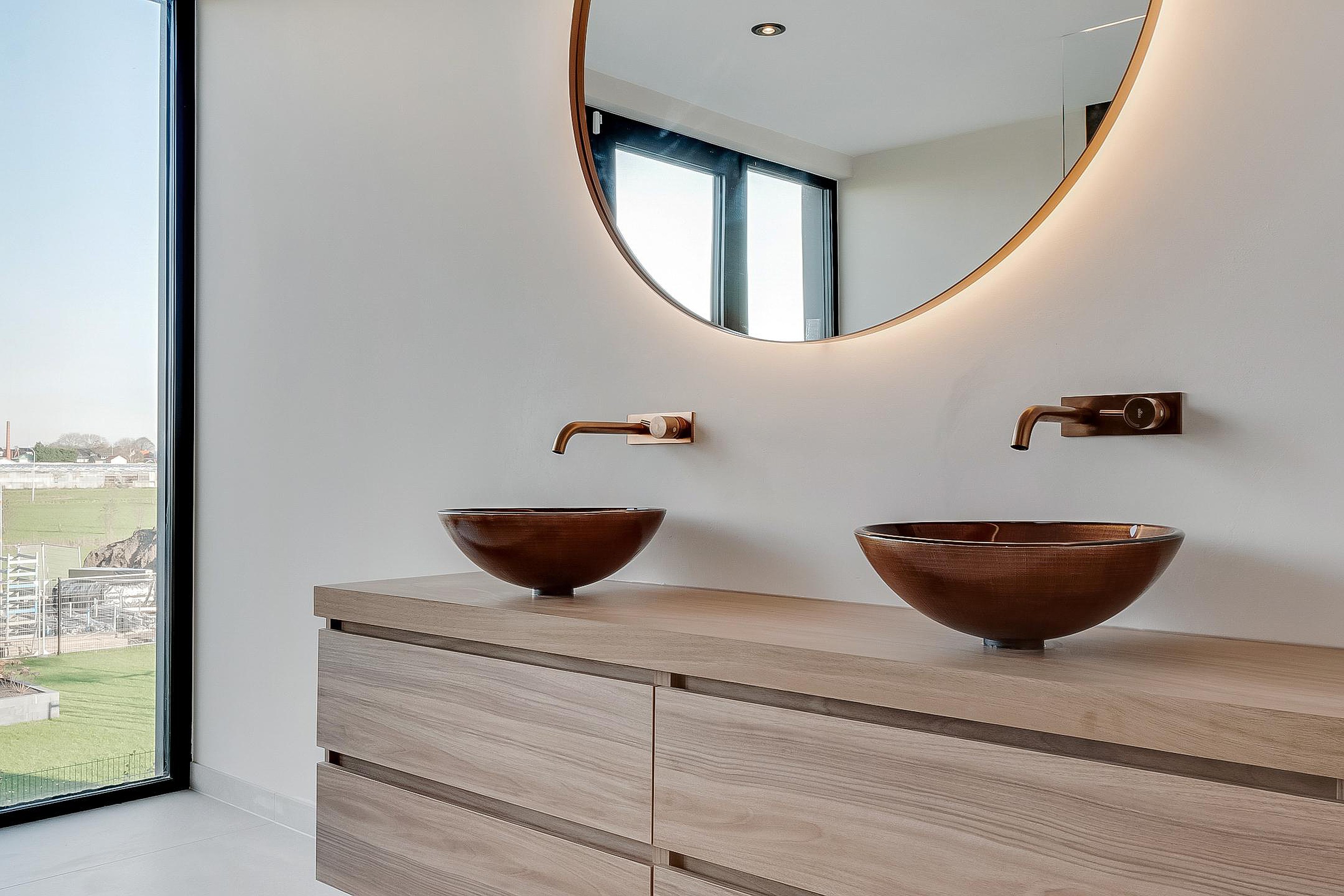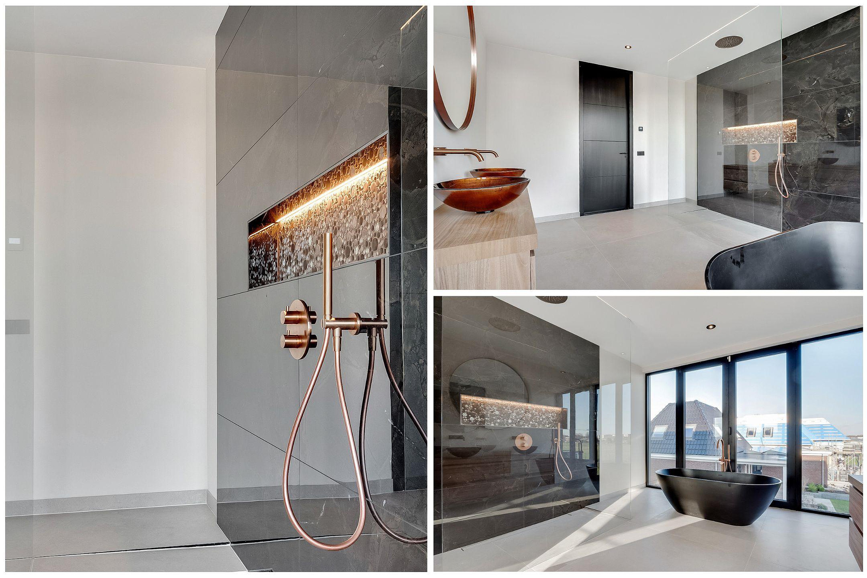 In het midden de nieuwe luxe badkamer met ruime inloopdouche, vrijstaand ligbad, wastafelmeubel met twee wastafels, spiegel en verlichting.