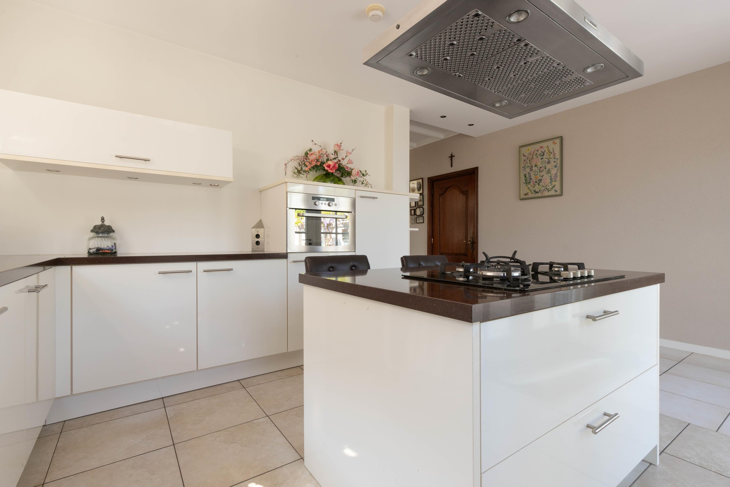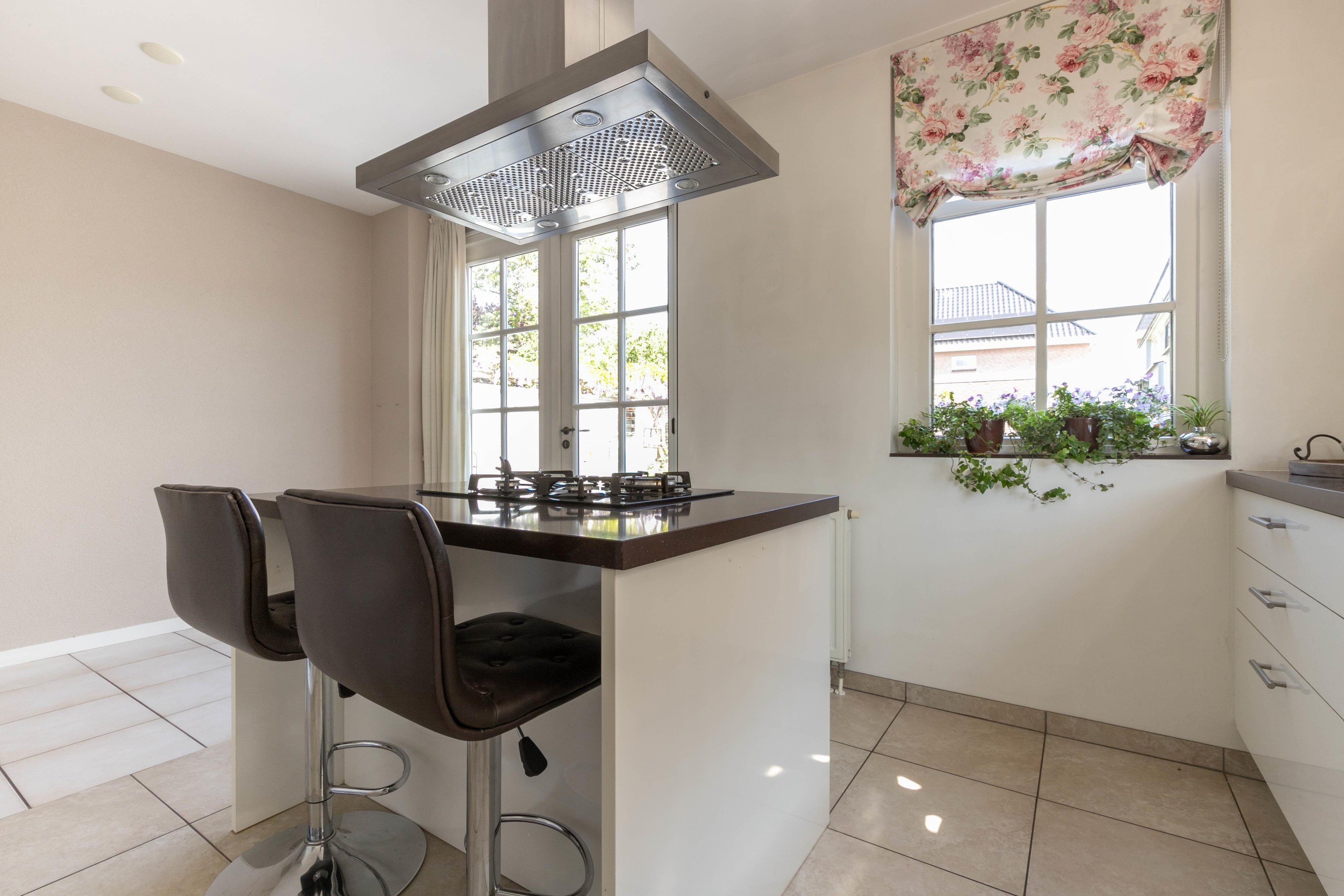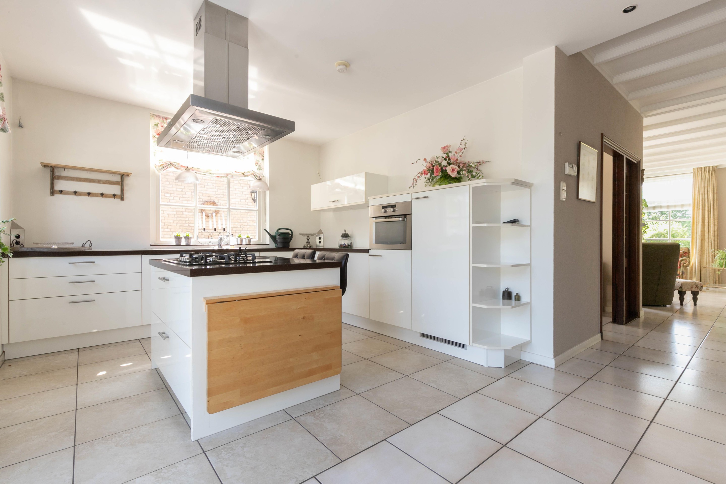 De halfopen keuken is aan de tuinzijde gelegen en voorzien van een moderne L-vormige opstelling met een hardstenen werkblad en diverse inbouwapparatuur. Het aanwezige kookeiland beschikt over een 5-pits gaskookplaat en een RVS-afzuigkap en wordt tevens gebruikt als zitbar. Vanuit de keuken bieden openslaande deuren toegang tot de grote, zonnige tuin met sierbestrating, borders en diverse terrassen. Vanuit de tuin is er toegang tot het grote bijgebouw en de vrijstaande garage aan de achterzijde.