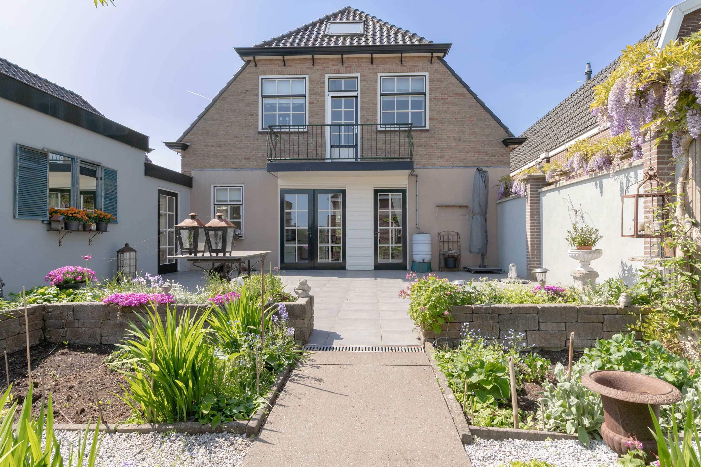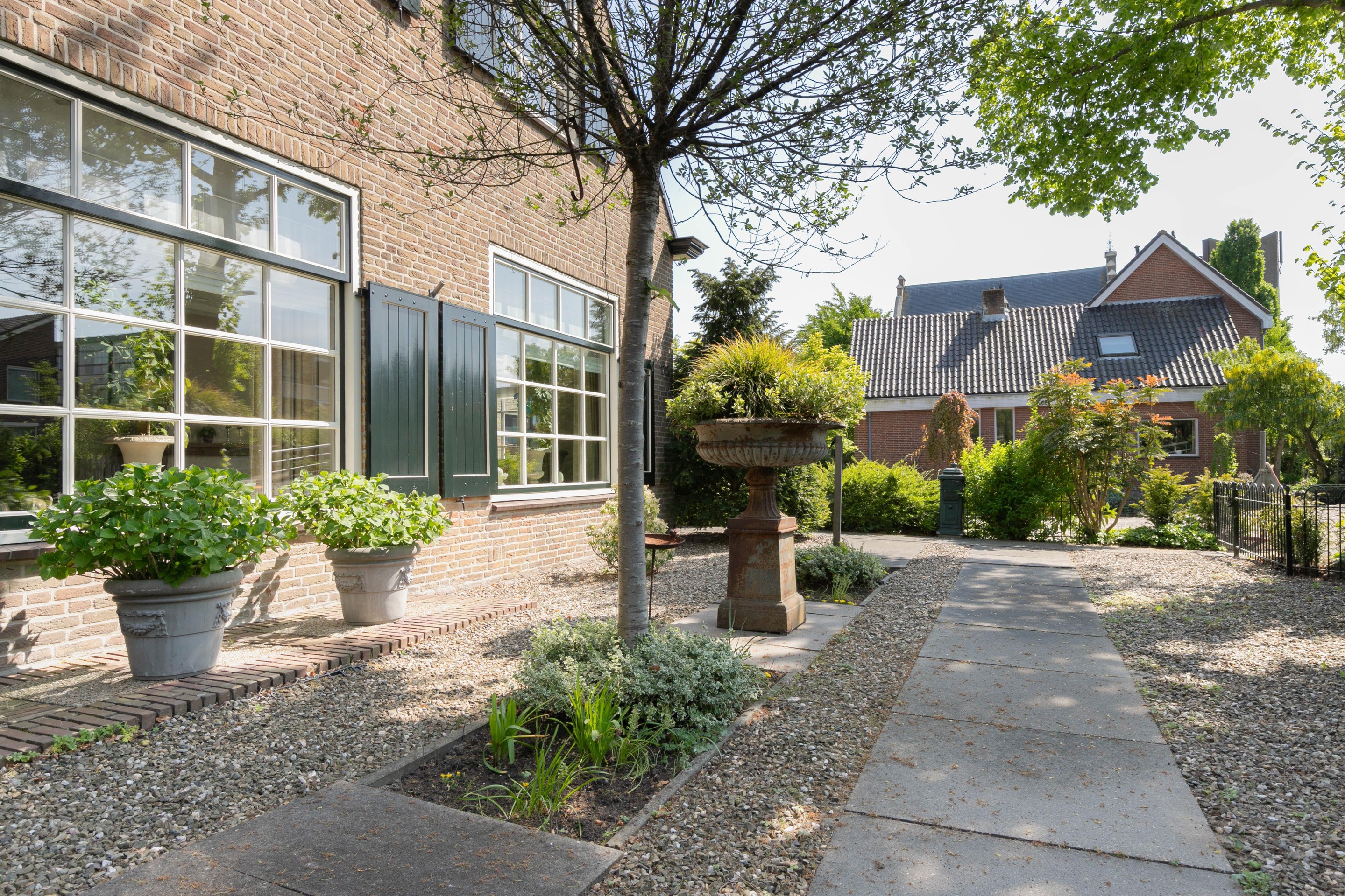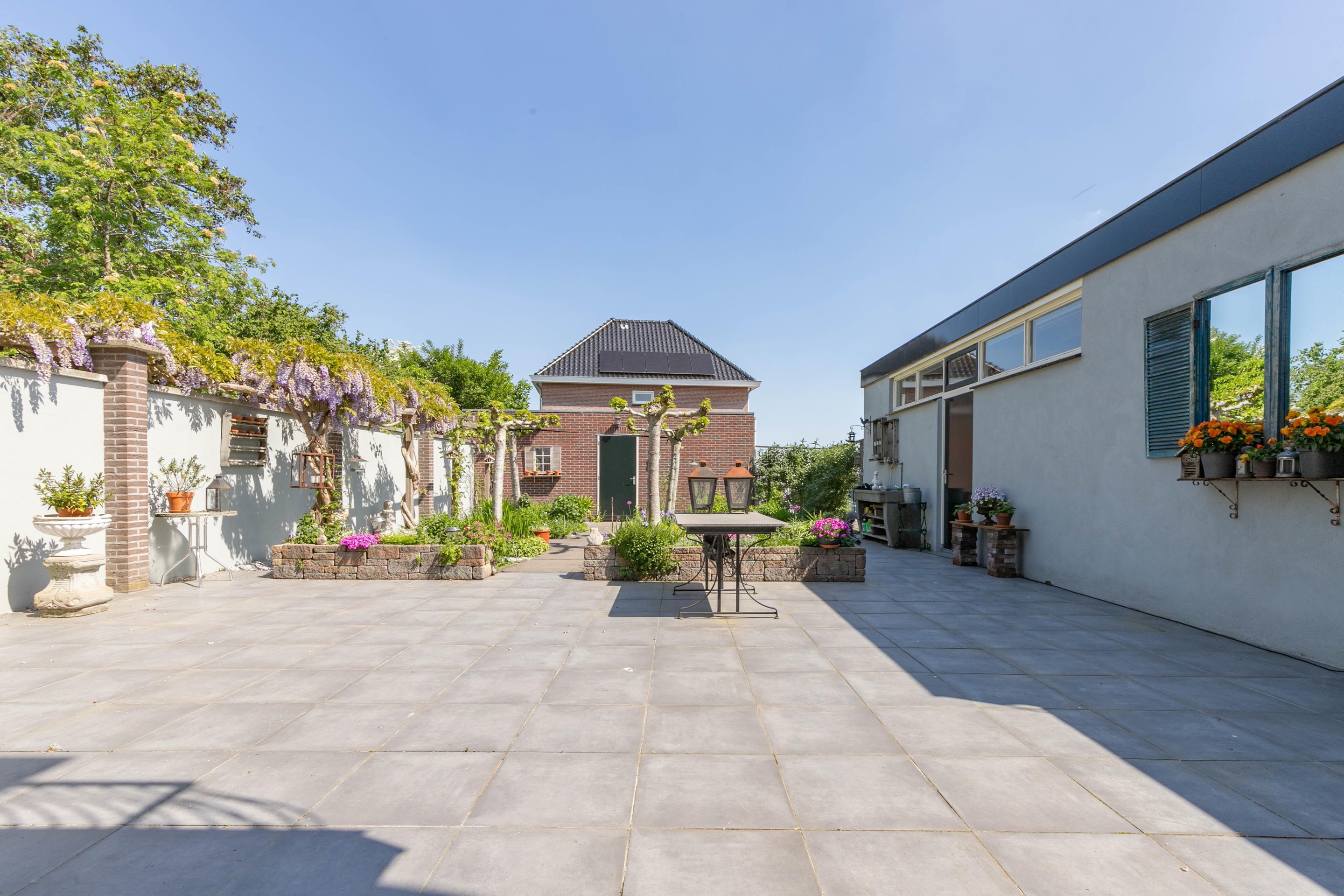 De halfopen keuken is aan de tuinzijde gelegen en voorzien van een moderne L-vormige opstelling met een hardstenen werkblad en diverse inbouwapparatuur. Het aanwezige kookeiland beschikt over een 5-pits gaskookplaat en een RVS-afzuigkap en wordt tevens gebruikt als zitbar. Vanuit de keuken bieden openslaande deuren toegang tot de grote, zonnige tuin met sierbestrating, borders en diverse terrassen. Vanuit de tuin is er toegang tot het grote bijgebouw en de vrijstaande garage aan de achterzijde.