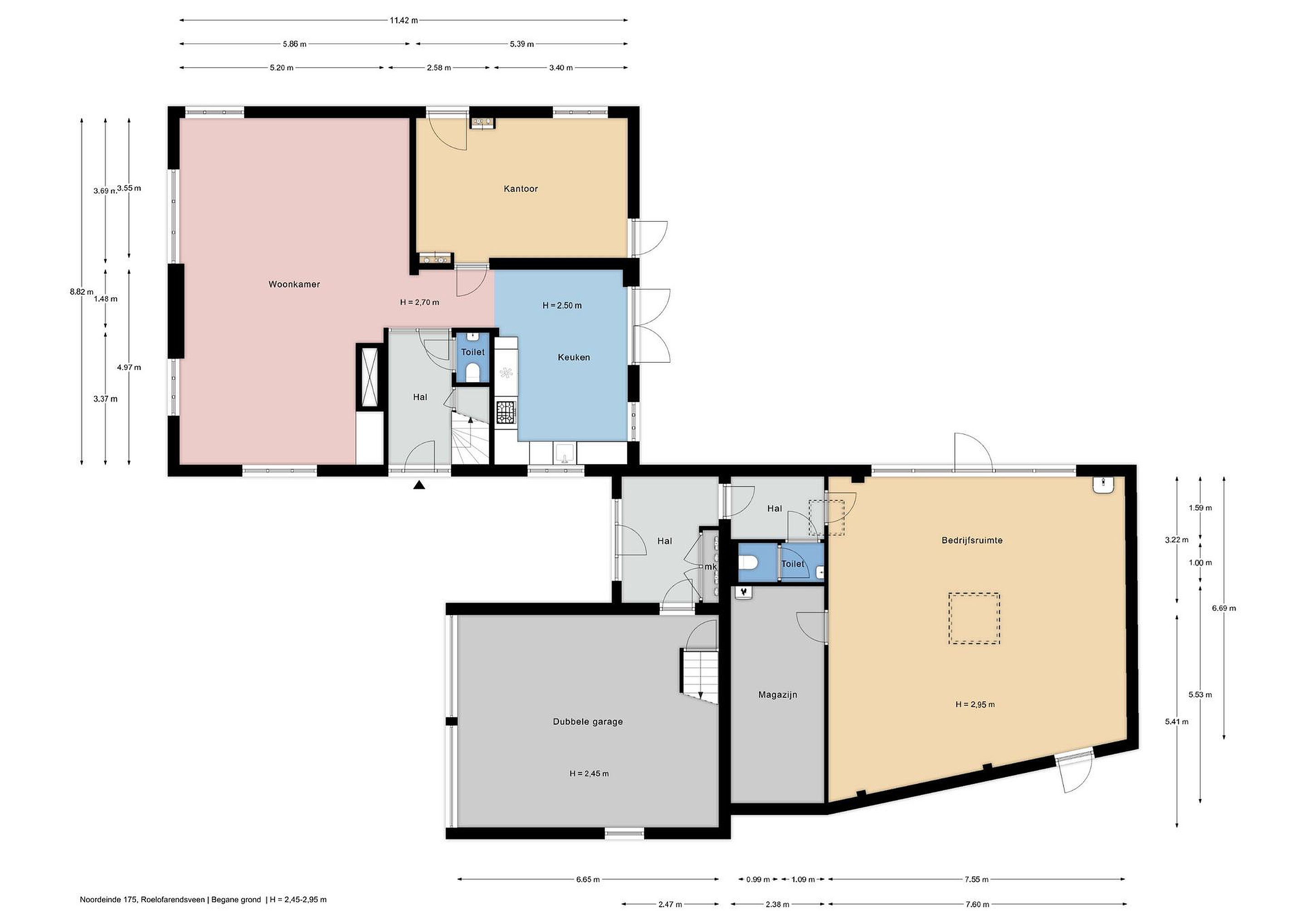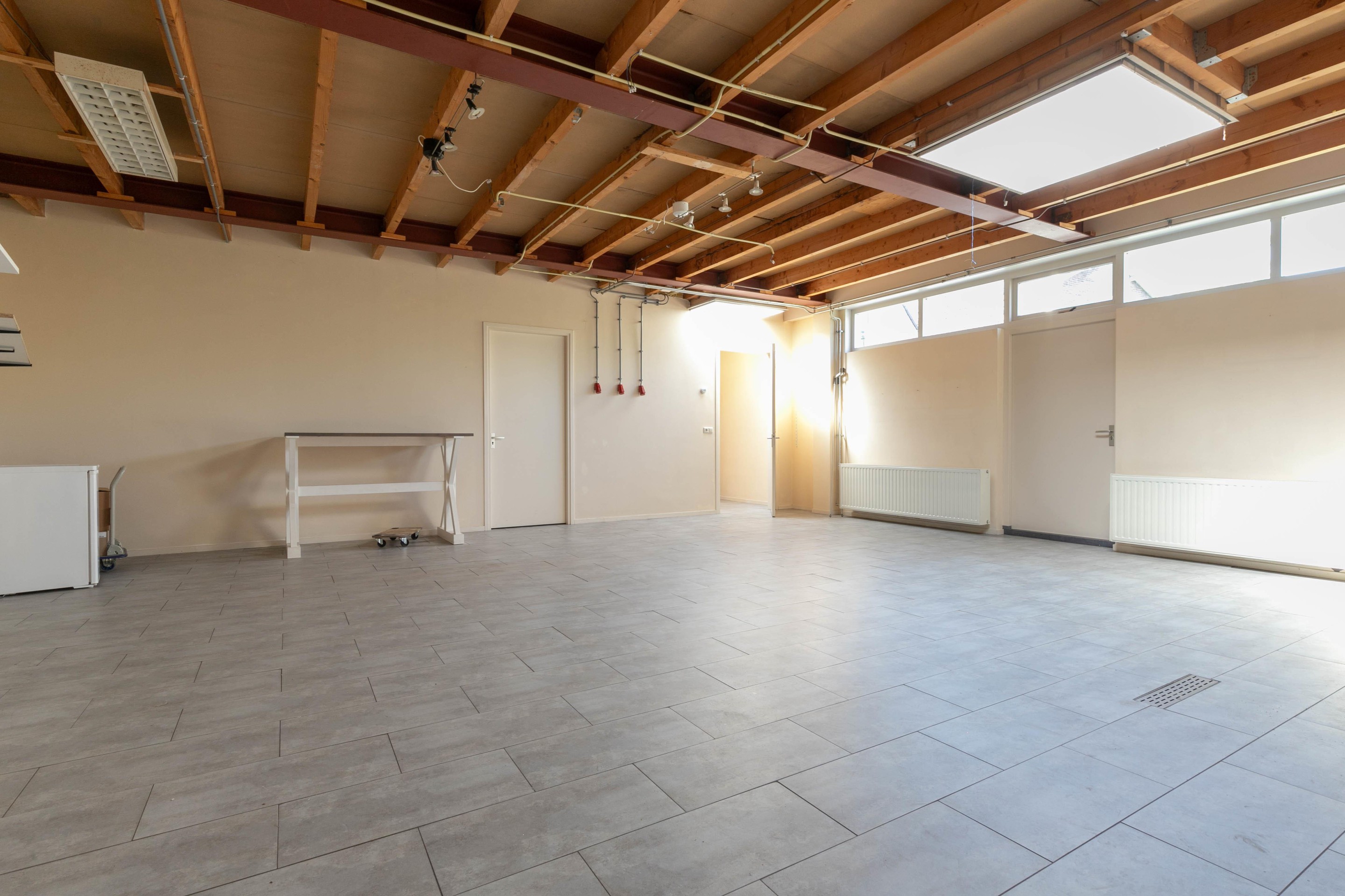 Het grote bijgebouw heeft een eigen entree aan de voorzijde en bestaat op de begane grond uit een hal met een uitgebreide meterkast en een moderne toiletruimte met vrijhangend toilet en fonteintje. Daarnaast biedt het toegang tot de bedrijfs-/praktijkruimte met magazijn en de dubbele garage aan de voorzijde. Het bijgebouw biedt een scala aan mogelijkheden voor een kantoor, praktijk of bedrijf aan huis en is tevens uitermate geschikt als extra woonruimte voor kinderen en/of ouders.