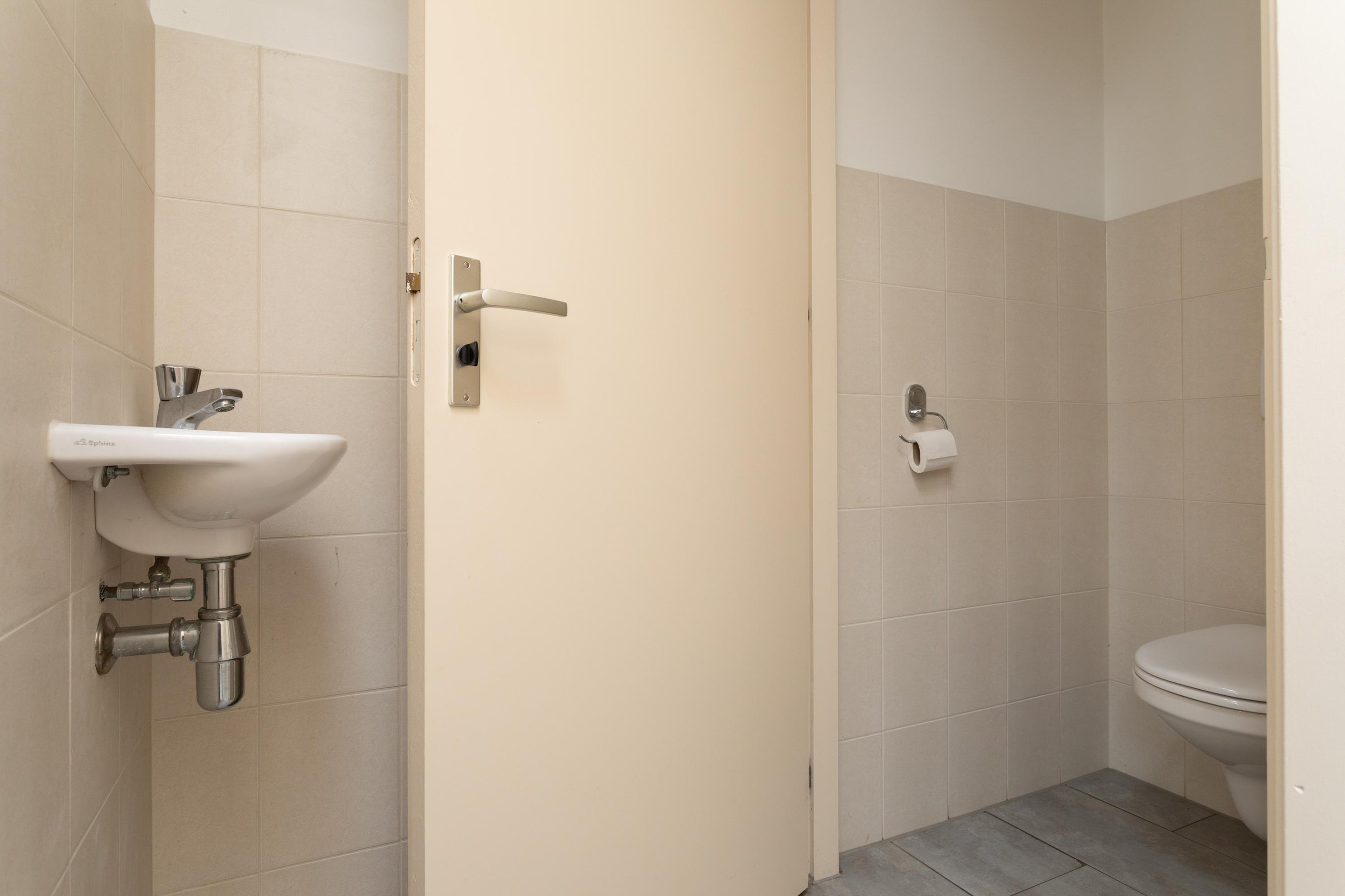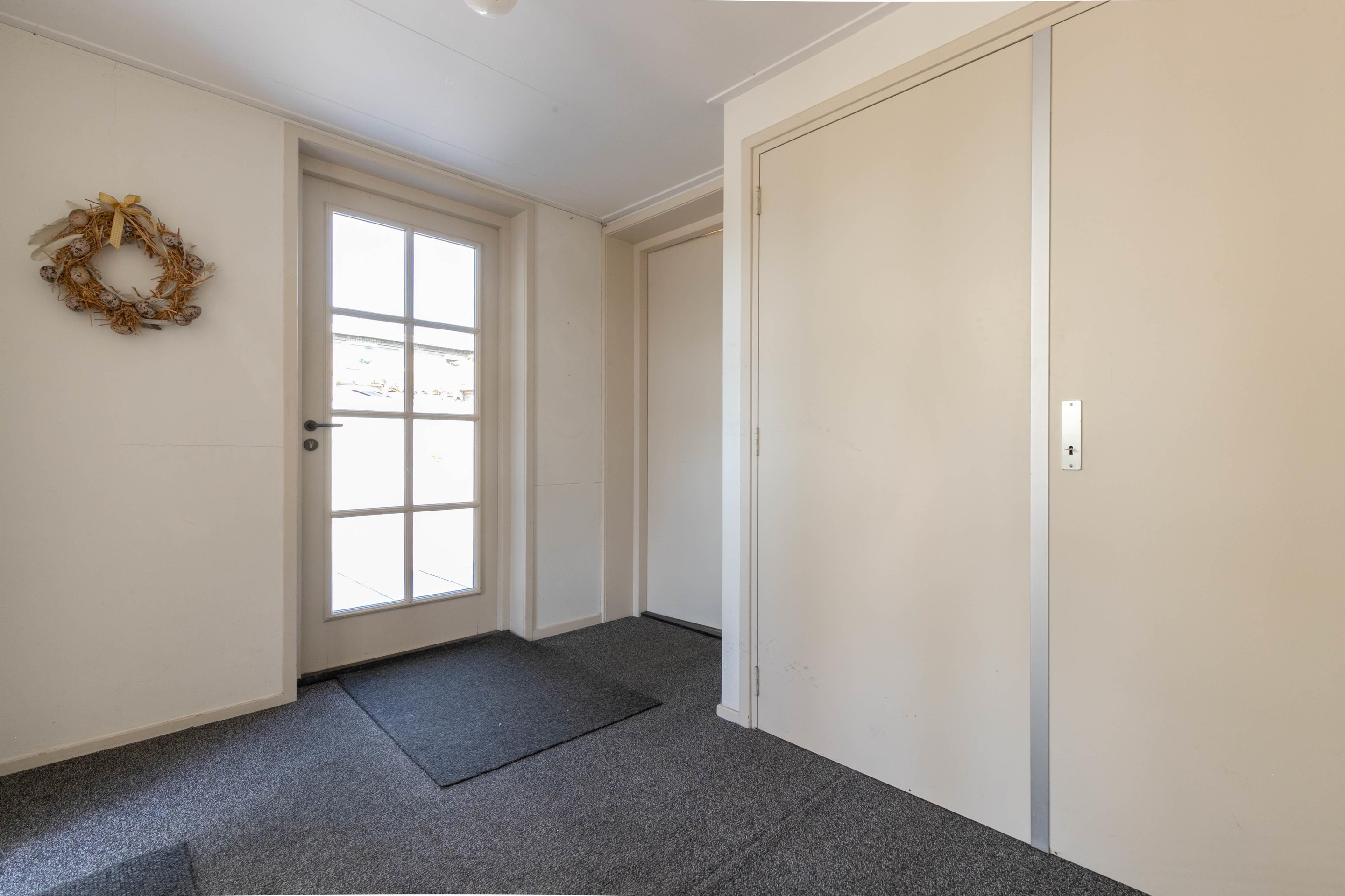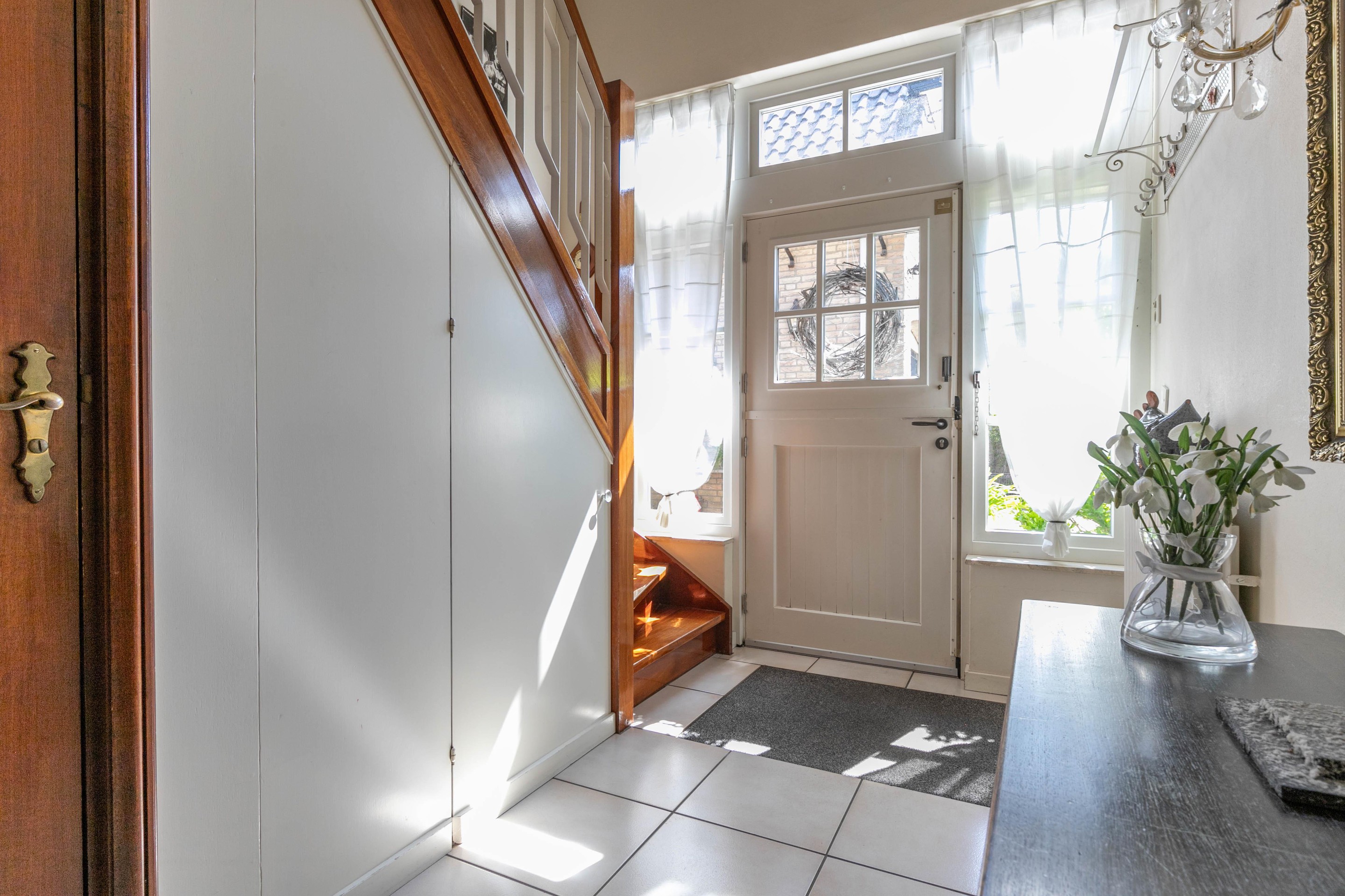 De voortuin is voorzien van sierbestrating en plantenborders. Via de overdekte entree is er toegang tot de hal met garderobe, vide en een toiletruimte met toilet en fonteintje.