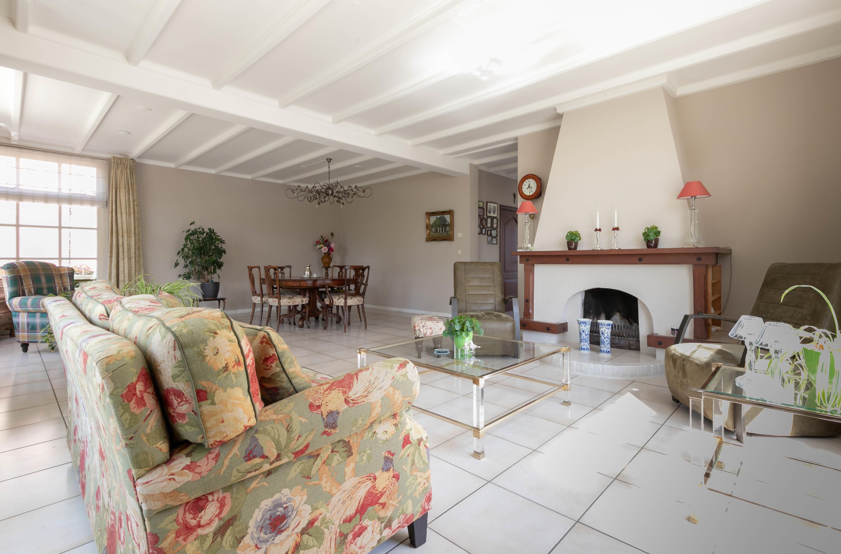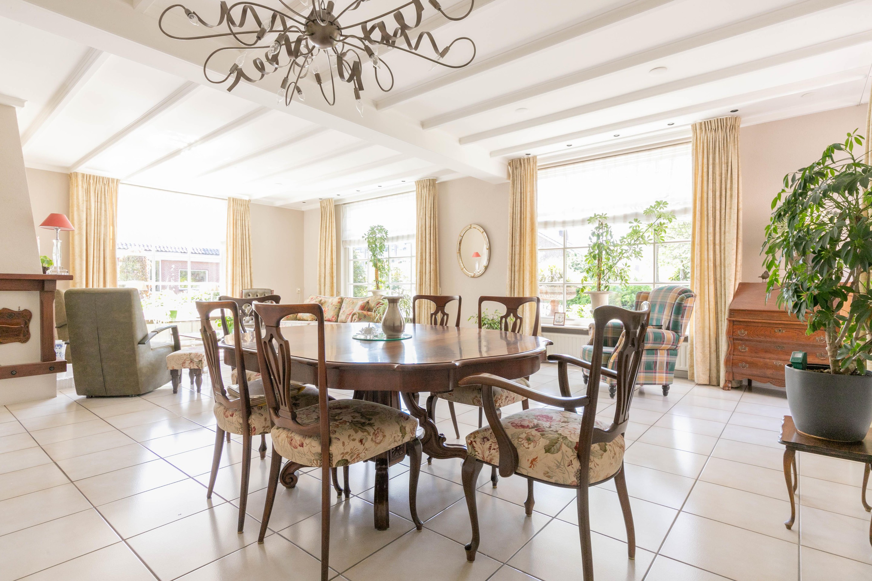 De ruime woonkamer is aan de voorzijde gelegen en heeft een fijne woonsfeer, mede dankzij de sfeervolle open haard. De grote raampartijen zorgen voor veel natuurlijk licht in de woning.