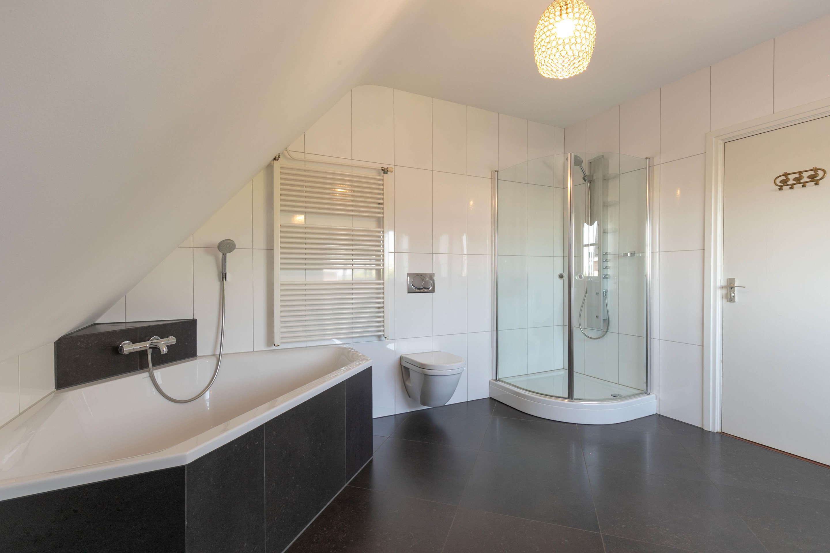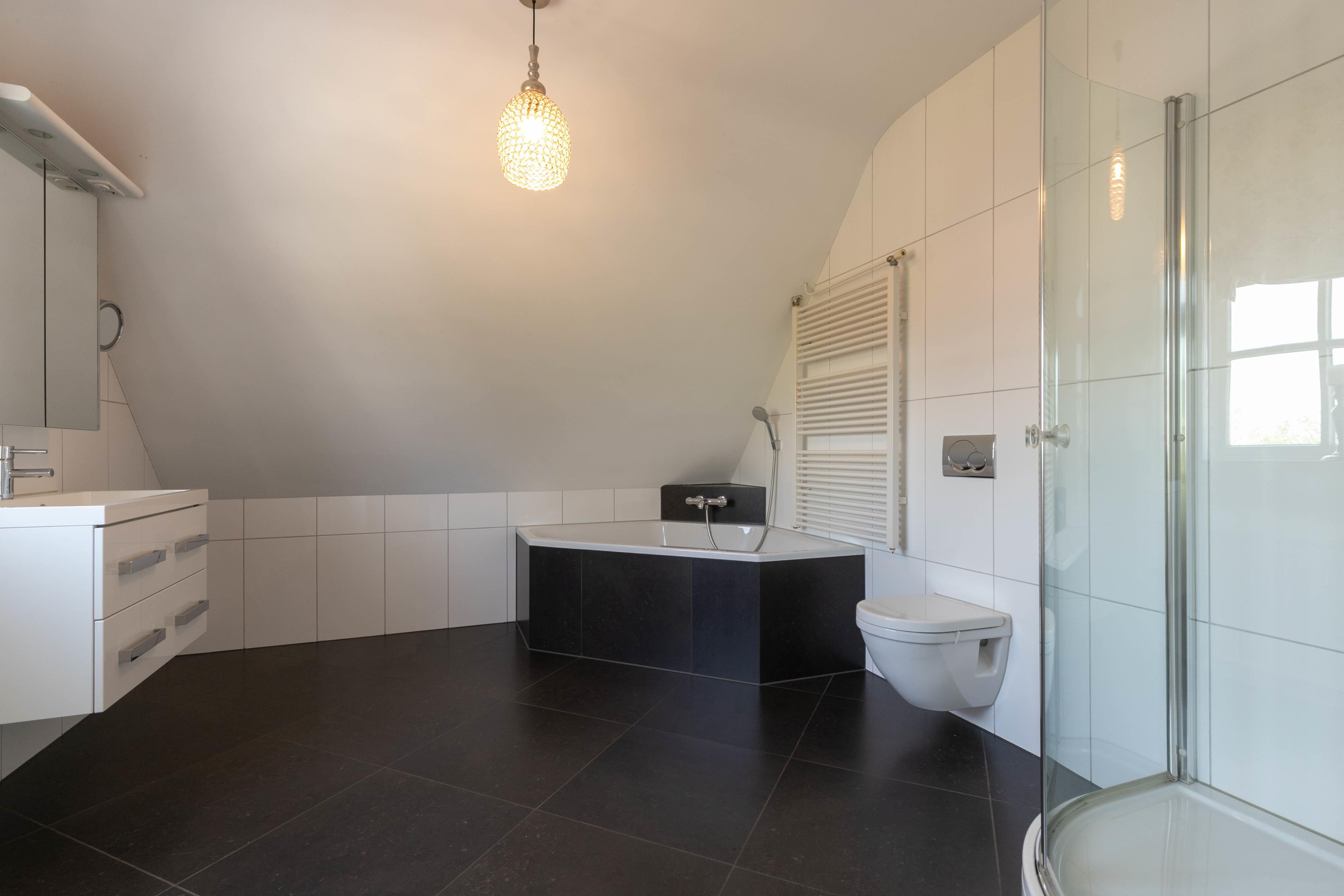De volledig betegelde, complete badkamer is voorzien van een vrijhangend toilet, een ligbad, een designradiator, een hoekdouche met douchecabine, een wastafel in een badkamermeubel en aansluitingen voor zowel de wasmachine als de droger.