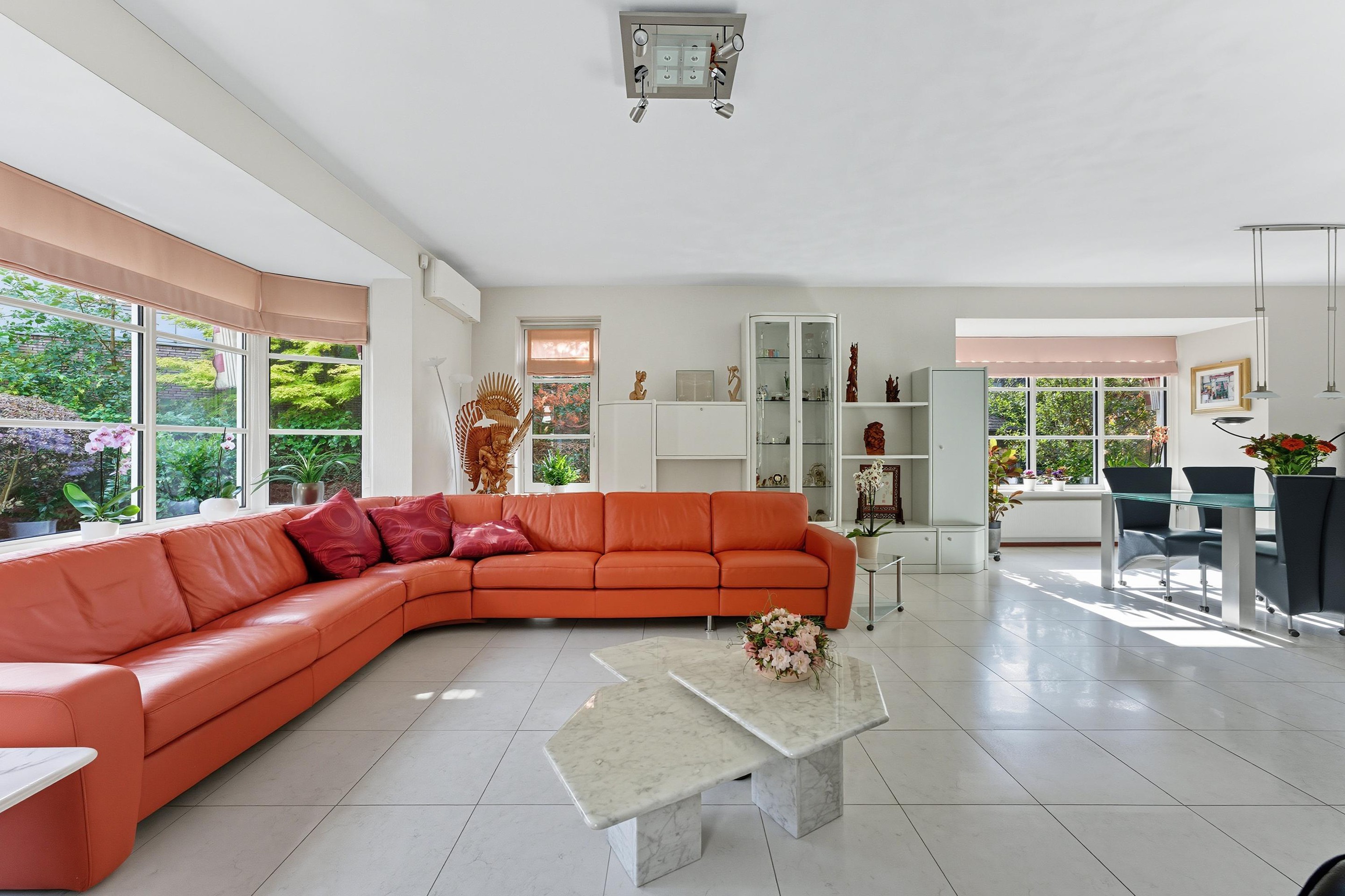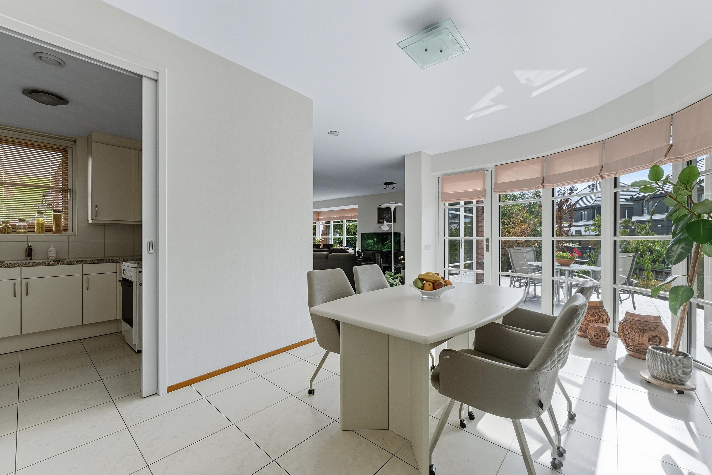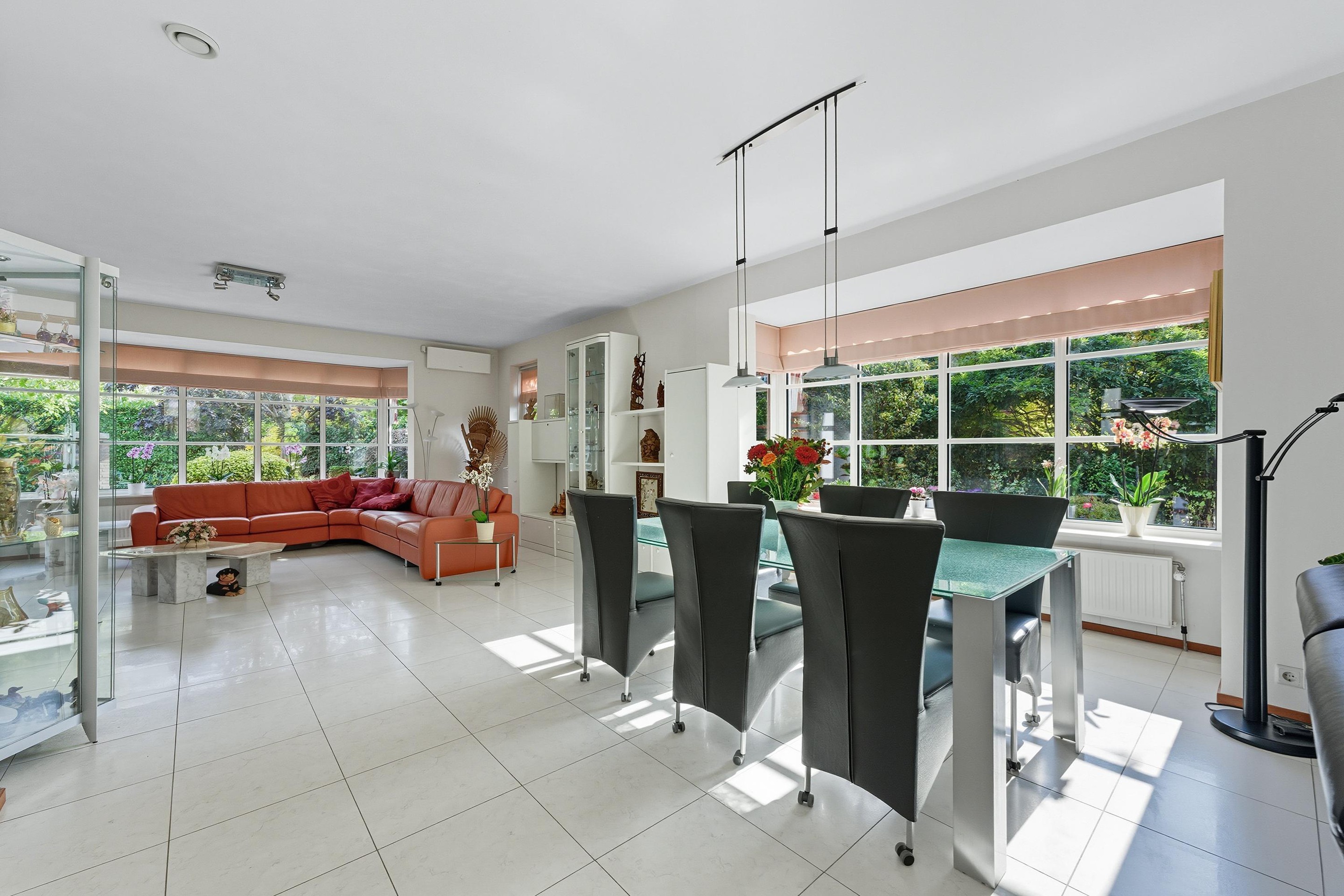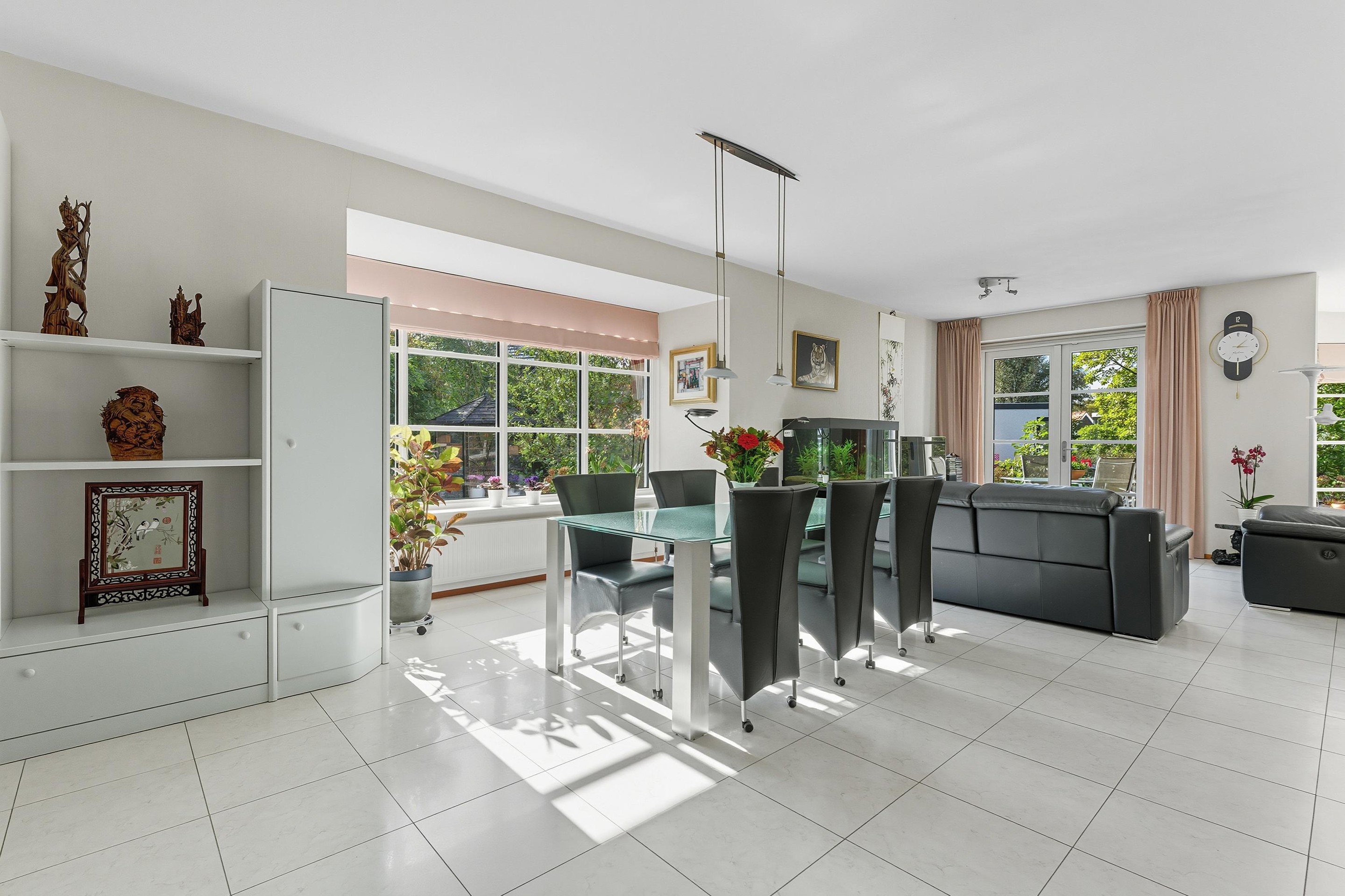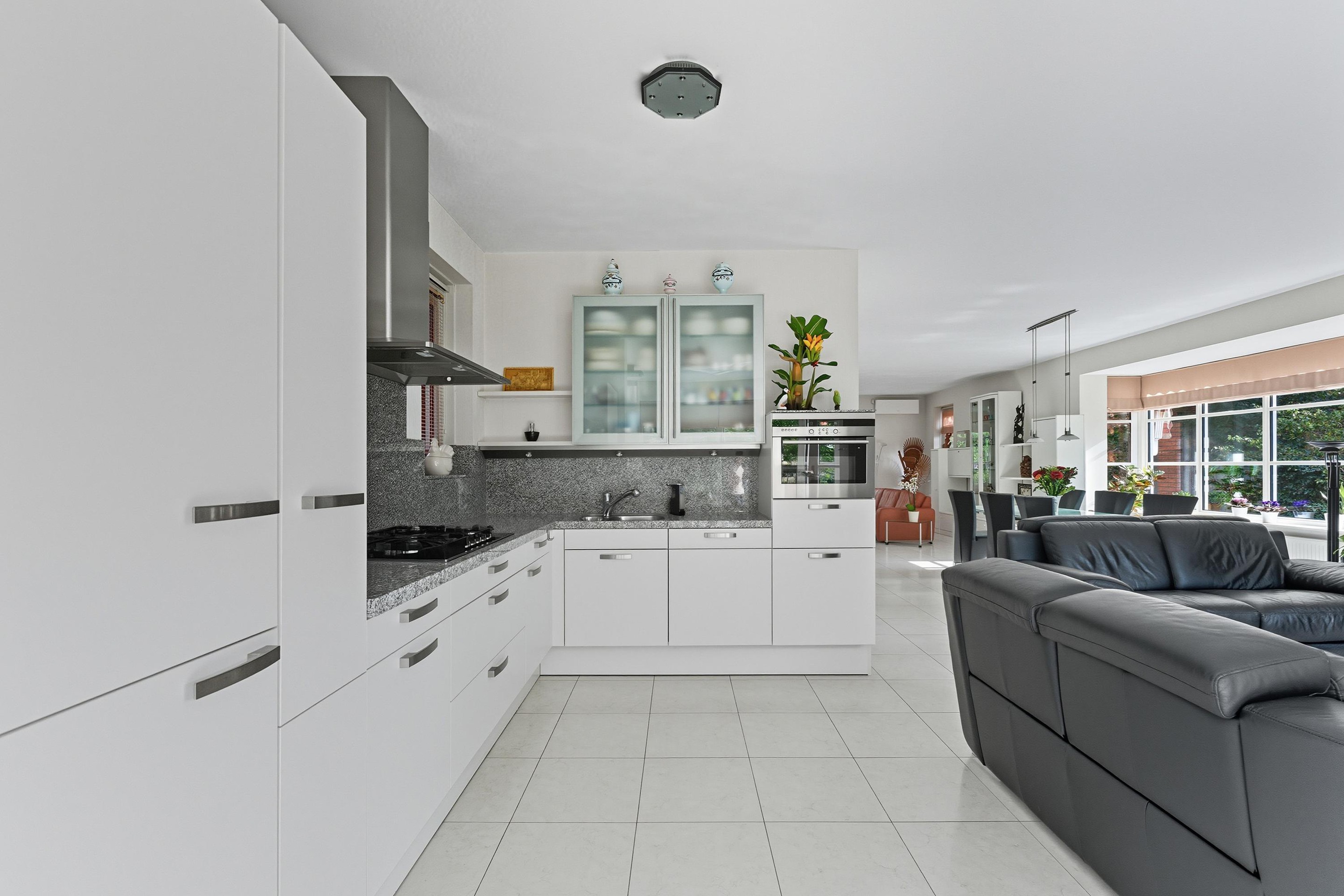 De royale woonkamer is een heerlijke, lichte leefruimte met een sfeervolle erker en grote raampartijen rondom. Vanuit elke hoek kijk je uit over groen en water, wat zorgt voor een rustgevende sfeer. De vloer is voorzien van lichte vloertegels met vloerverwarming en de afwerking is tot in de puntjes verzorgd. Er zijn openslaande deuren wat een fijne verbinding geeft met de tuin.