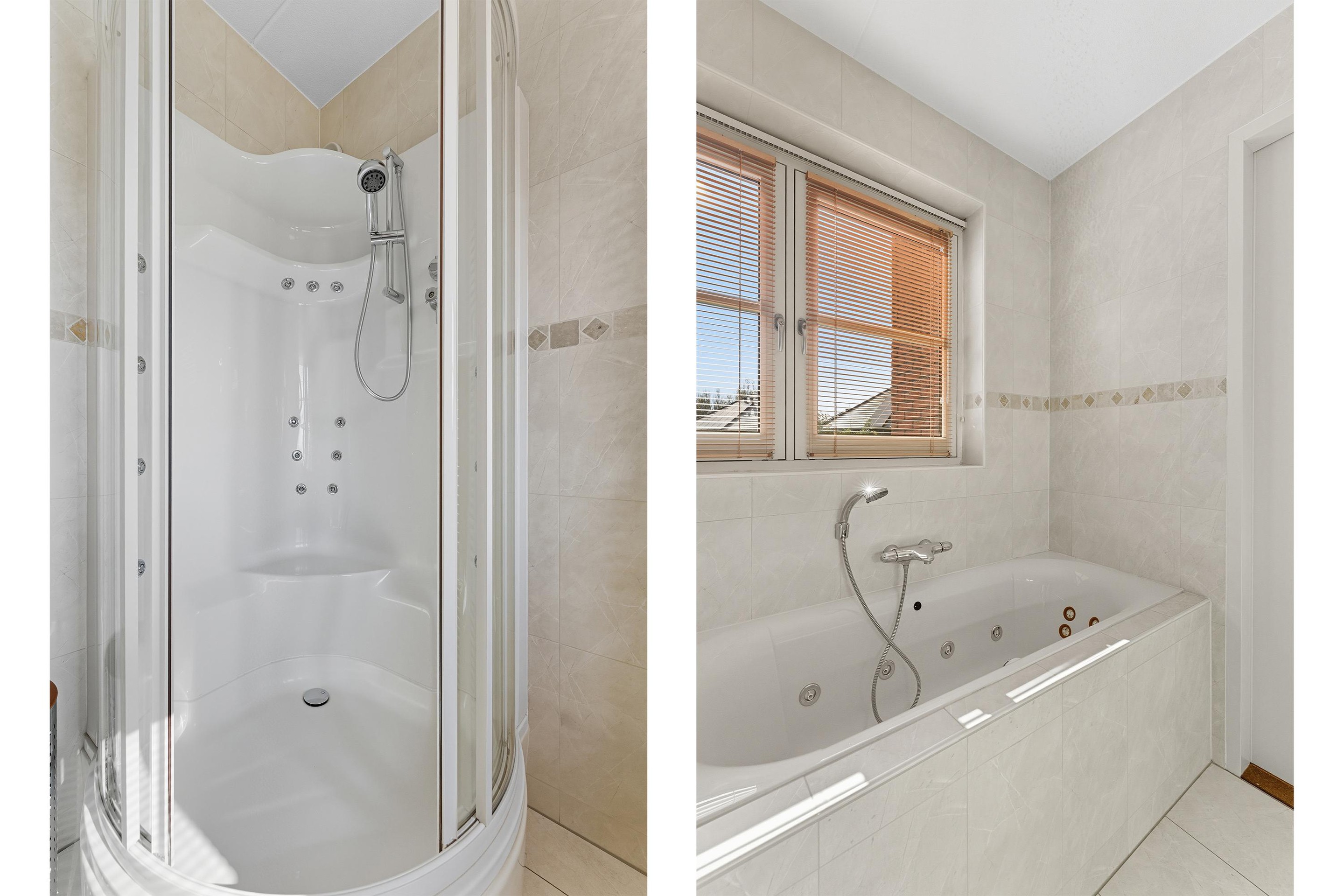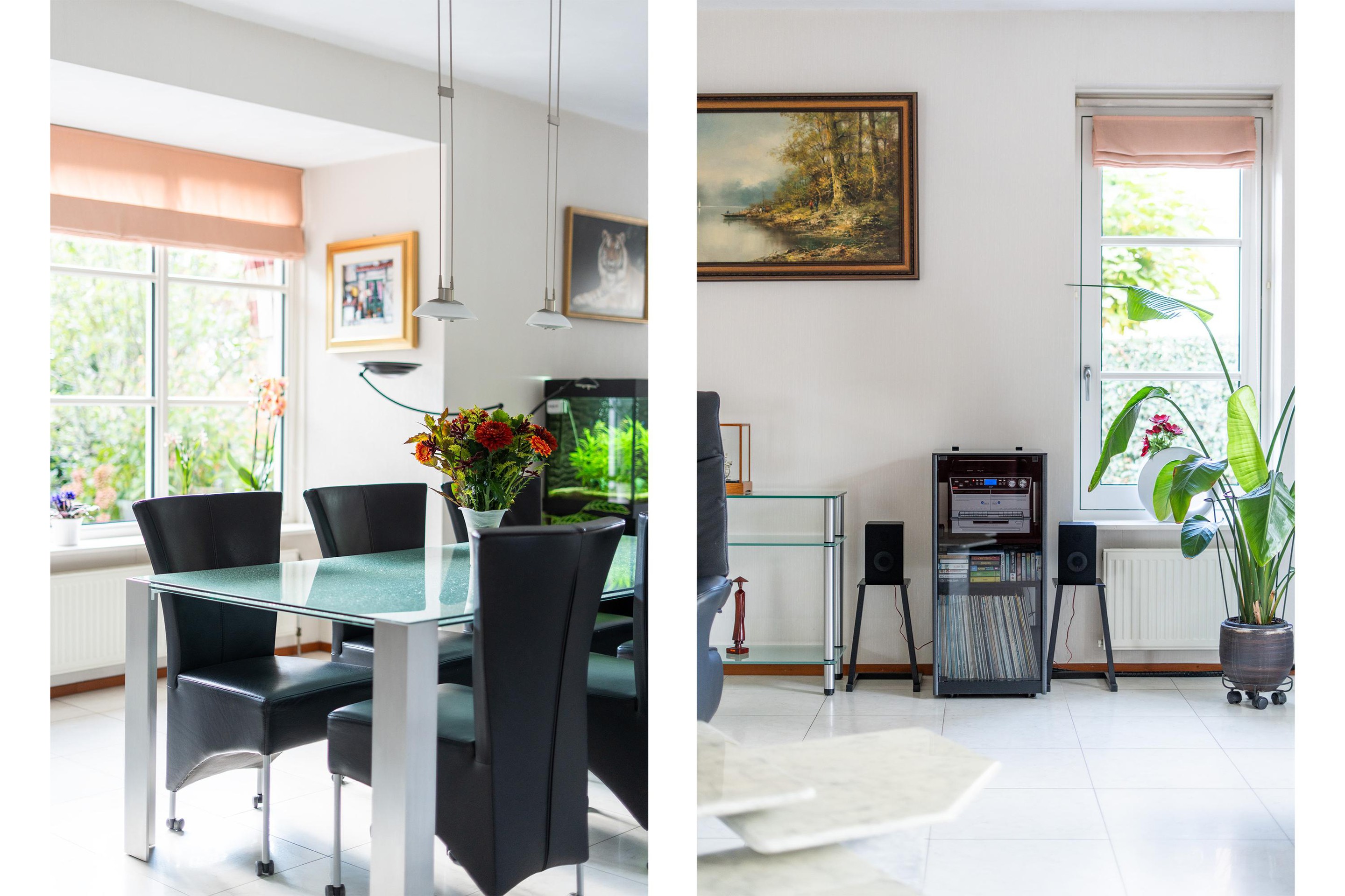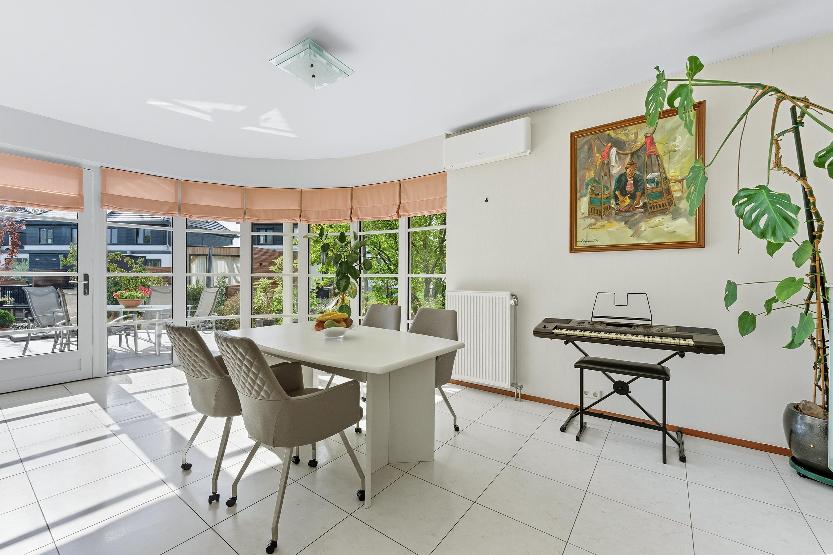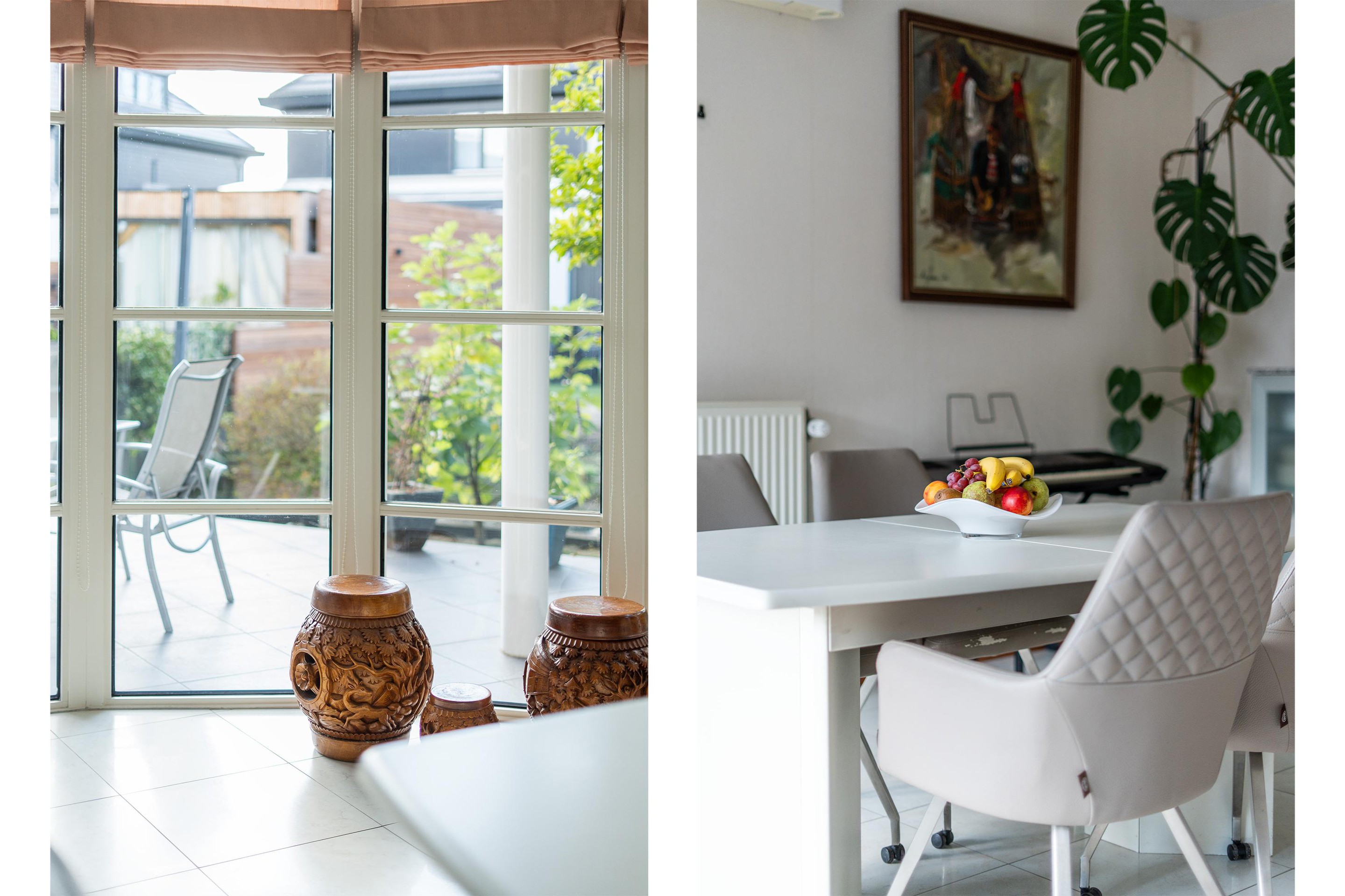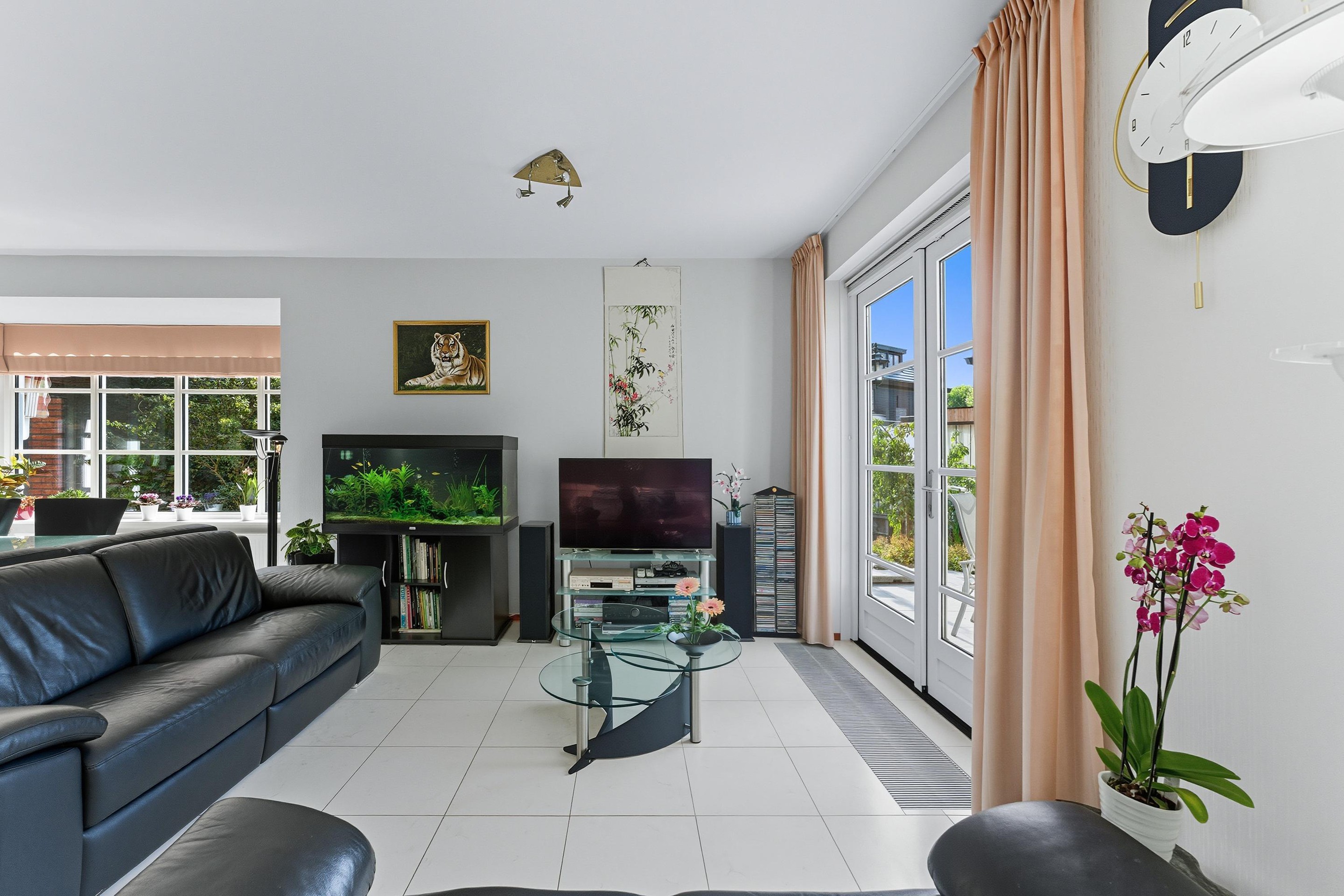 De royale woonkamer is een heerlijke, lichte leefruimte met een sfeervolle erker en grote raampartijen rondom. Vanuit elke hoek kijk je uit over groen en water, wat zorgt voor een rustgevende sfeer. De vloer is voorzien van lichte vloertegels met vloerverwarming en de afwerking is tot in de puntjes verzorgd. Er zijn openslaande deuren wat een fijne verbinding geeft met de tuin.