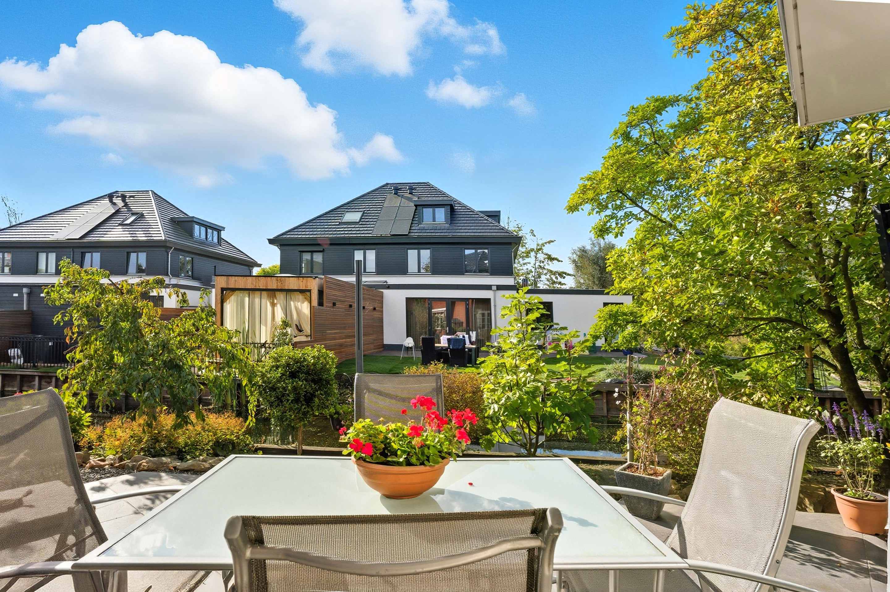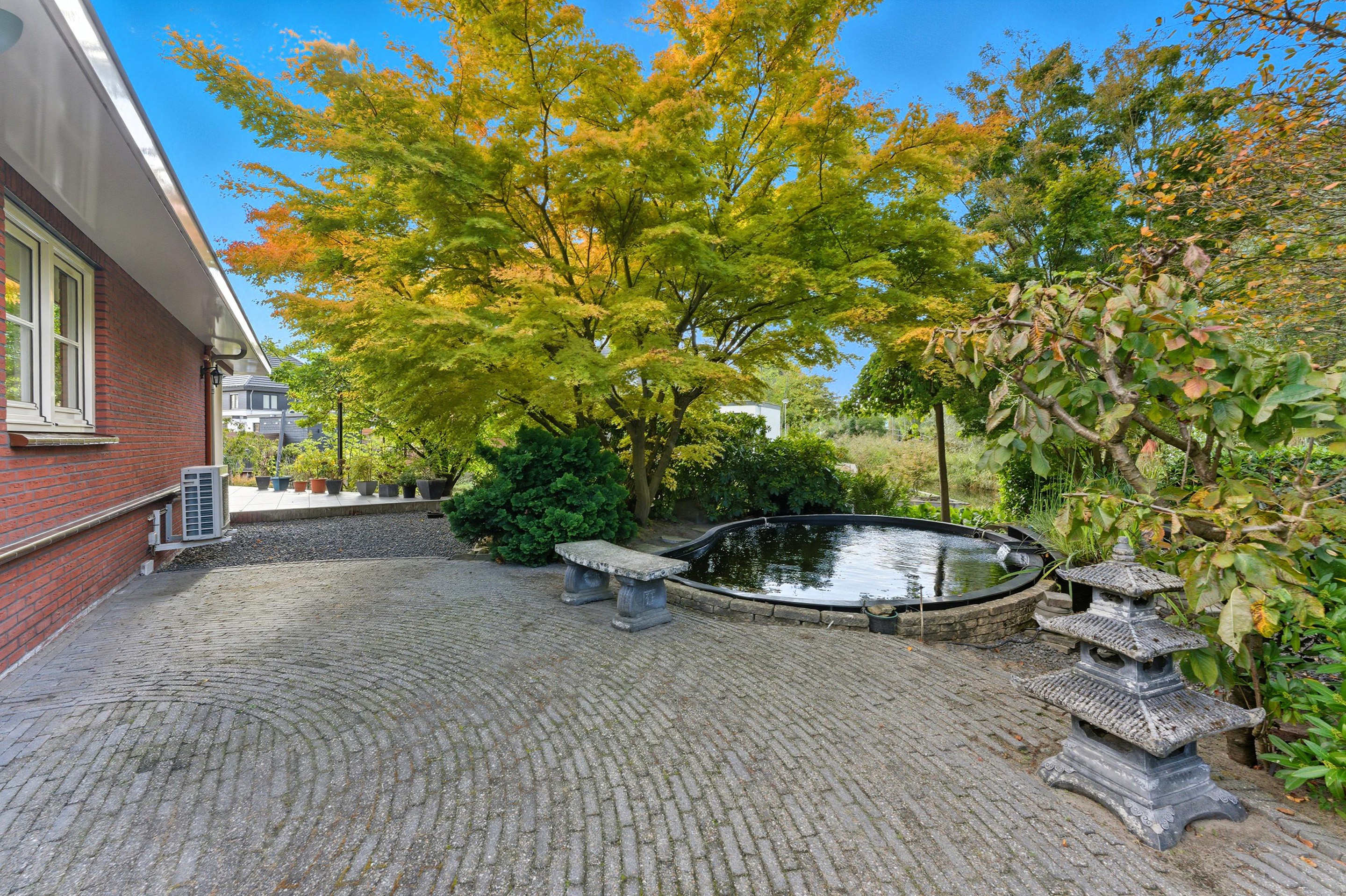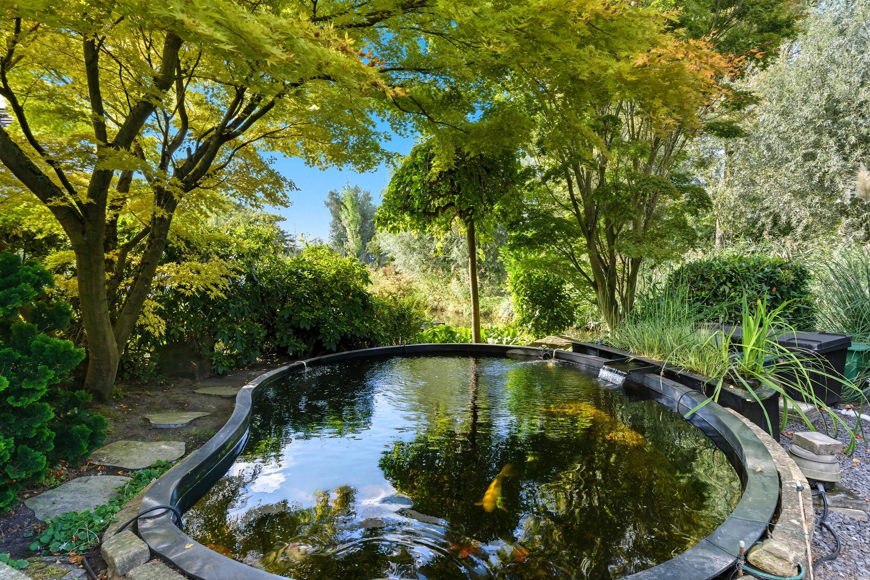 10. Grote, zonrijke tuin met veel privacy, een prachtige vijver en uitzicht op het water