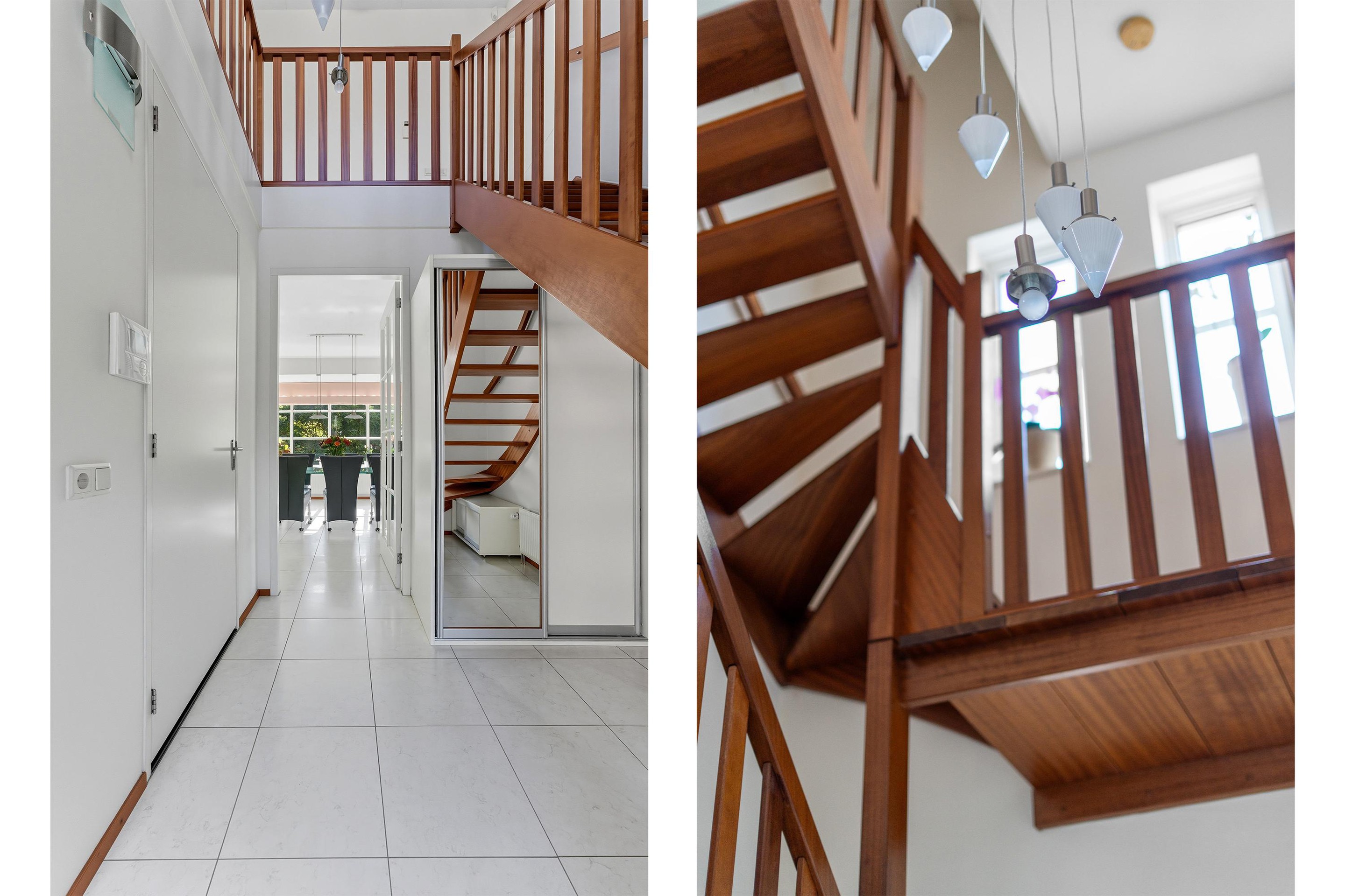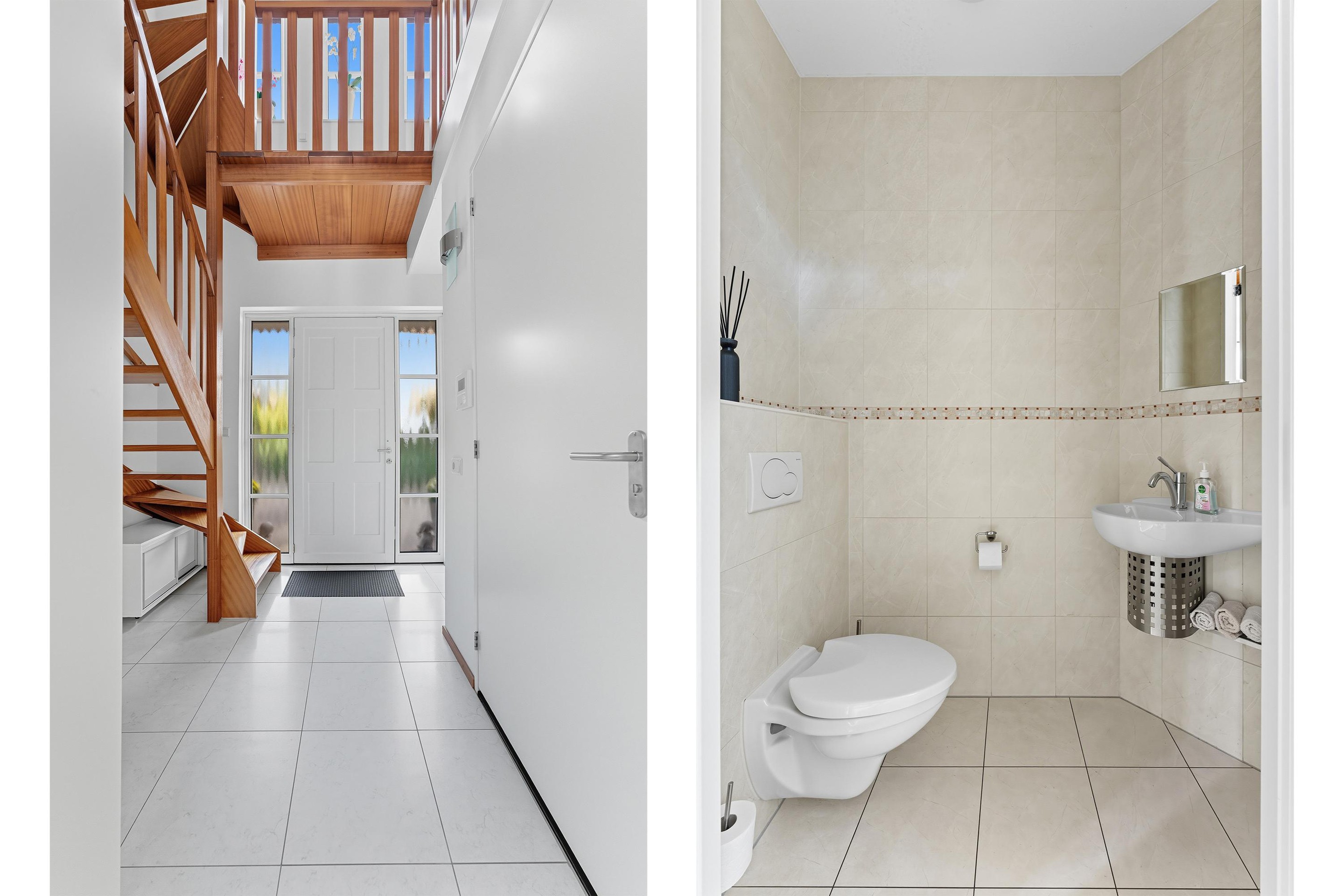 De elektrische poort opent zich en je rijdt de brede oprit op, een gevoel van thuiskomen in stijl. Binnenkomend in de ruime hal valt direct de lichtinval op, dankzij de hoge plafonds en grote ramen die deze woning doordrenken met zonlicht. In de hal is er een prachtige trap, het toilet, de meterkast en toegang tot de woonkamer.