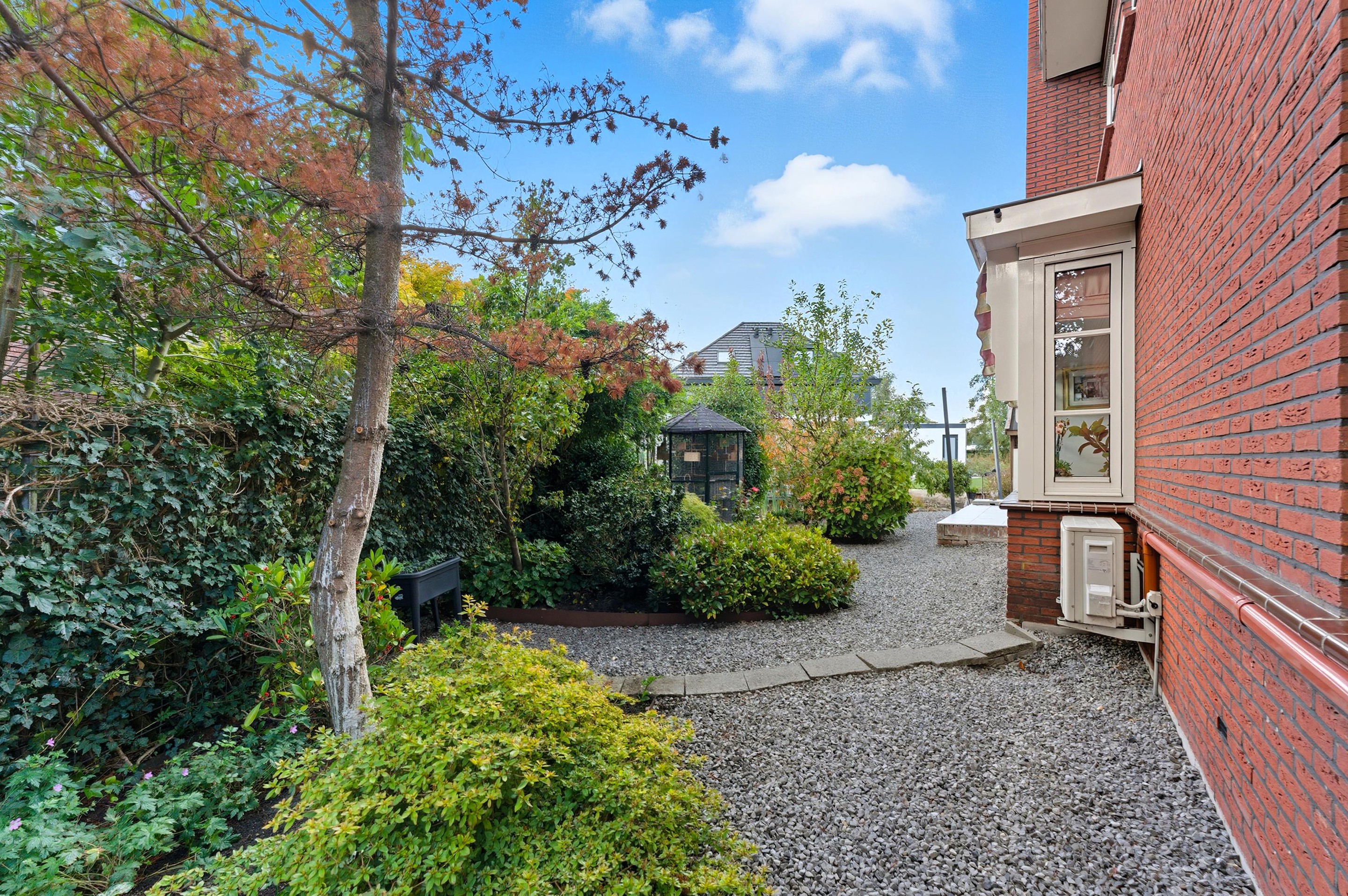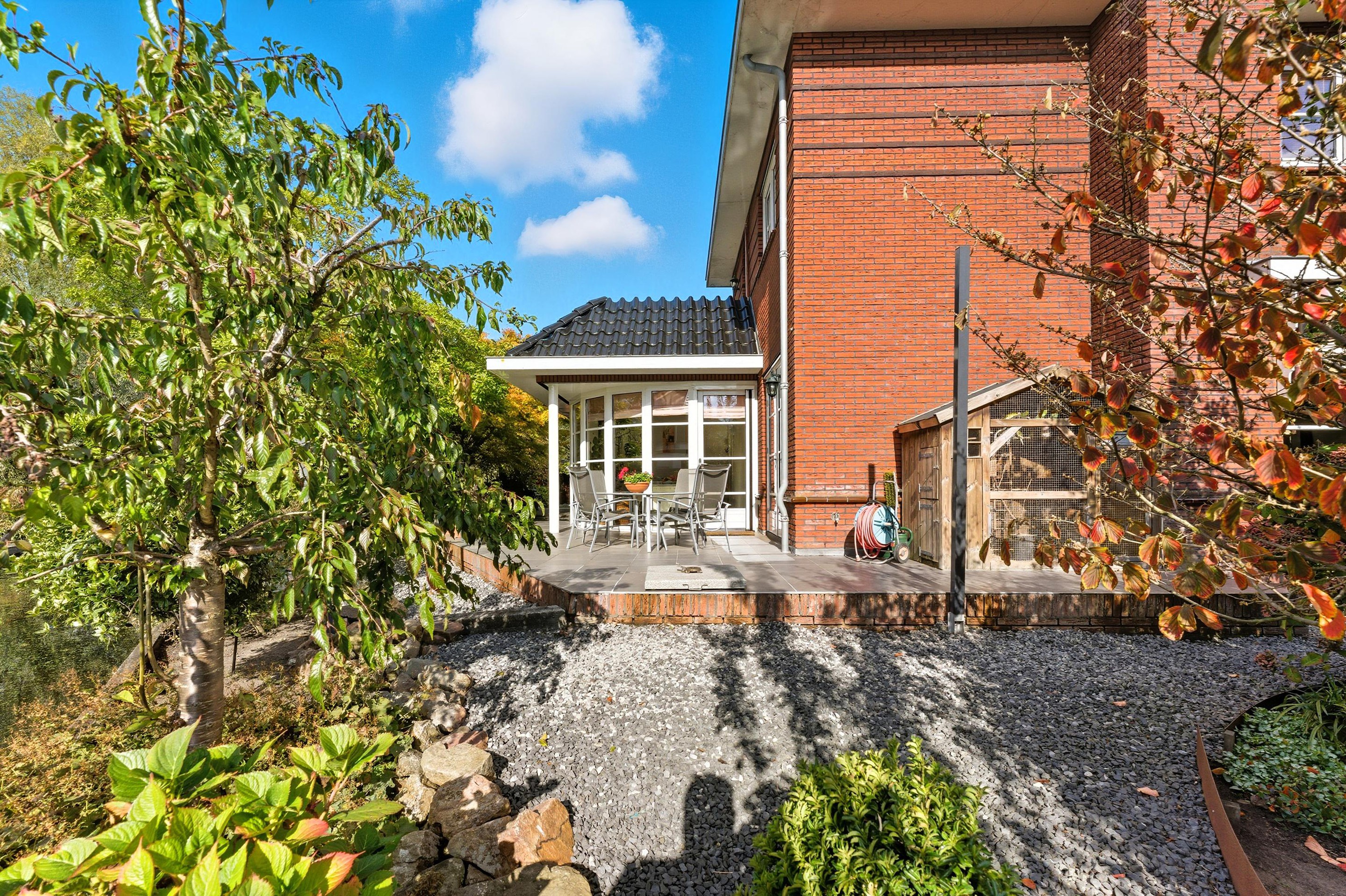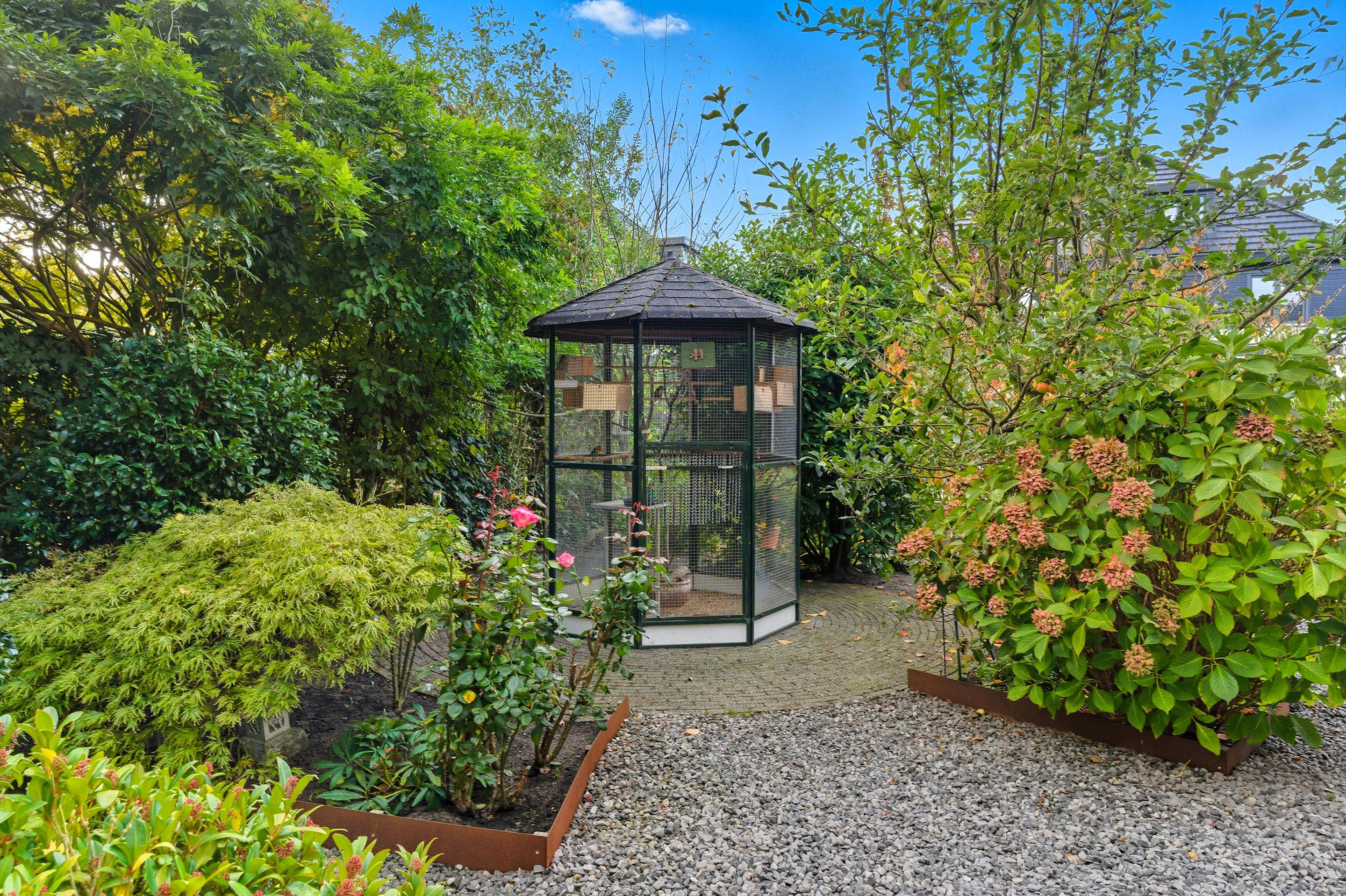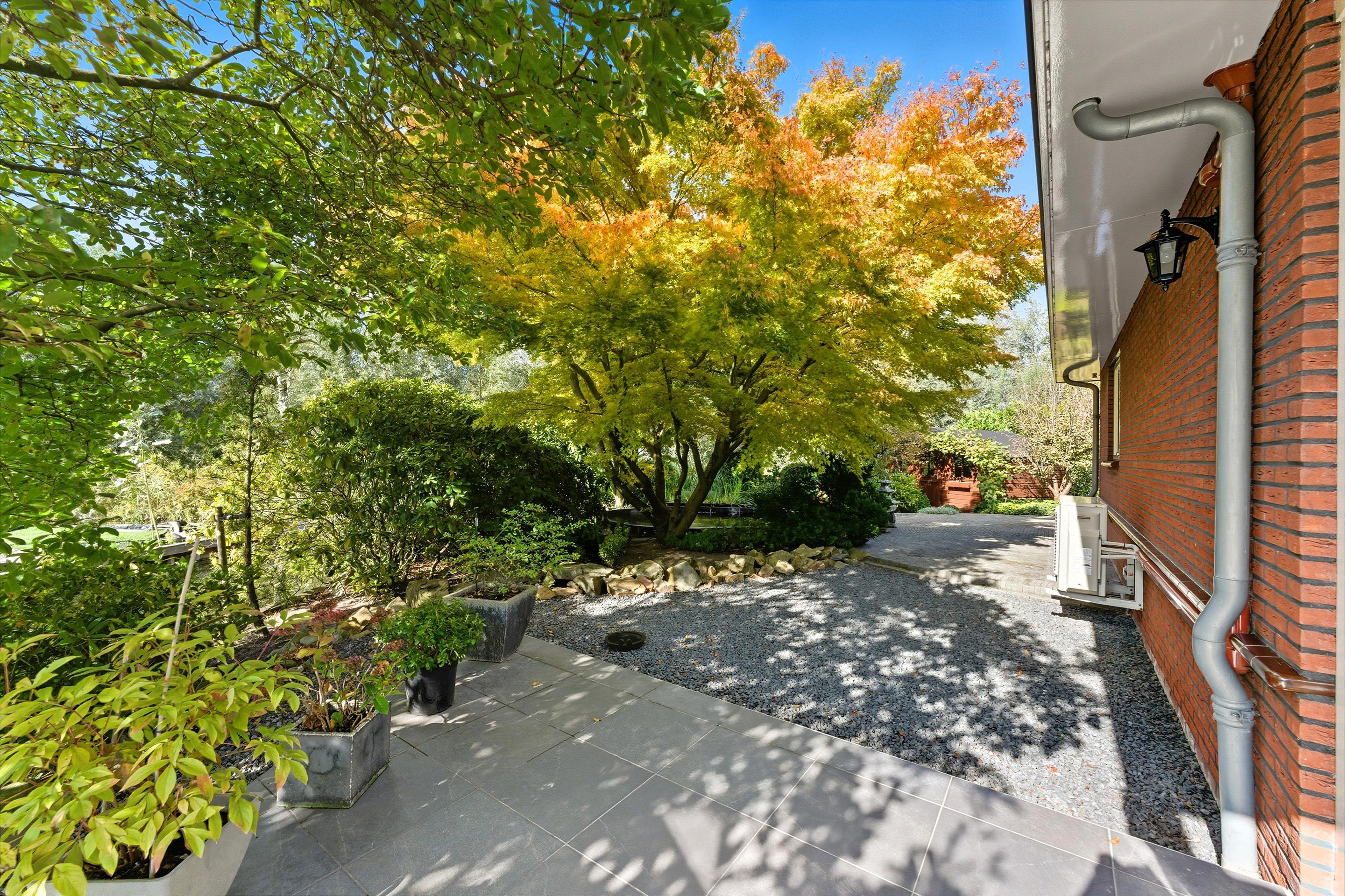De tuin is zonder twijfel één van de parels van deze villa. Zuidgericht, groen, verzorgd en met een directe ligging aan het water. Hier geniet je van de rust, het geluid van vogels en het kabbelende water, een plek waar elke dag als vakantie voelt. De tuin is speels en groen aangelegd met veel beplanting, meerdere parkeerplaatsen aan de voorzijde, een fijn terras en een prachtige vijver met kooikarpers. Een groot deel van de tuin is onderheid waardoor het niet zal verzakken. Tevens is er nog een vrijstaande houten berging.