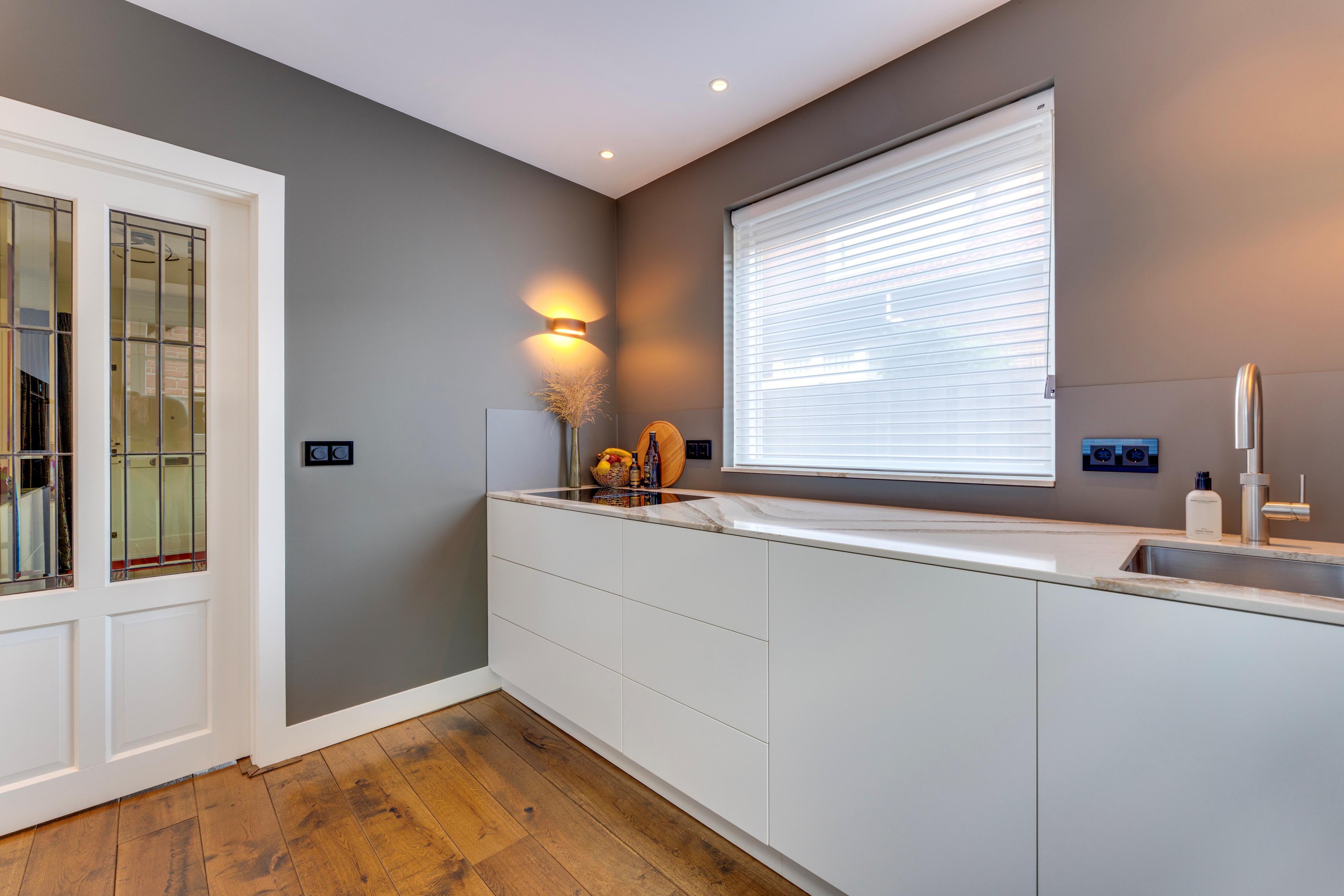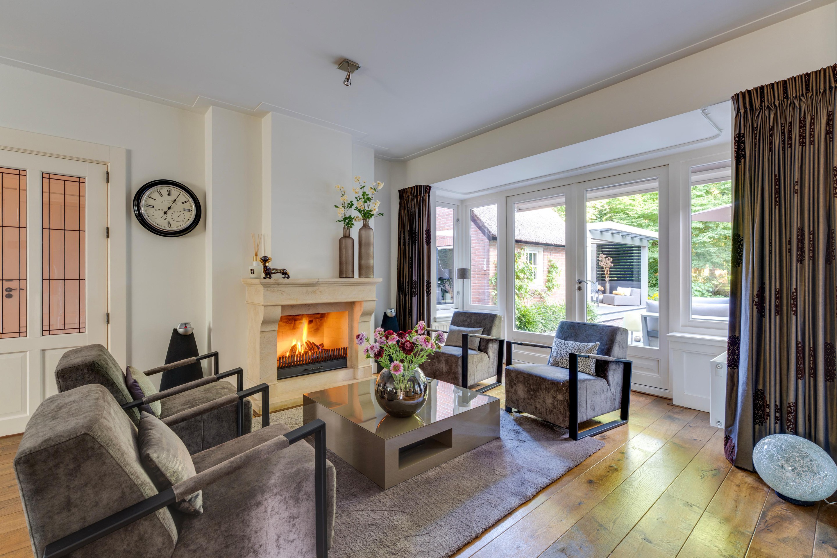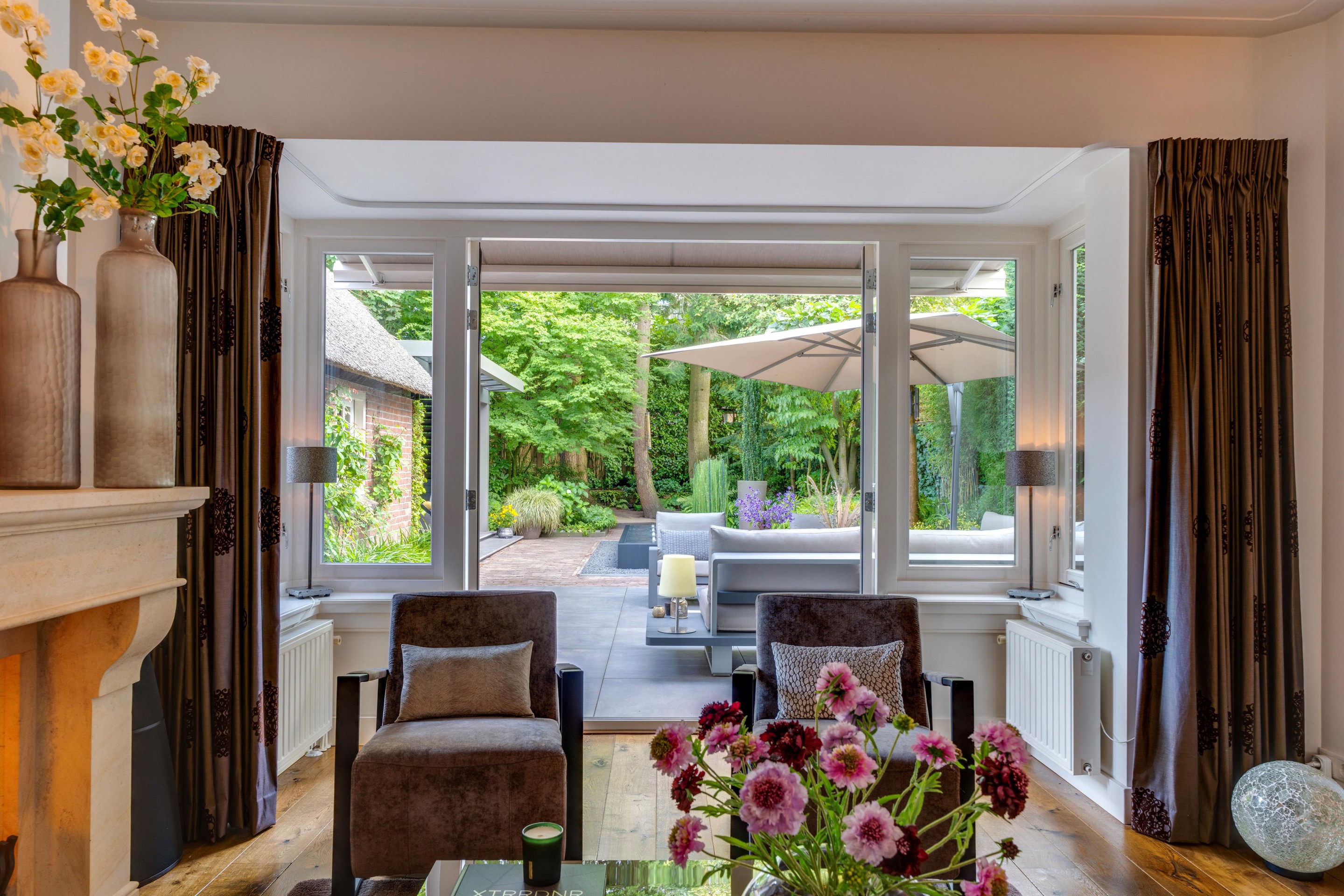 De woonkamer is een heerlijke leefruimte waar licht, rust en comfort samenkomen. De eikenhouten vloer loopt naadloos door en verbindt de zithoek, eethoek en keuken tot één geheel. In de erker aan de voorzijde staat de bank; hier kun je ontspannen, tv kijken of genieten van het uitzicht op de voortuin. Langs de zijwand zorgt een stijlvolle gashaard voor extra warmte en sfeer. Verder naar achteren is er volop ruimte voor een grote eettafel – perfect voor gezellige diners of lange avonden met vrienden. De grote ramen en openslaande deuren aan de achterzijde laten het daglicht rijkelijk binnen en zorgen voor een directe verbinding met de tuin. De keuken is in 2022 volledig vernieuwd en combineert strak design met hoogwaardige kwaliteit. Het geheel is modern, licht en tot in detail doordacht, met greeploze kasten en een stijlvol werkblad dat perfect aansluit op de rest van het interieur. Koken doe je hier op topniveau met apparatuur van het Zwitserse merk V-ZUG – een naam die staat voor innovatie en precisie, vergelijkbaar met Gaggenau en de meest exclusieve lijnen van Miele. Blikvangers zijn de multifunctionele oven en de stoomoven uit de V6000 Excellence Line serie. Daarnaast beschik je over een inductiekookplaat met geïntegreerde afzuiging van V-ZUG, een V-ZUG vaatwasser, een Quooker en een ruime koelkast met BioFresh laden van Liebherr. Via de charmante boerendeur stap je zo het terras op, en samen met het grote raam zorgt dit voor een aangename lichtinval. In de kelder vind je bovendien een aparte vriezer – ideaal voor extra voorraad.