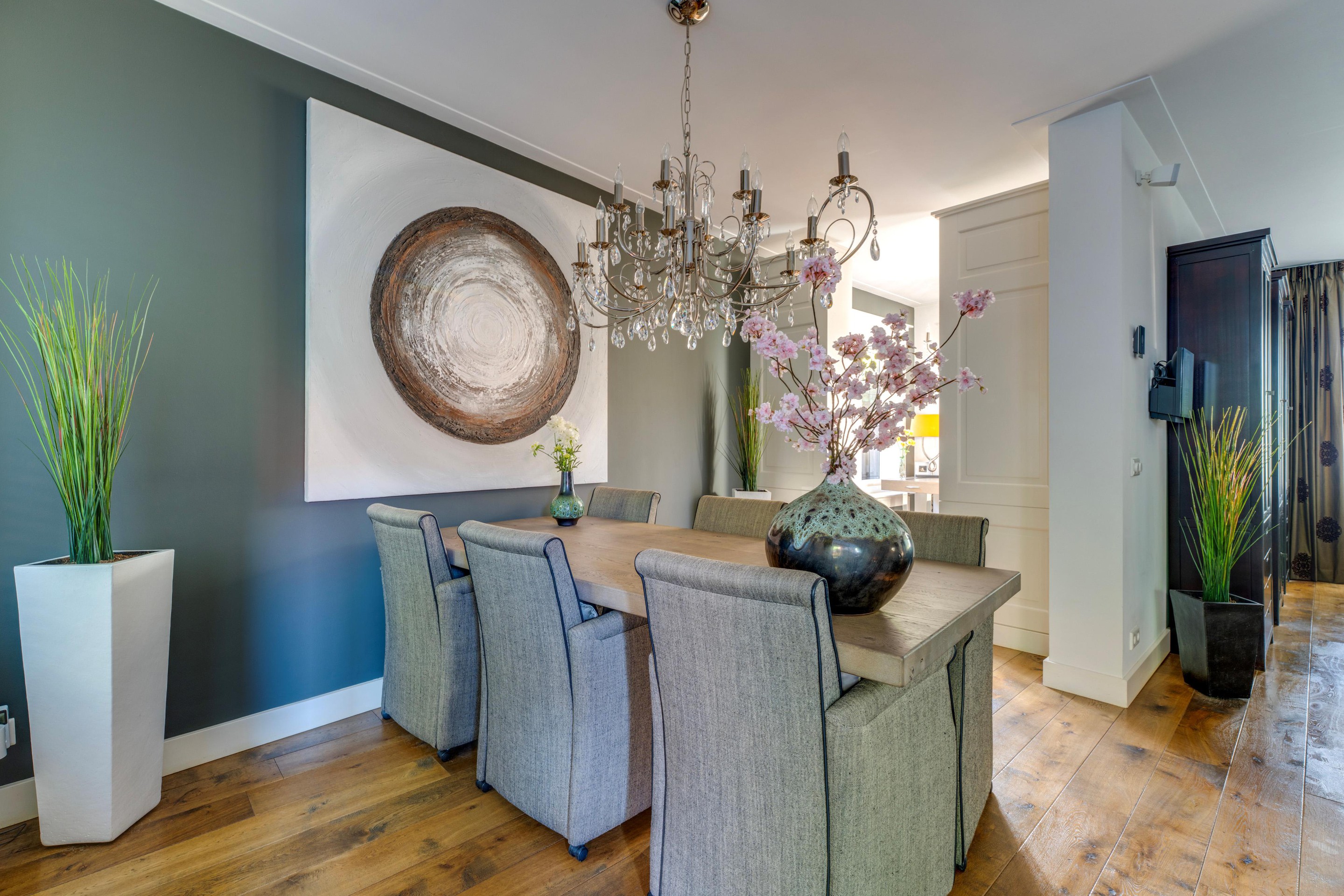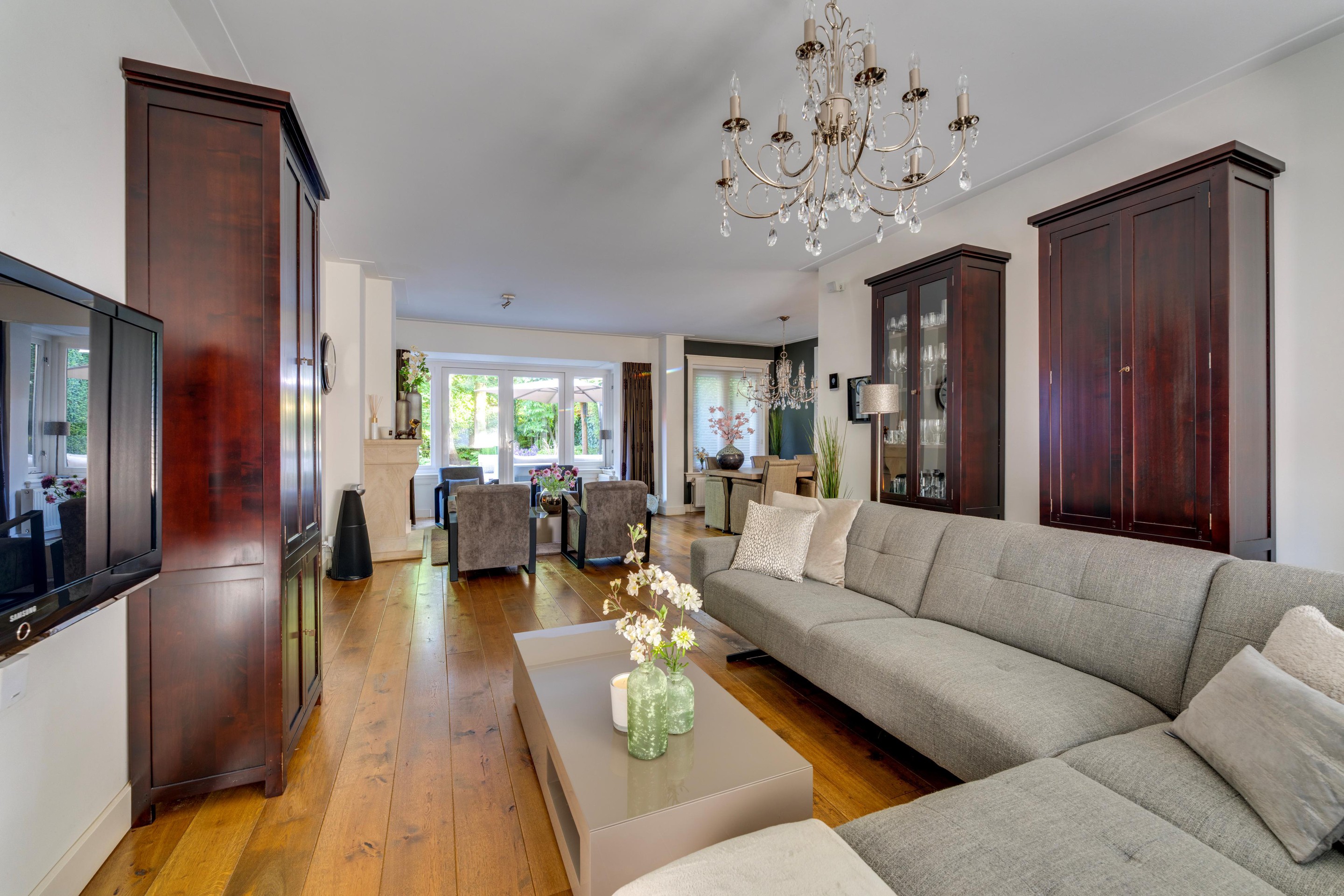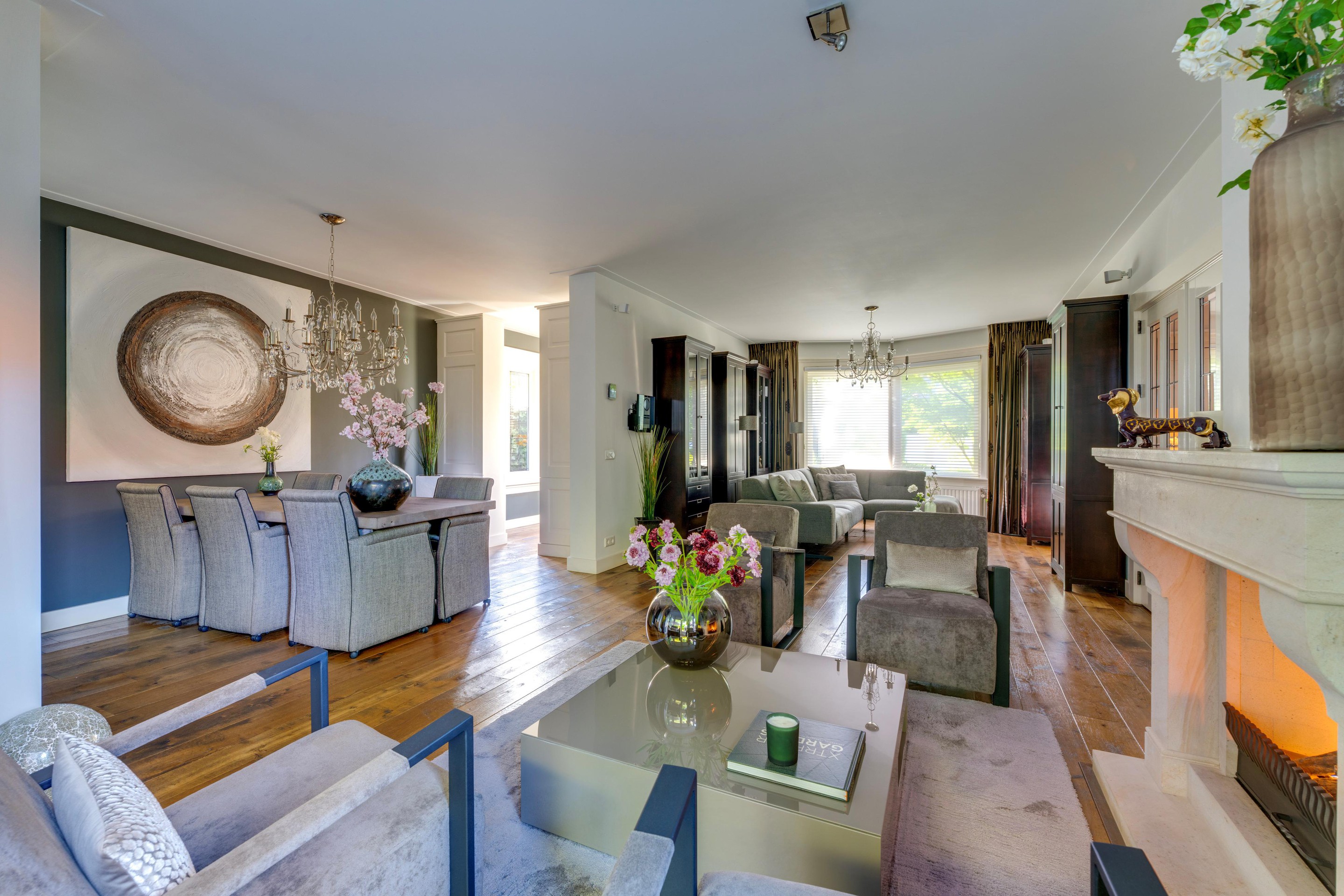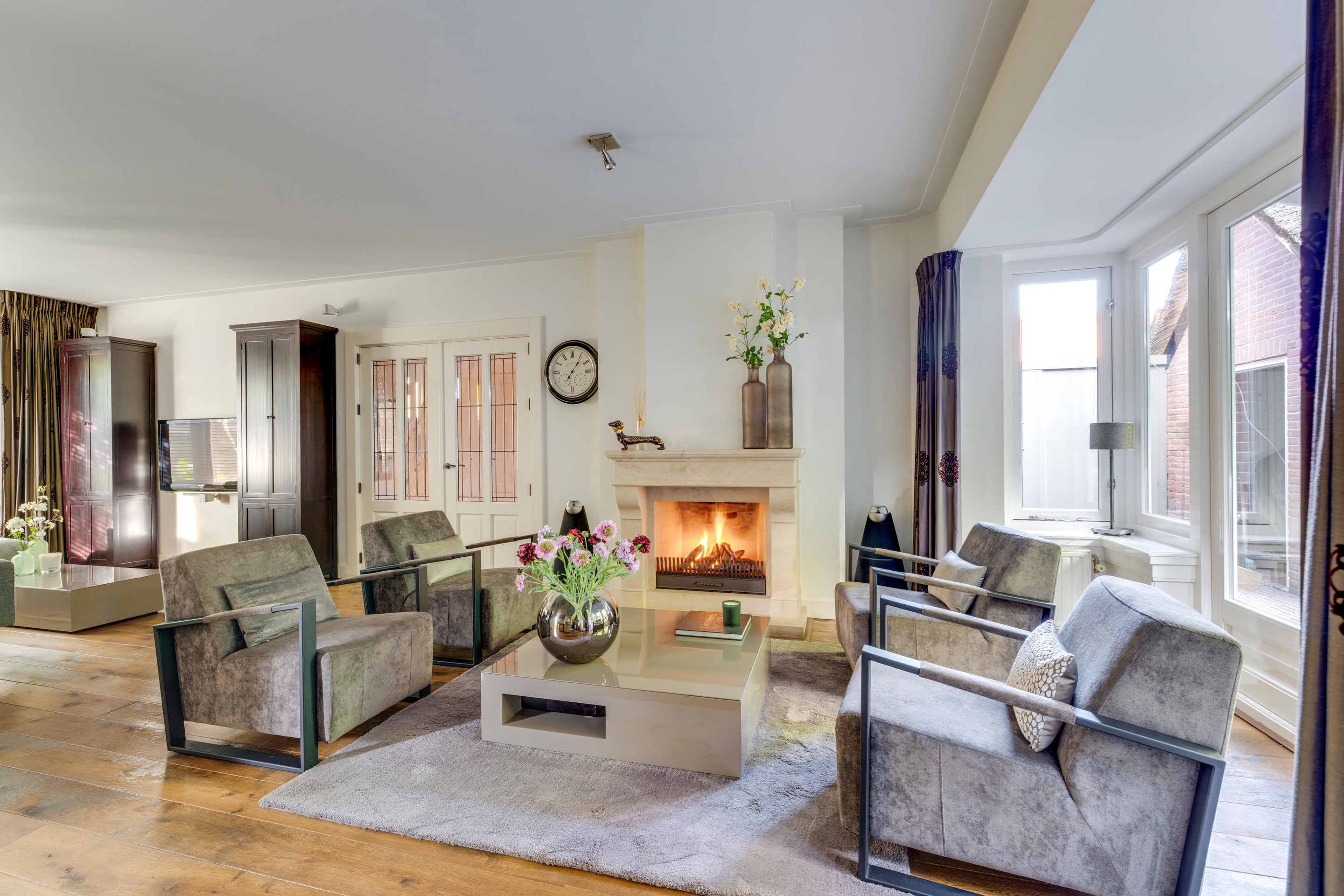 De woonkamer is een heerlijke leefruimte waar licht, rust en comfort samenkomen. De eikenhouten vloer loopt naadloos door en verbindt de zithoek, eethoek en keuken tot één geheel. In de erker aan de voorzijde staat de bank; hier kun je ontspannen, tv kijken of genieten van het uitzicht op de voortuin. Langs de zijwand zorgt een stijlvolle gashaard voor extra warmte en sfeer. Verder naar achteren is er volop ruimte voor een grote eettafel – perfect voor gezellige diners of lange avonden met vrienden. De grote ramen en openslaande deuren aan de achterzijde laten het daglicht rijkelijk binnen en zorgen voor een directe verbinding met de tuin. De keuken is in 2022 volledig vernieuwd en combineert strak design met hoogwaardige kwaliteit. Het geheel is modern, licht en tot in detail doordacht, met greeploze kasten en een stijlvol werkblad dat perfect aansluit op de rest van het interieur. Koken doe je hier op topniveau met apparatuur van het Zwitserse merk V-ZUG – een naam die staat voor innovatie en precisie, vergelijkbaar met Gaggenau en de meest exclusieve lijnen van Miele. Blikvangers zijn de multifunctionele oven en de stoomoven uit de V6000 Excellence Line serie. Daarnaast beschik je over een inductiekookplaat met geïntegreerde afzuiging van V-ZUG, een V-ZUG vaatwasser, een Quooker en een ruime koelkast met BioFresh laden van Liebherr. Via de charmante boerendeur stap je zo het terras op, en samen met het grote raam zorgt dit voor een aangename lichtinval. In de kelder vind je bovendien een aparte vriezer – ideaal voor extra voorraad.