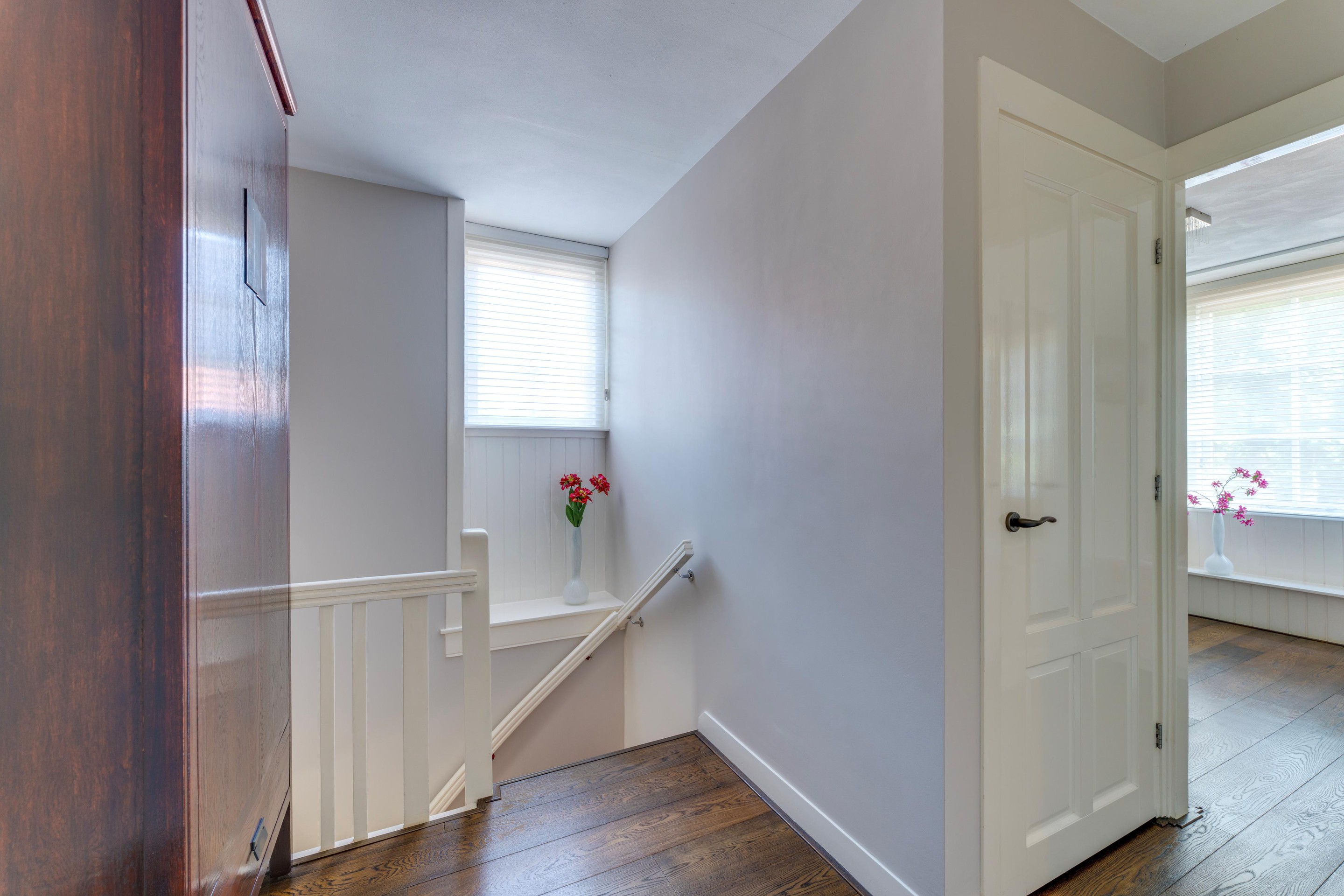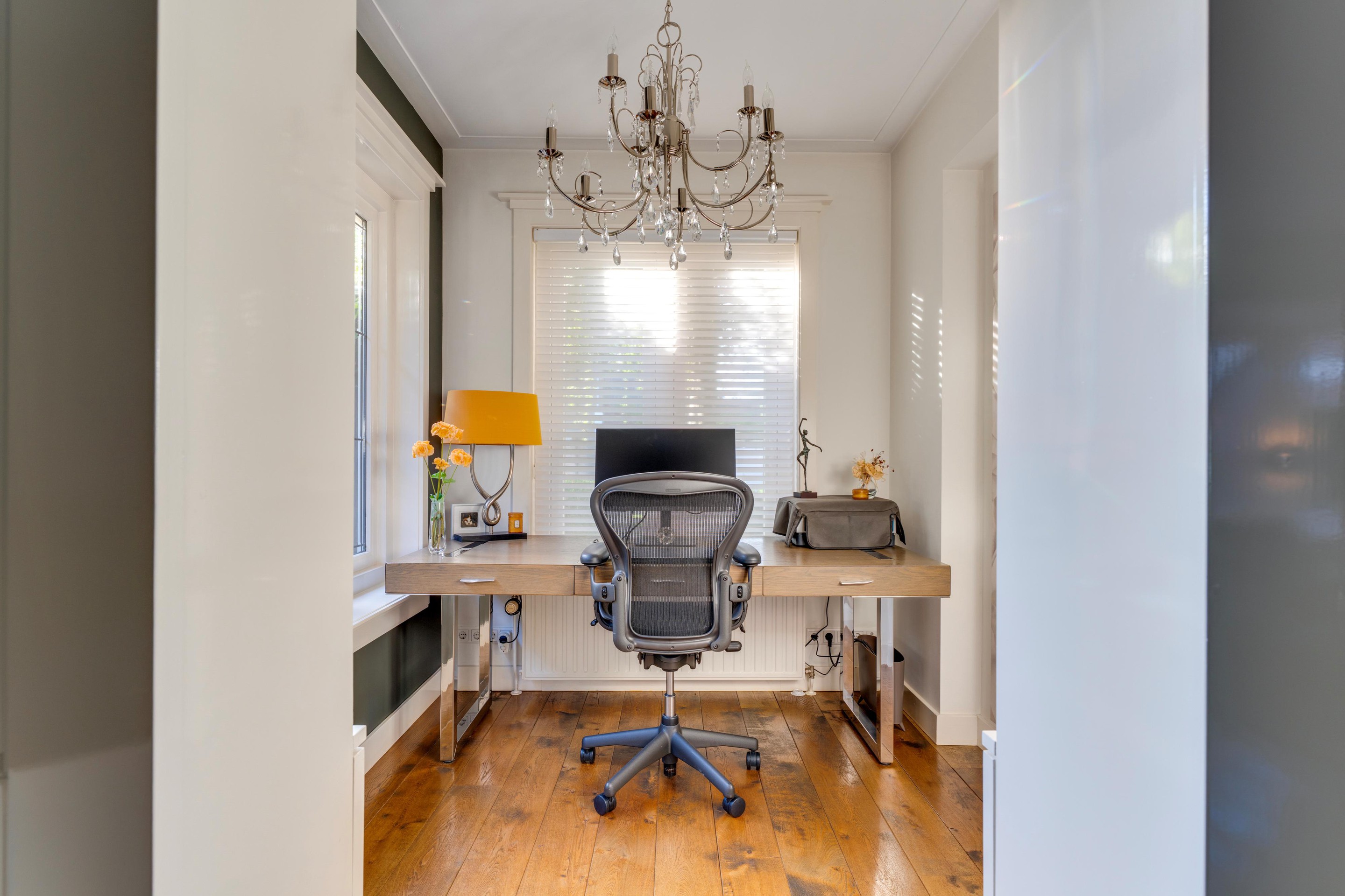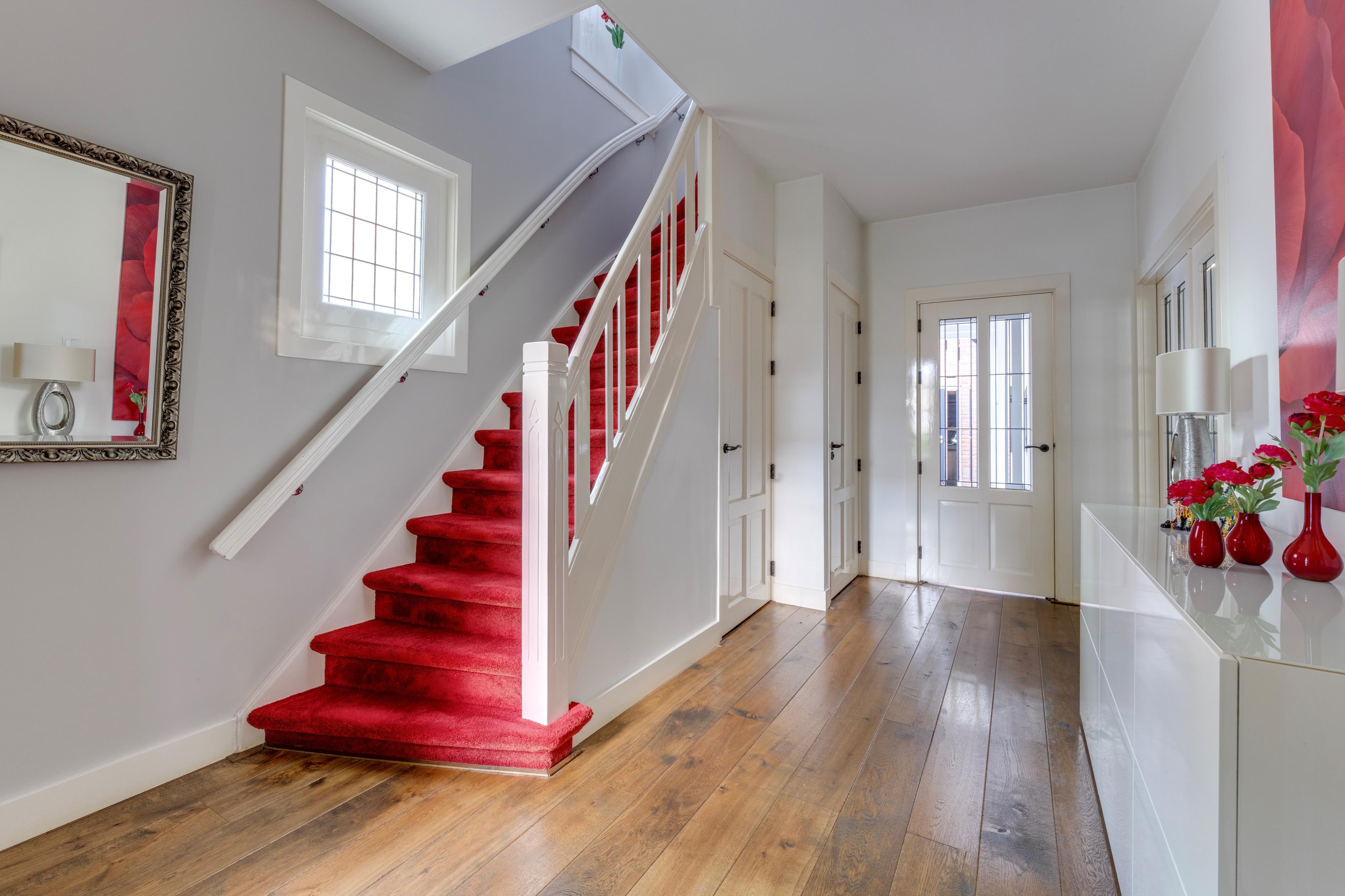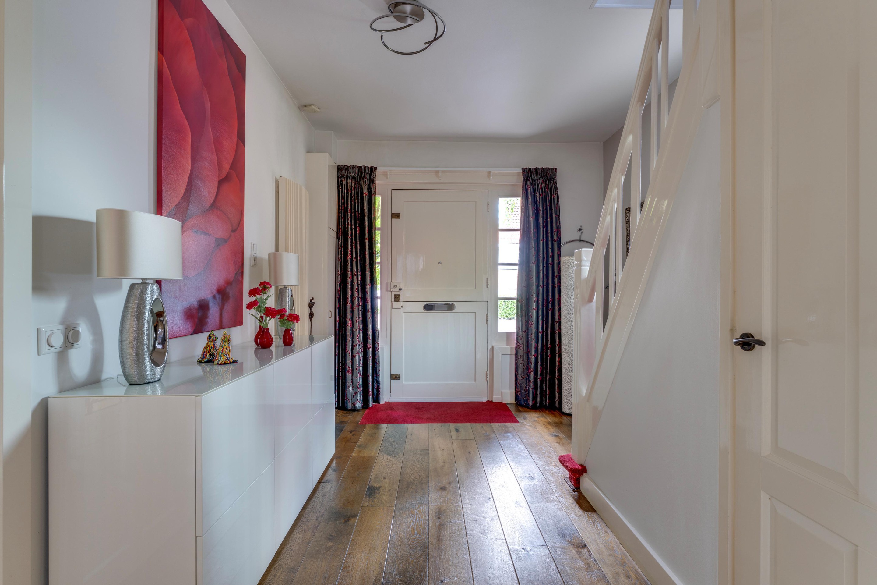 Begane grond Je stapt binnen in een ruime en sfeervolle hal die direct het karakter van de woning weerspiegelt: licht, verzorgd en met oog voor detail. Het glas-in-lood en de opvallende rode trapbekleding geven de entree net dat beetje extra. In de hal vind je het moderne toilet, de meterkast en de toegangsdeur naar de kelder. Aan de voorzijde ligt een rustige werkkamer, momenteel ingericht als thuiskantoor. Een fijne plek om te werken, studeren of je even terug te trekken.